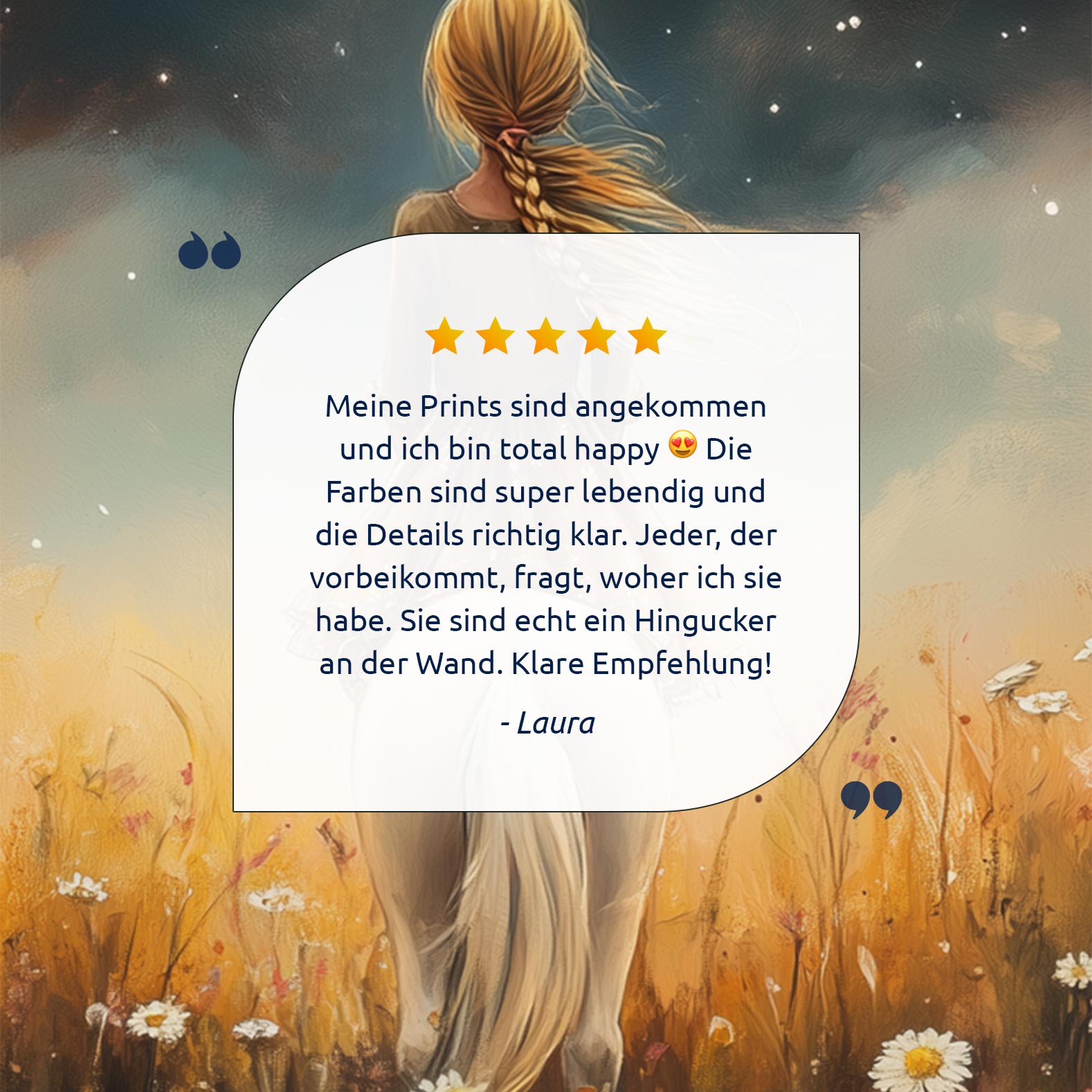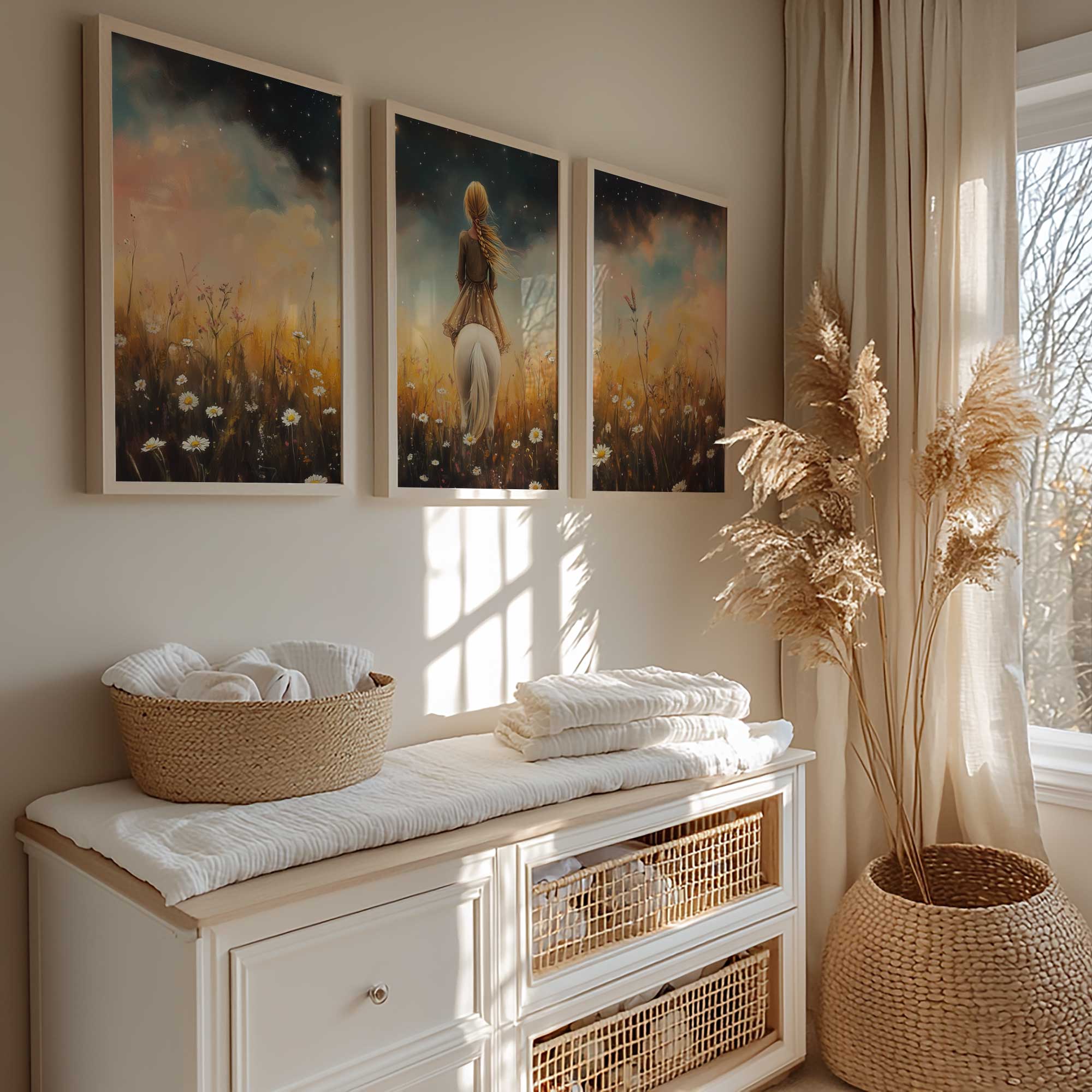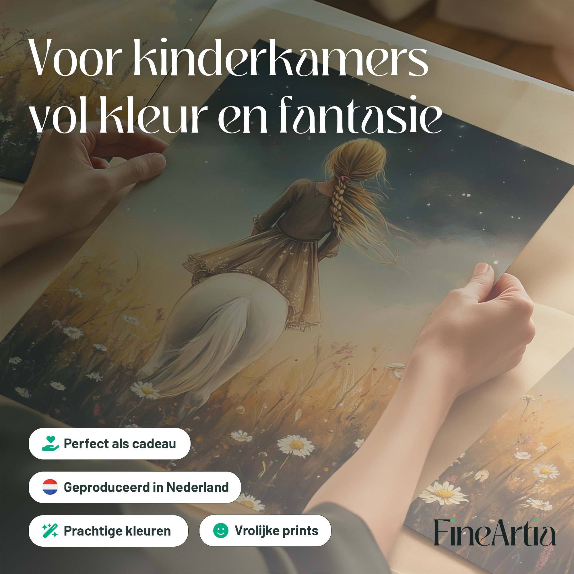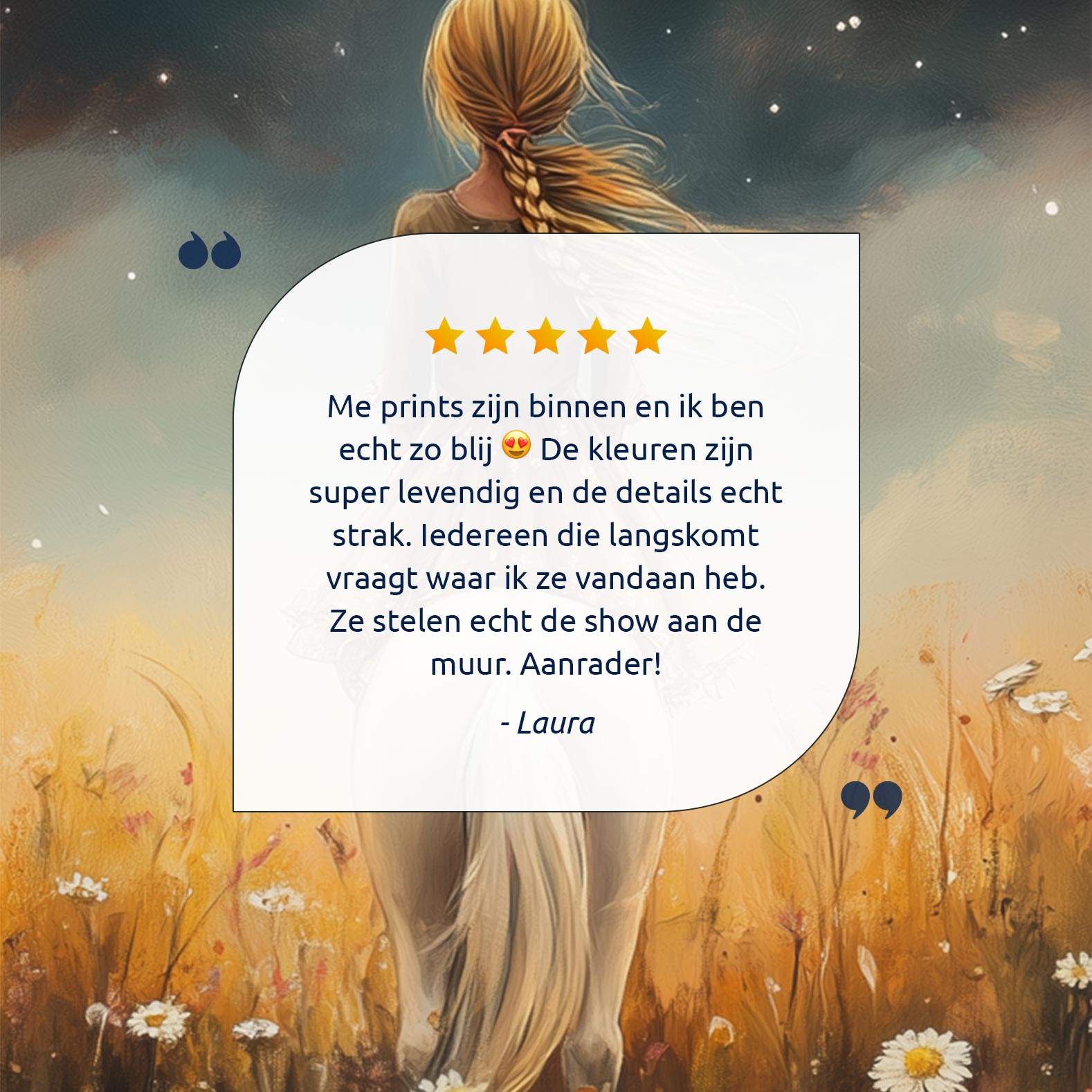 Meisje op witte pony in bloemenveld onder sterrenhemel