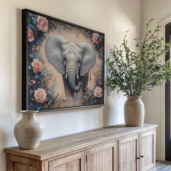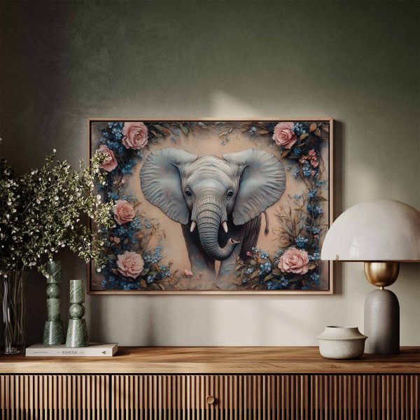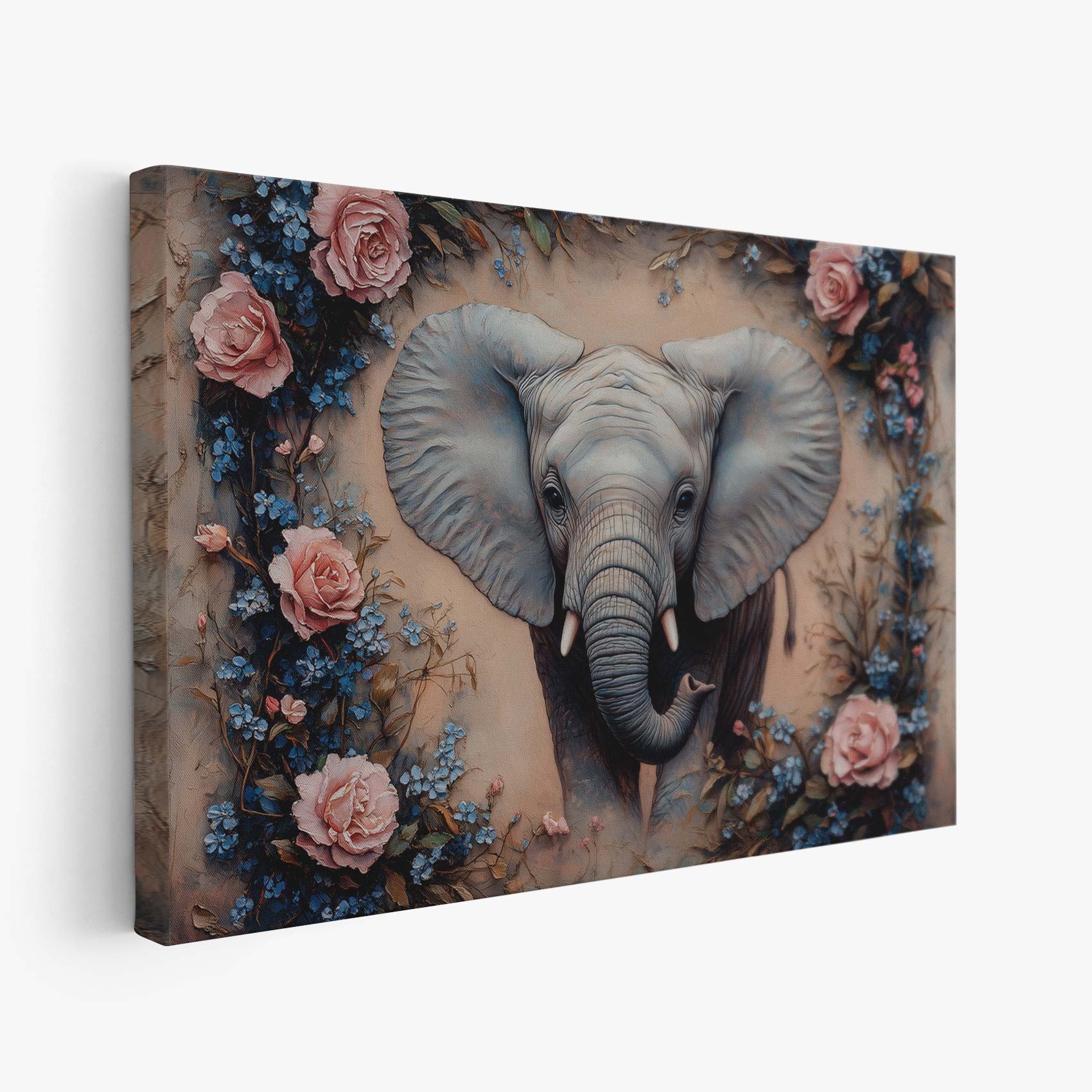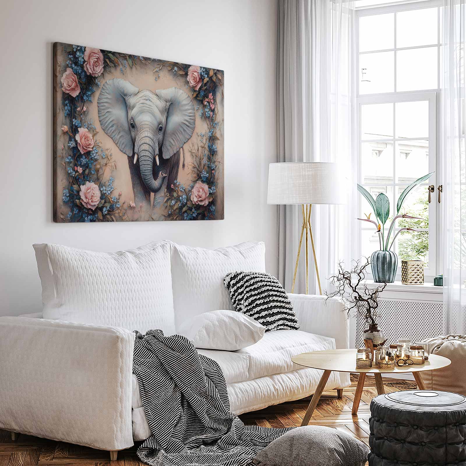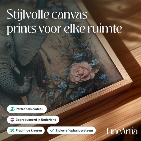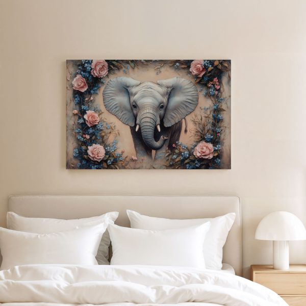 Terug naar collectie Canvas Olifant tussen roze rozen