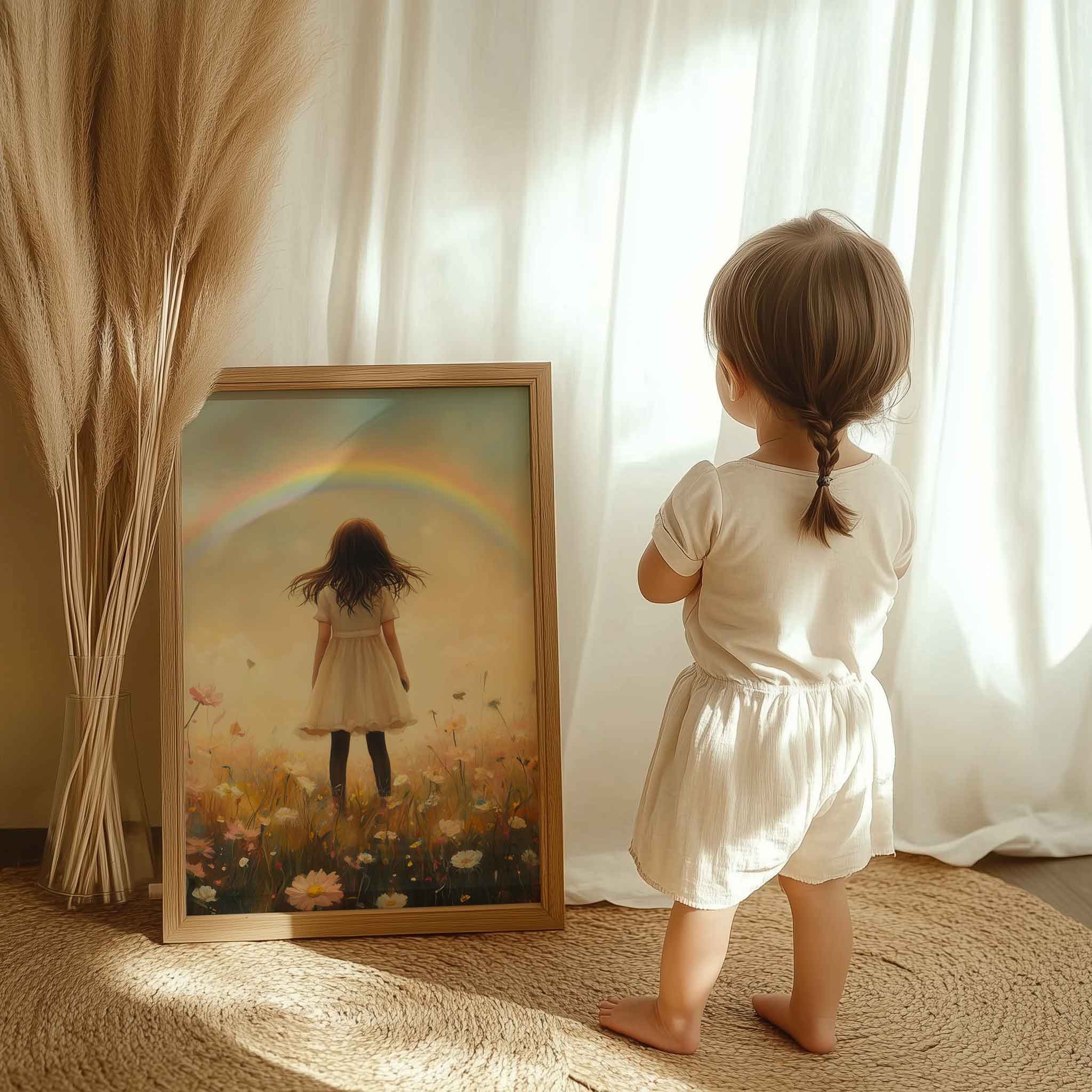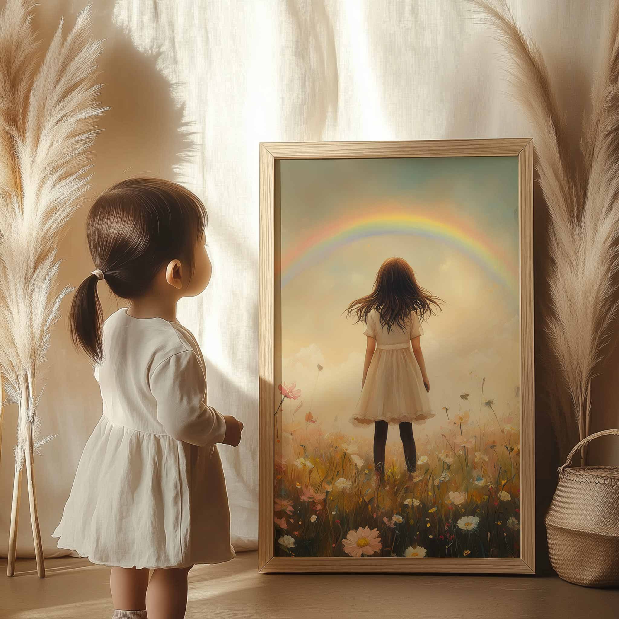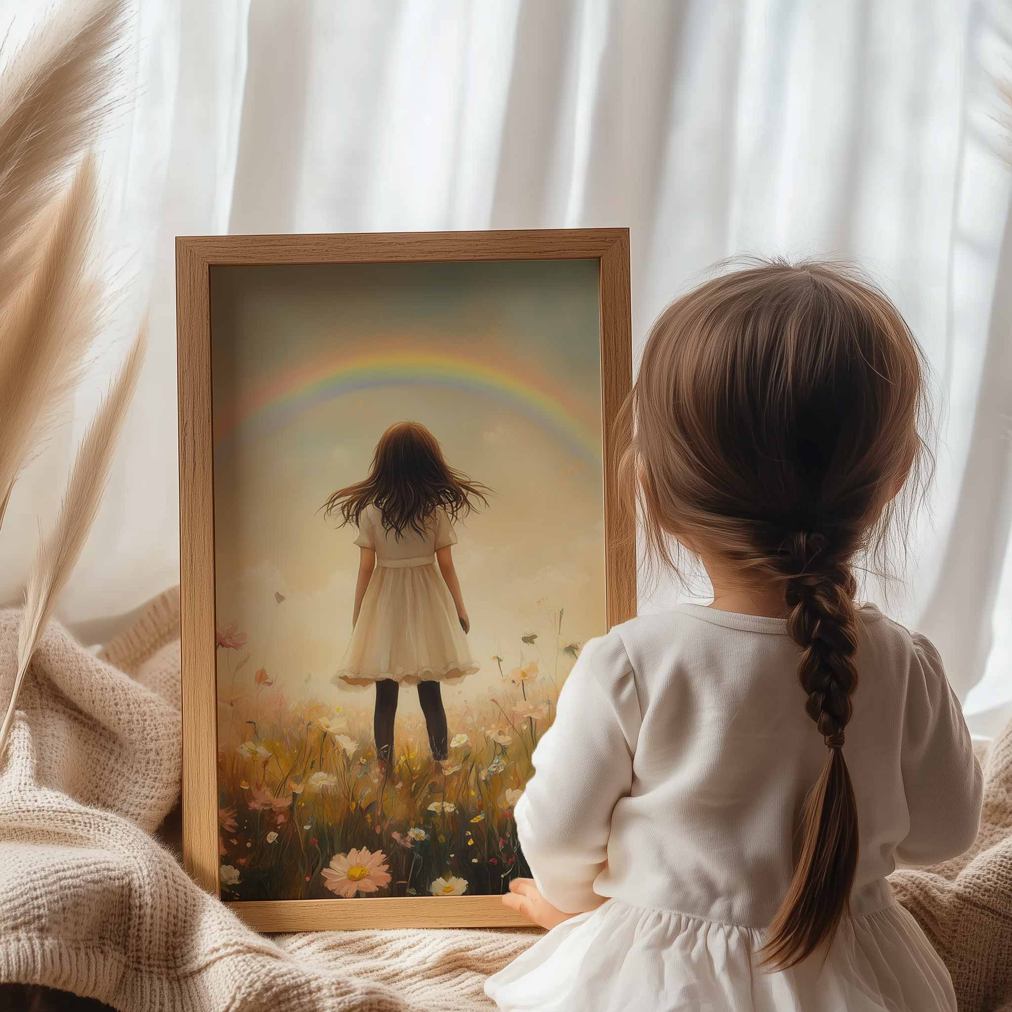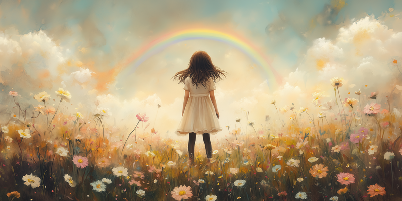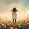 Pastel Droom: Meisje in Bloemenveld met Regenboog