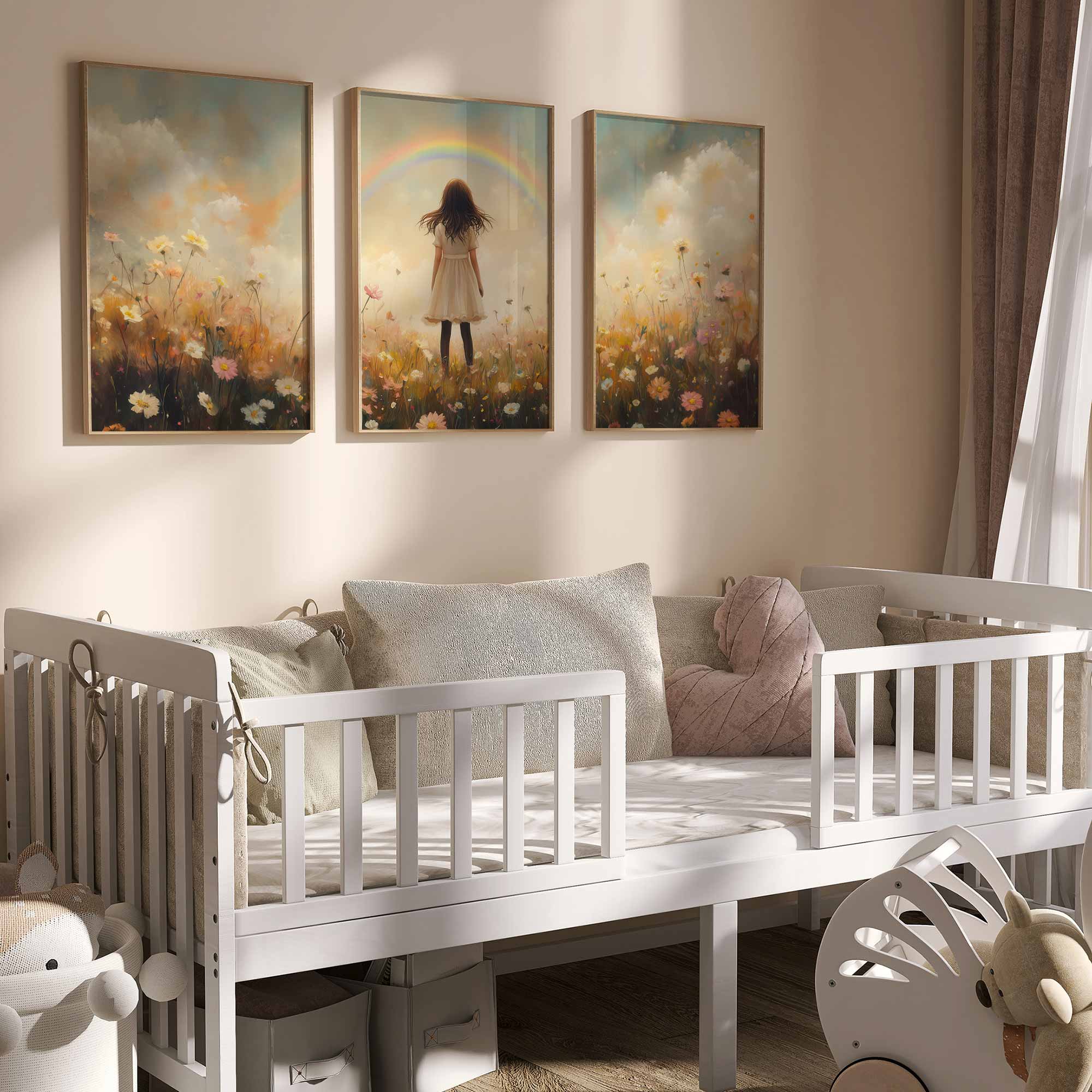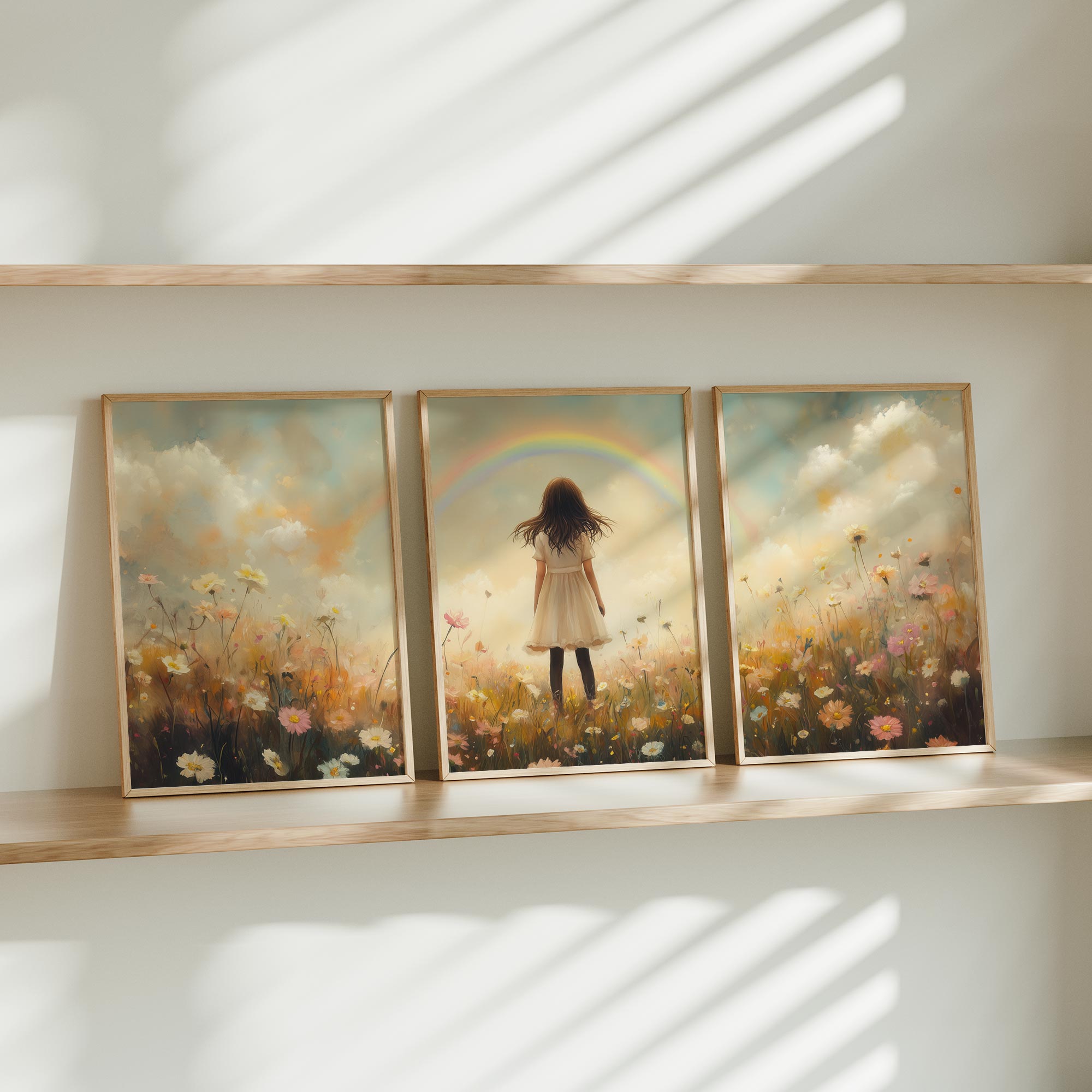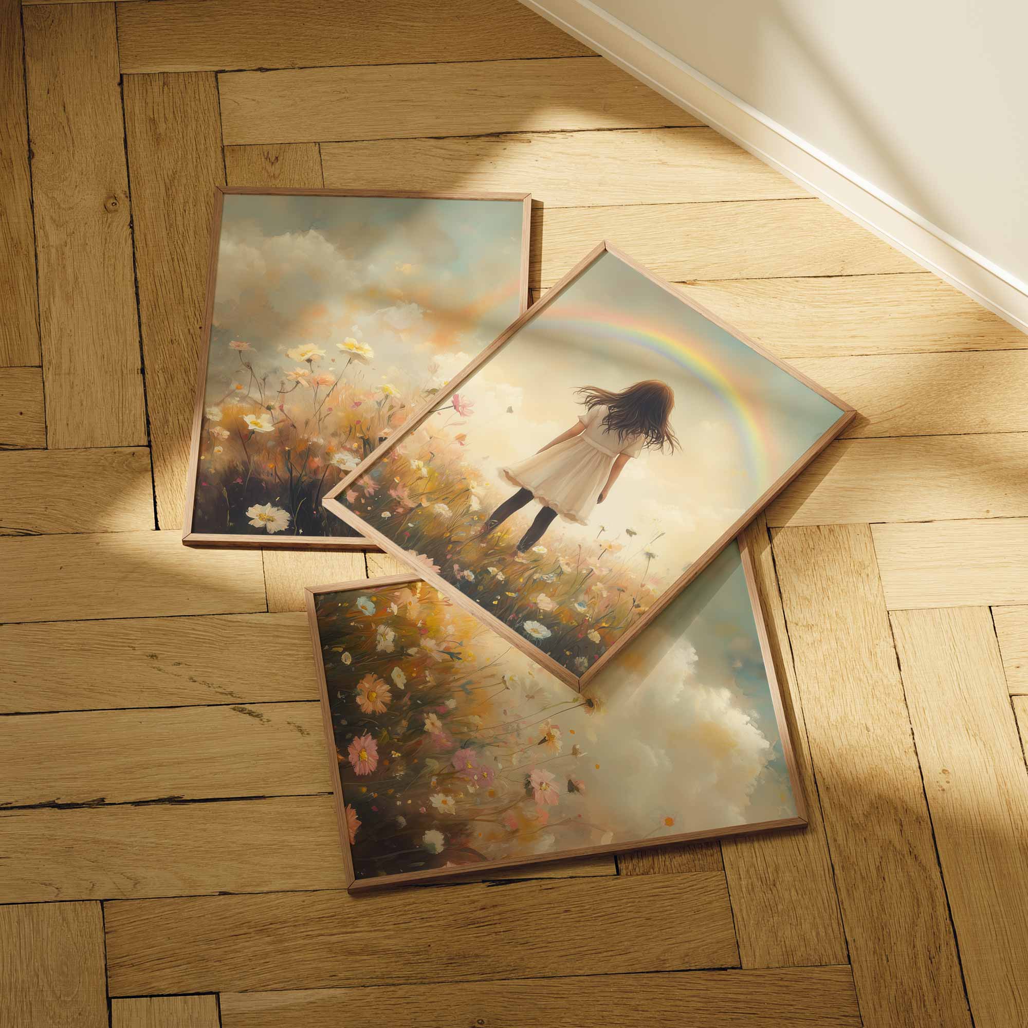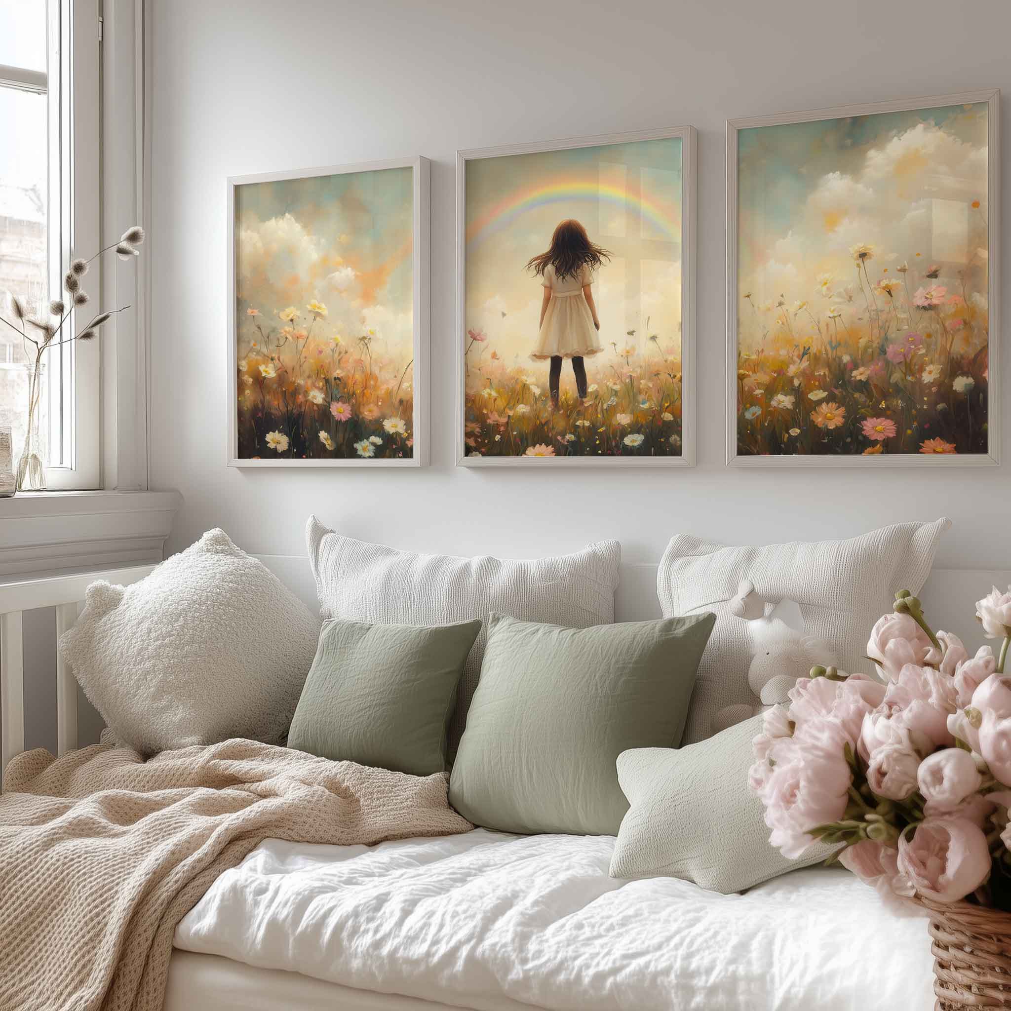 Pastel Droom: Meisje in Bloemenveld met Regenboog