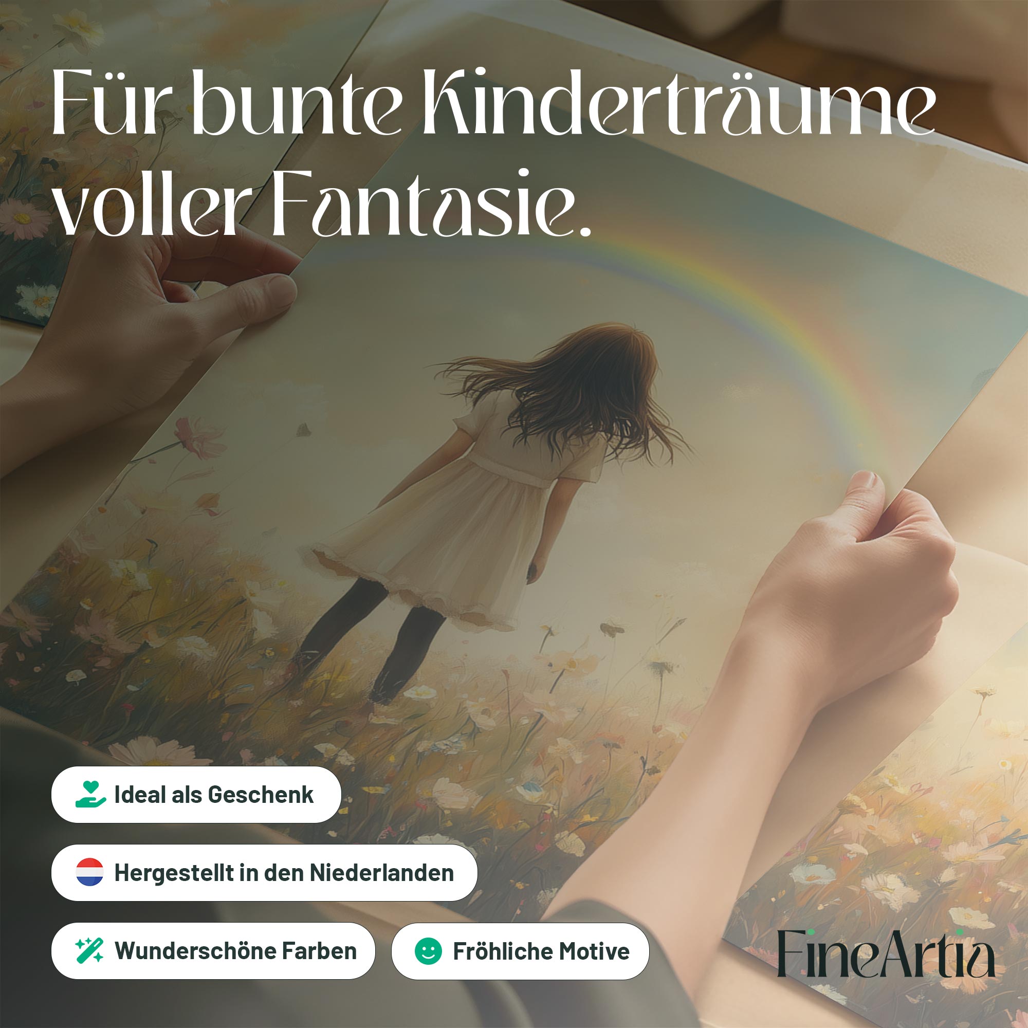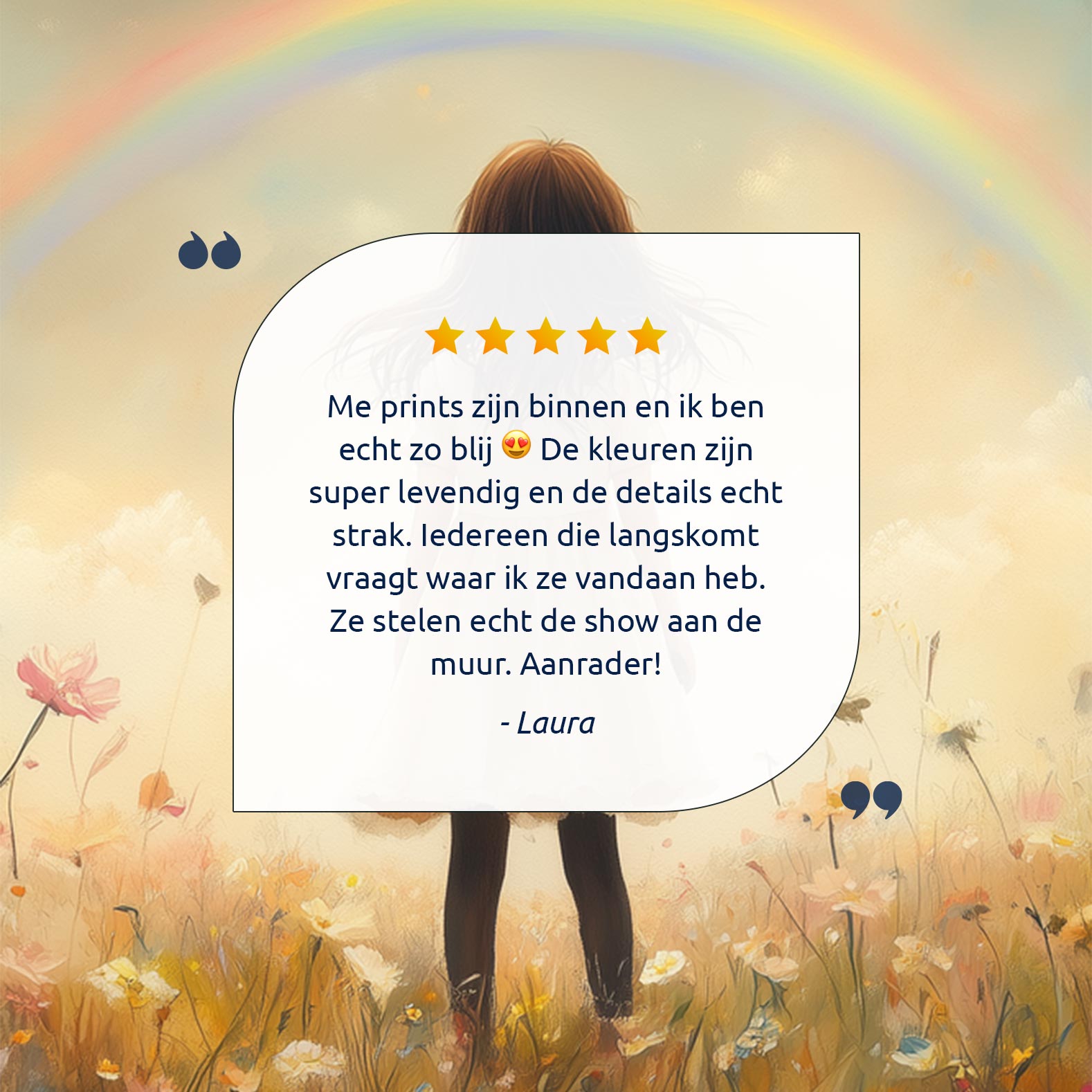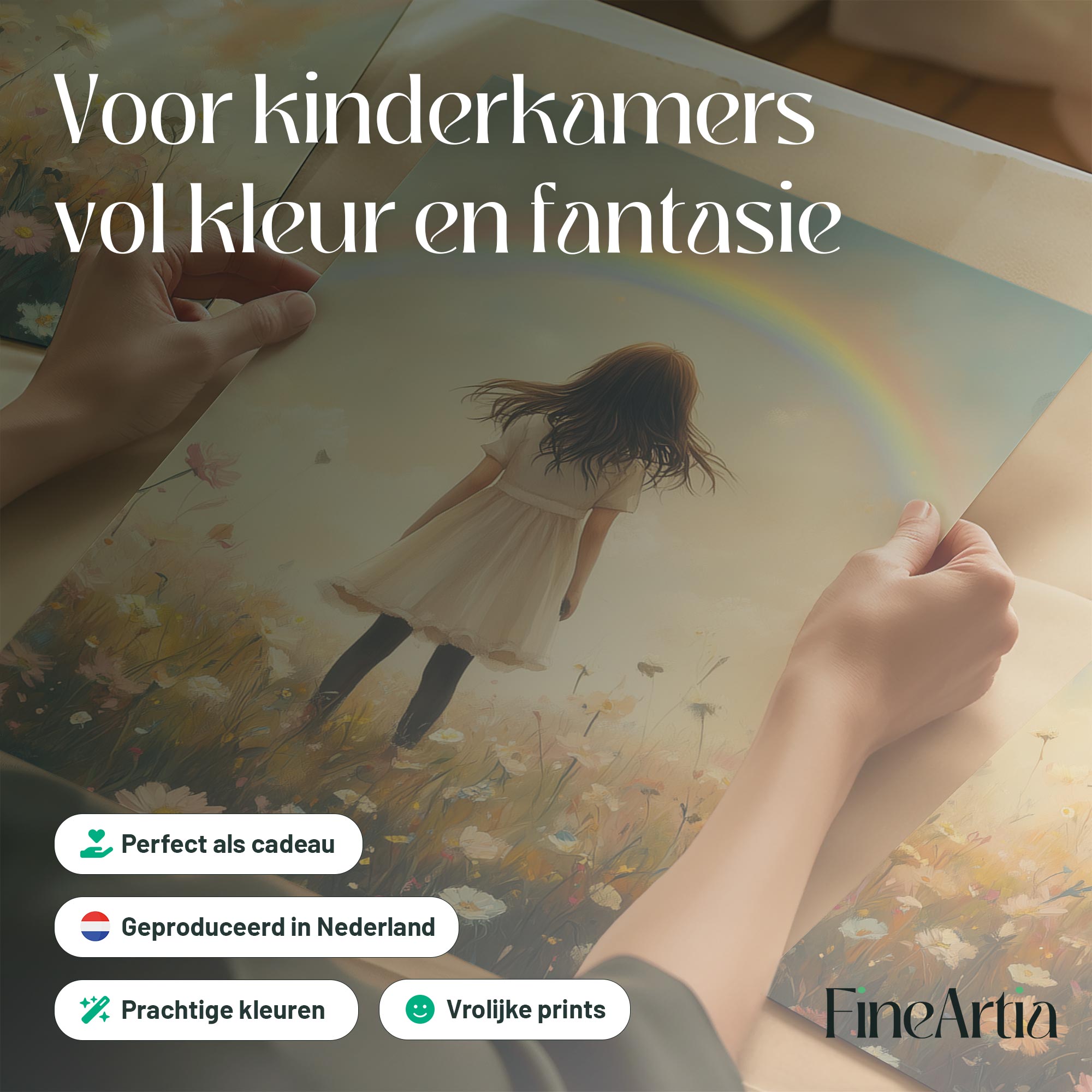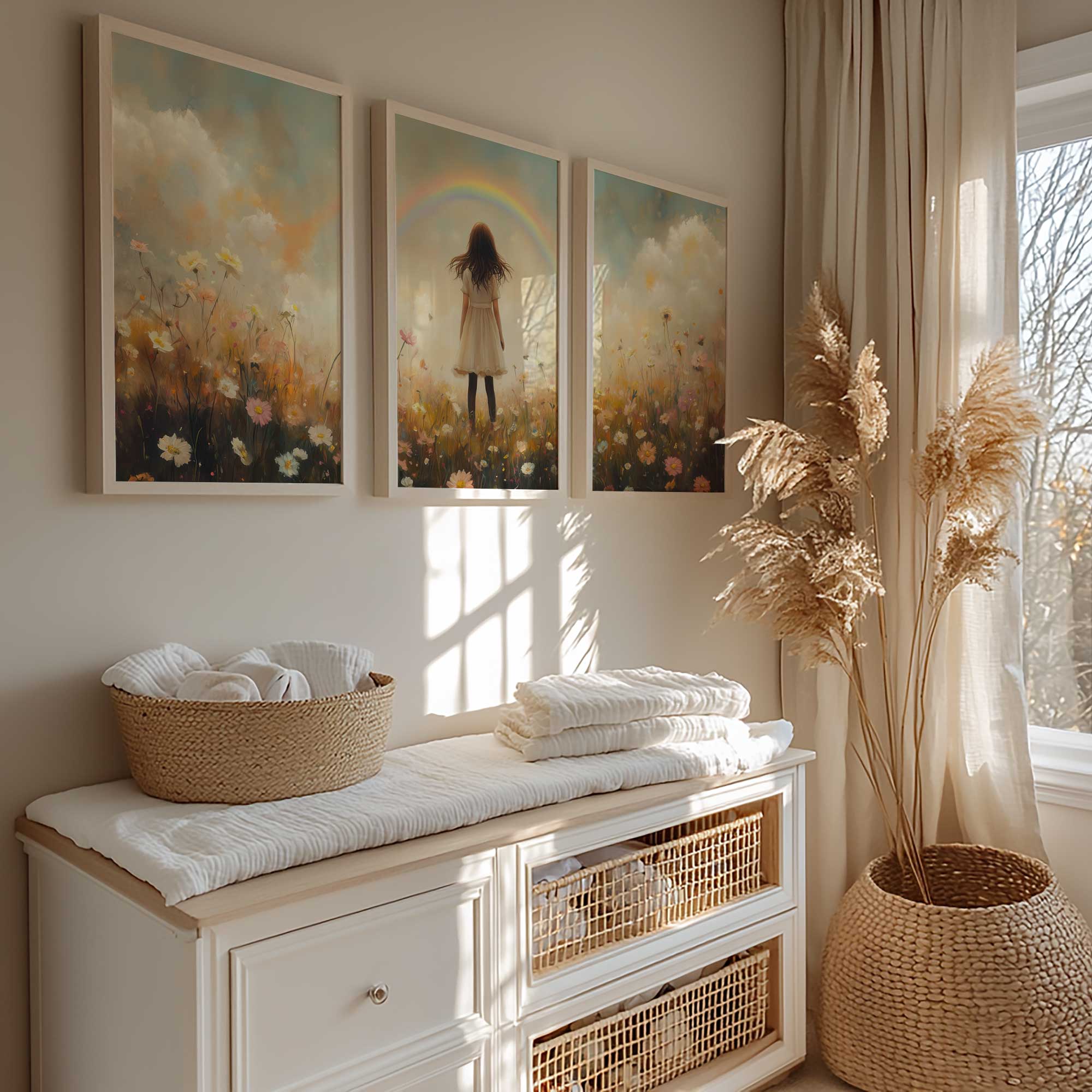 Pastel Droom: Meisje in Bloemenveld met Regenboog