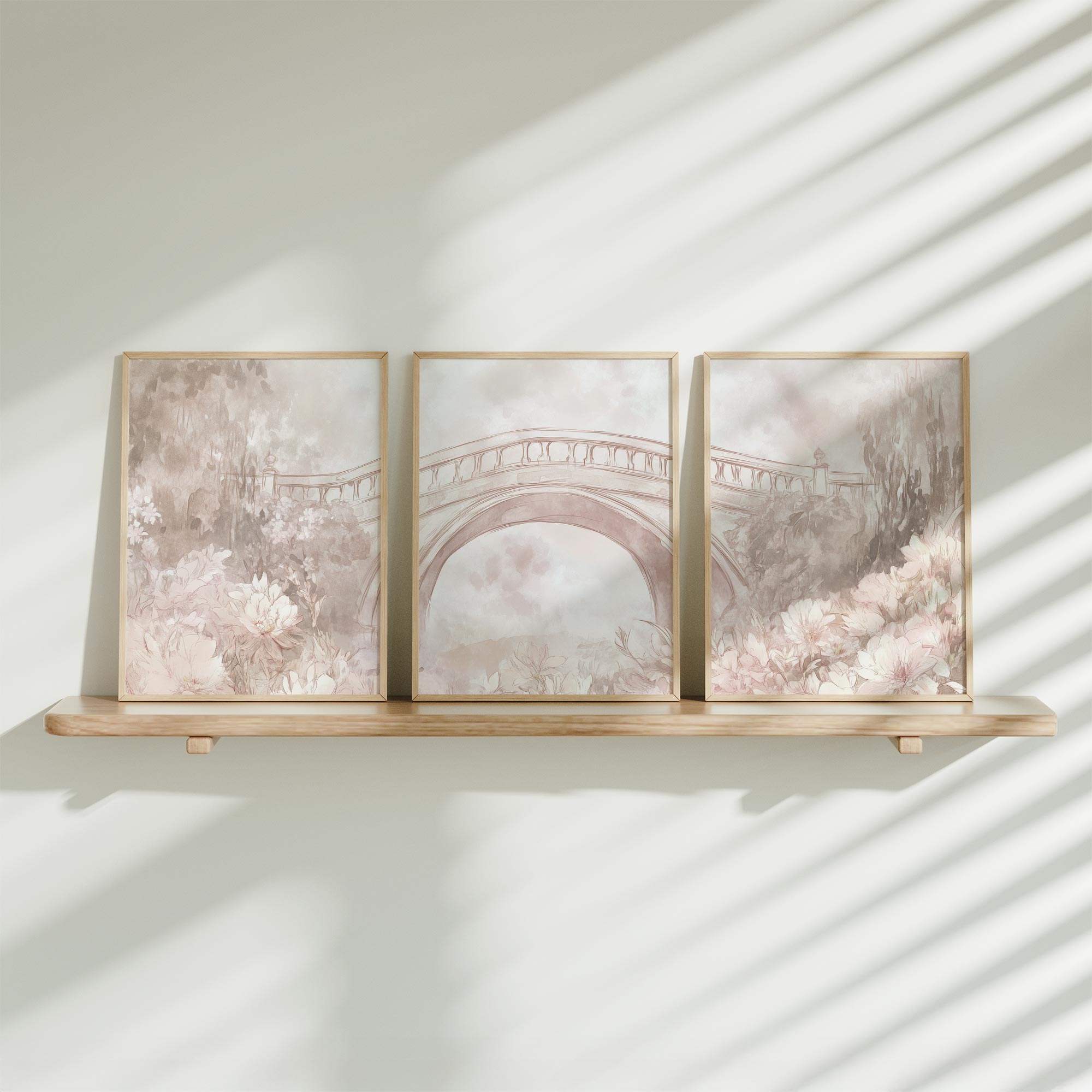 Pastelbruidje omringd door roze bloemenvelden