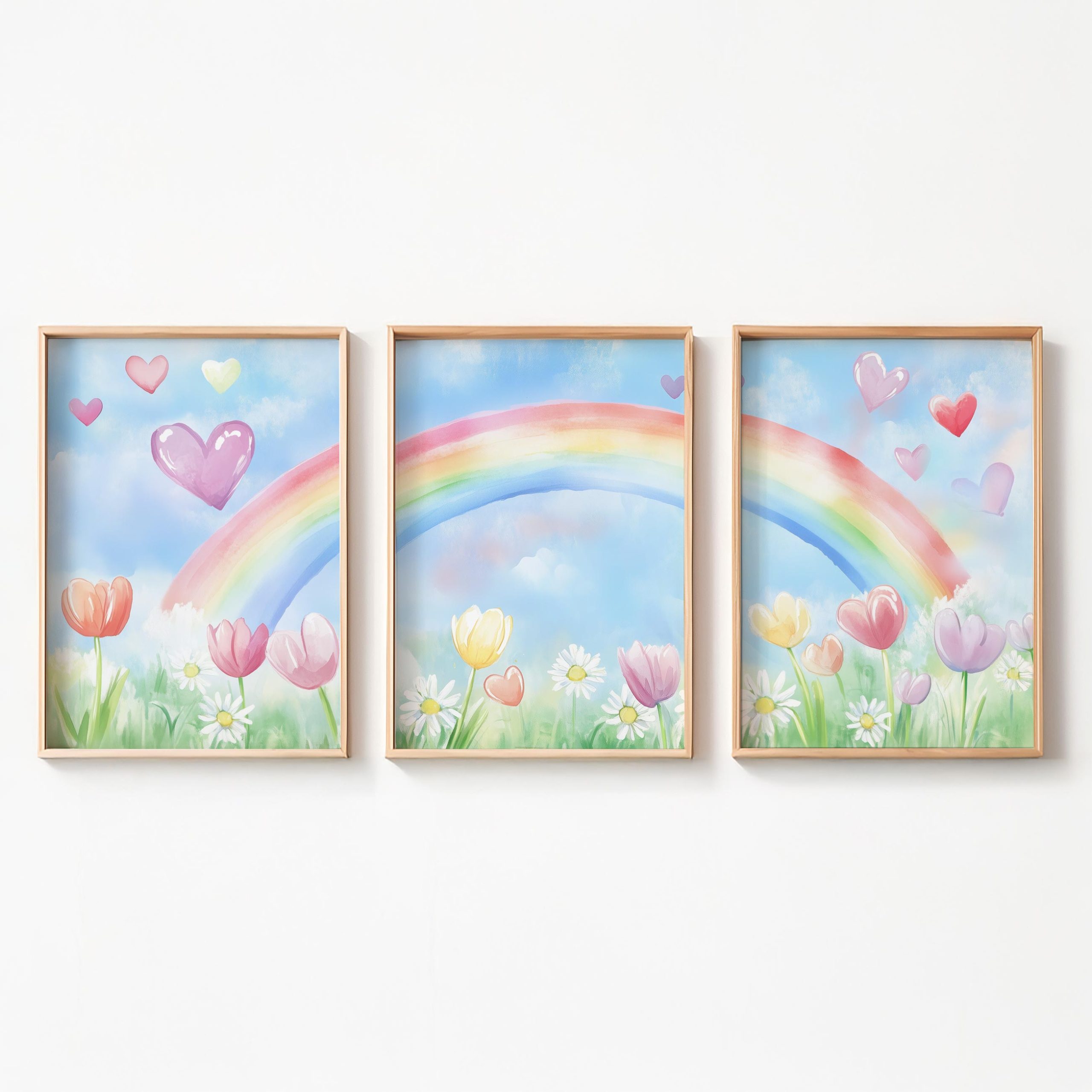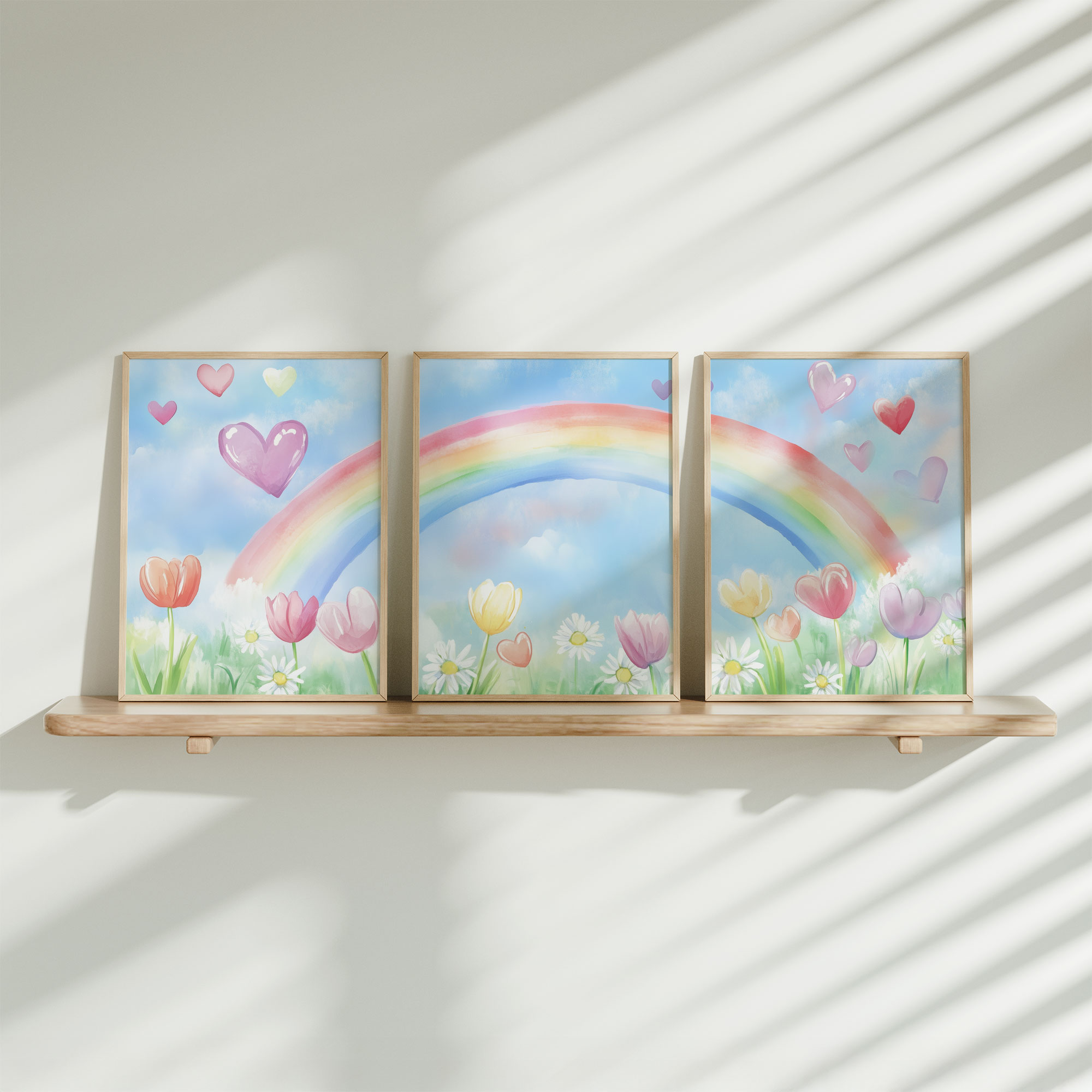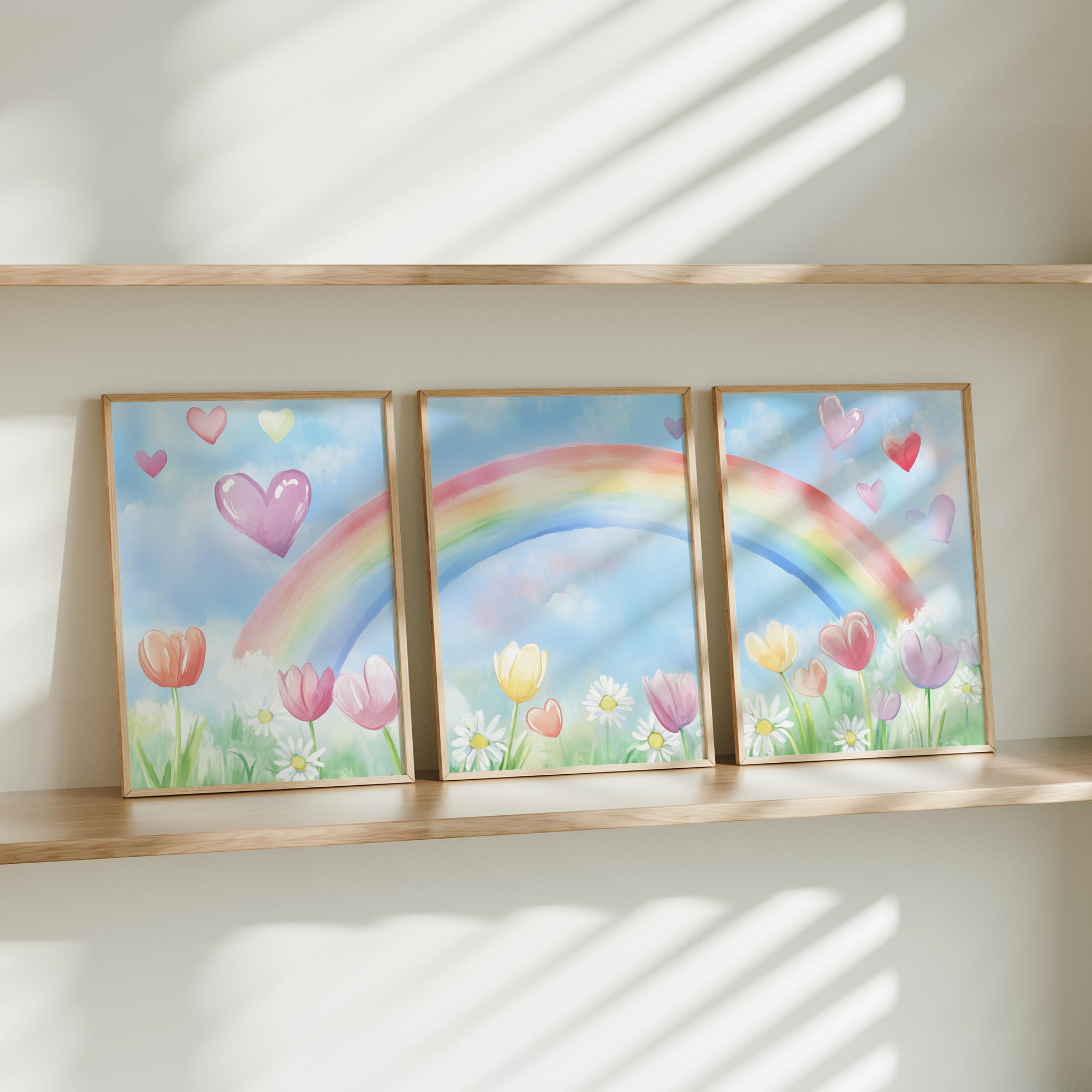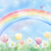 Regenboogdromen met zwevende hartjes en bloemenveld