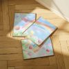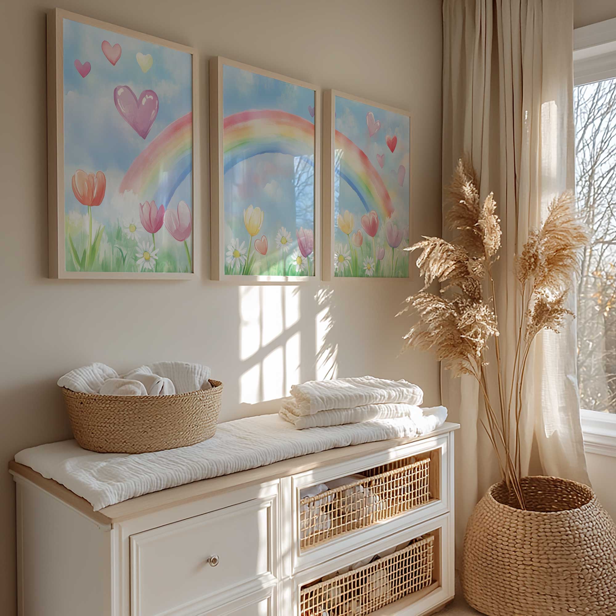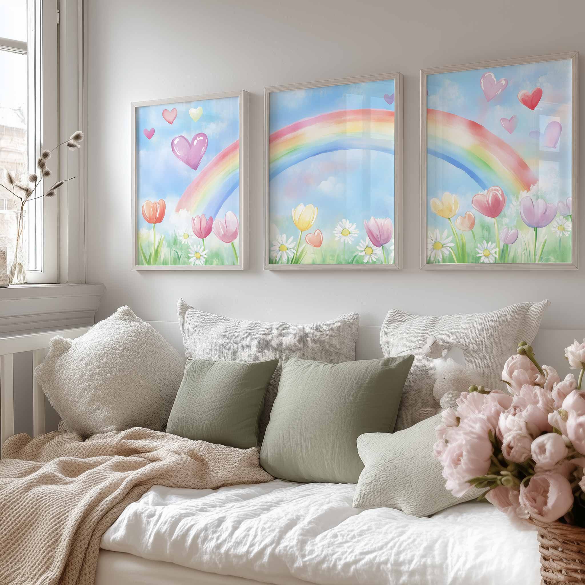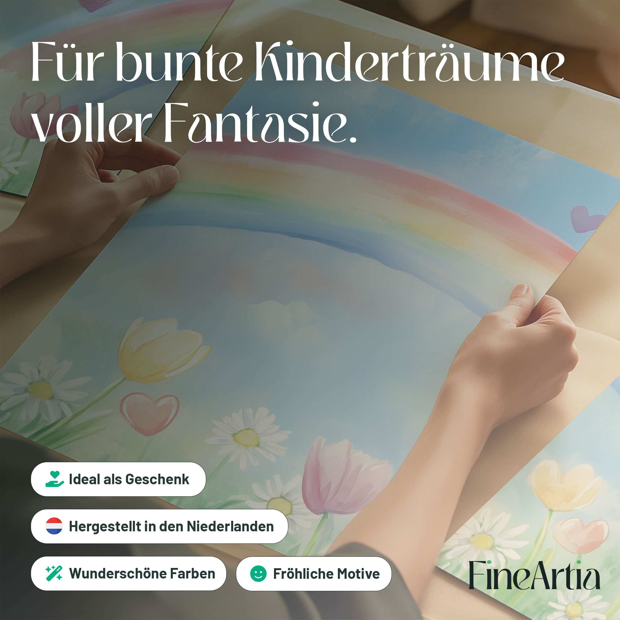 Regenboogdromen met zwevende hartjes en bloemenveld