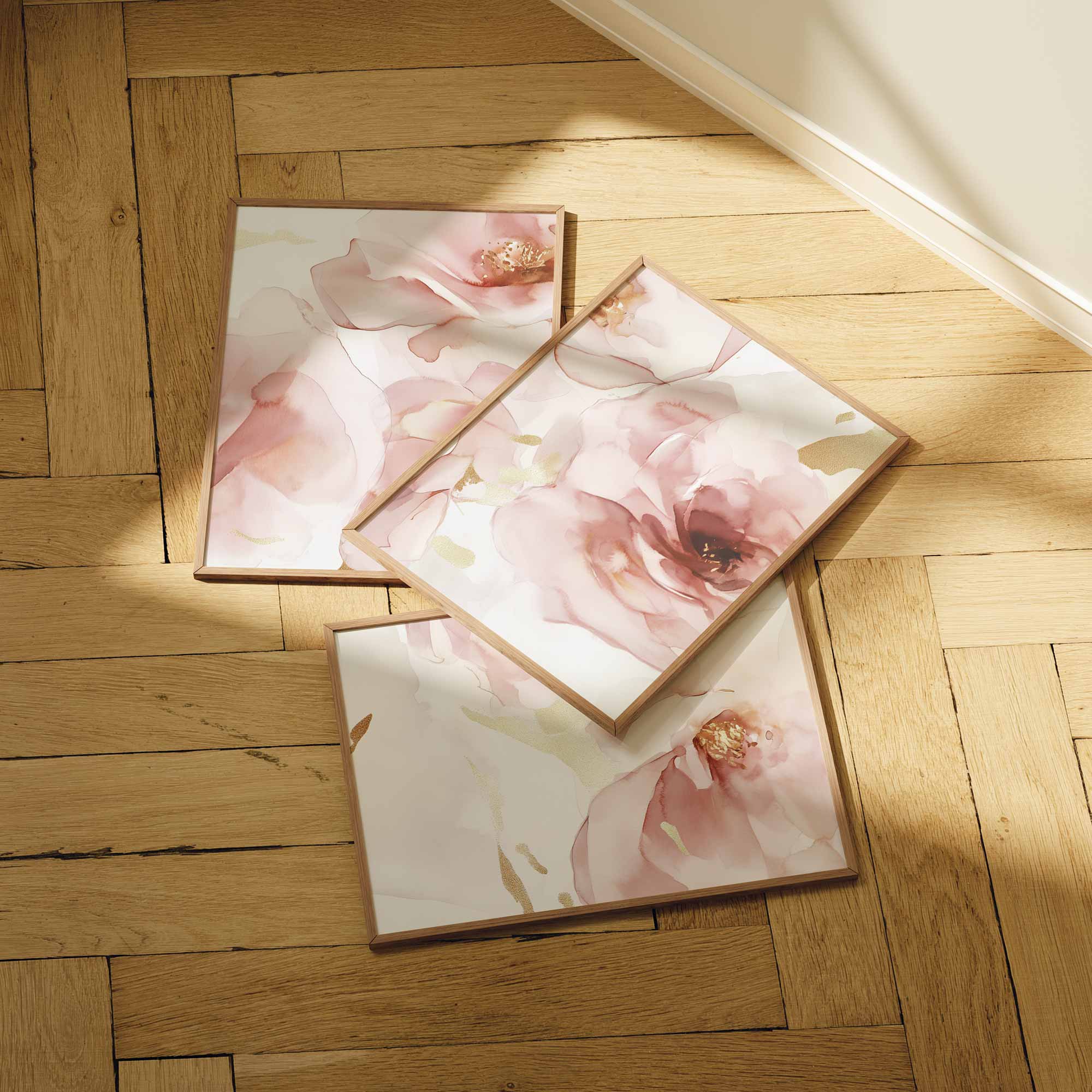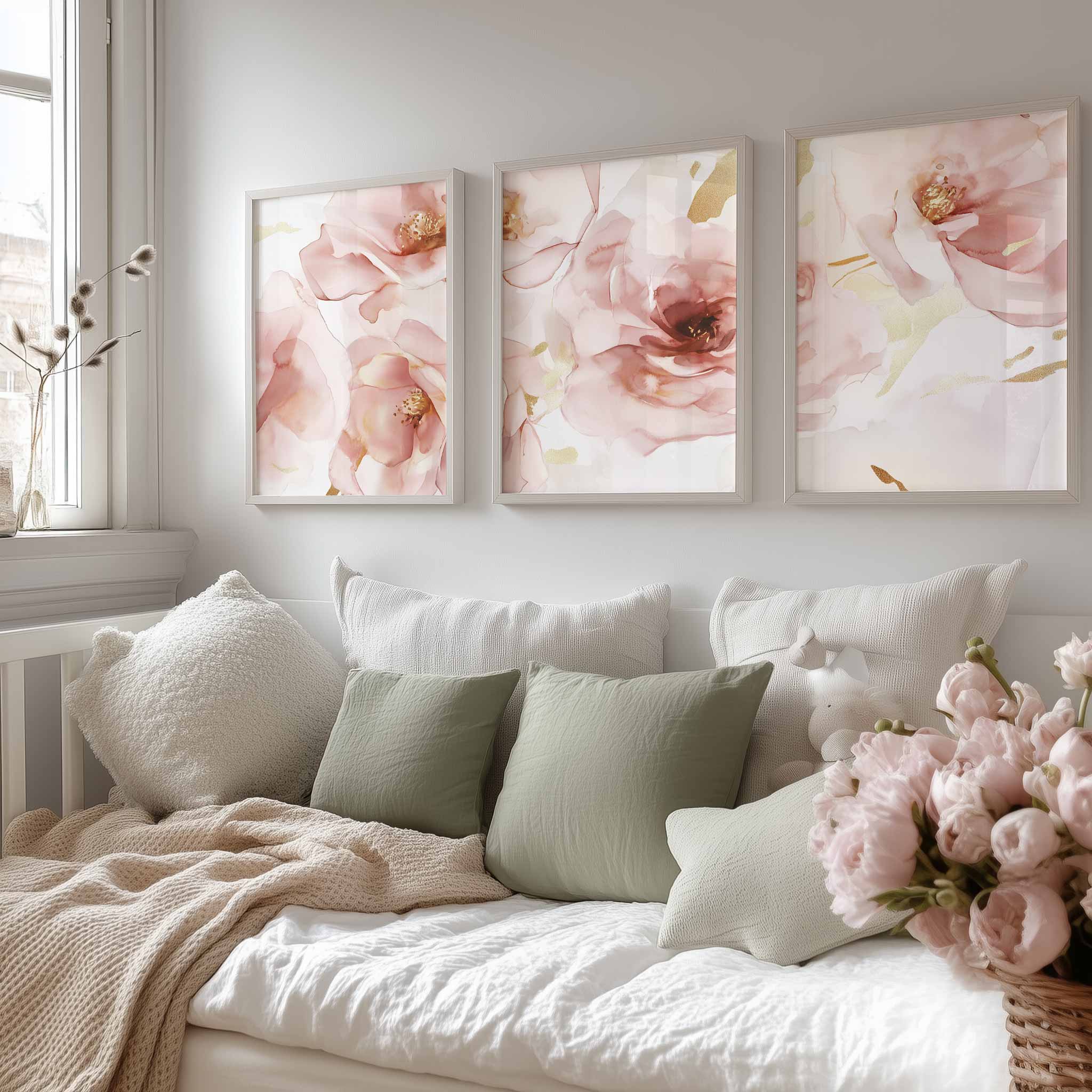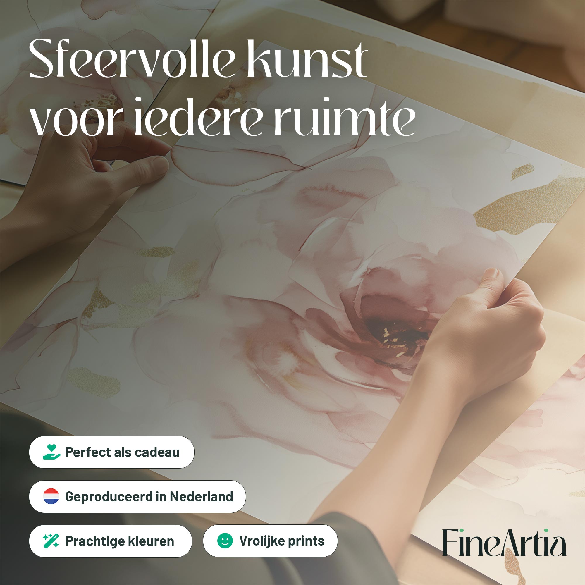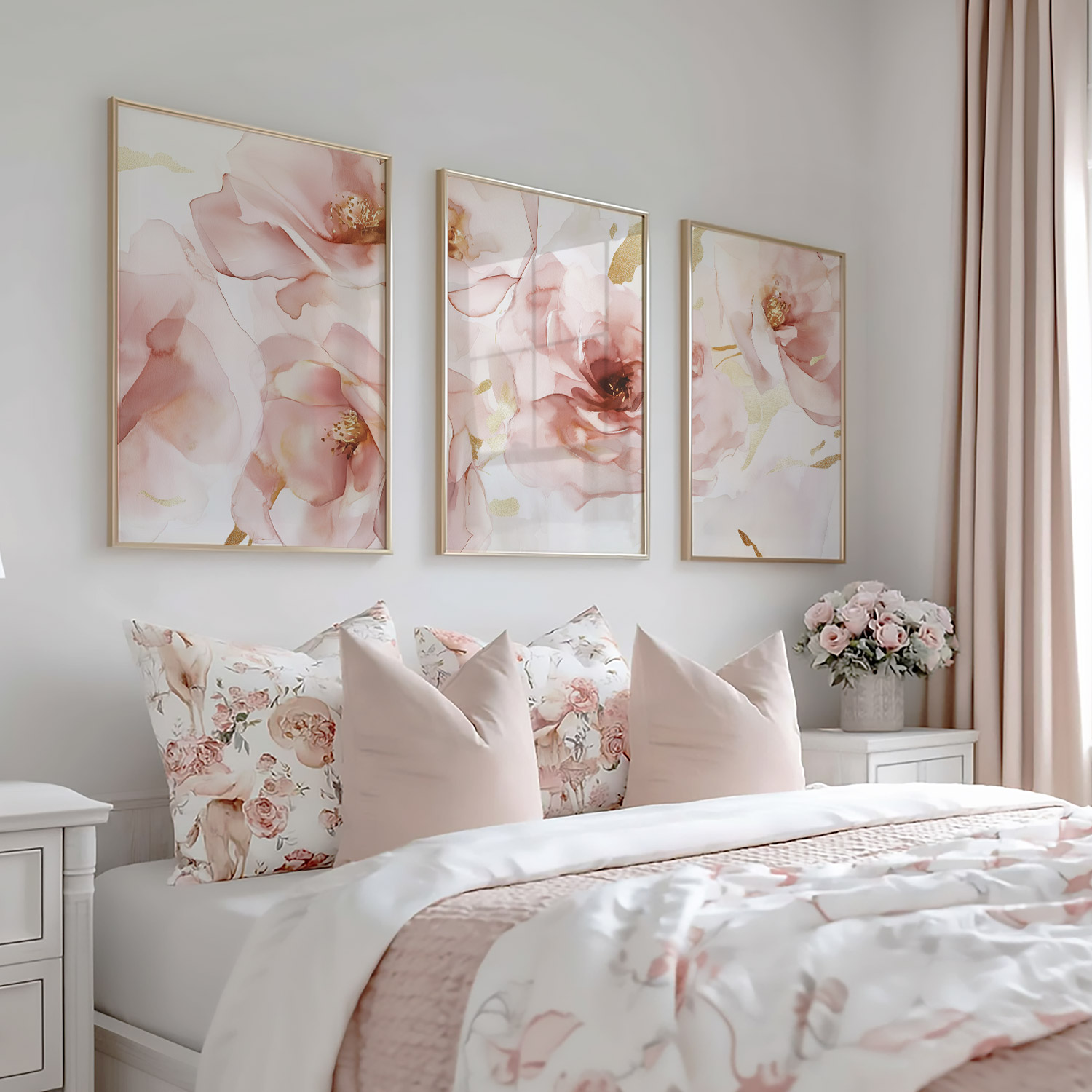 Roze Bloemen met Gouden Accenten – Stijlvolle Wanddecoratie