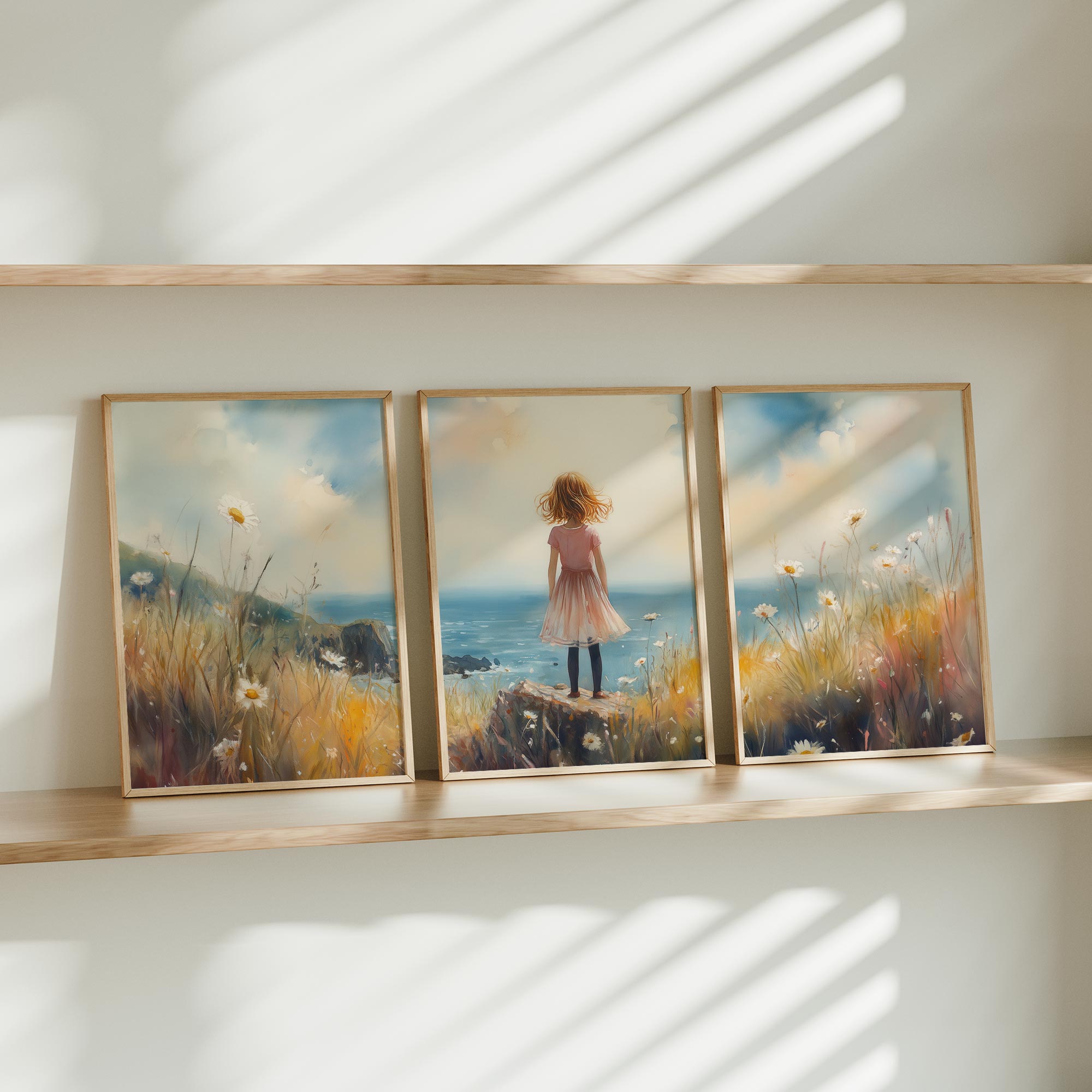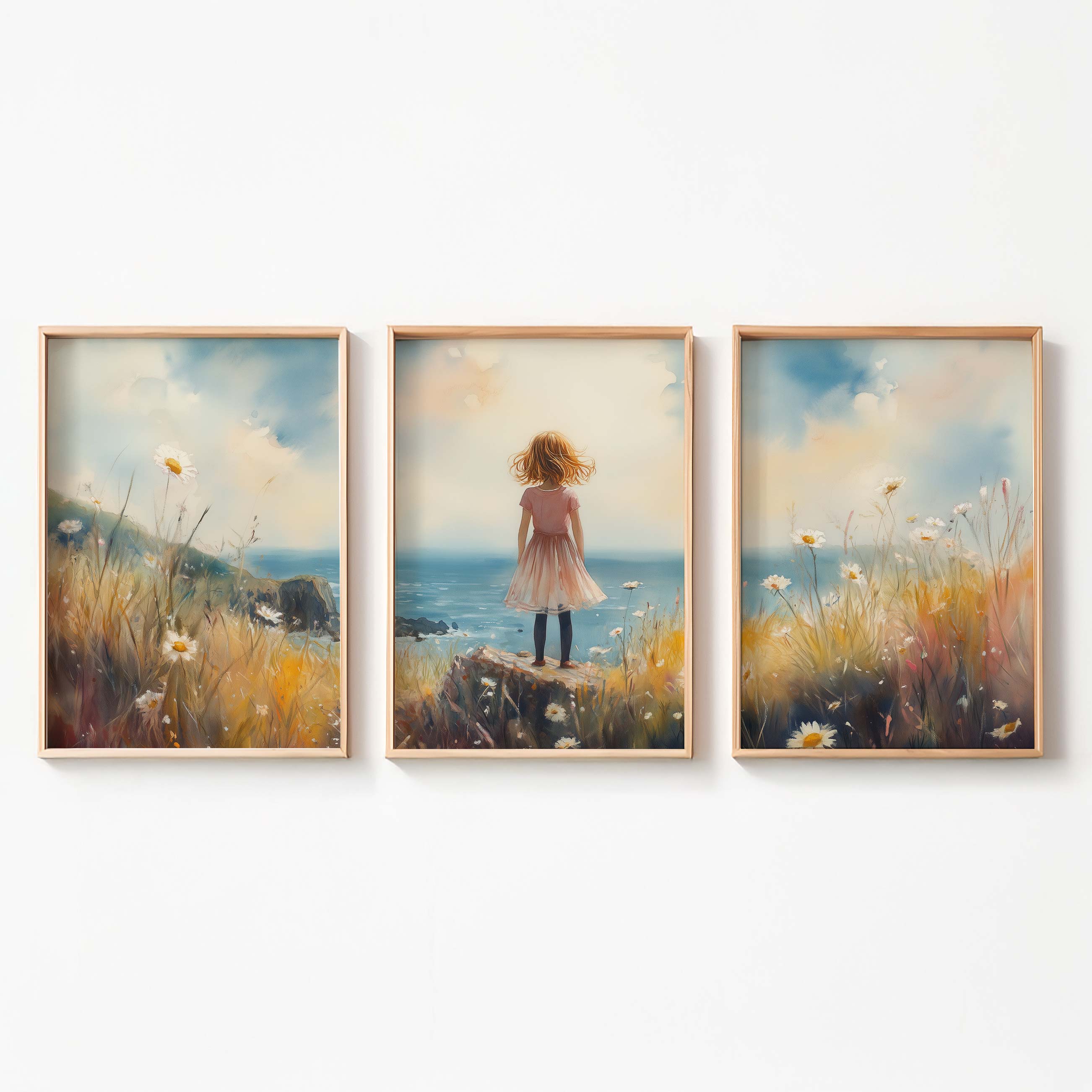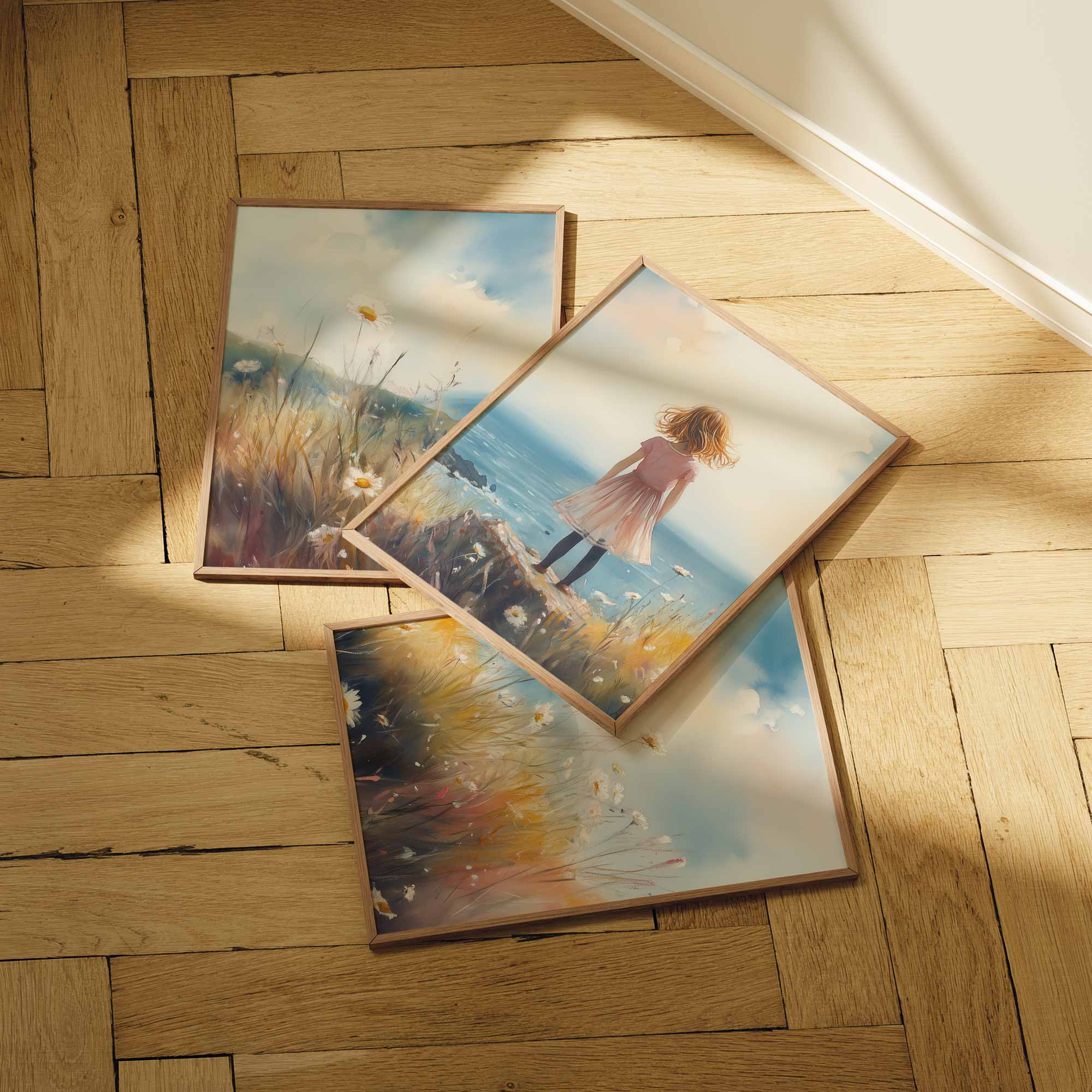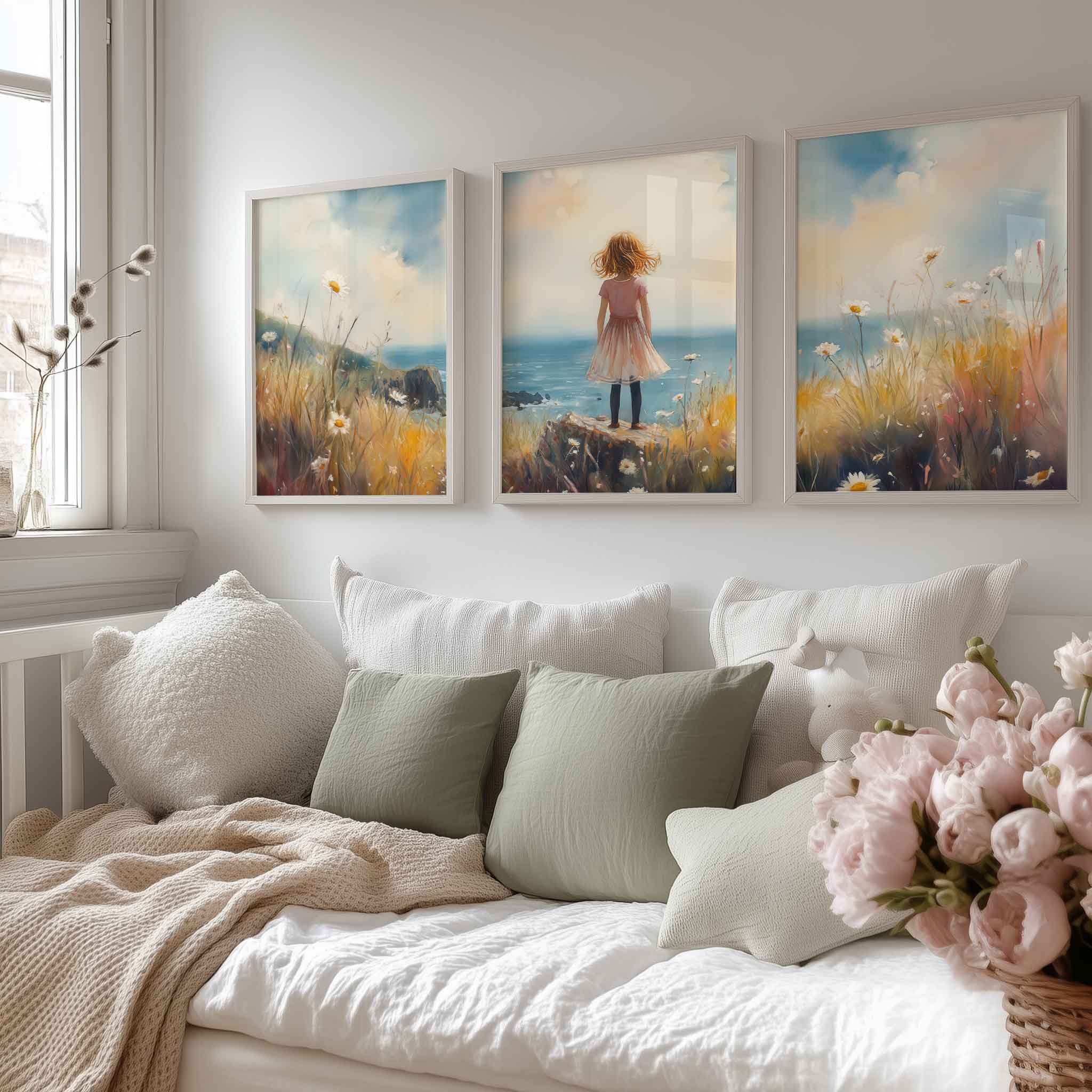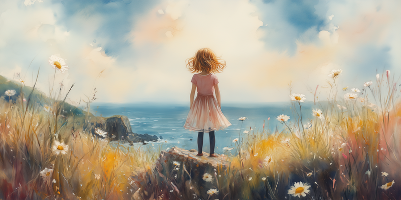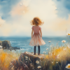 Roze Dromen: Meisje in Bloemenveld bij de Zee