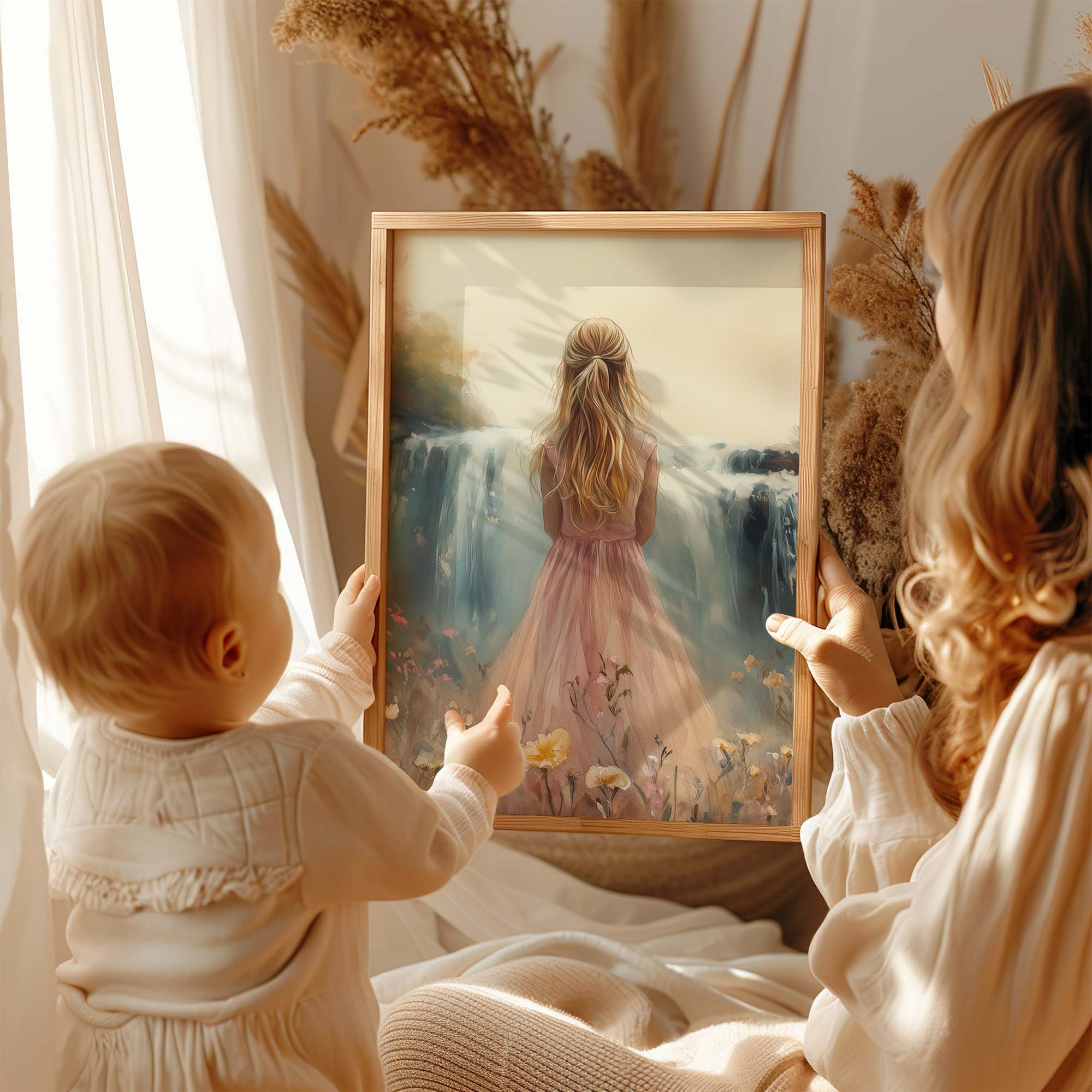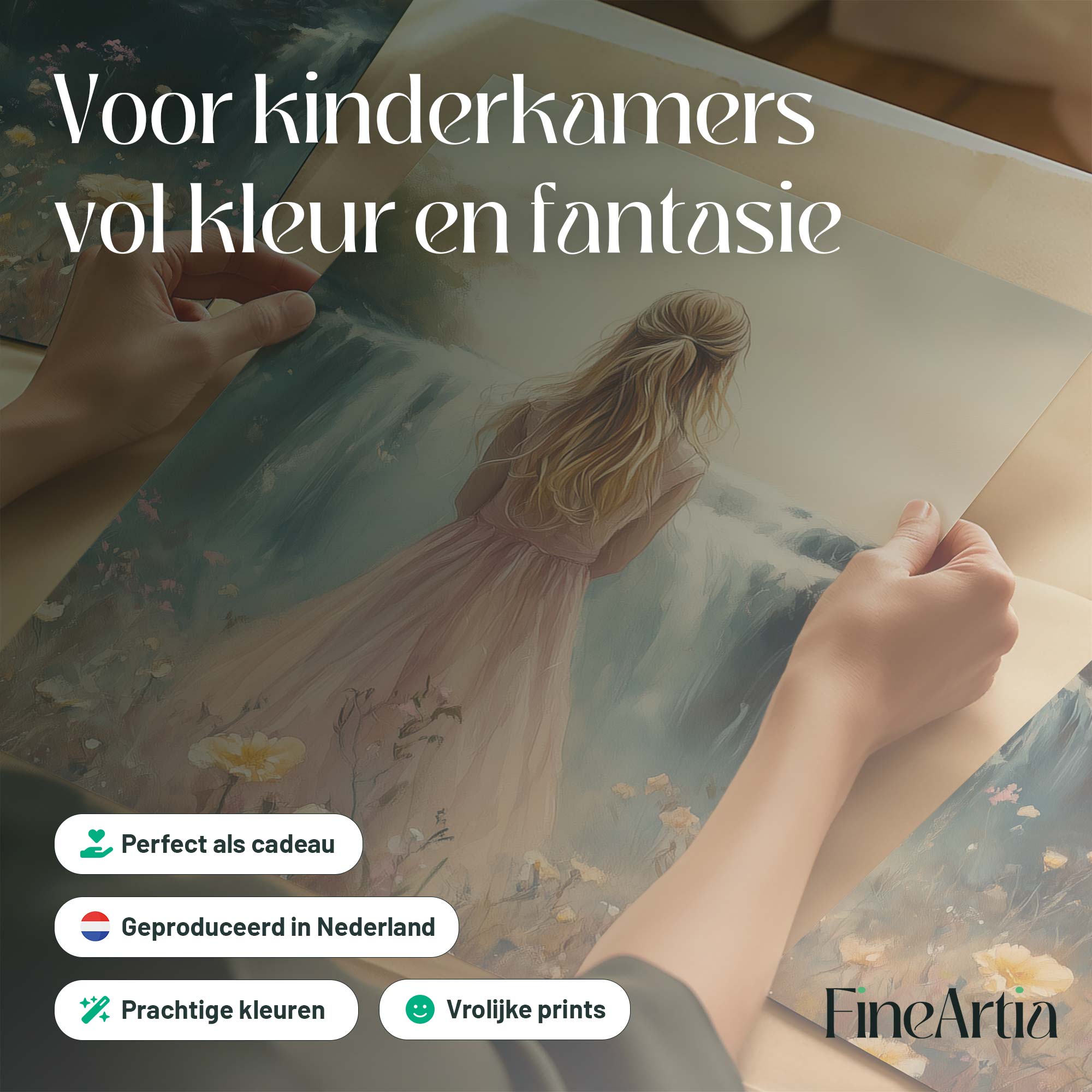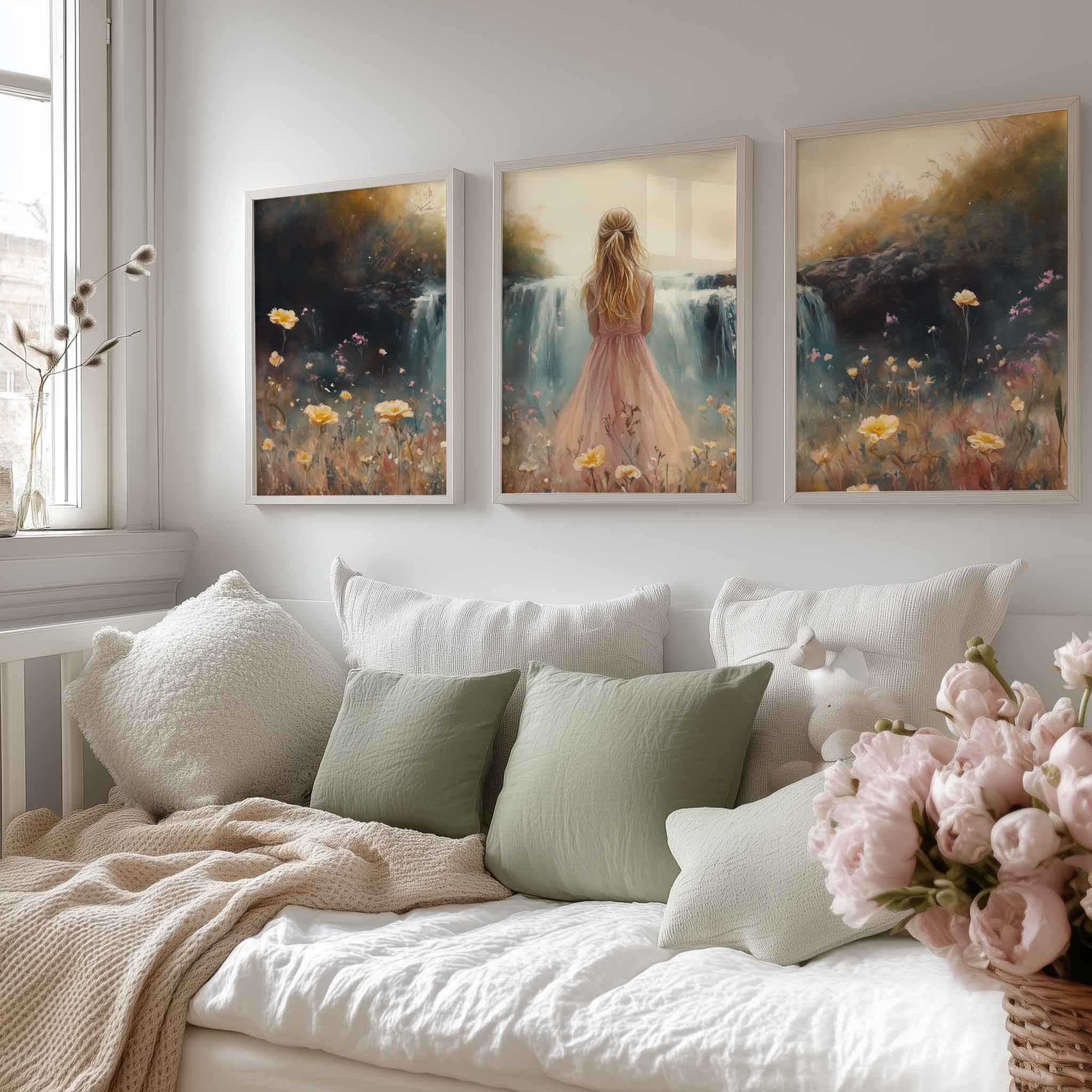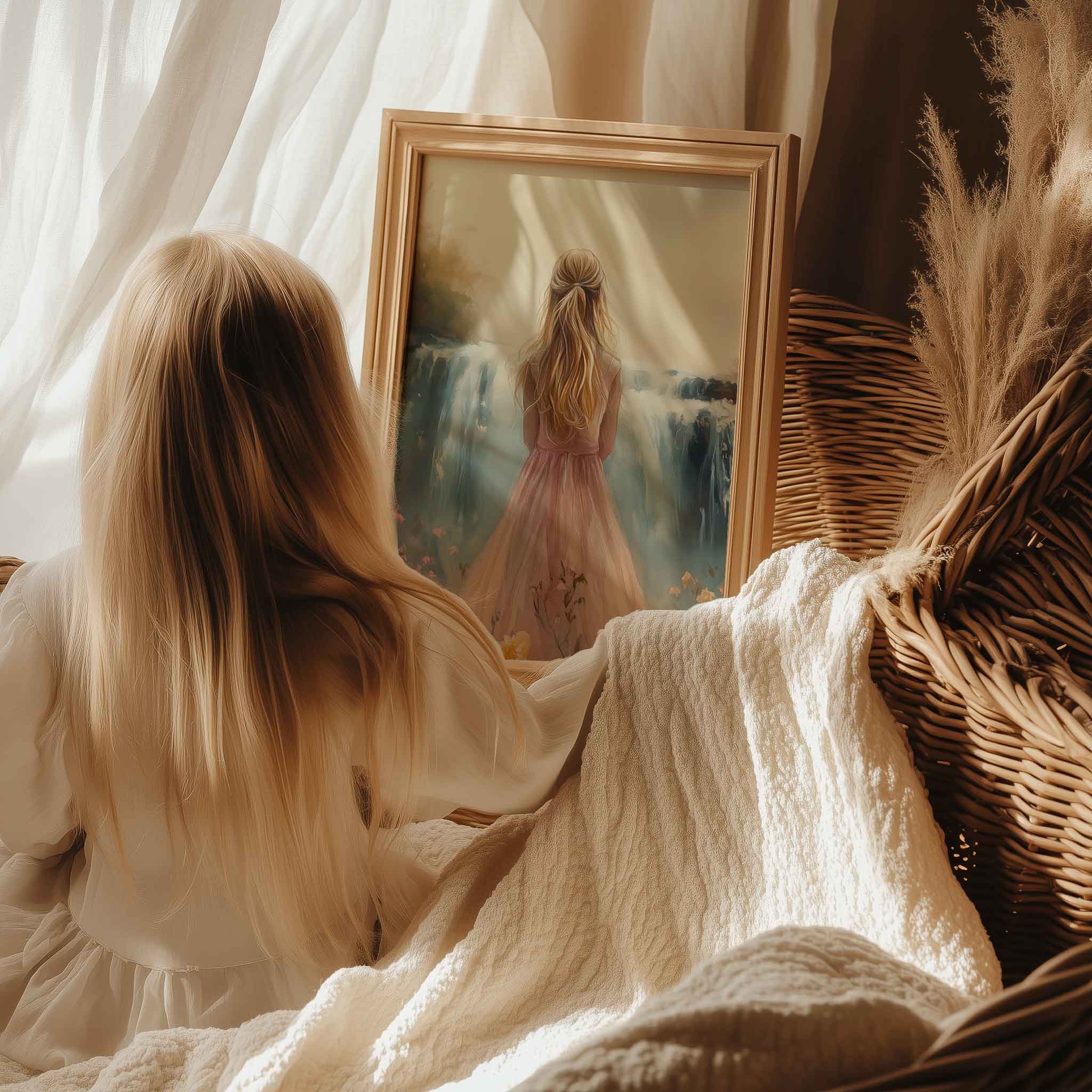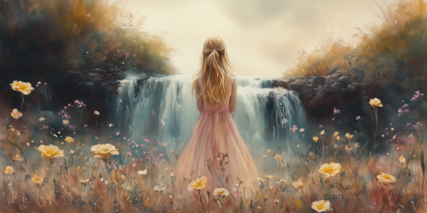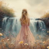 Roze Droom: Vrouw bij Waterval en Bloemenveld