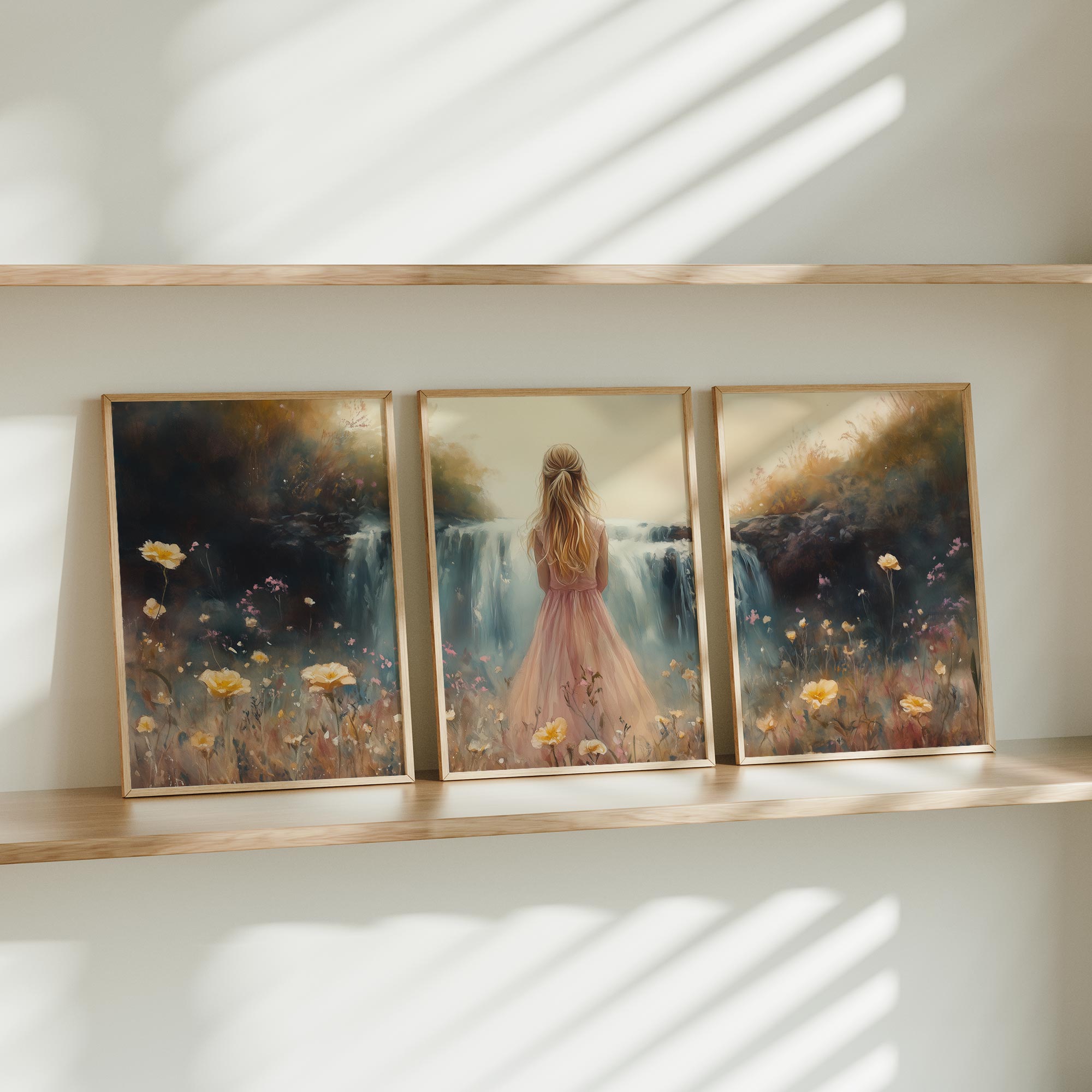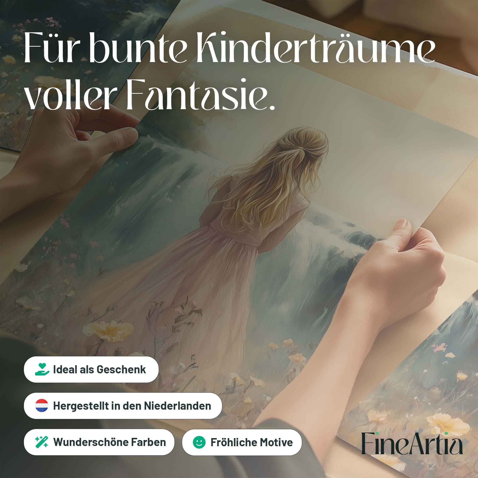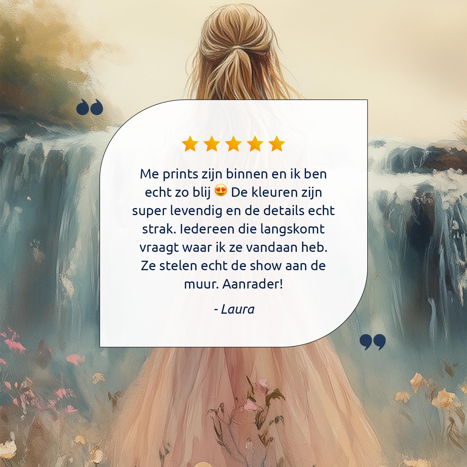 Roze Droom: Vrouw bij Waterval en Bloemenveld