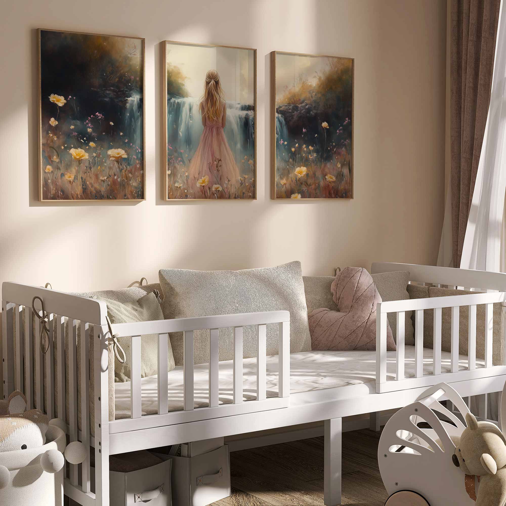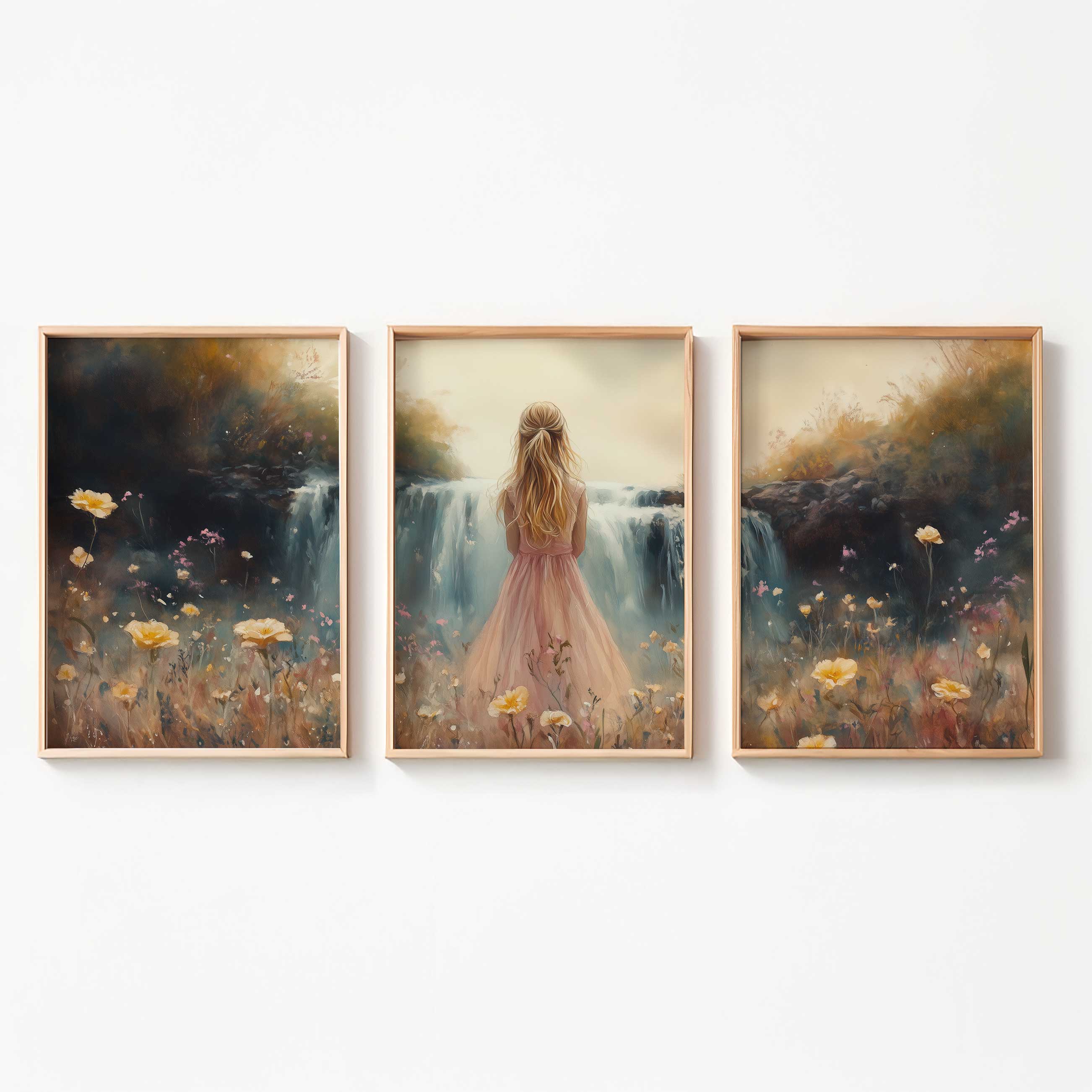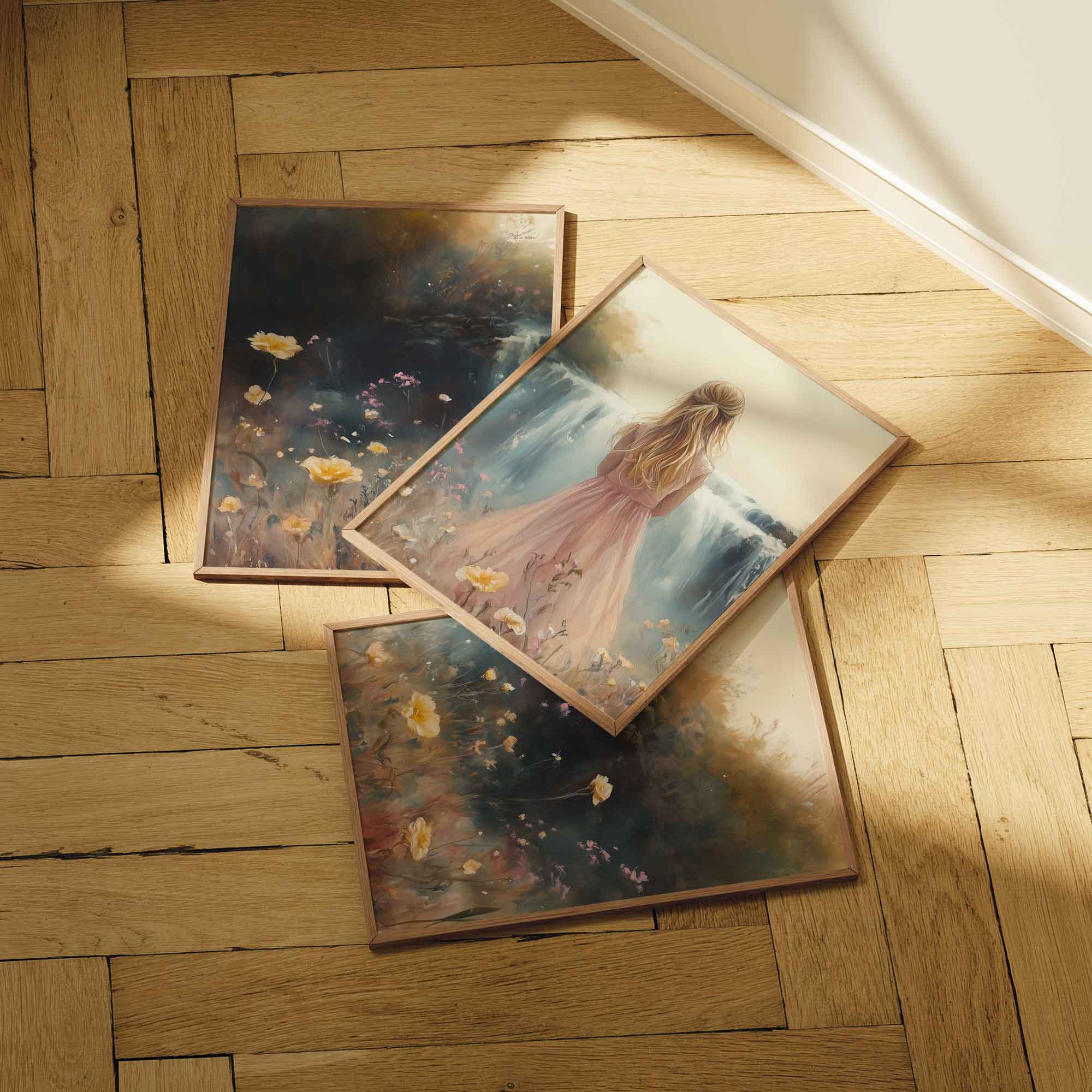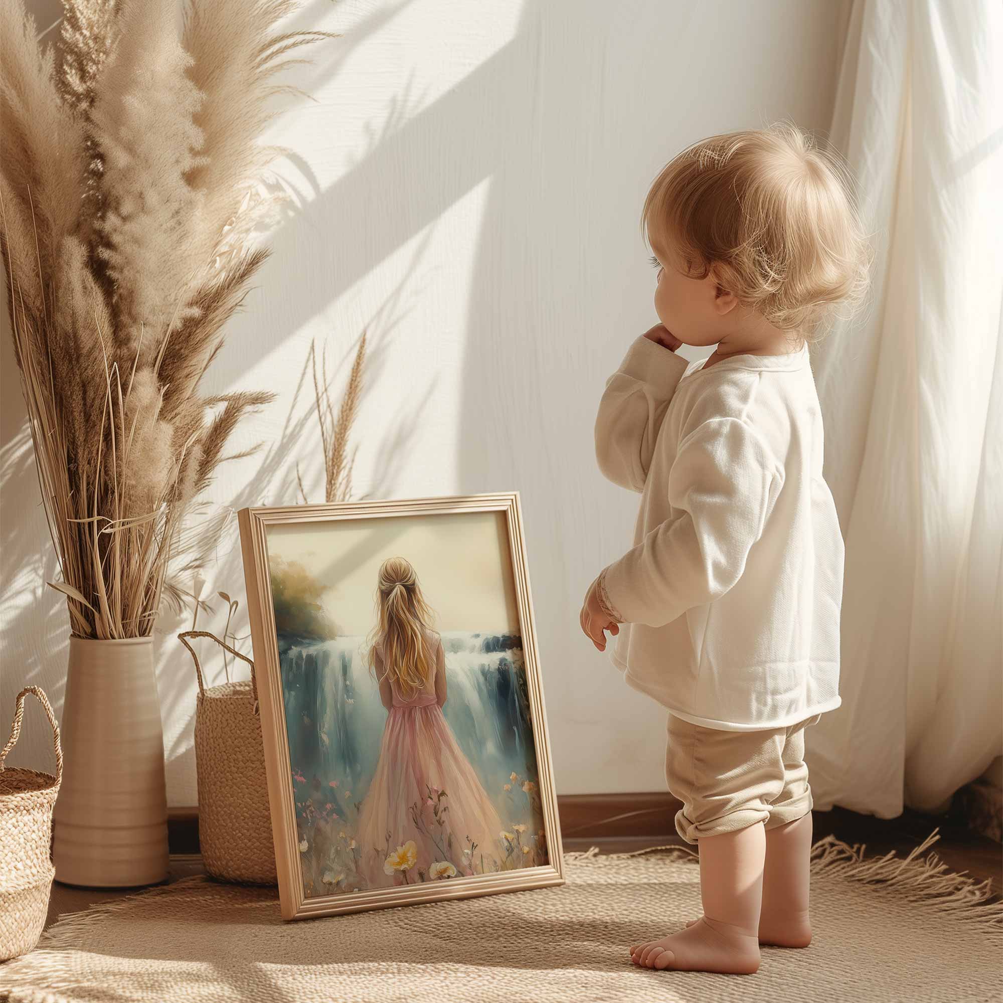 Roze Droom: Vrouw bij Waterval en Bloemenveld
