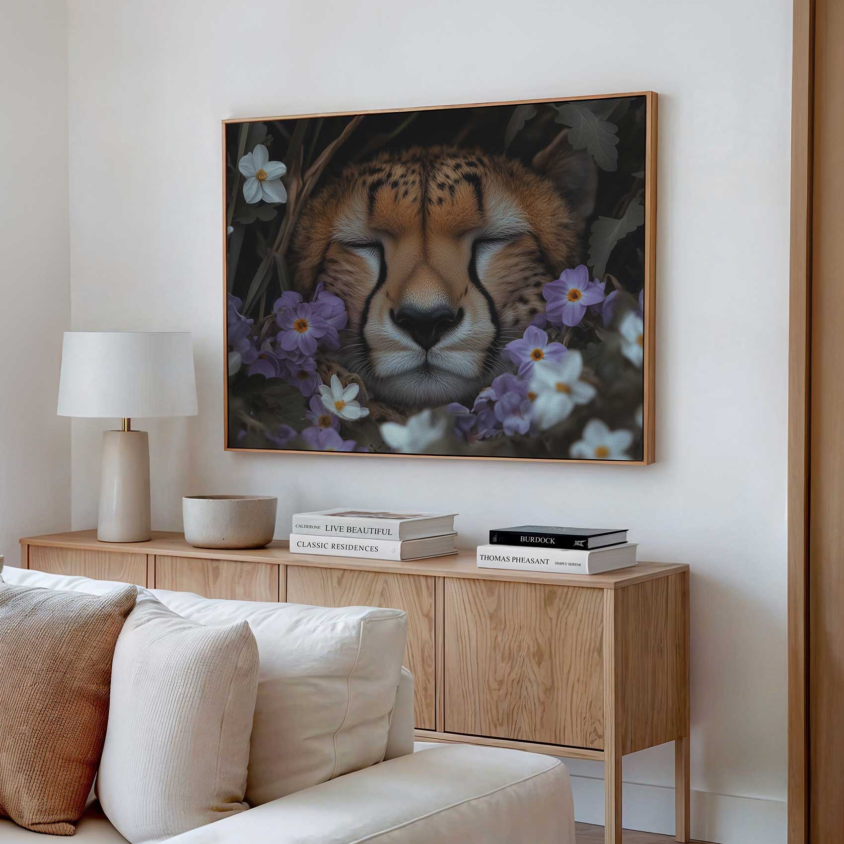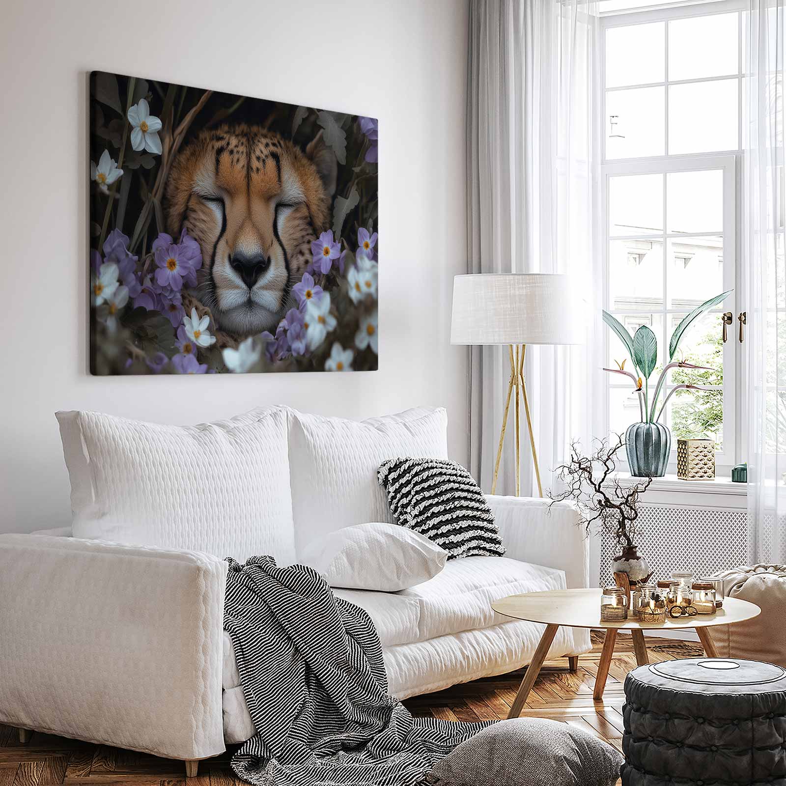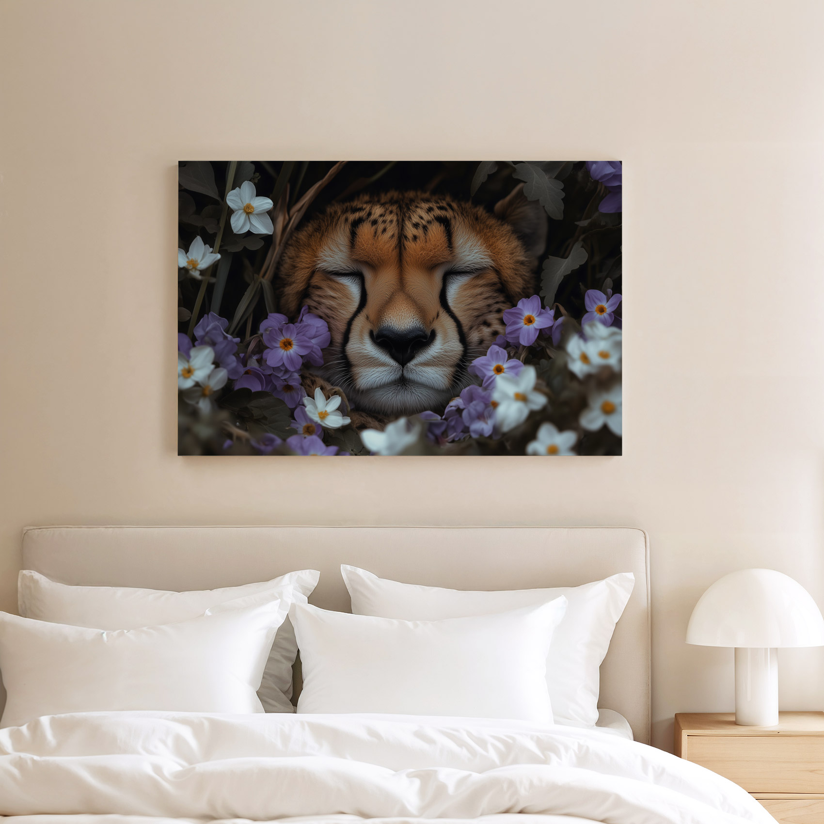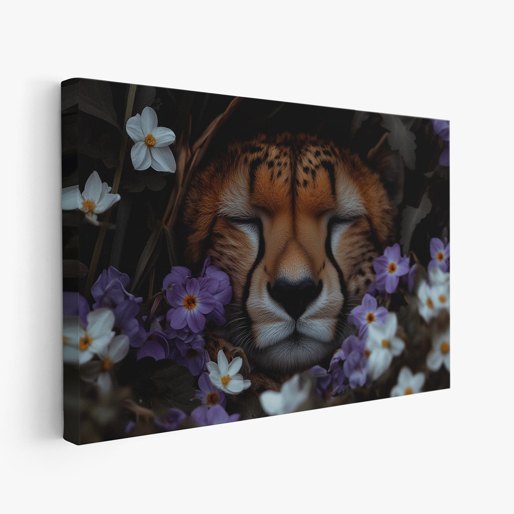 Terug naar collectie Canvas Rustende cheetah tussen paarse bloemen