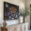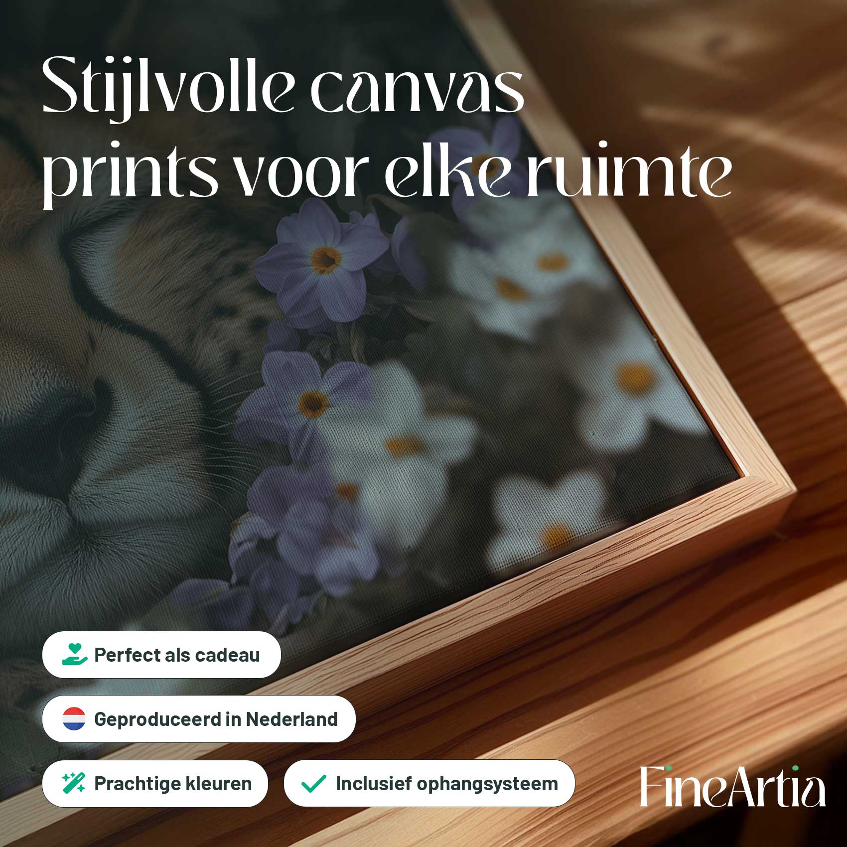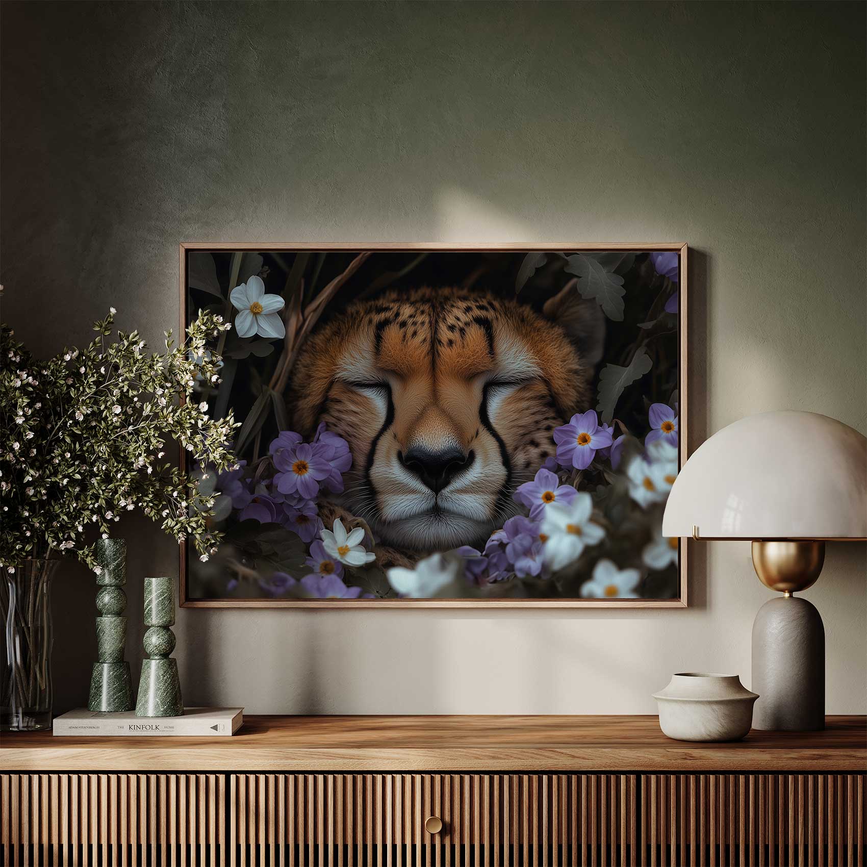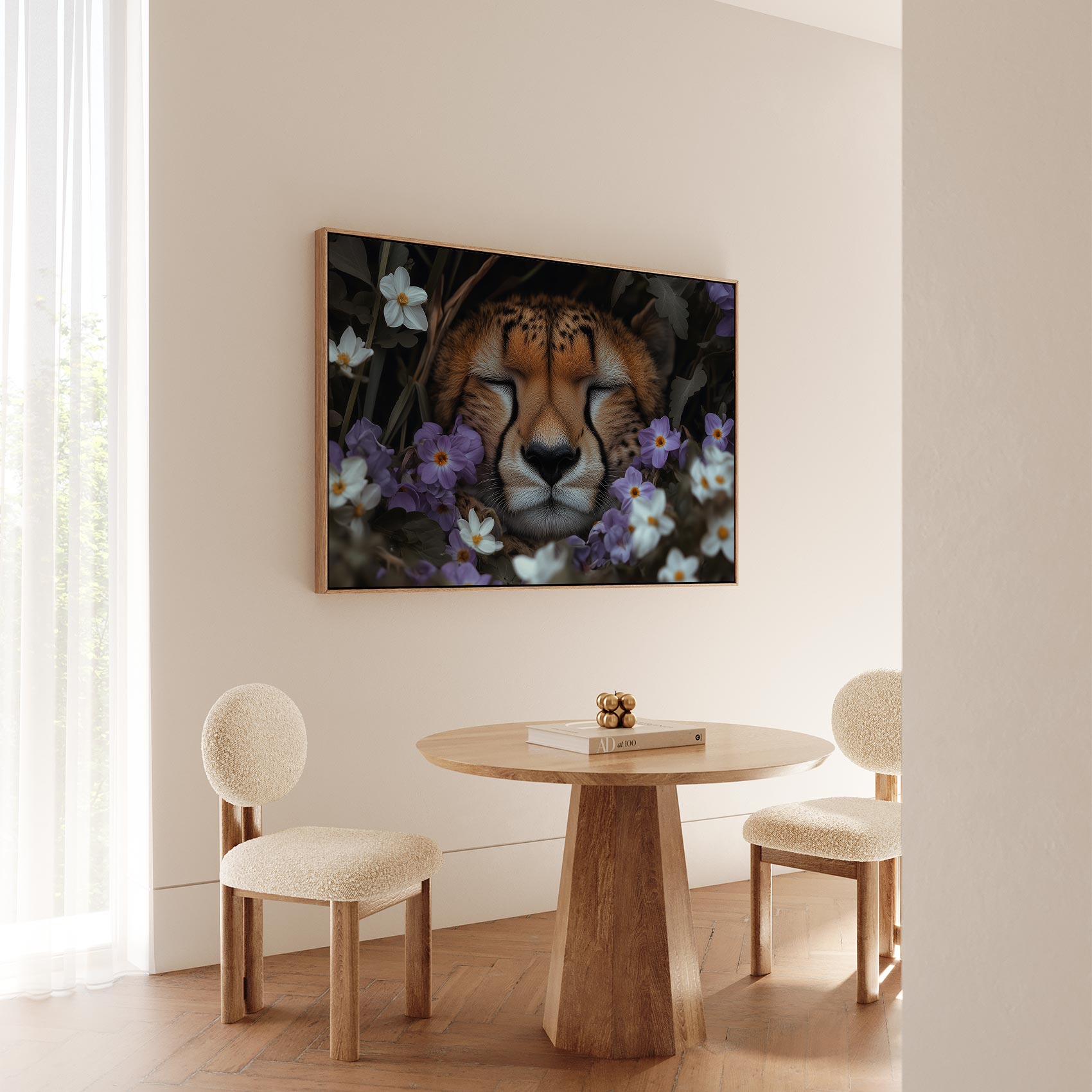 Terug naar collectie Canvas Rustende cheetah tussen paarse bloemen