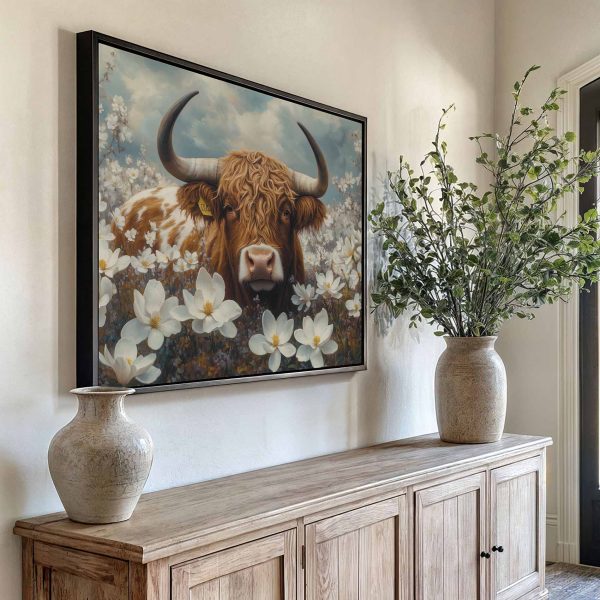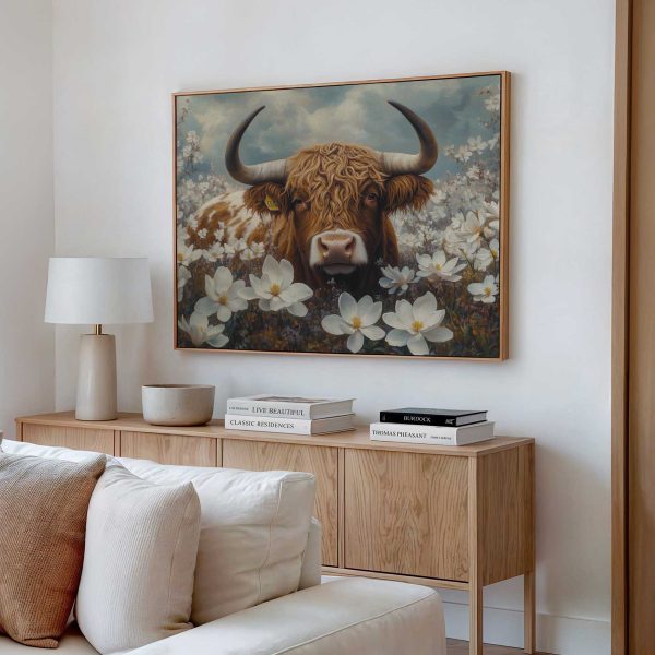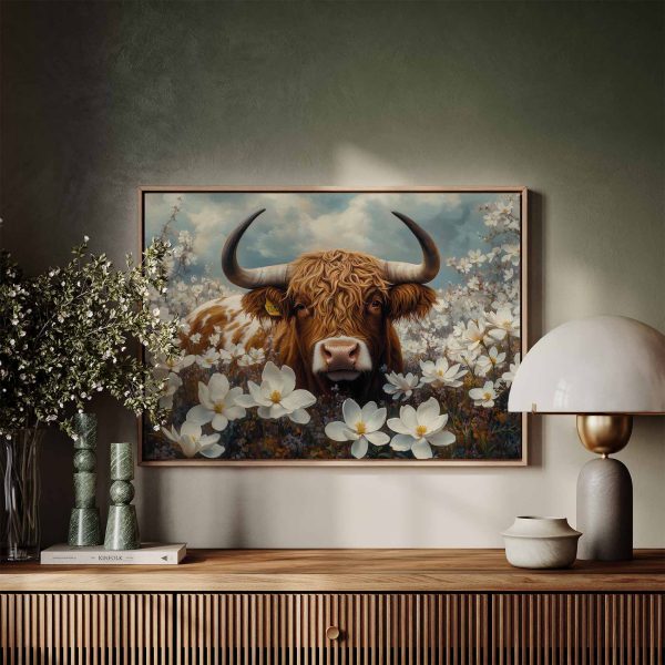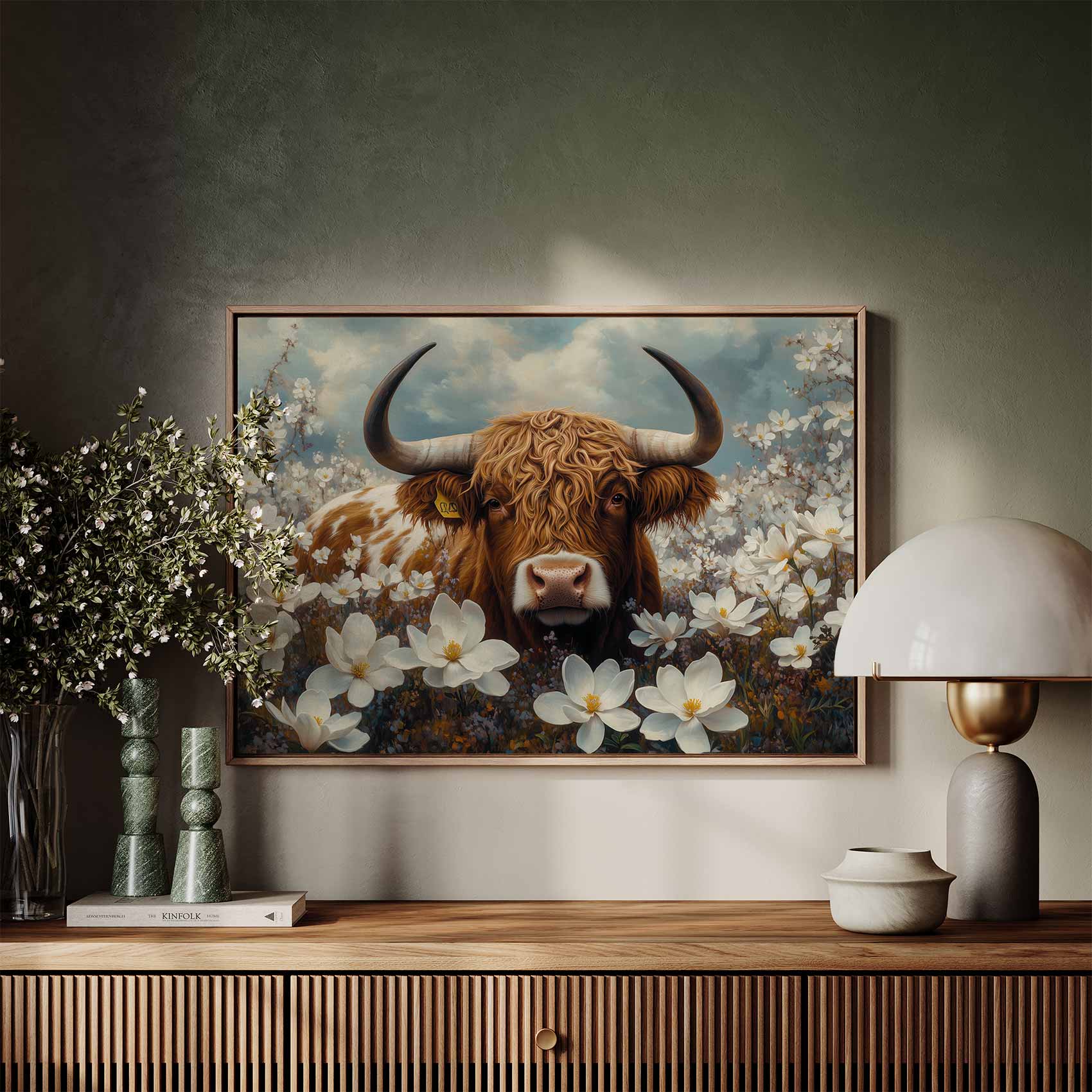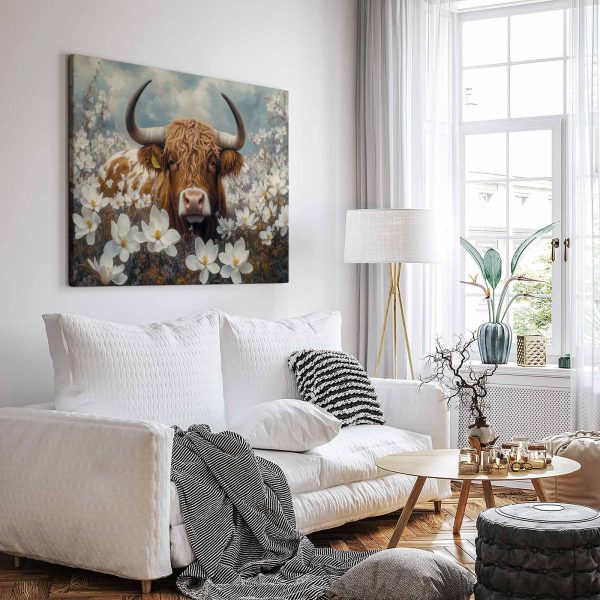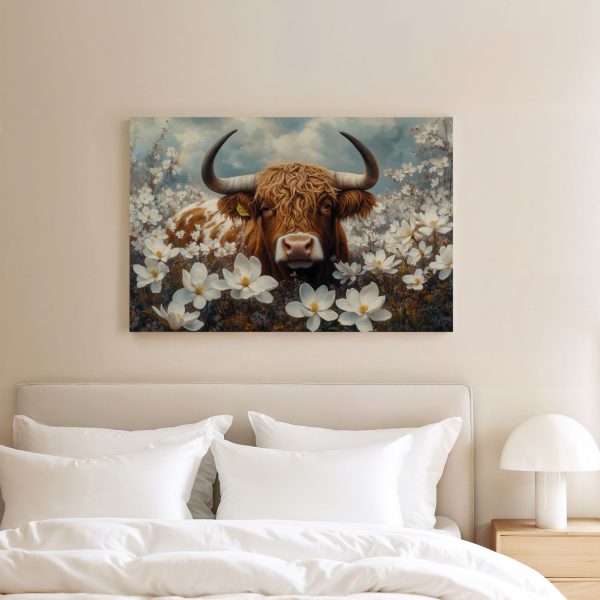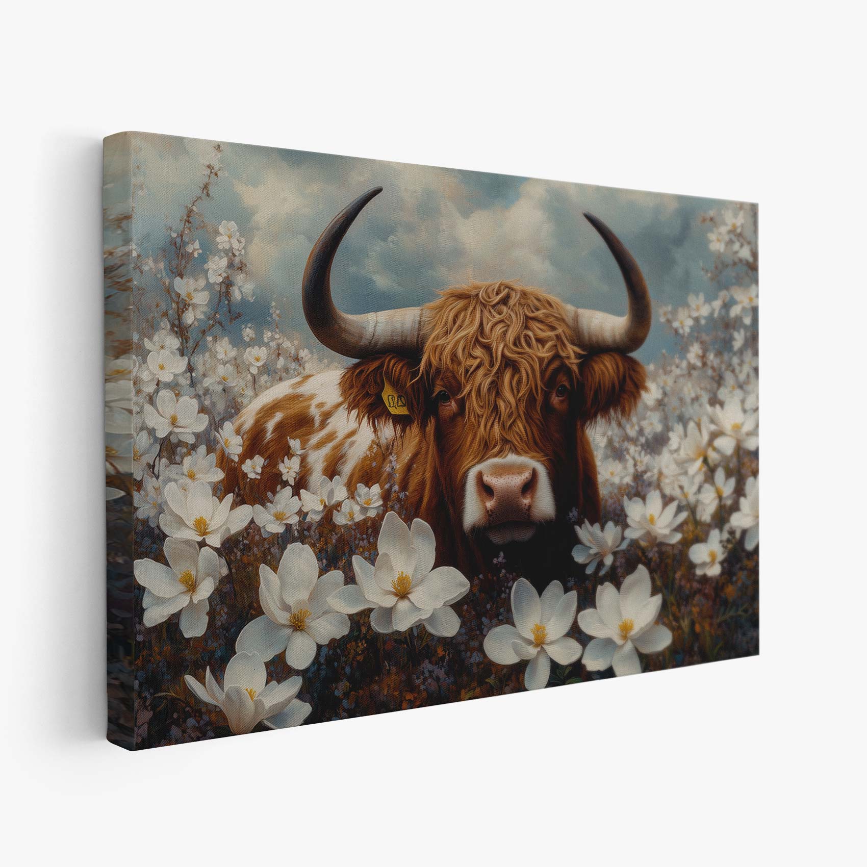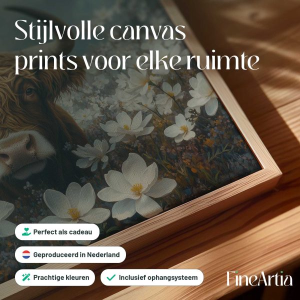 Terug naar collectie Canvas Rustige koe in bloemenveld