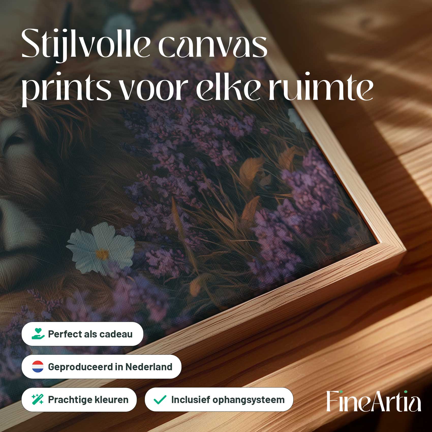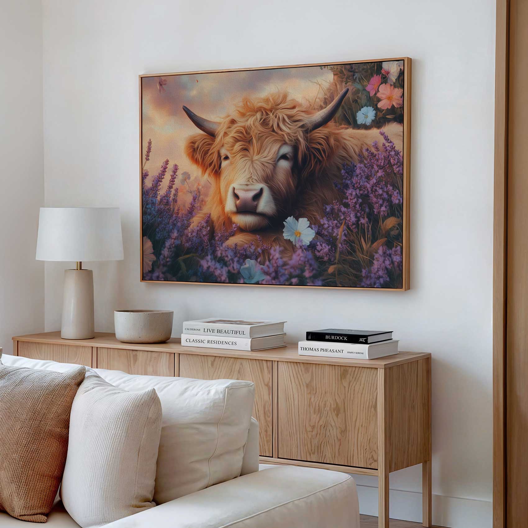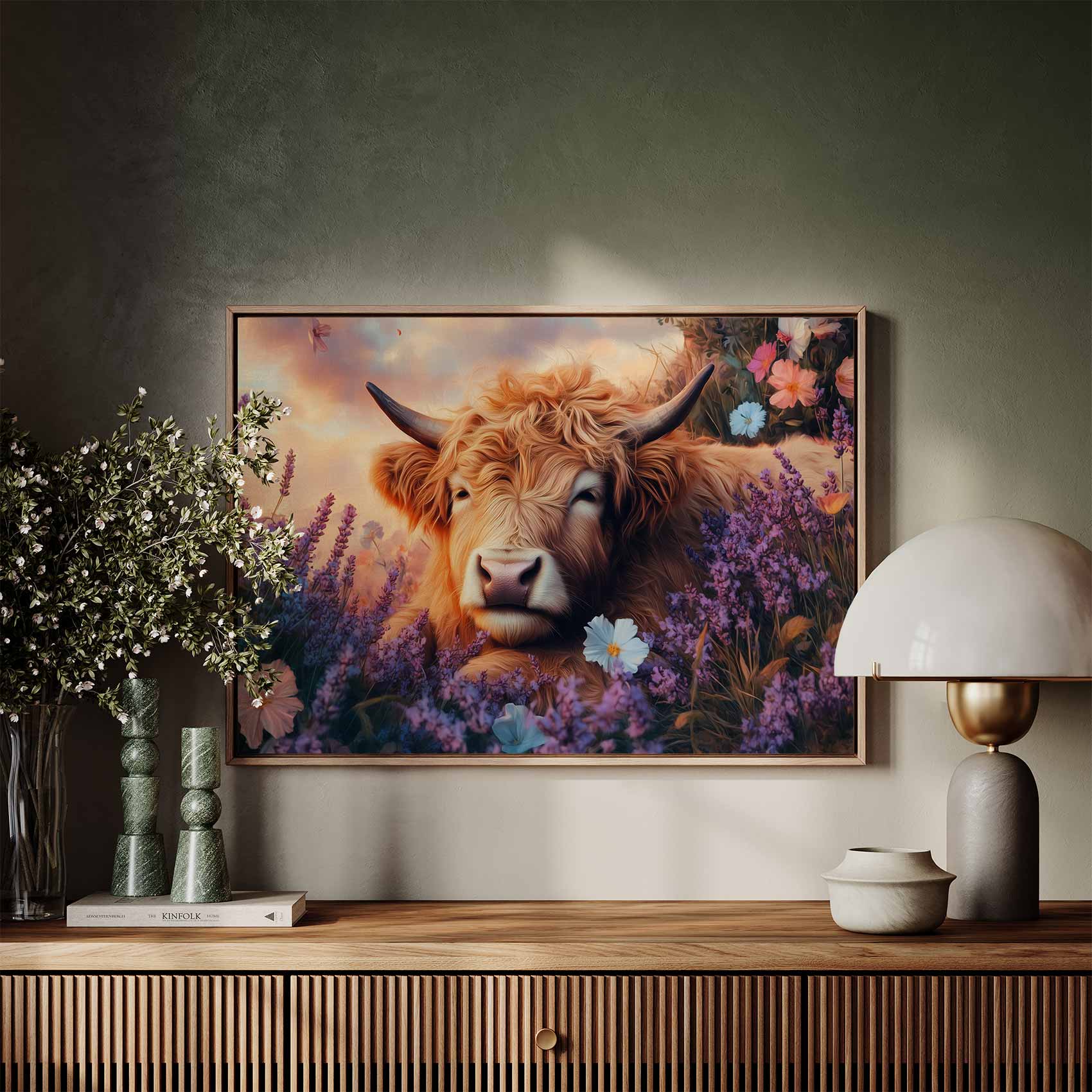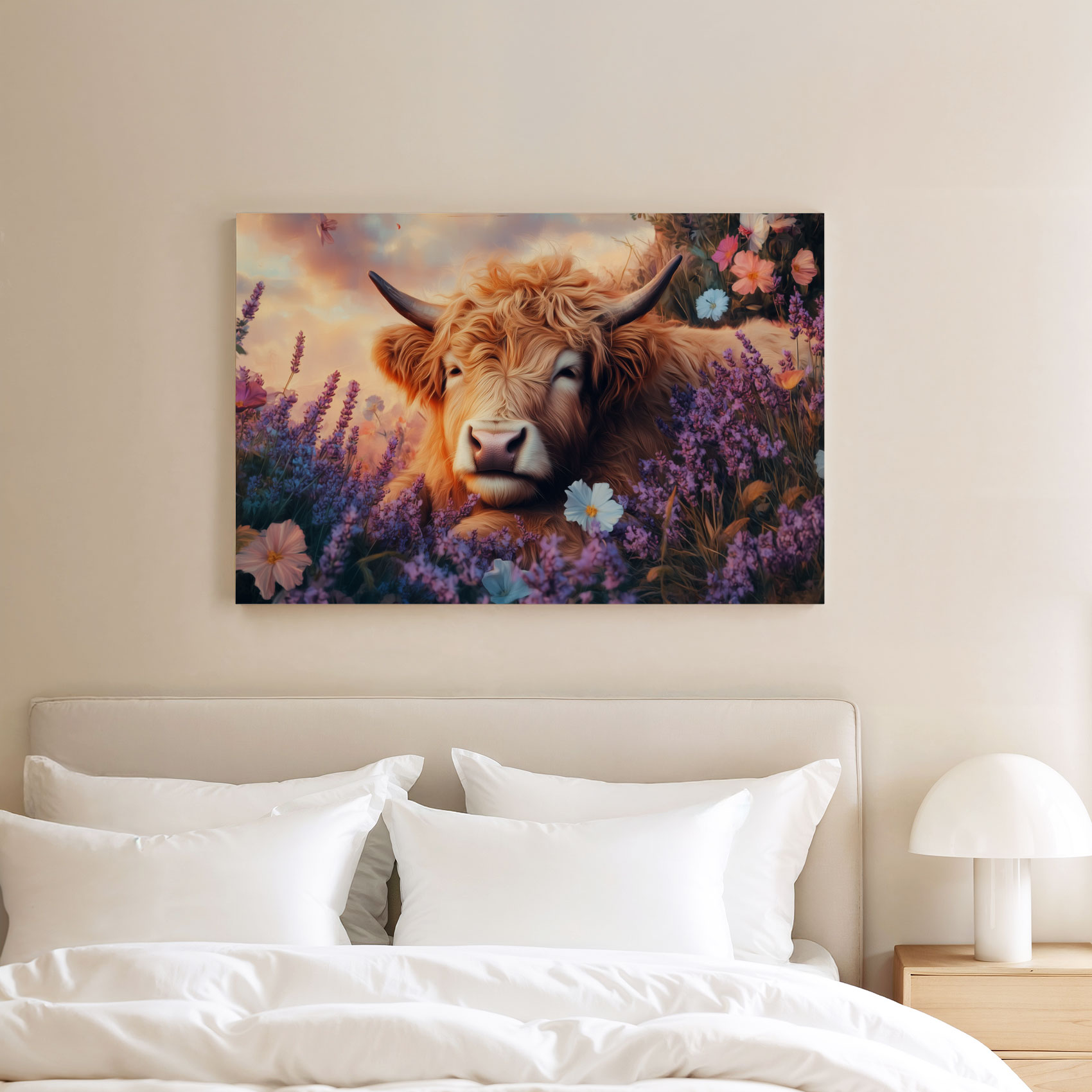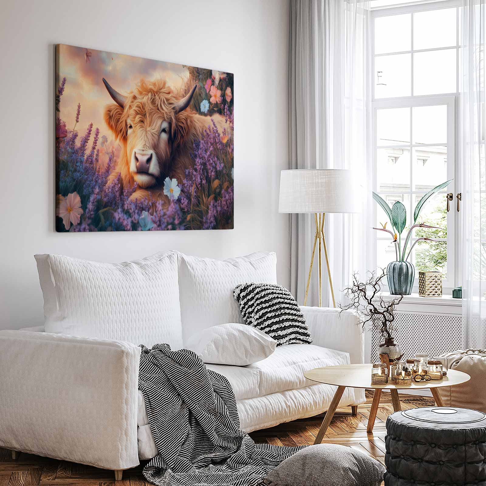 Terug naar collectie Canvas Rustige koe in bloemenveld
