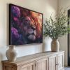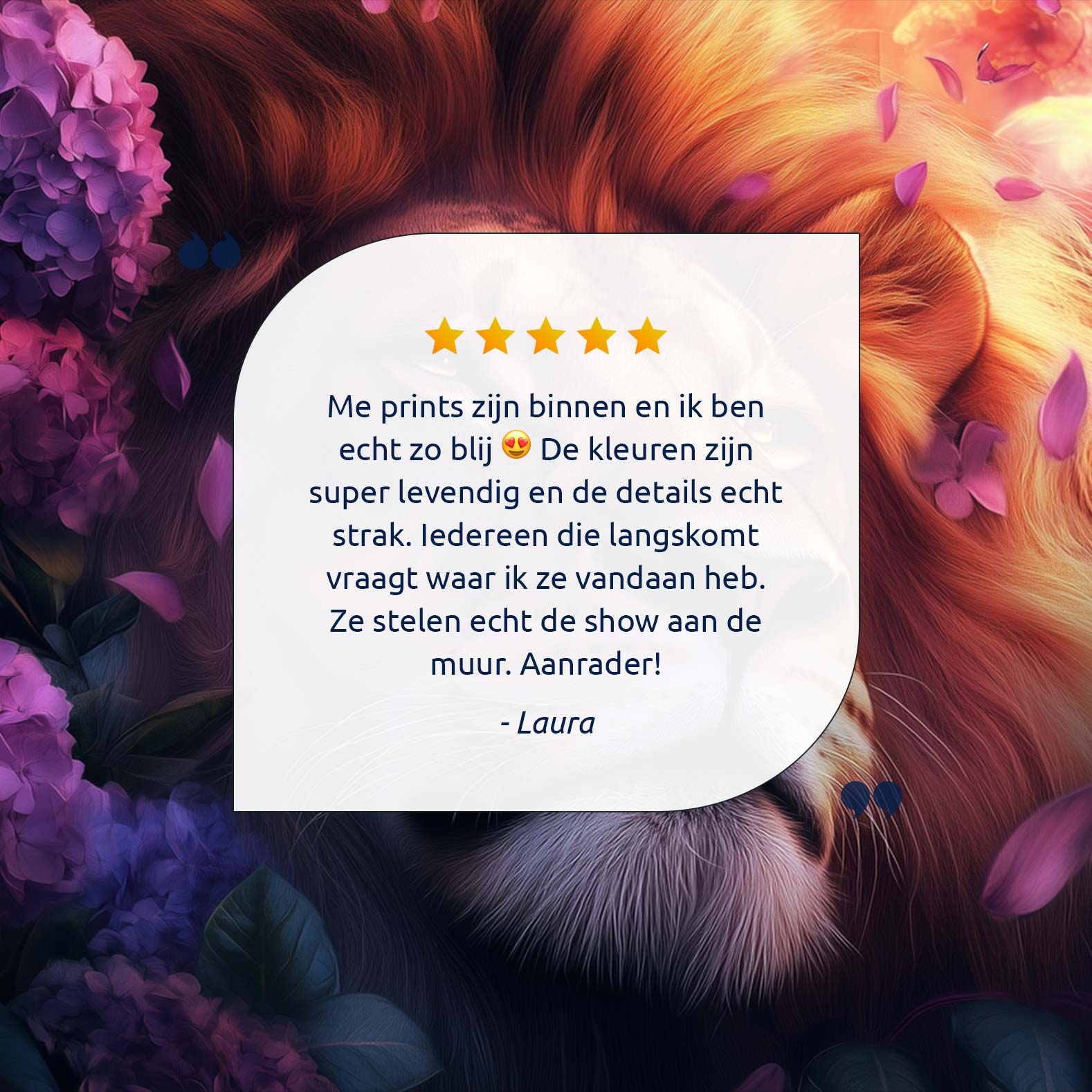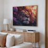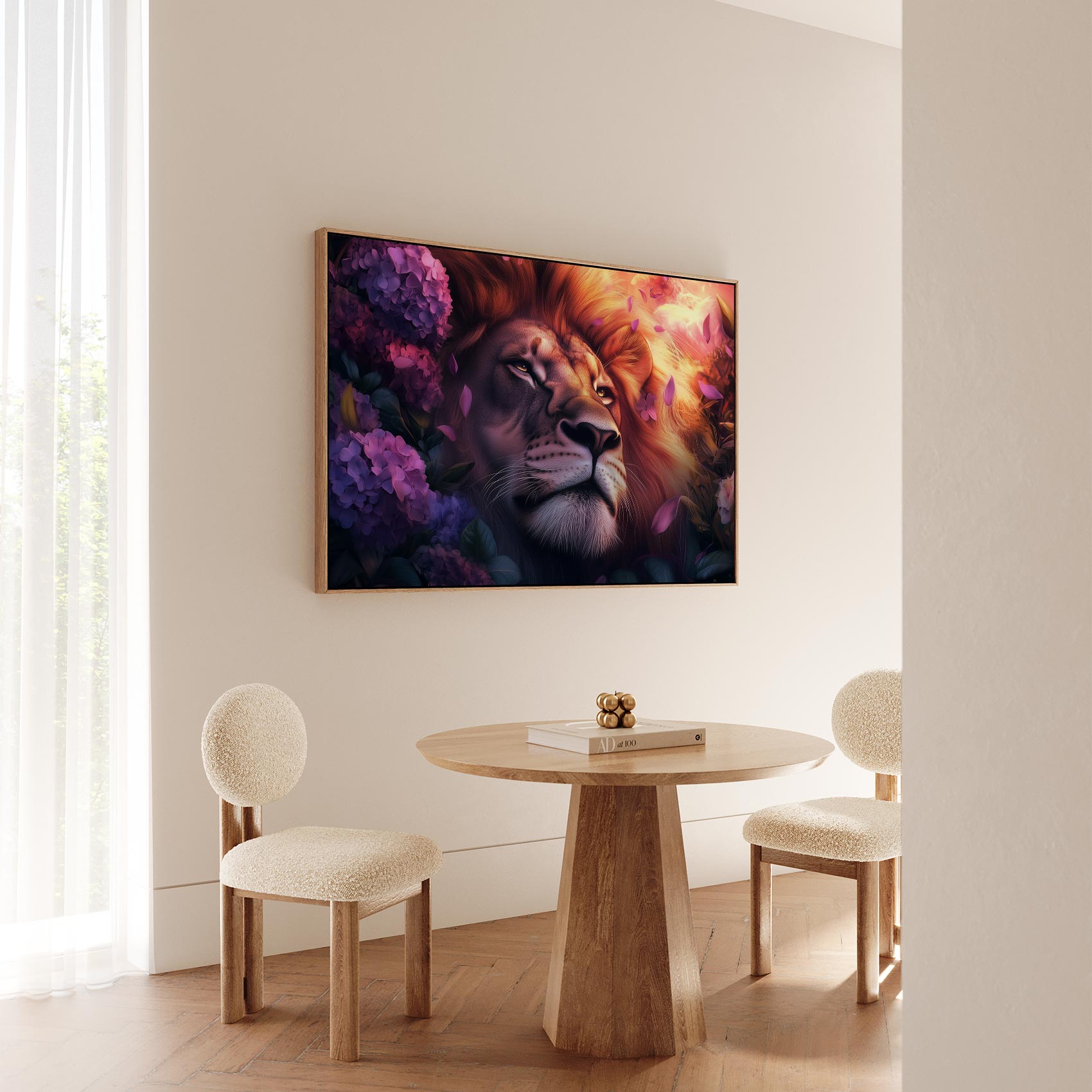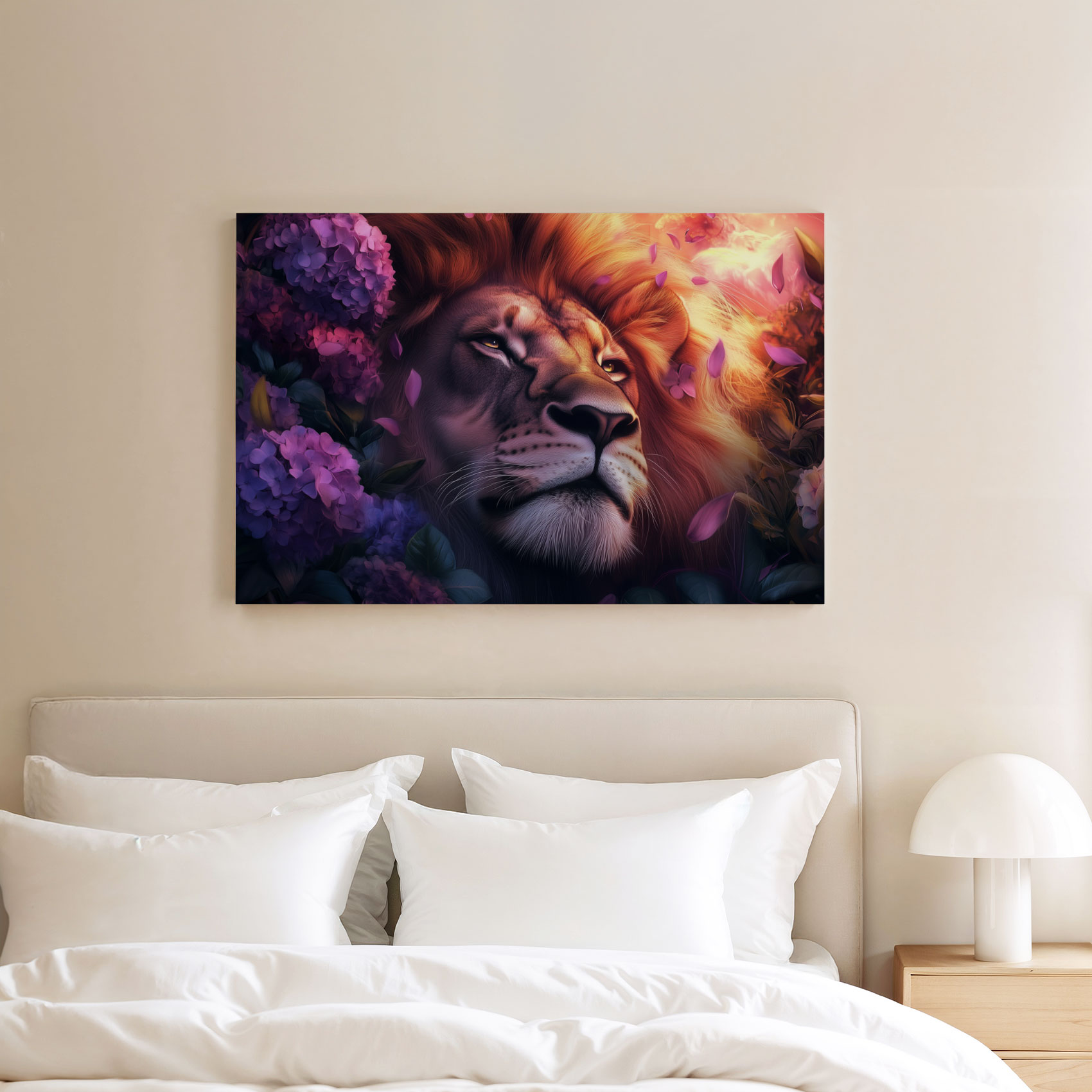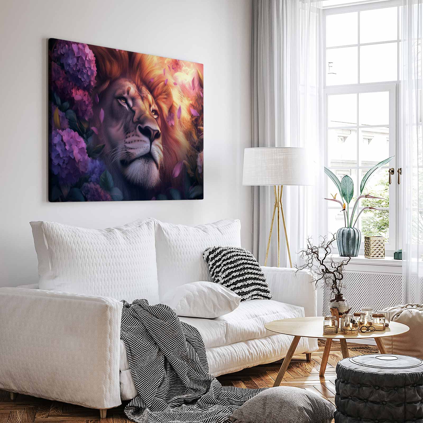 Terug naar collectie Canvas Rustige leeuw tussen paarse bloemen