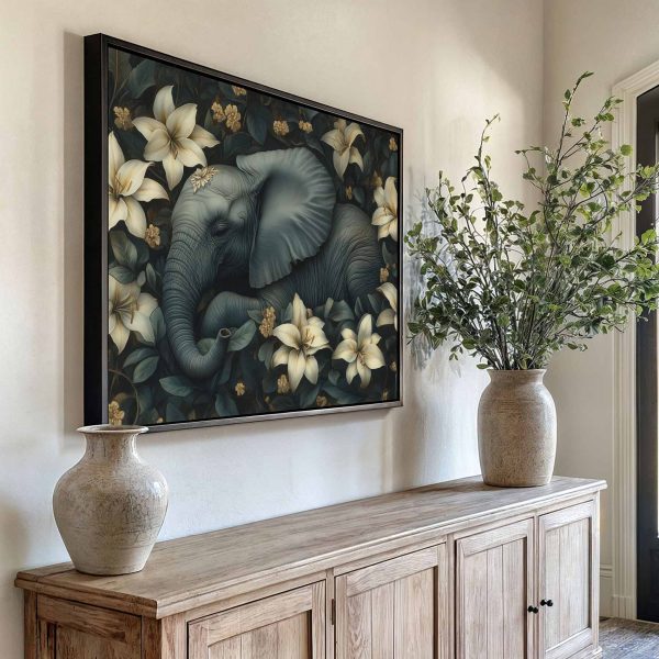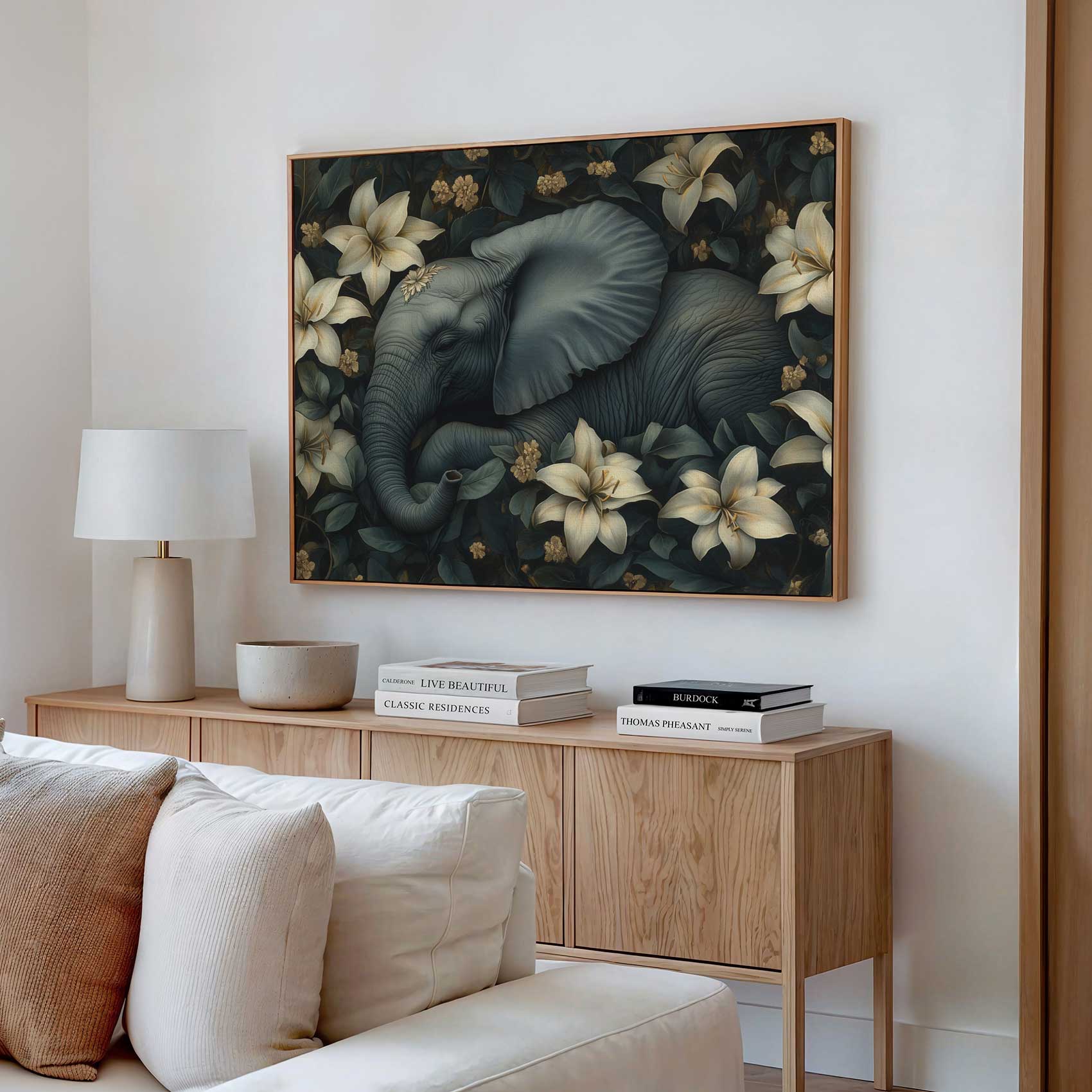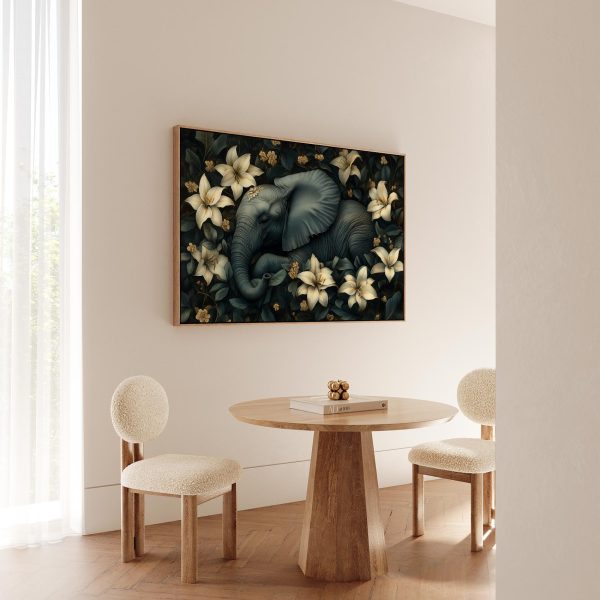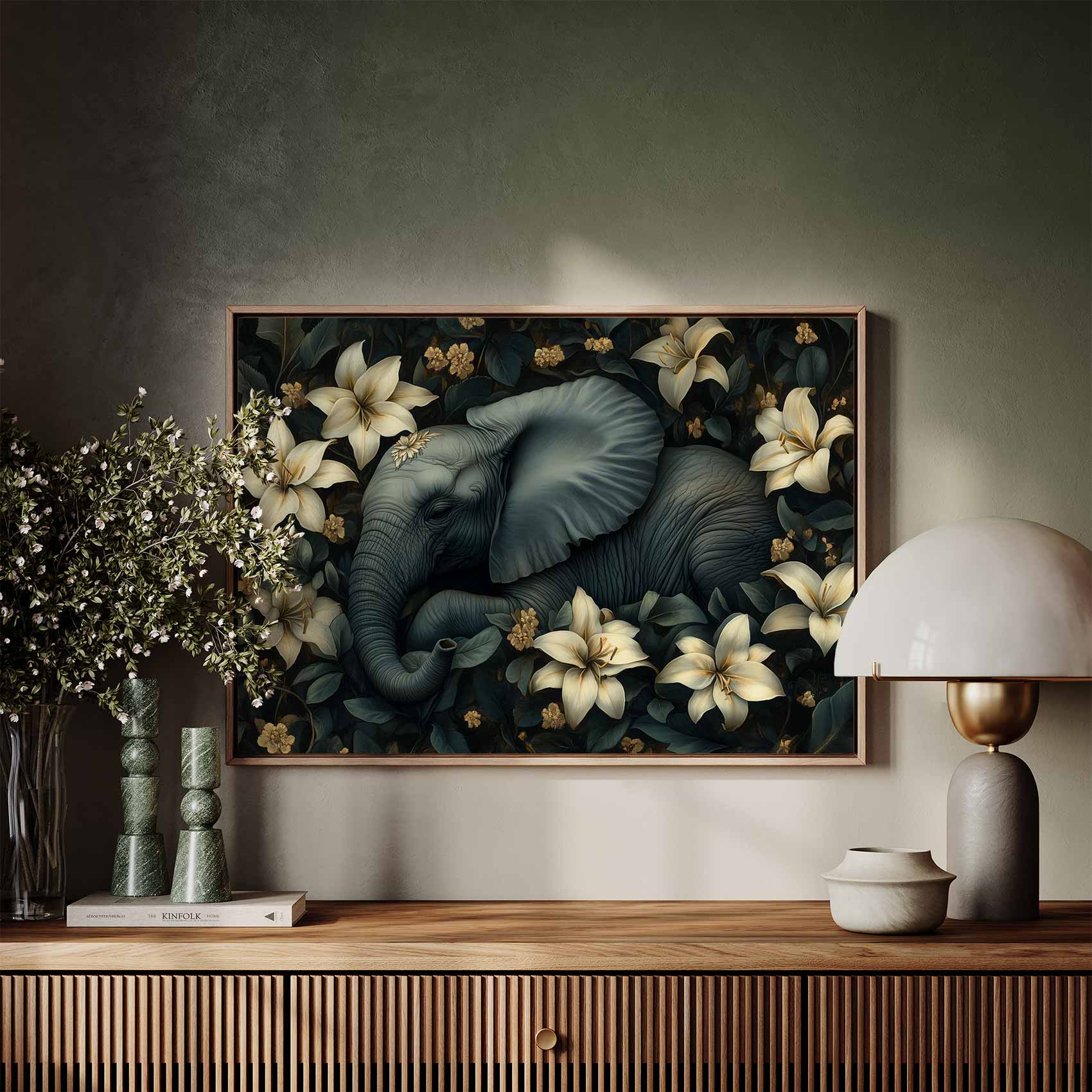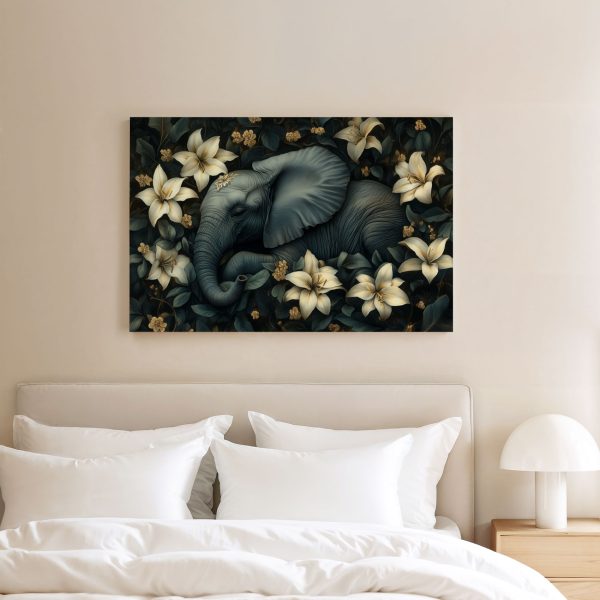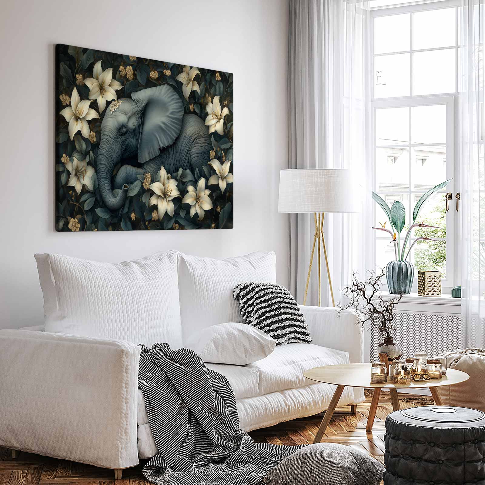 Terug naar collectie Canvas Rustige Olifant in Bloementuin