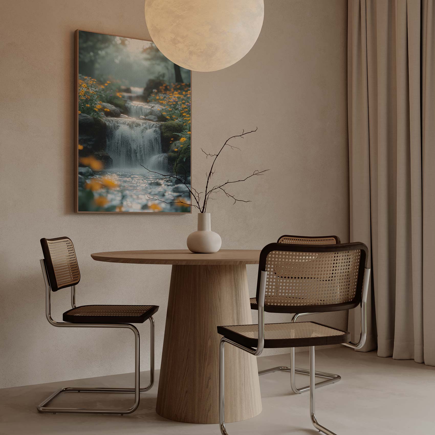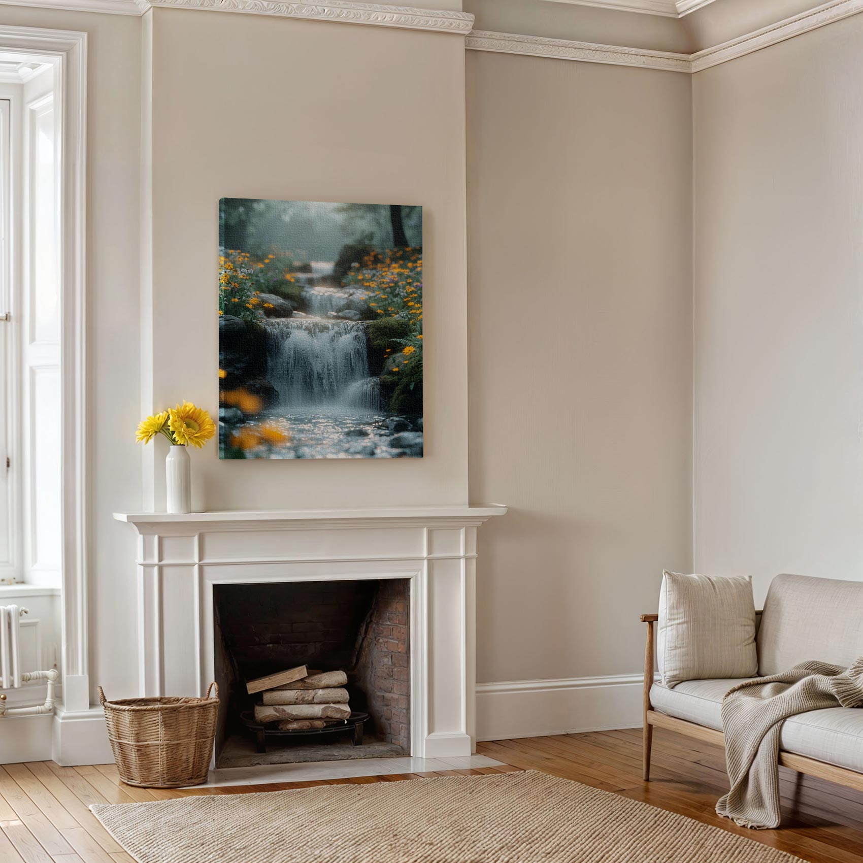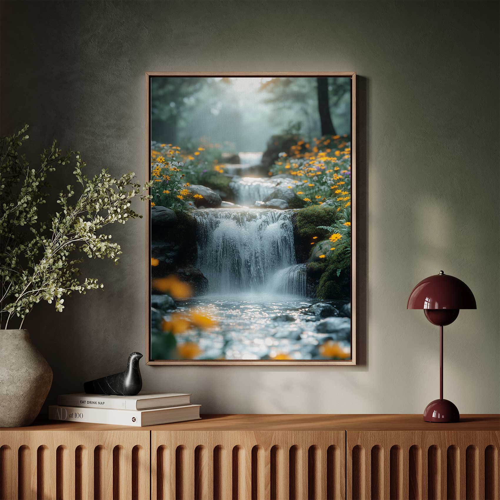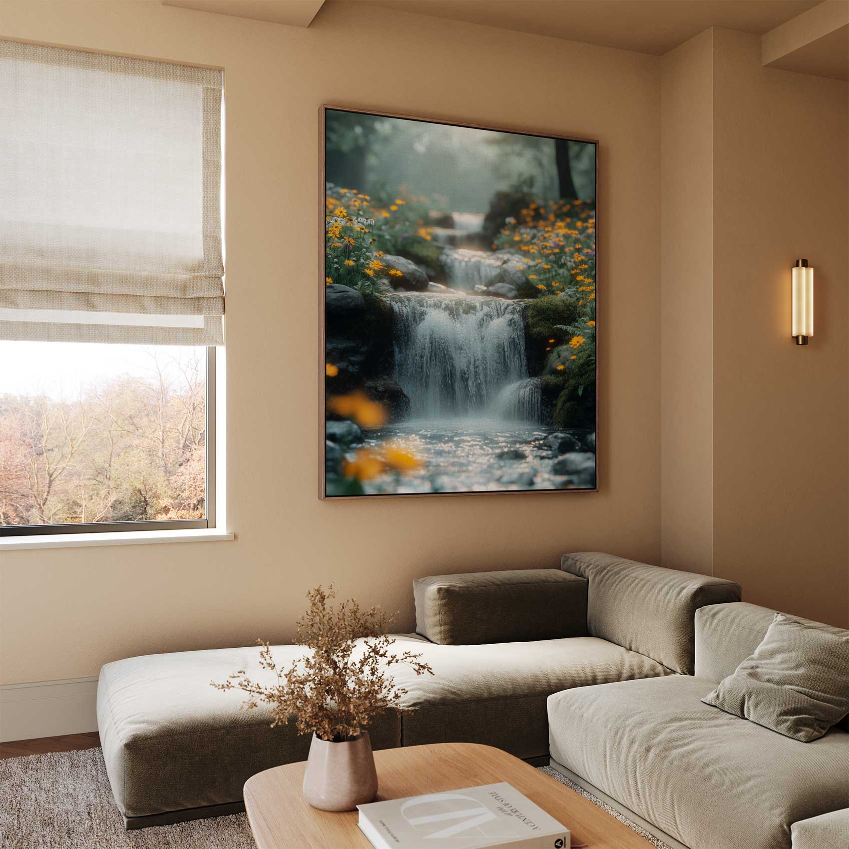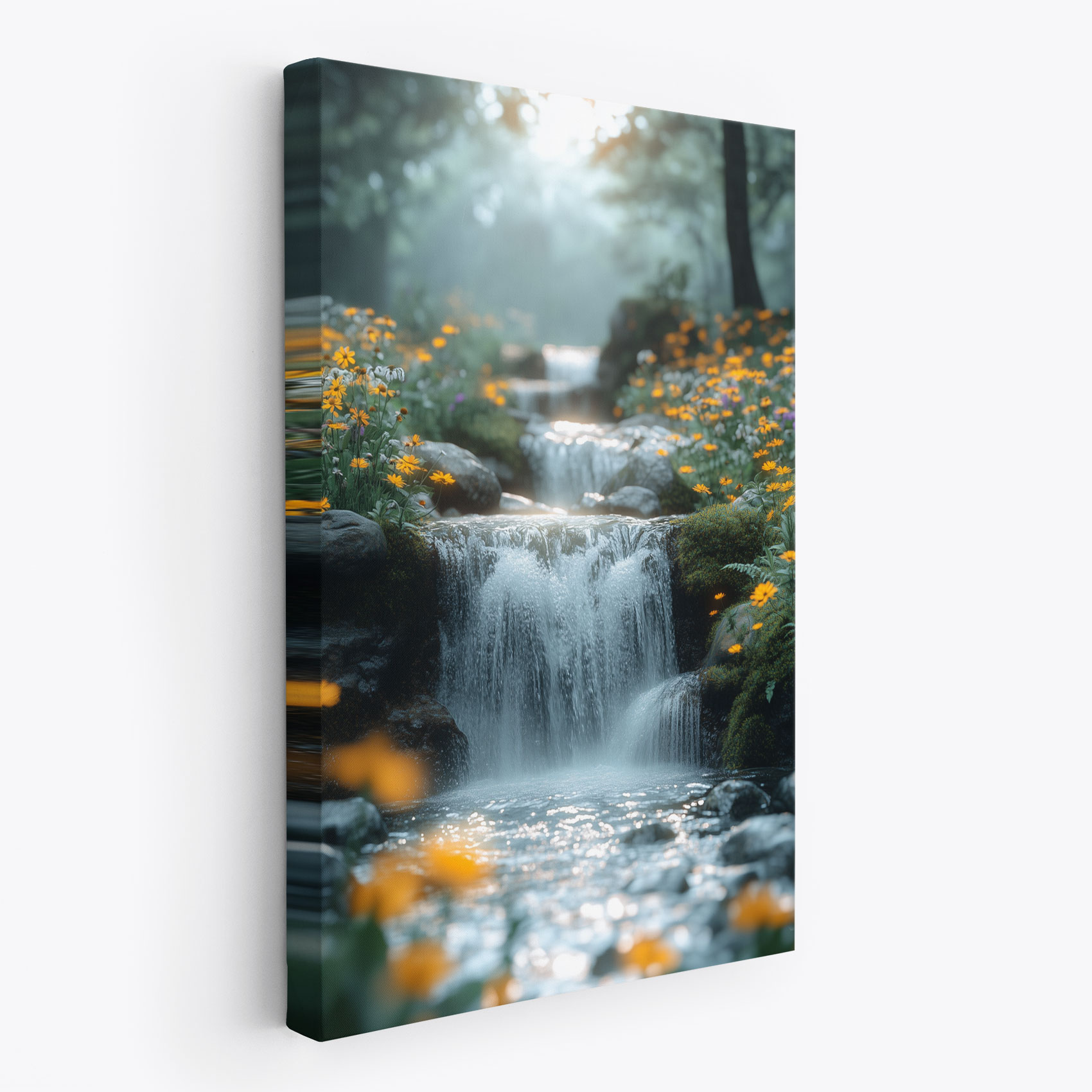 Rustige waterval in bloementuin