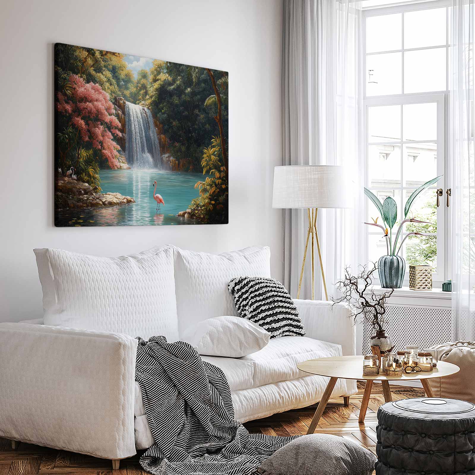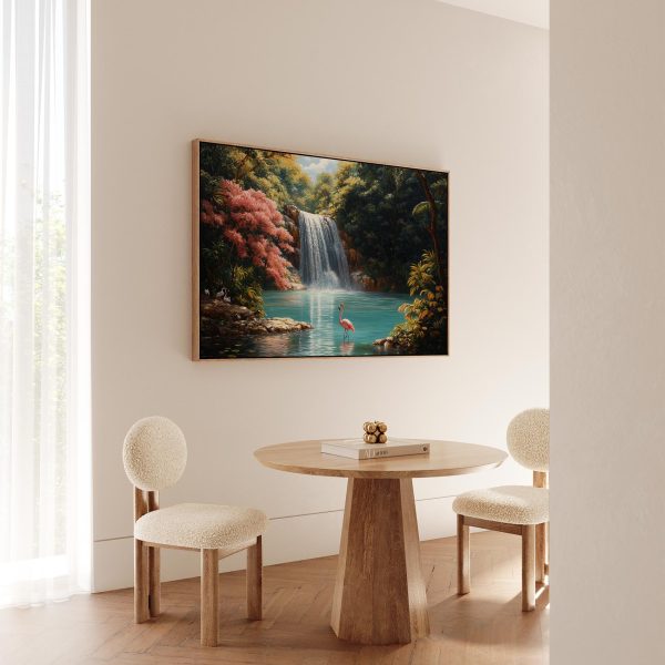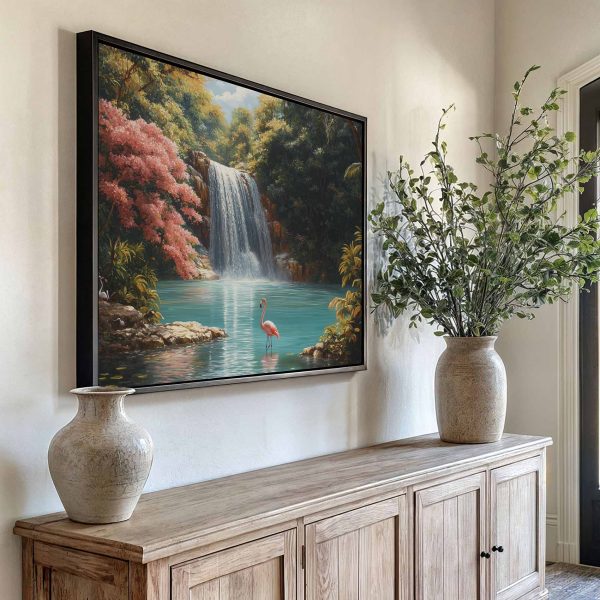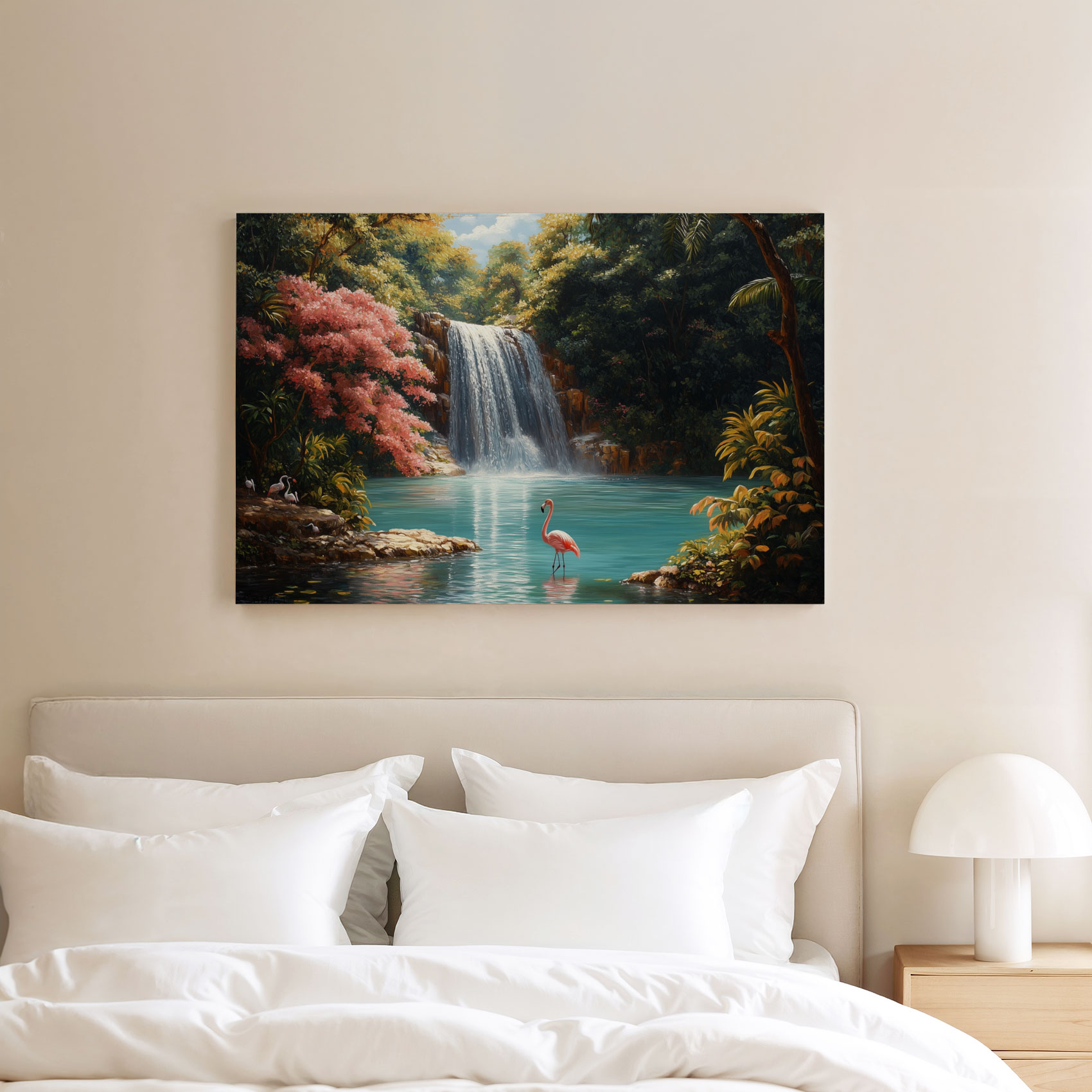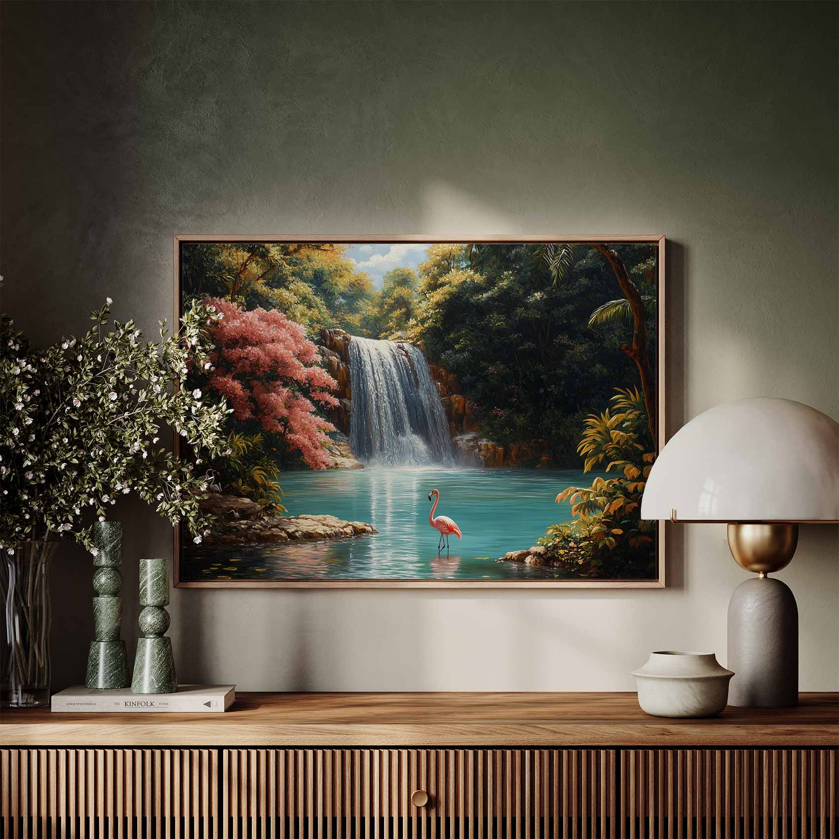 Rustige waterval met flamingo