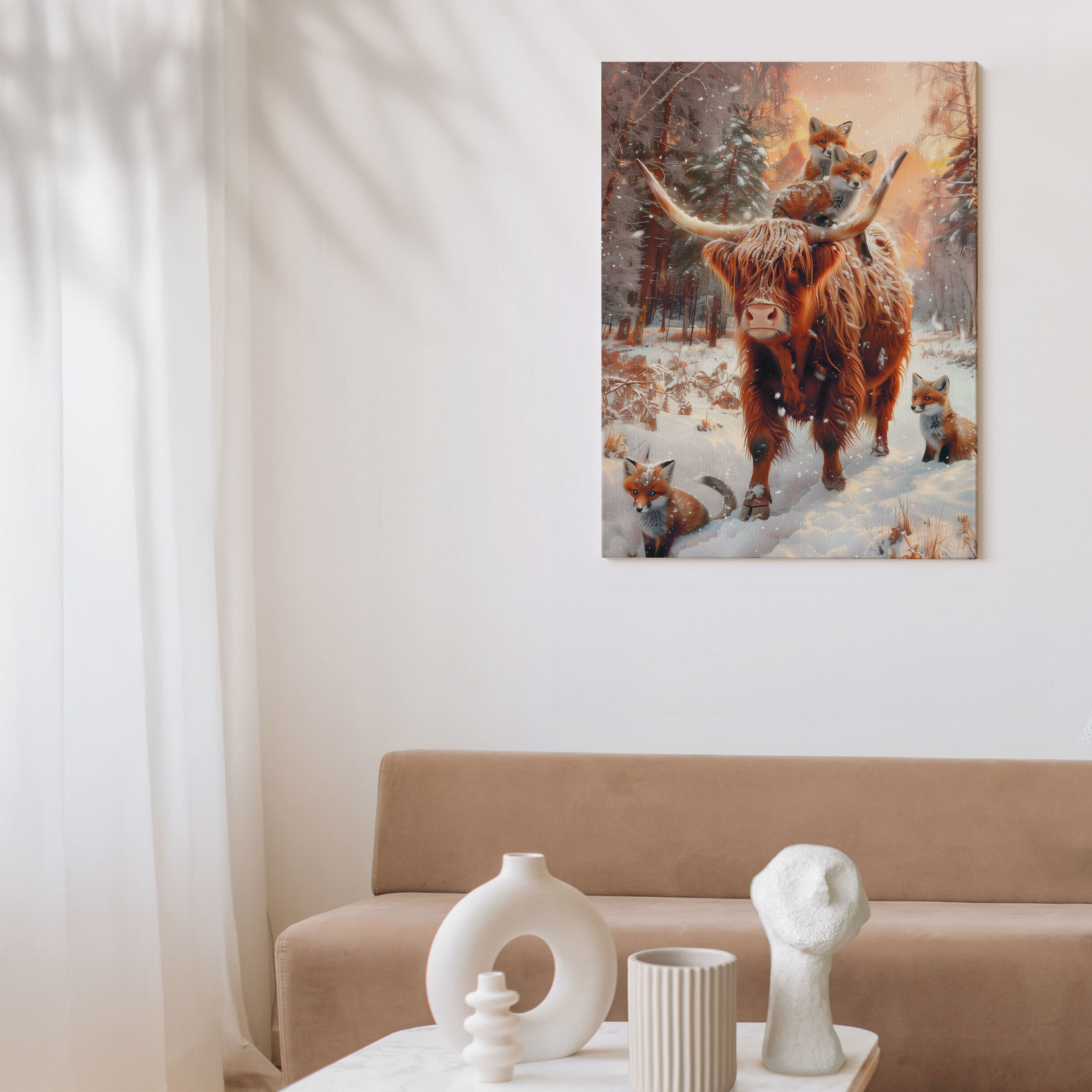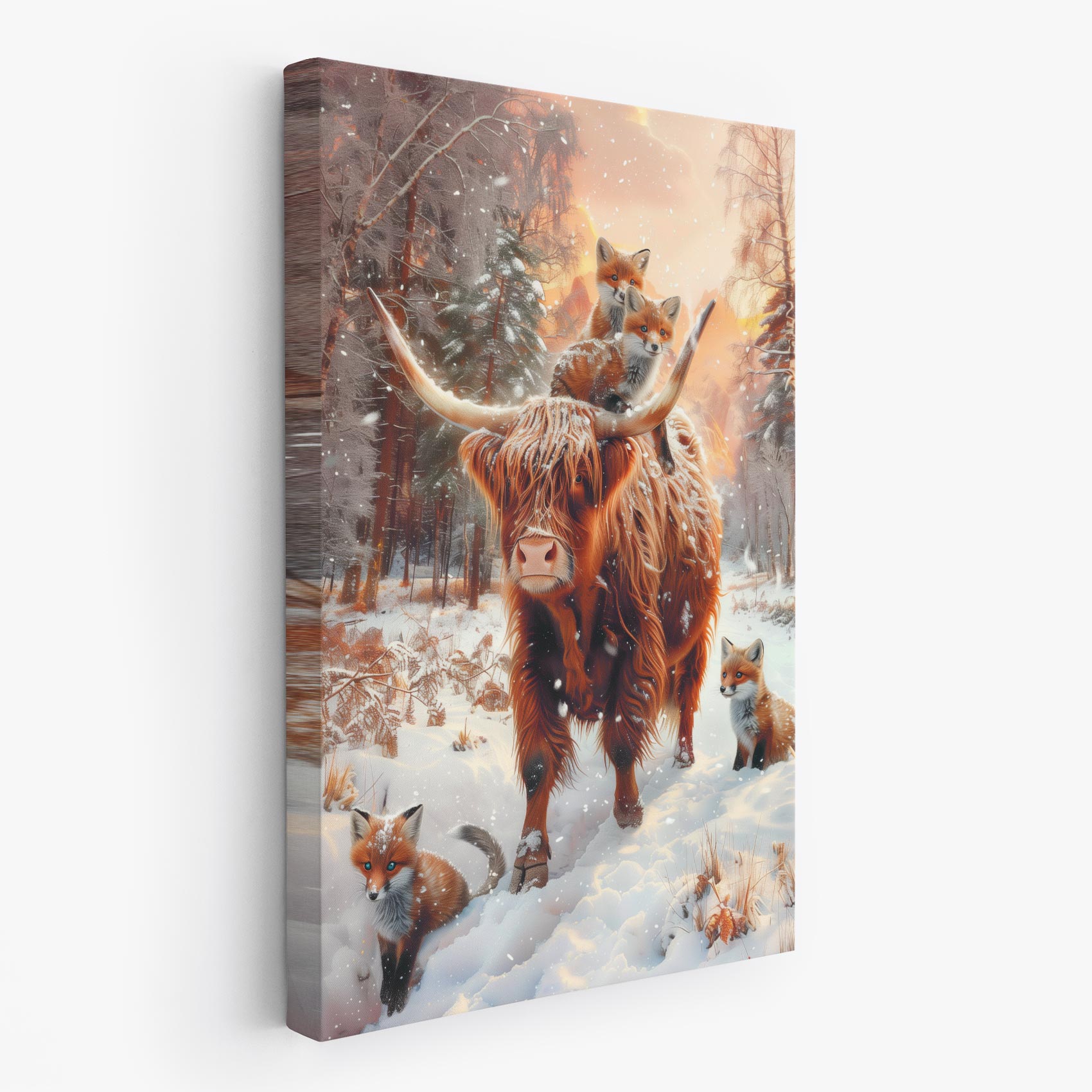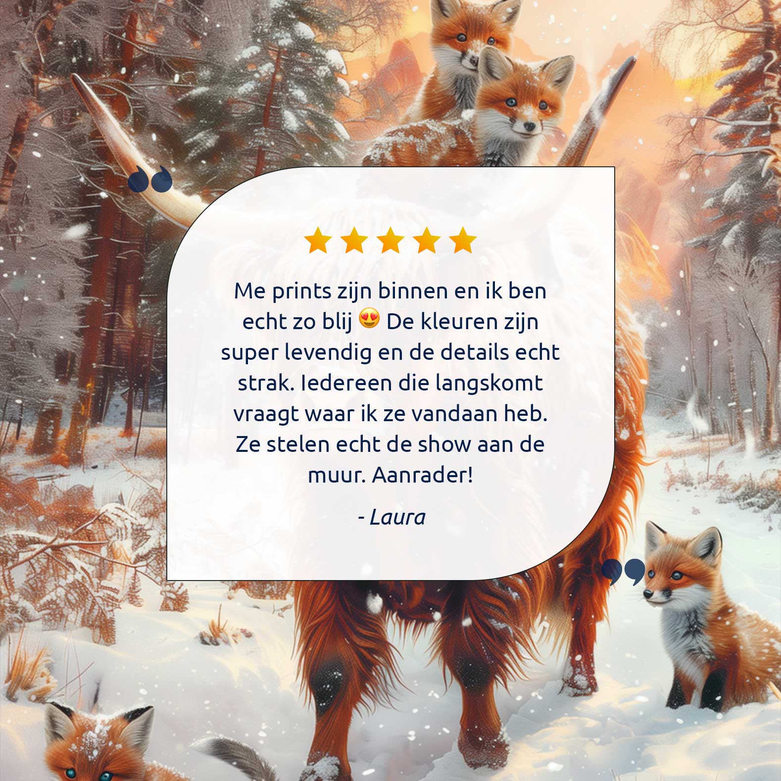 Rustige winterbos met koe en vossen