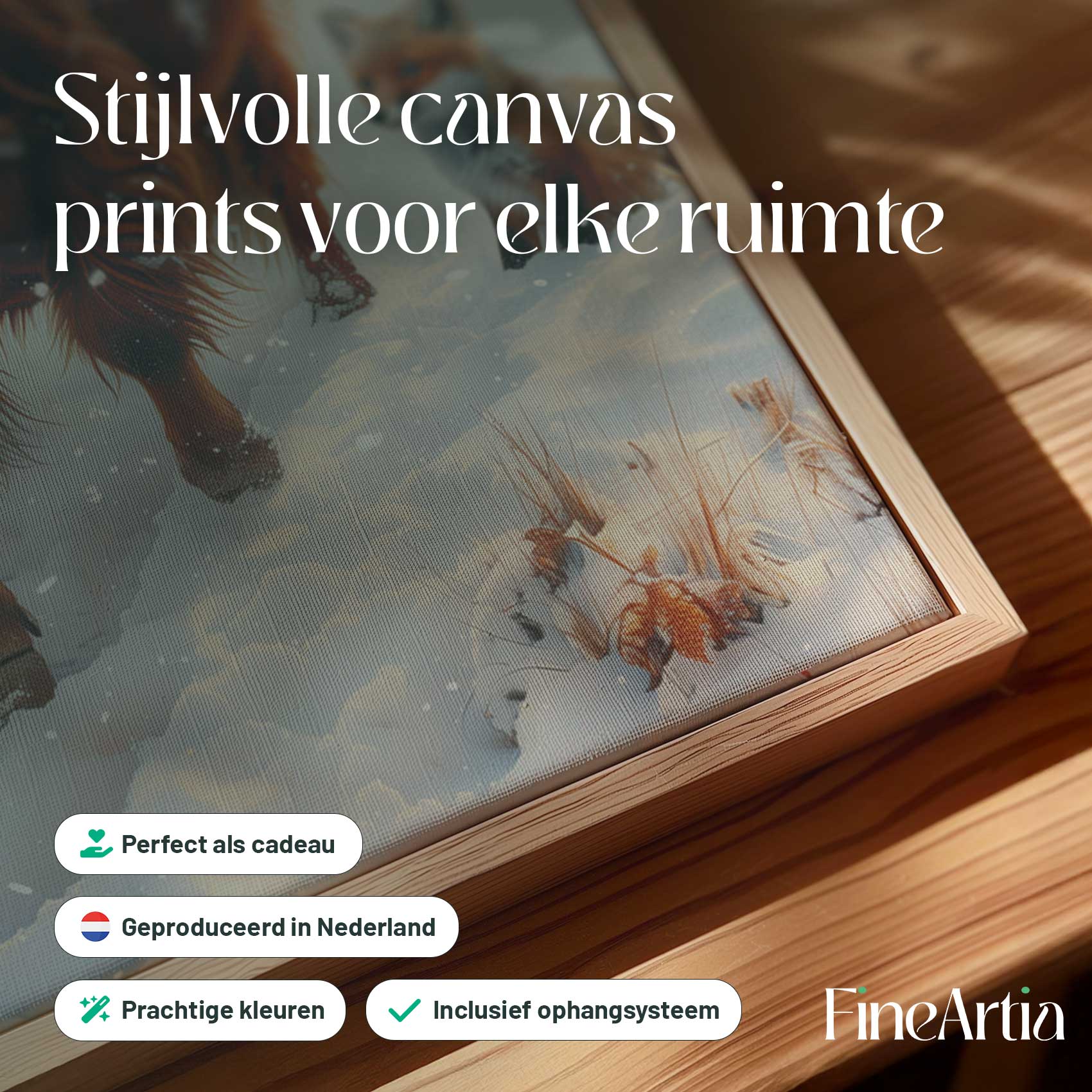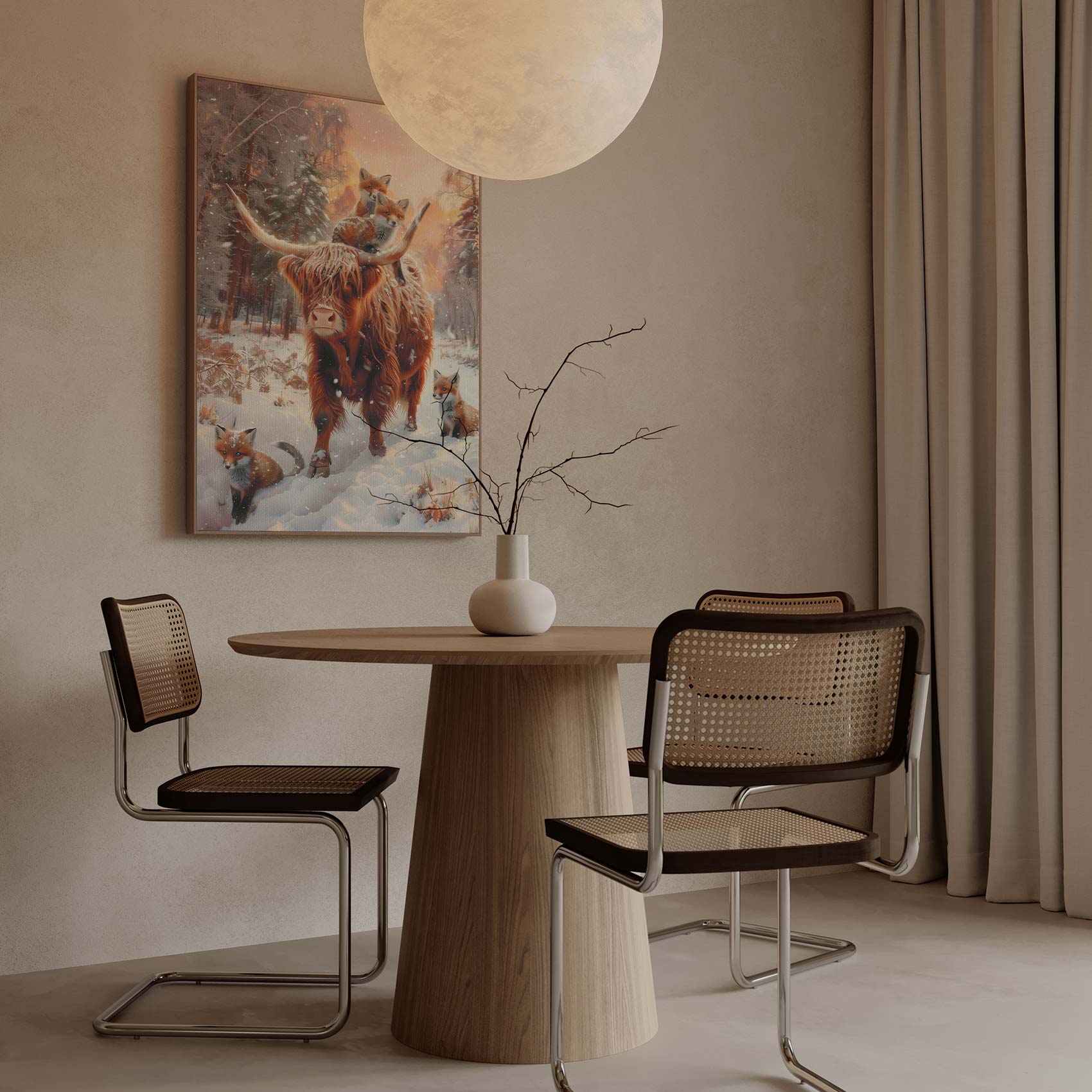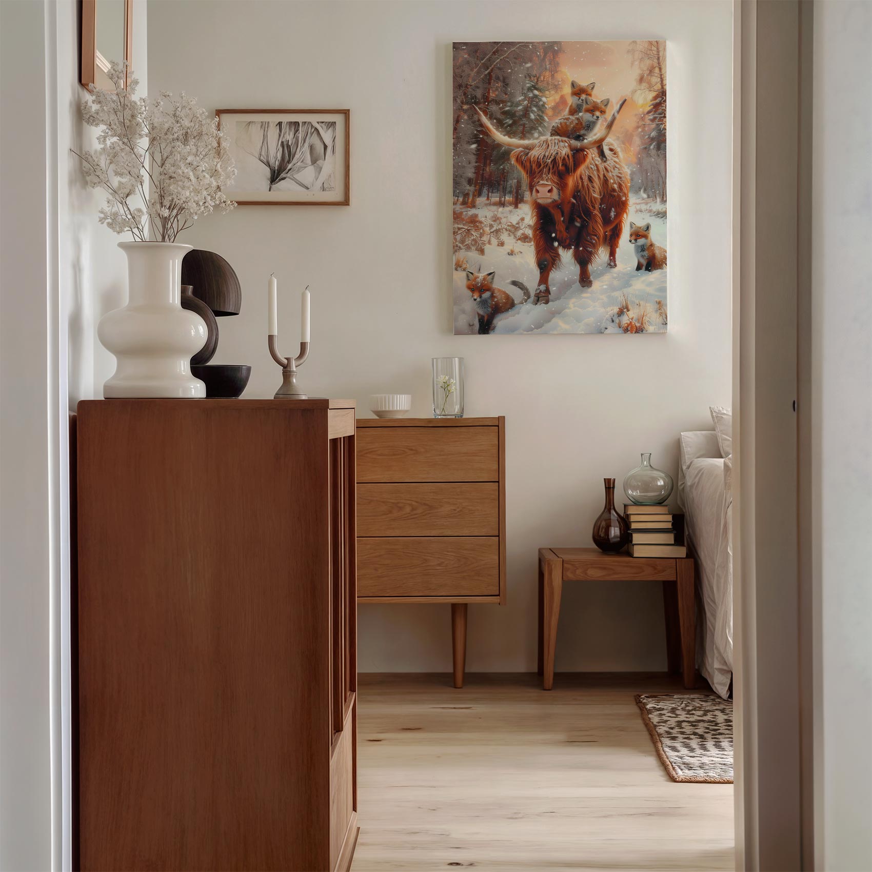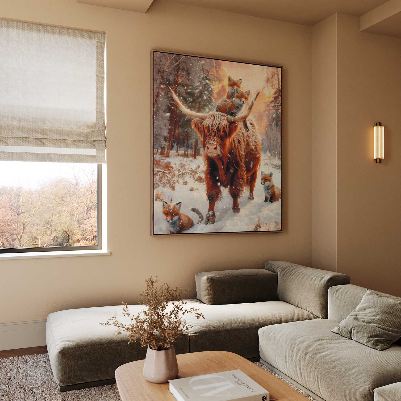 Rustige winterbos met koe en vossen