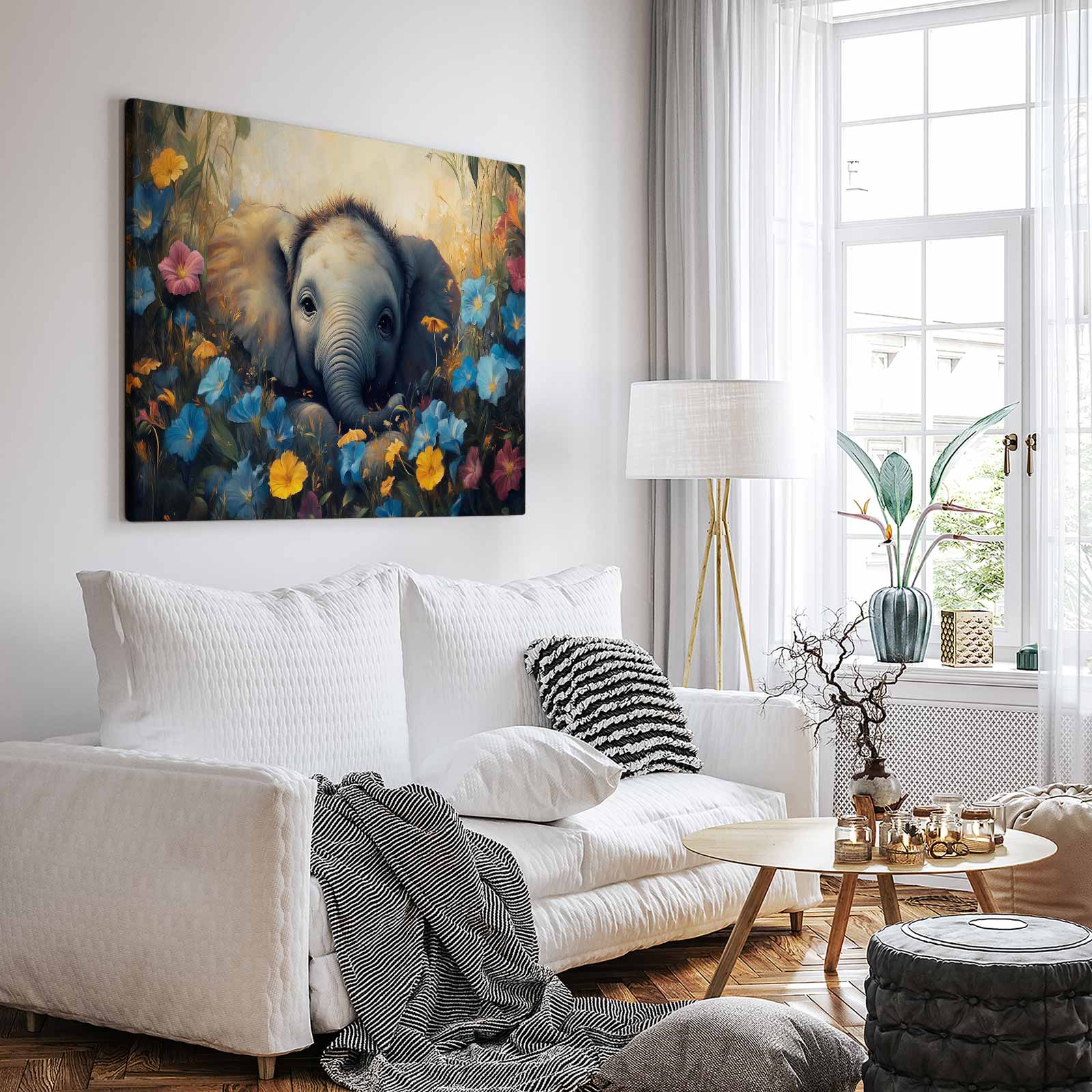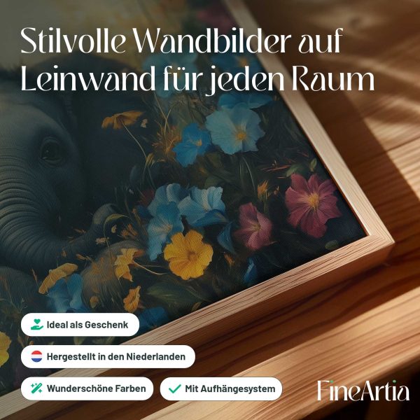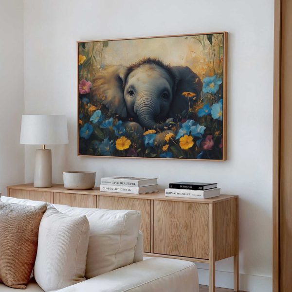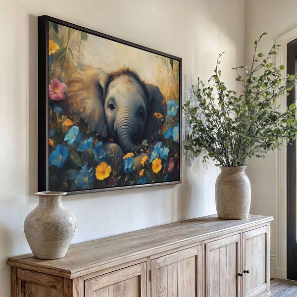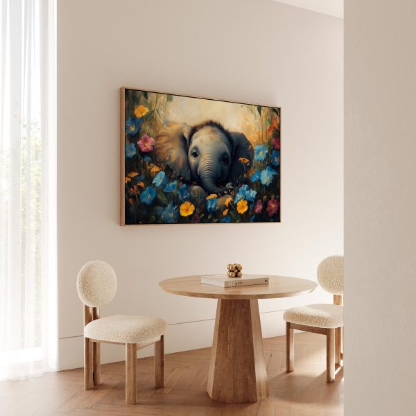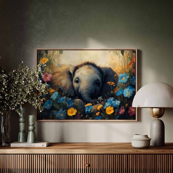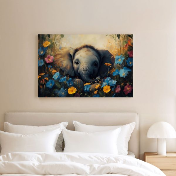 Schattige babyolifant in bloemenveld