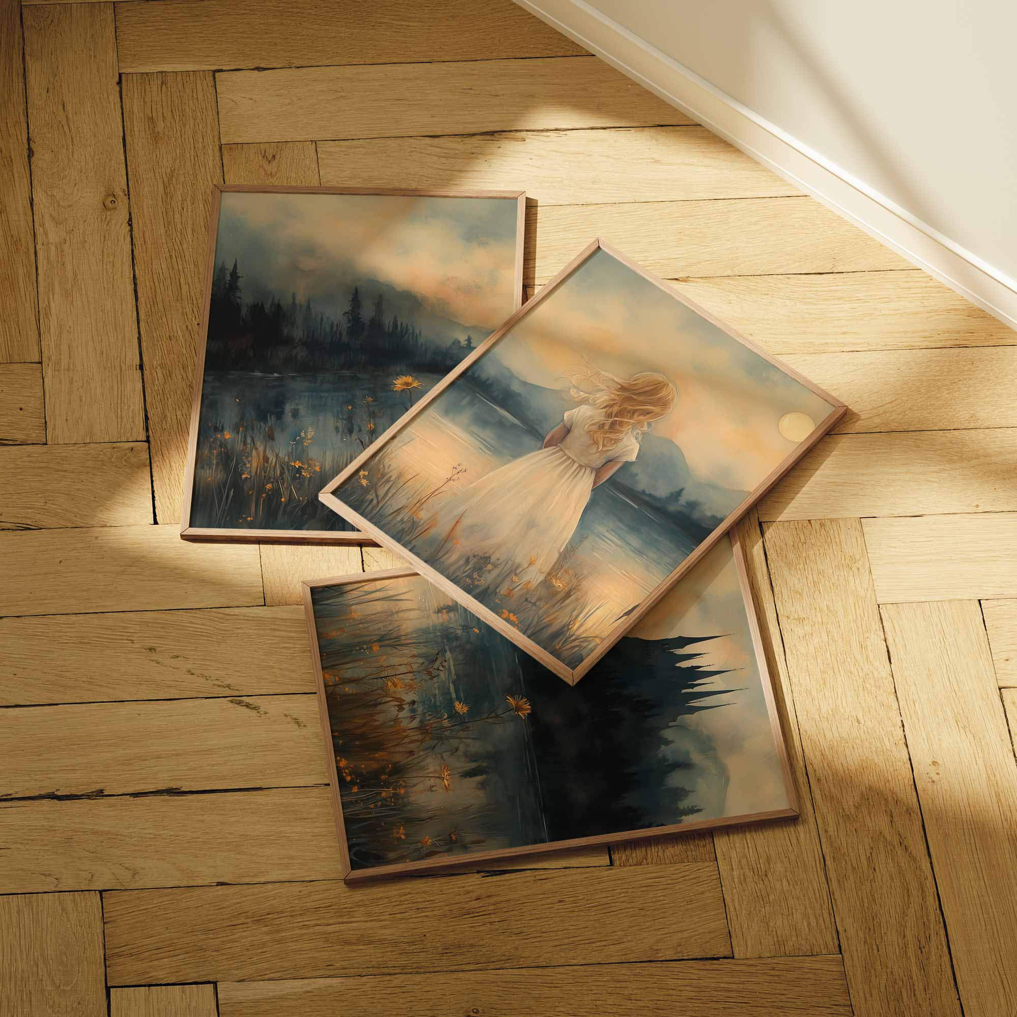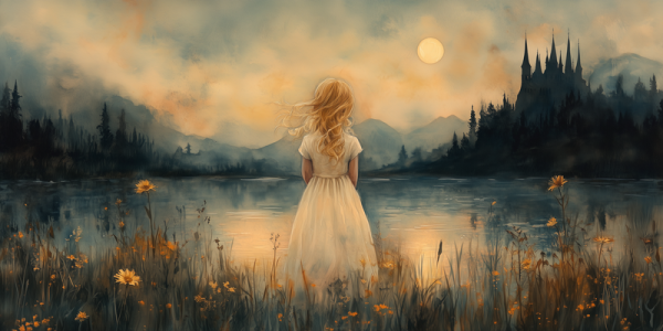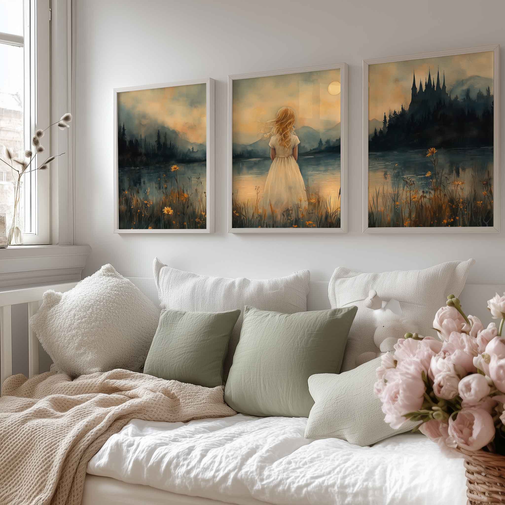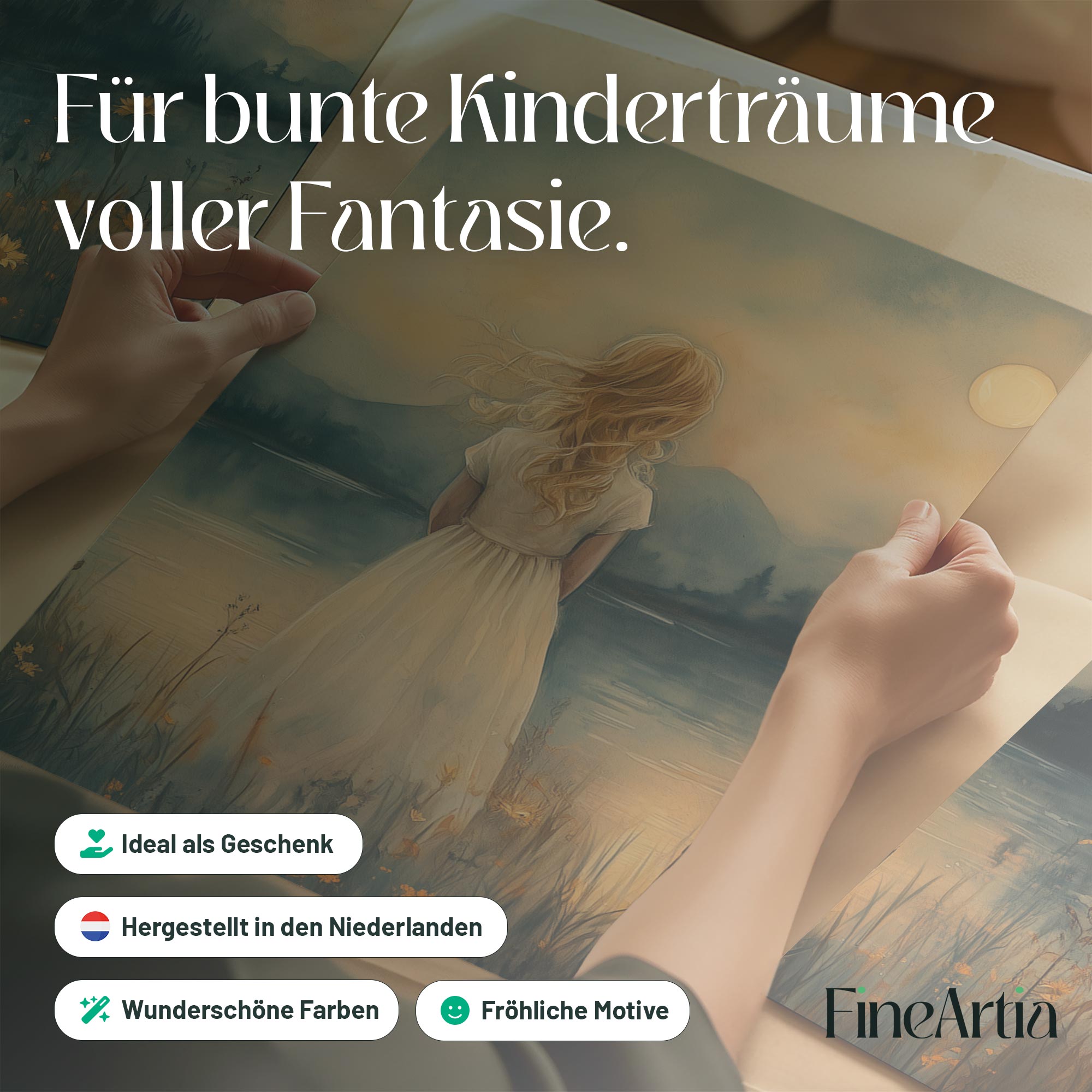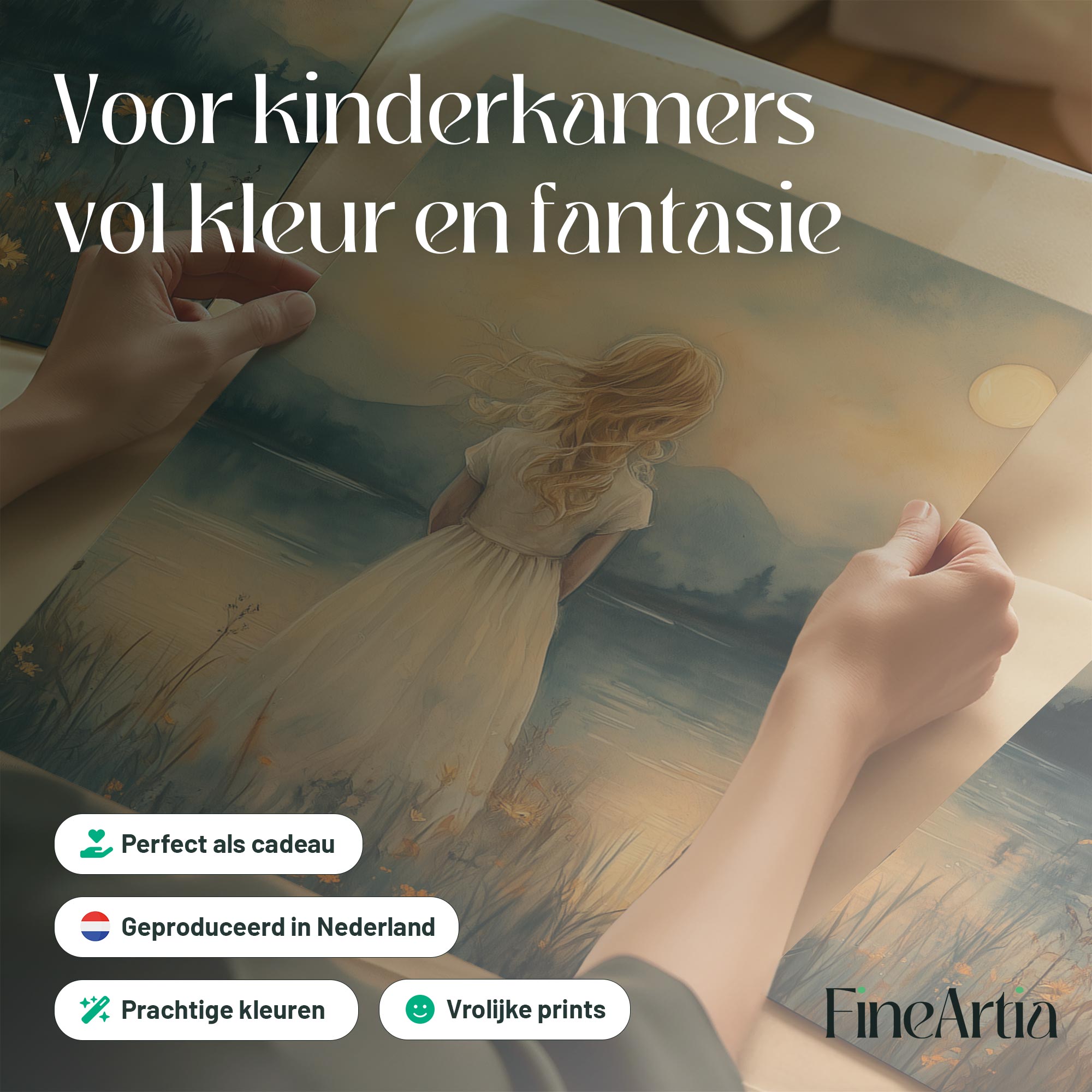 Terug naar collectie Posters Speels Meisje in Bloemenveld bij Kasteelmeer