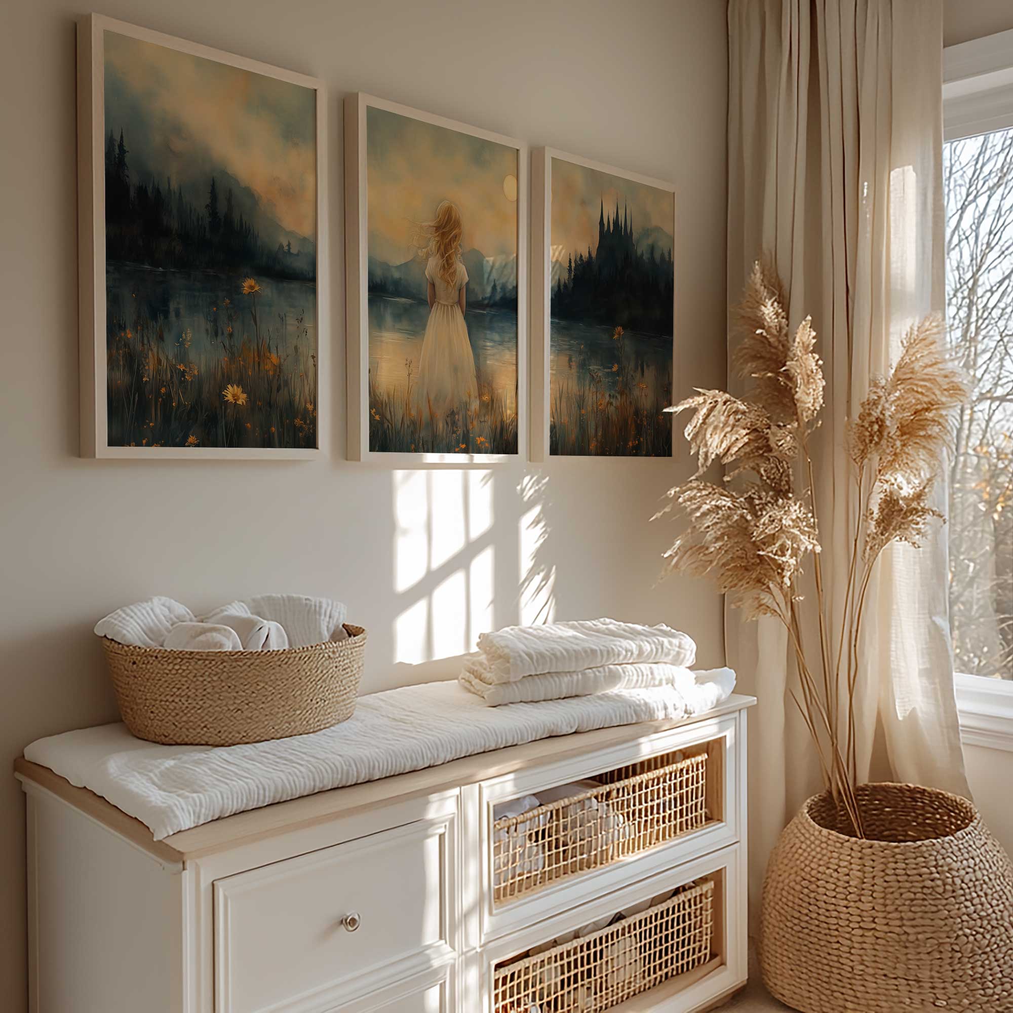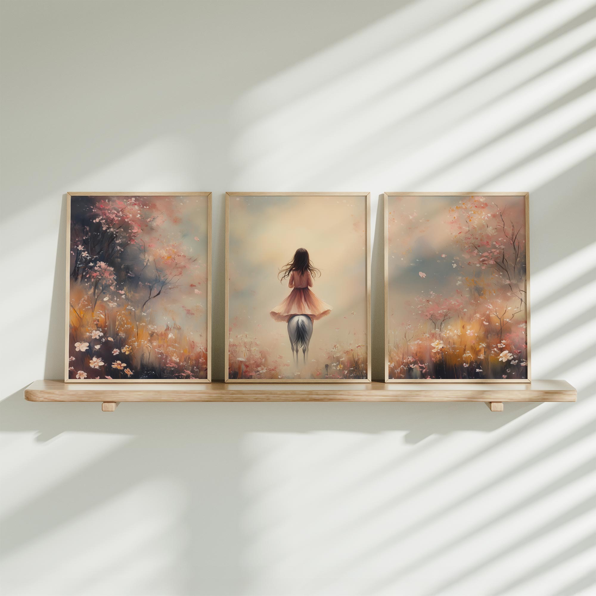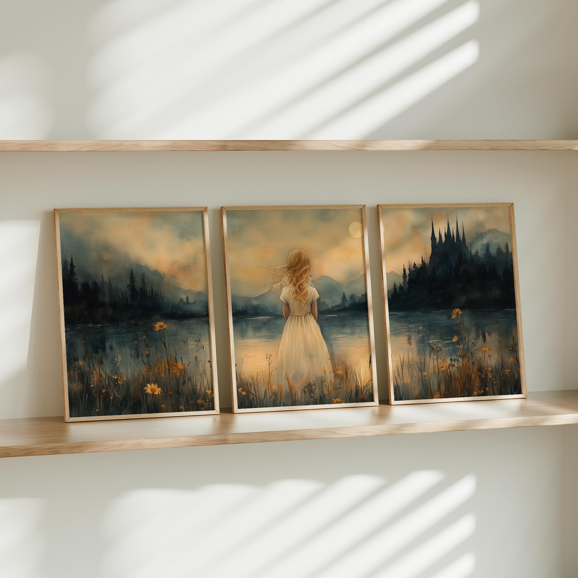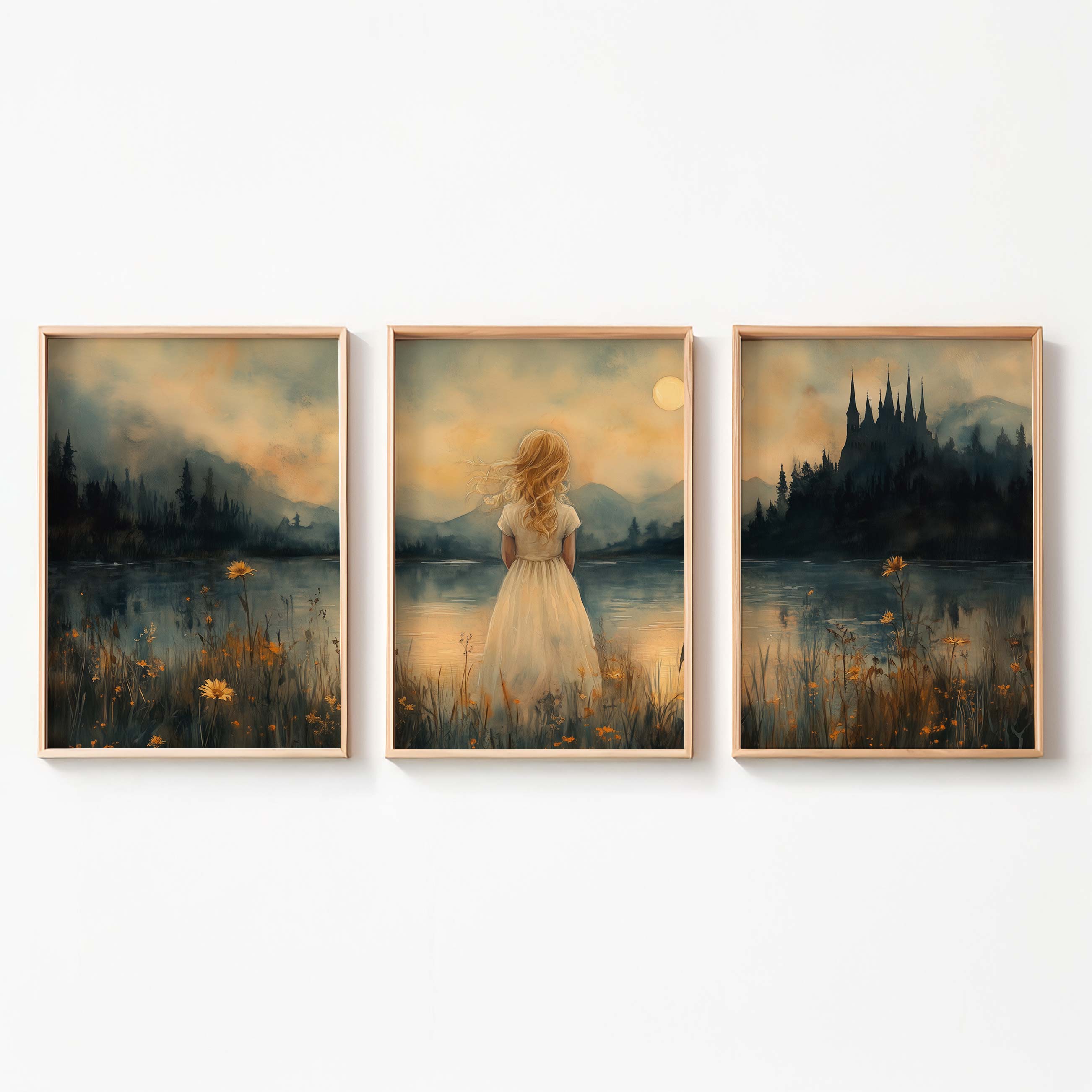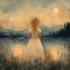 Terug naar collectie Posters Speels Meisje in Bloemenveld bij Kasteelmeer