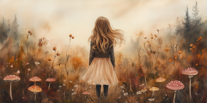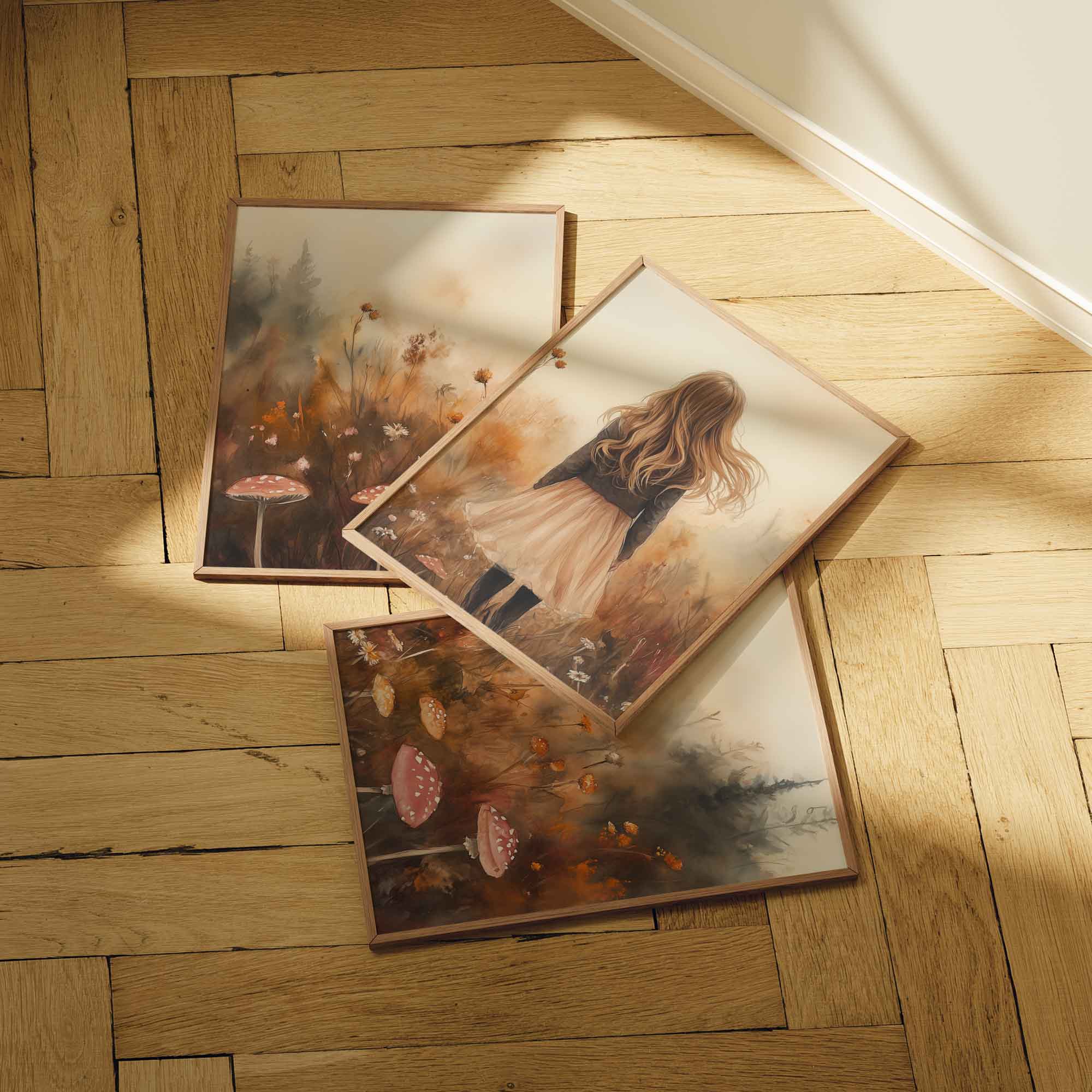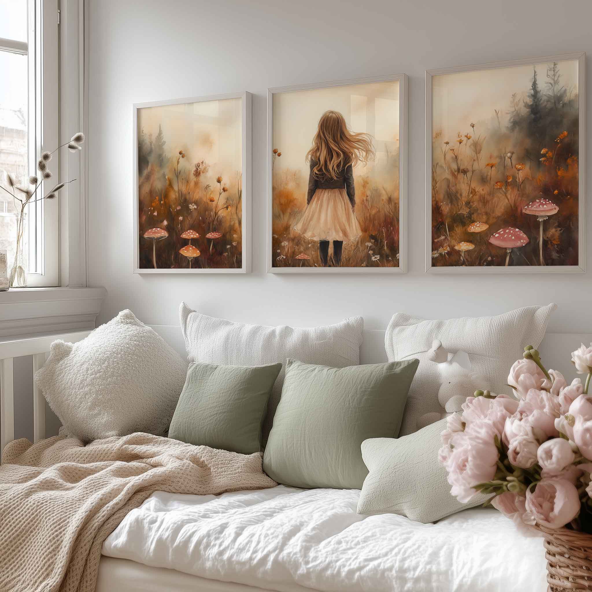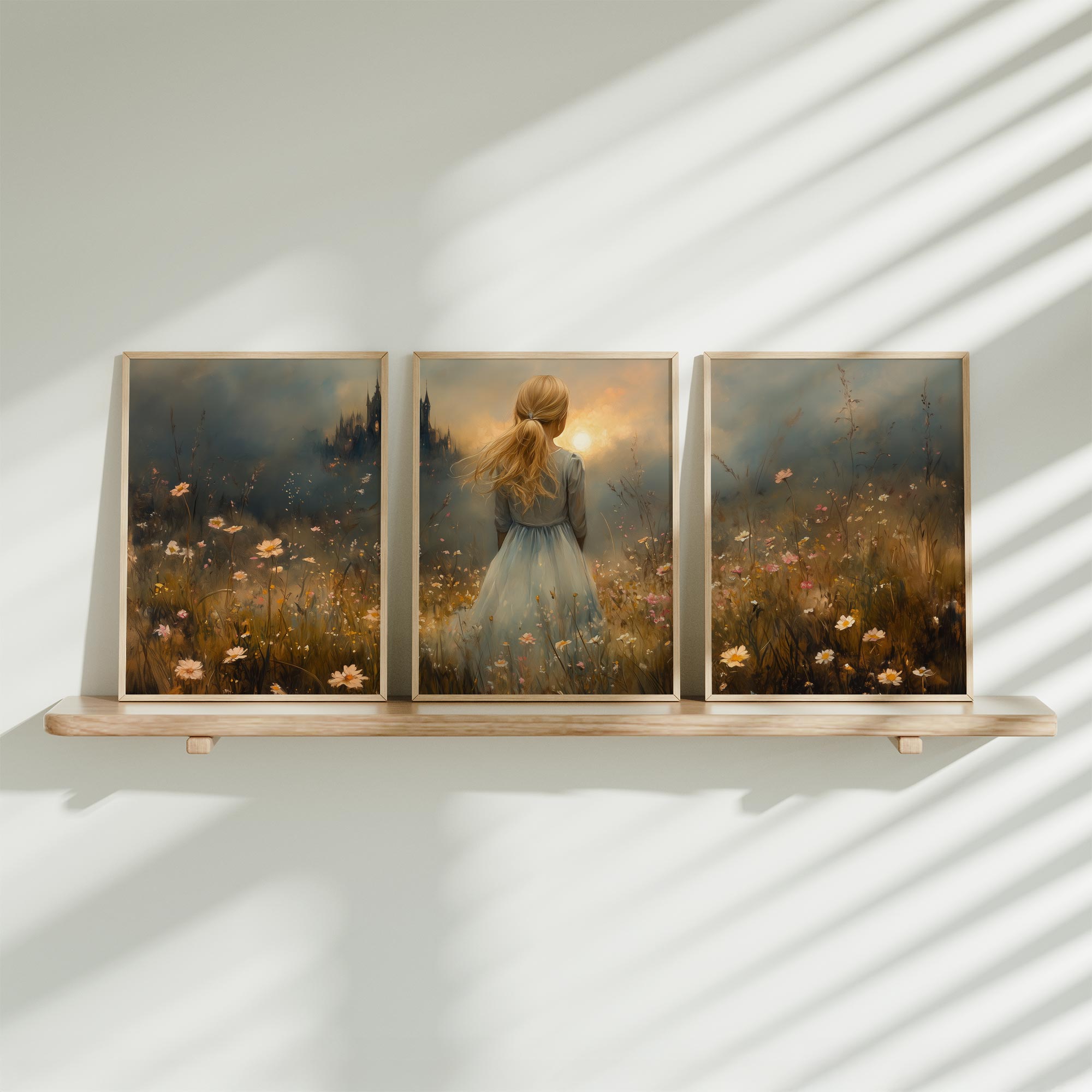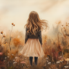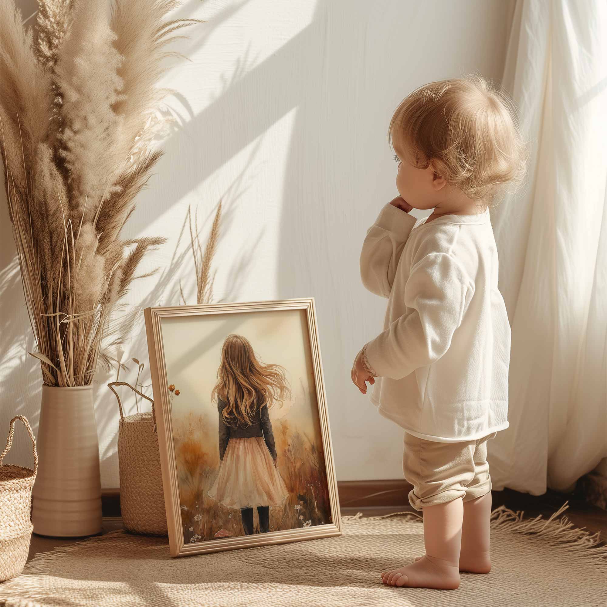 Speels Meisje in Bloemenveld – Dromerige Muurdecoratie