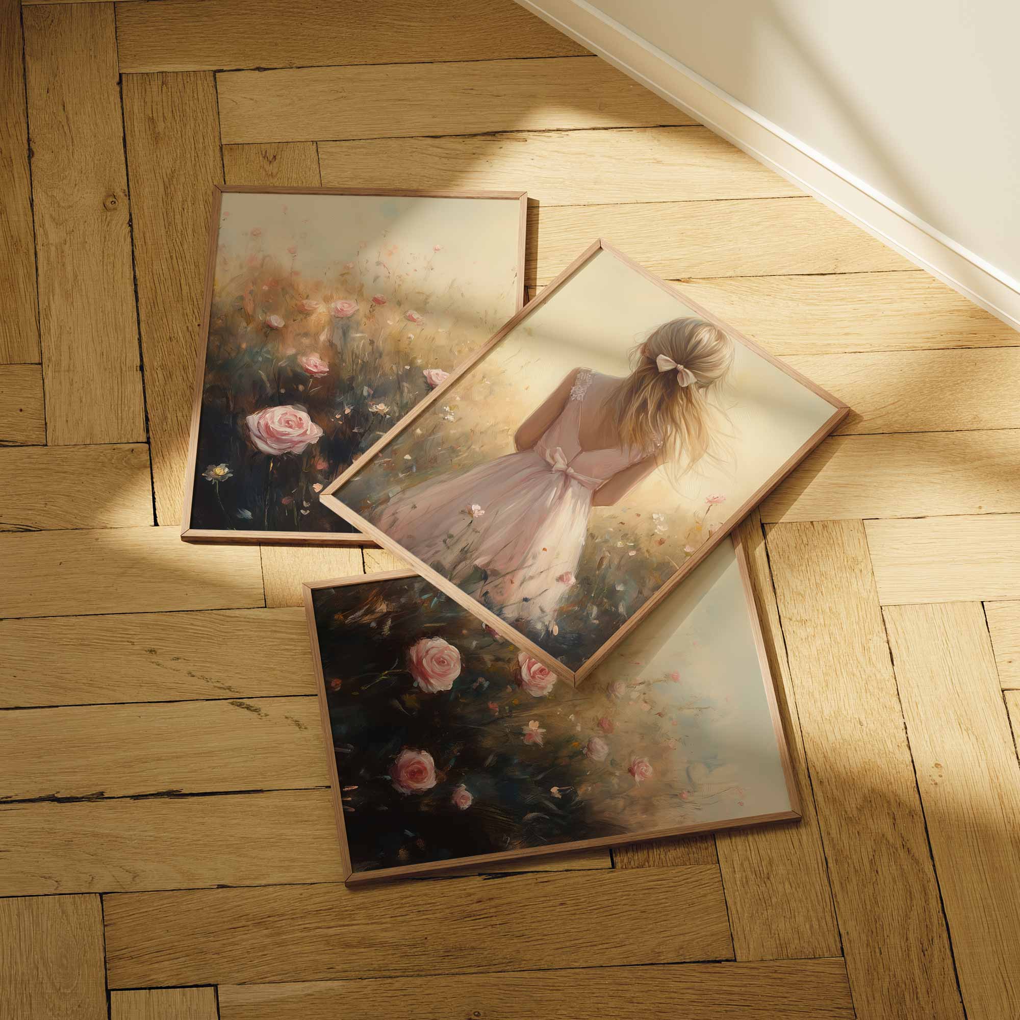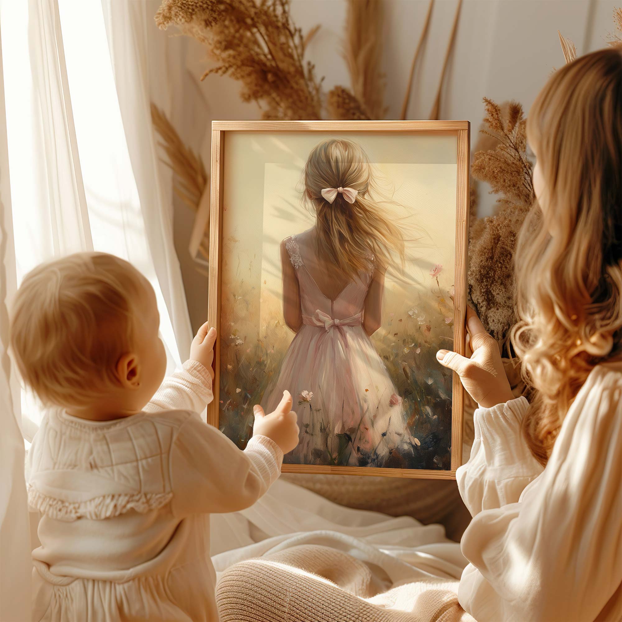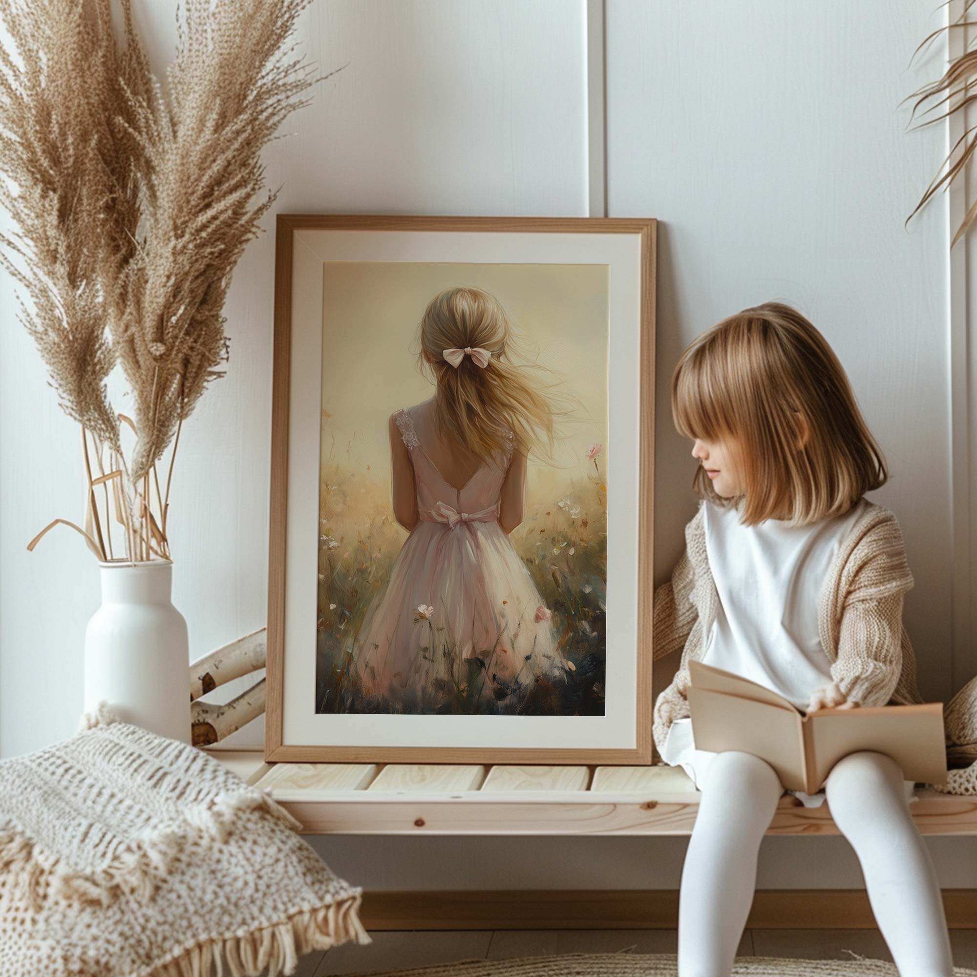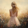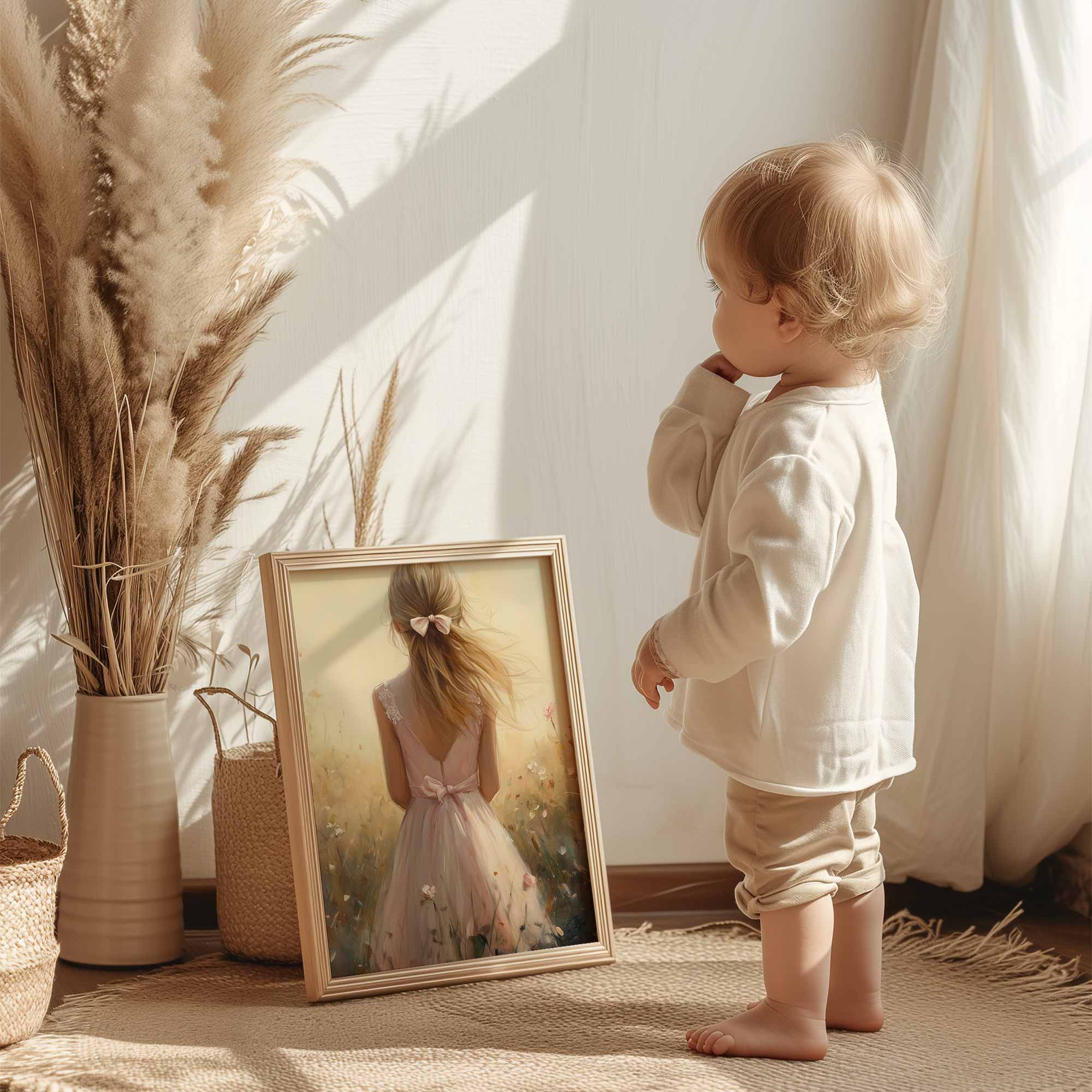 Speels Meisje in Bloemenveld – Dromerige Pastelkleuren