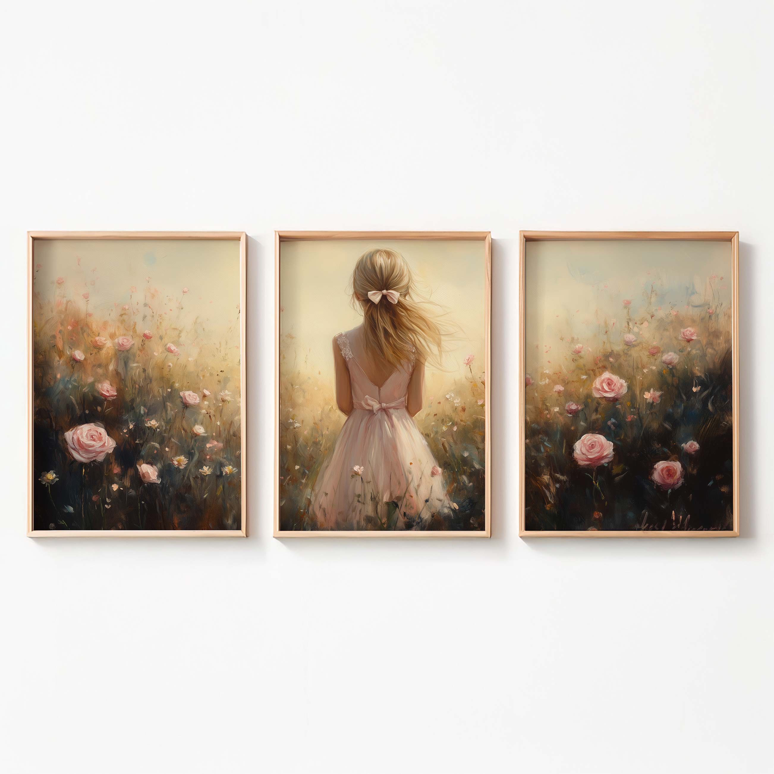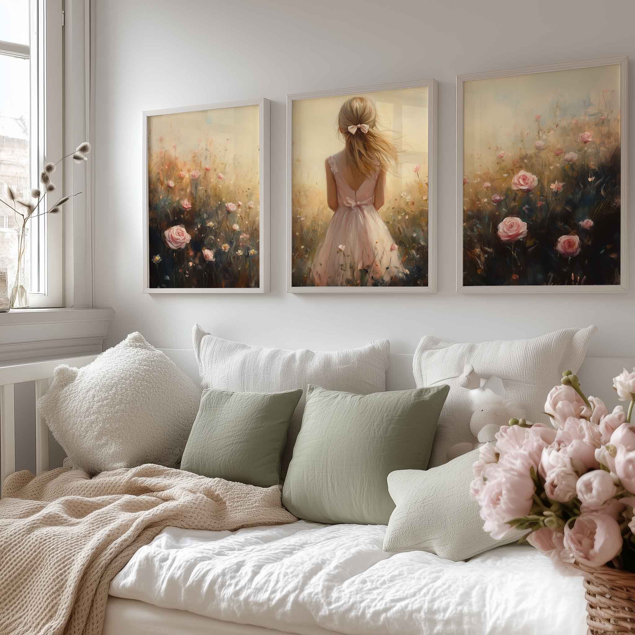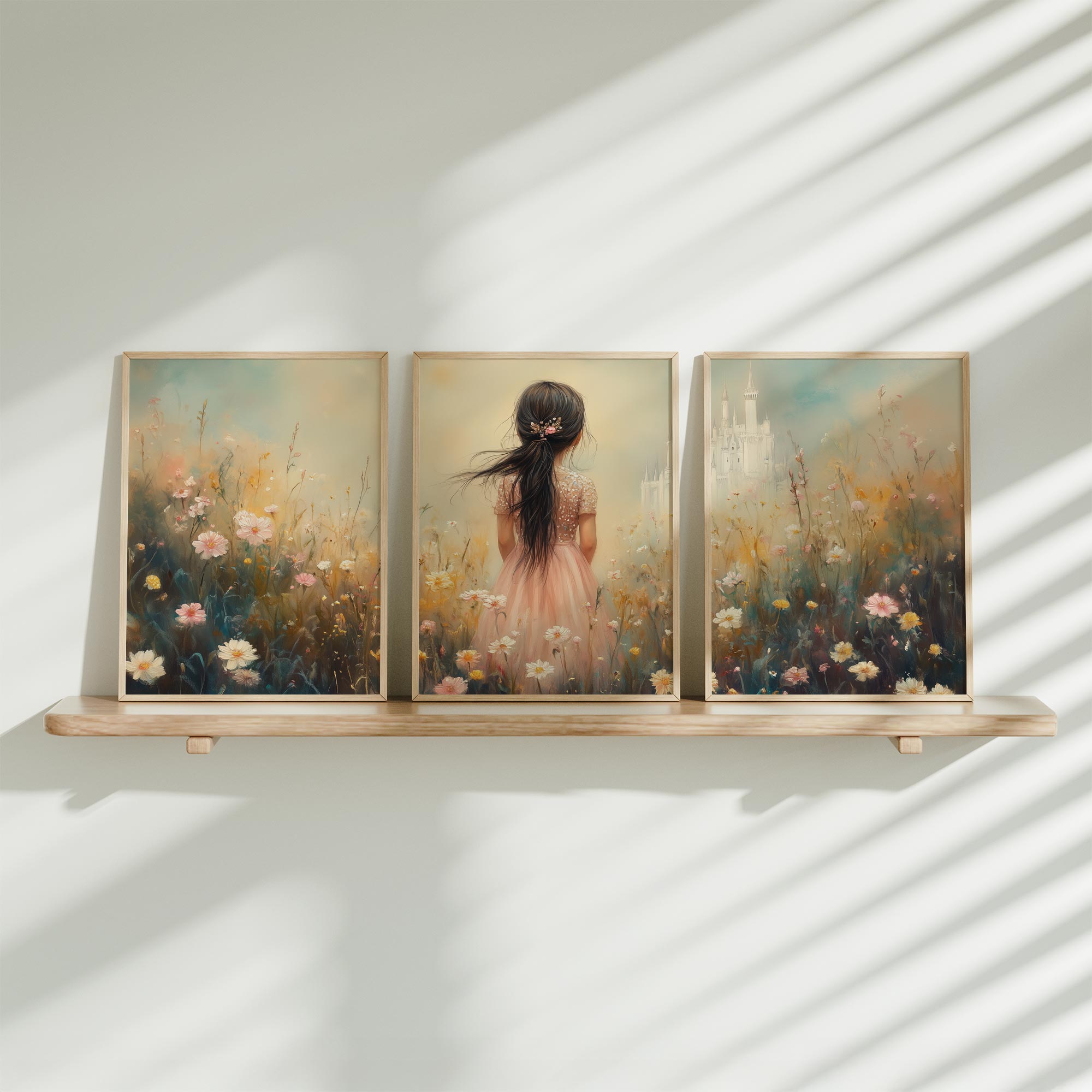 Speels Meisje in Bloemenveld – Dromerige Pastelkleuren