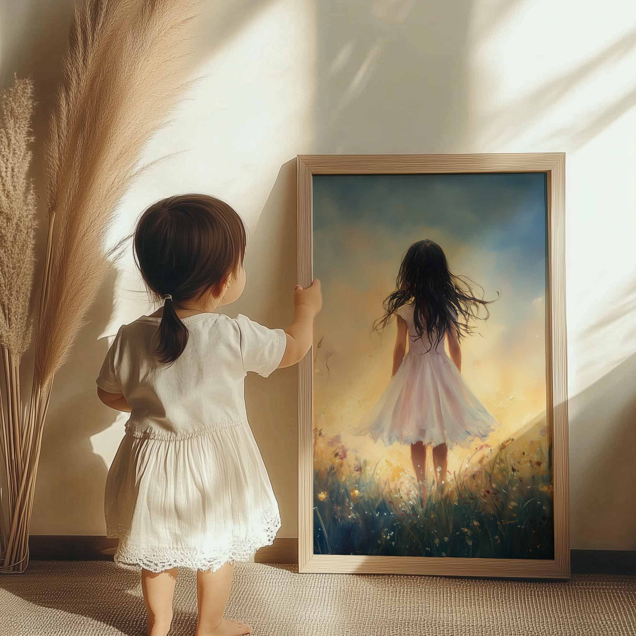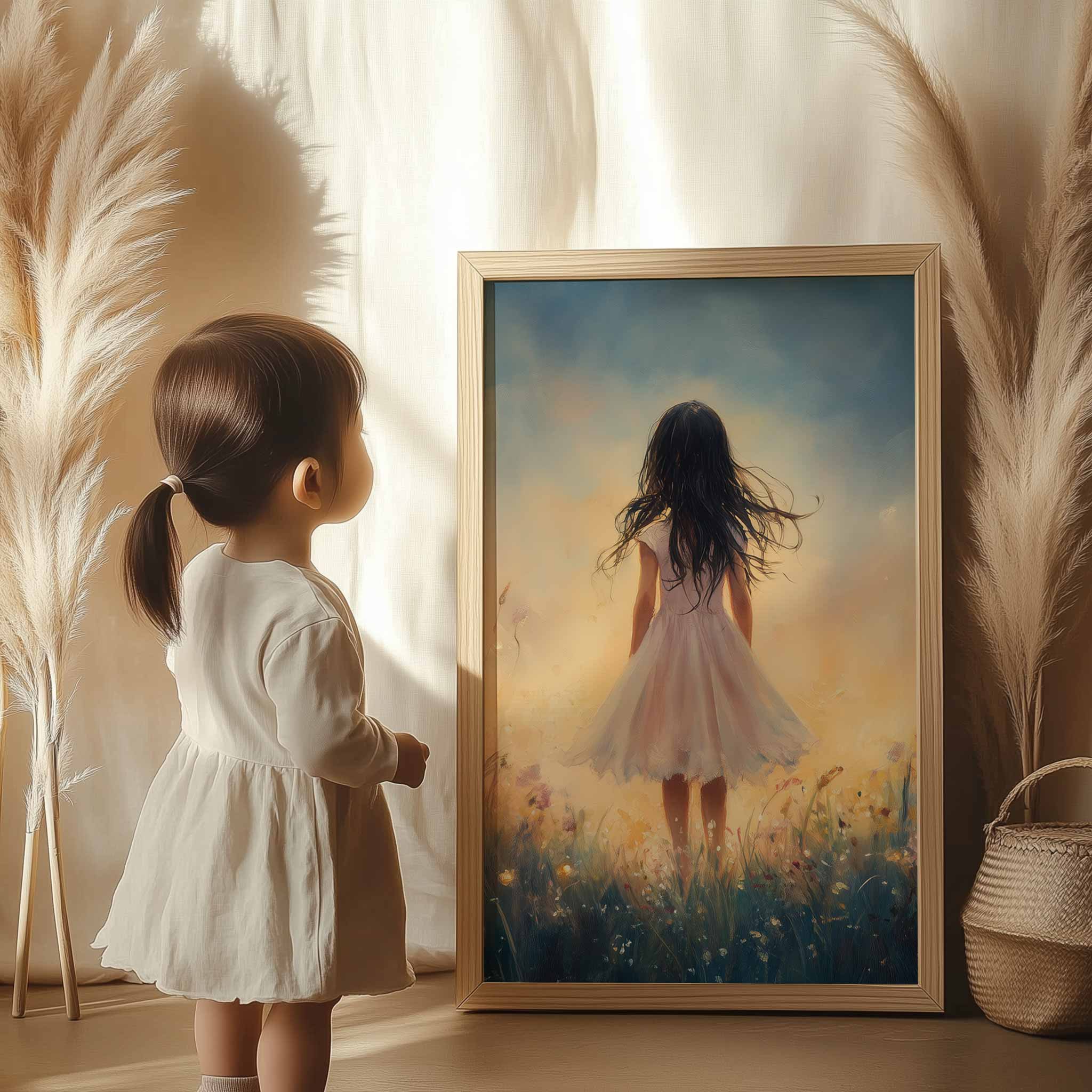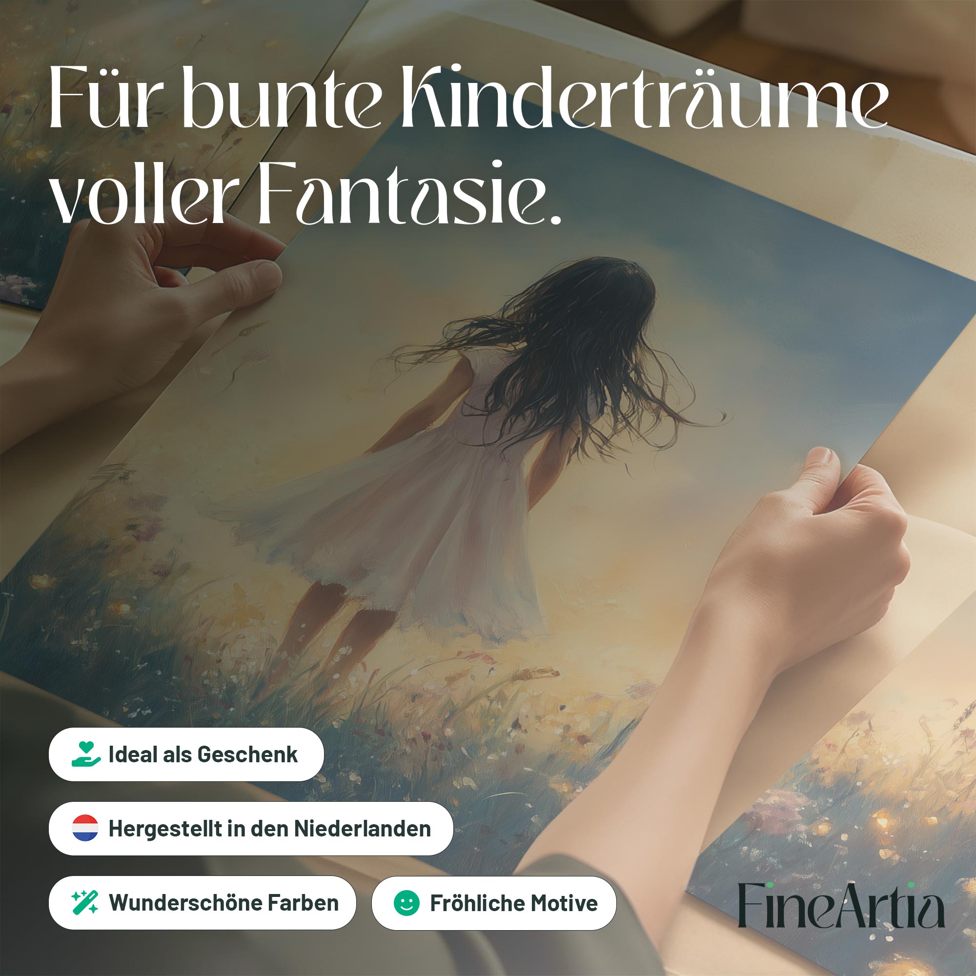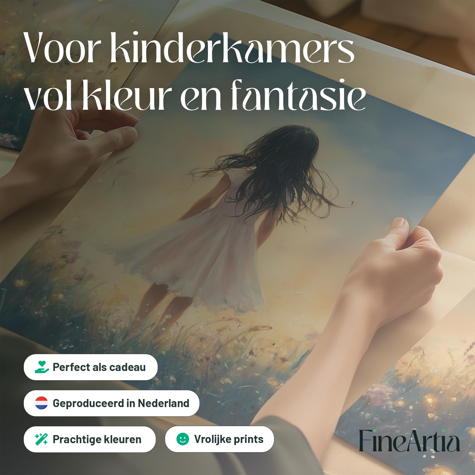 Terug naar collectie Posters Speels Meisje in Bloemenveld – Dromerige Sfeer