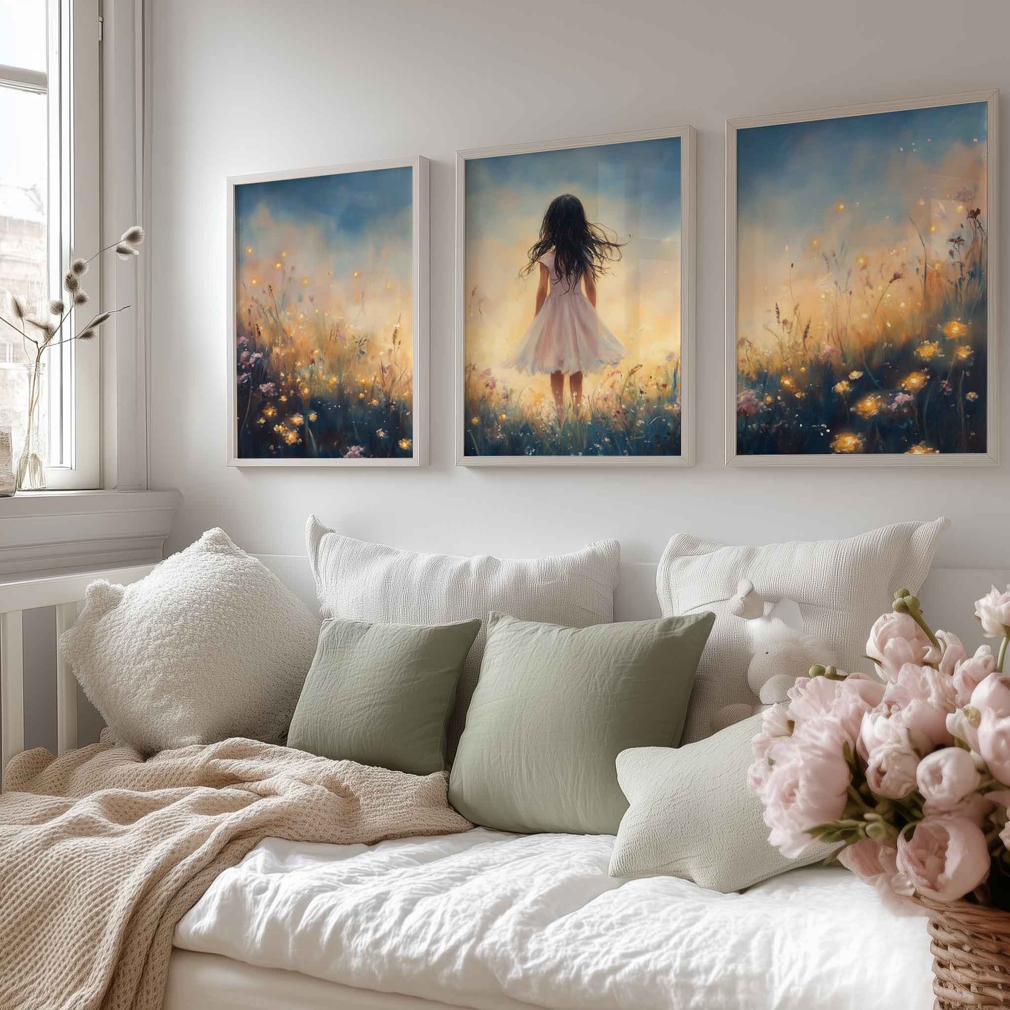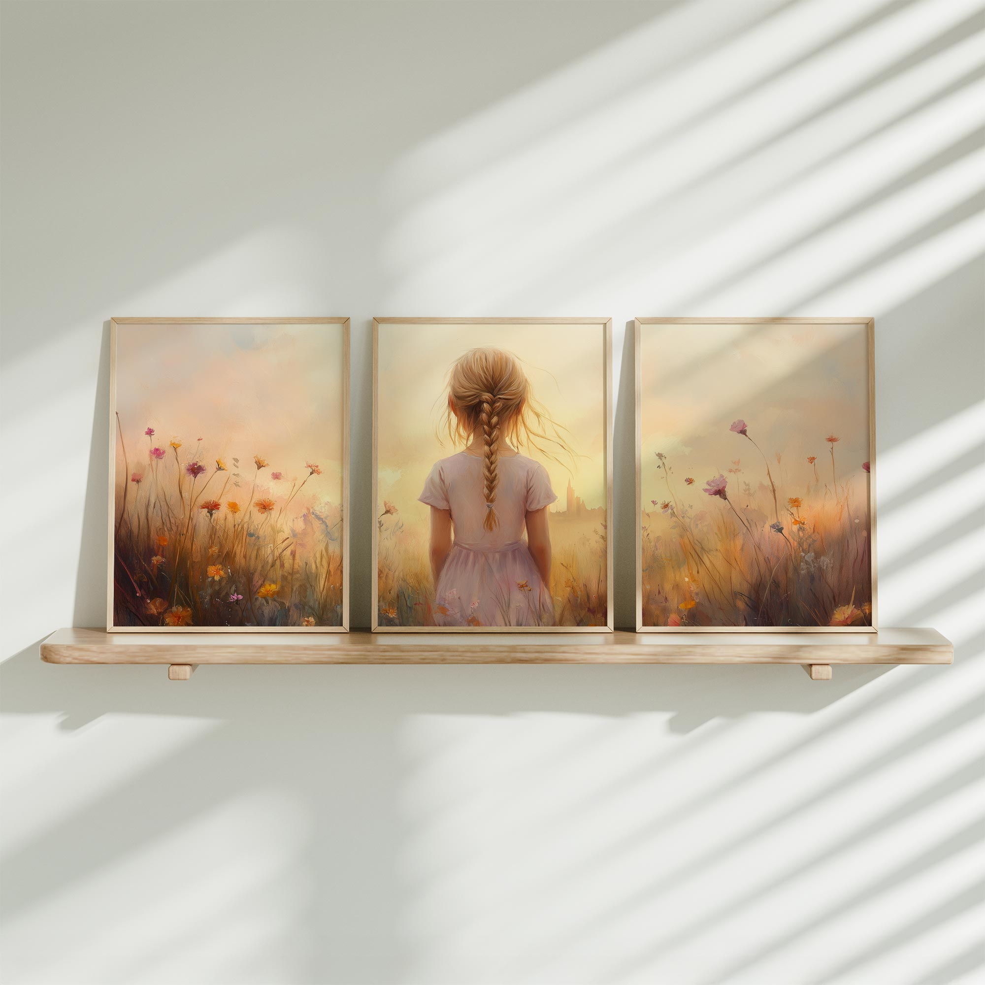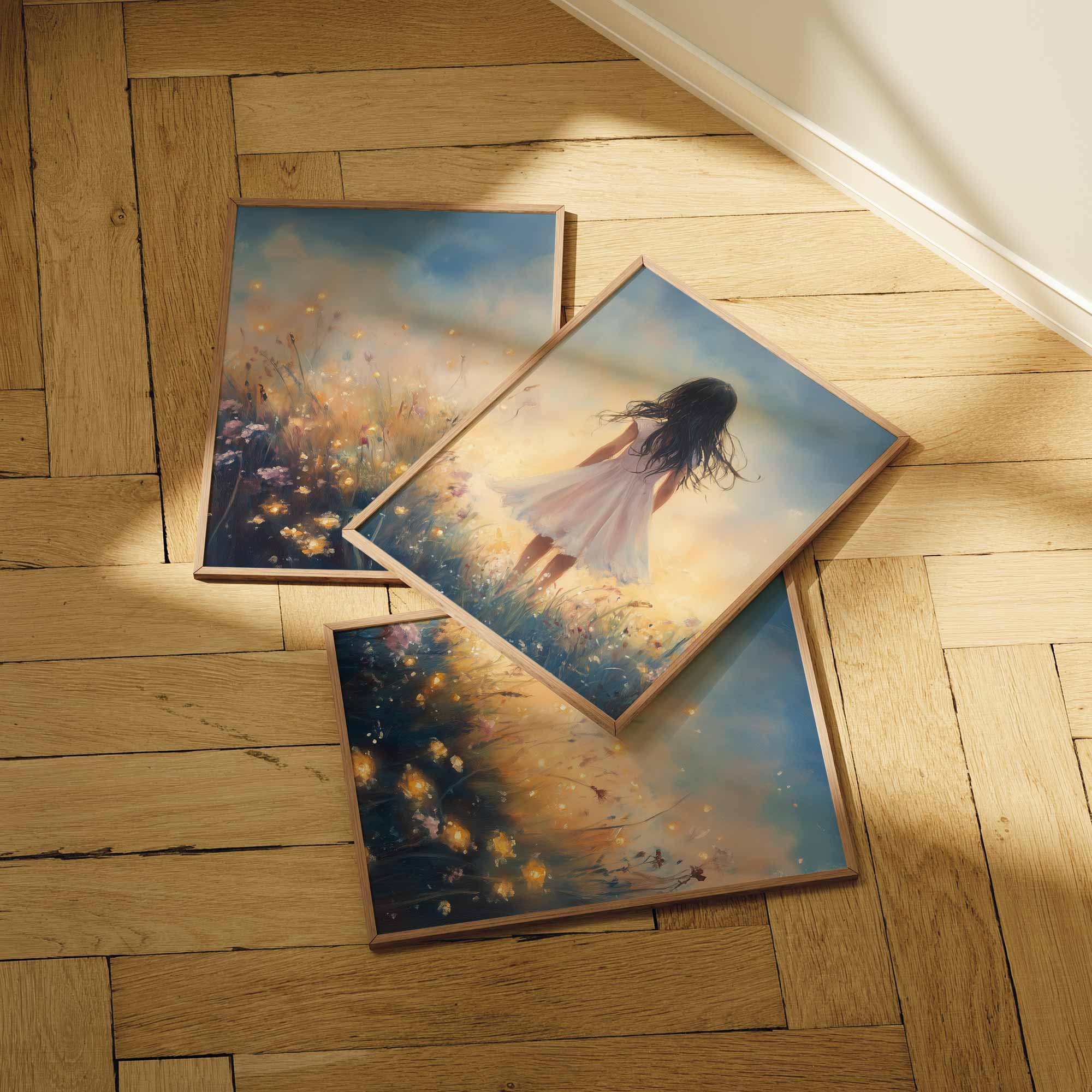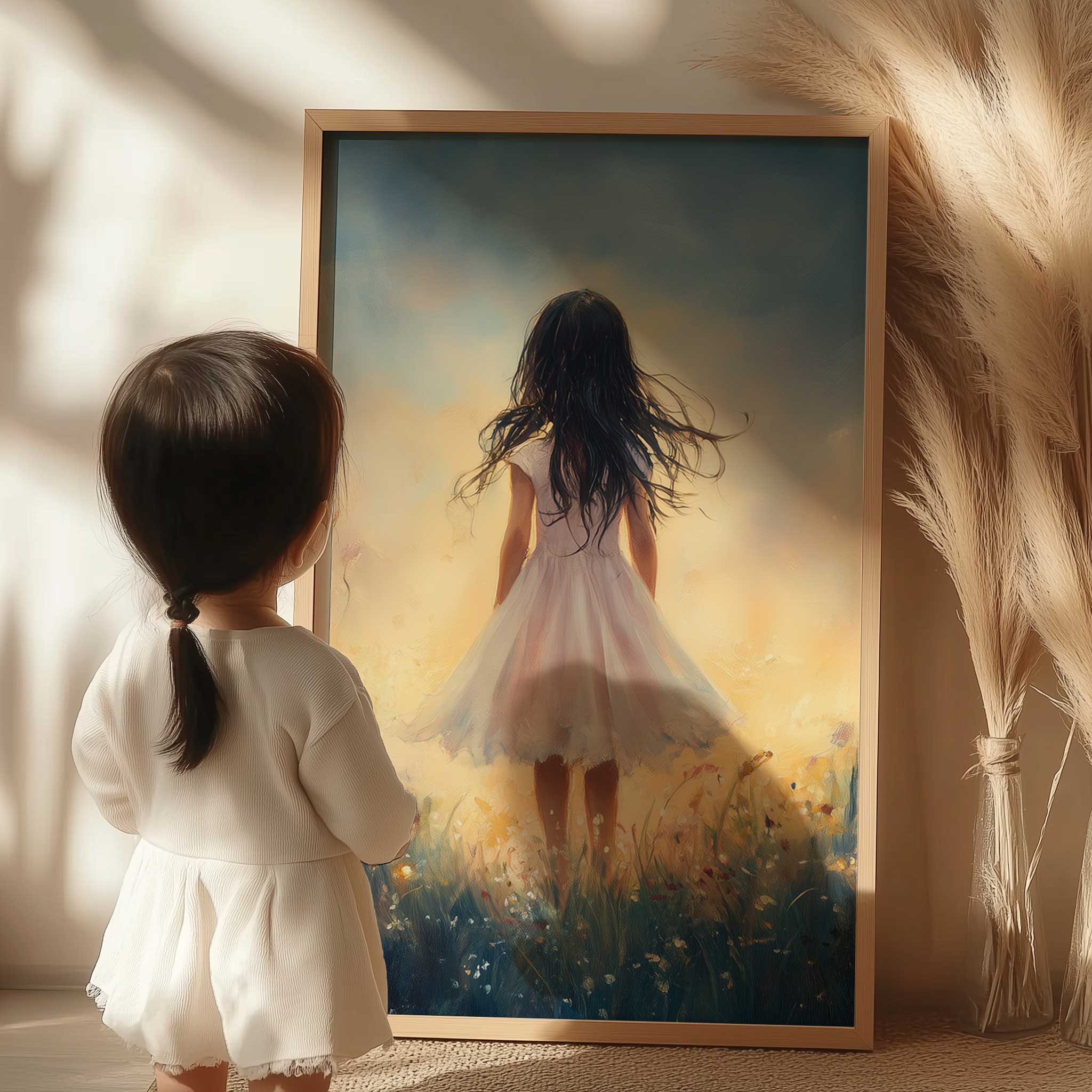 Terug naar collectie Posters Speels Meisje in Bloemenveld – Dromerige Sfeer