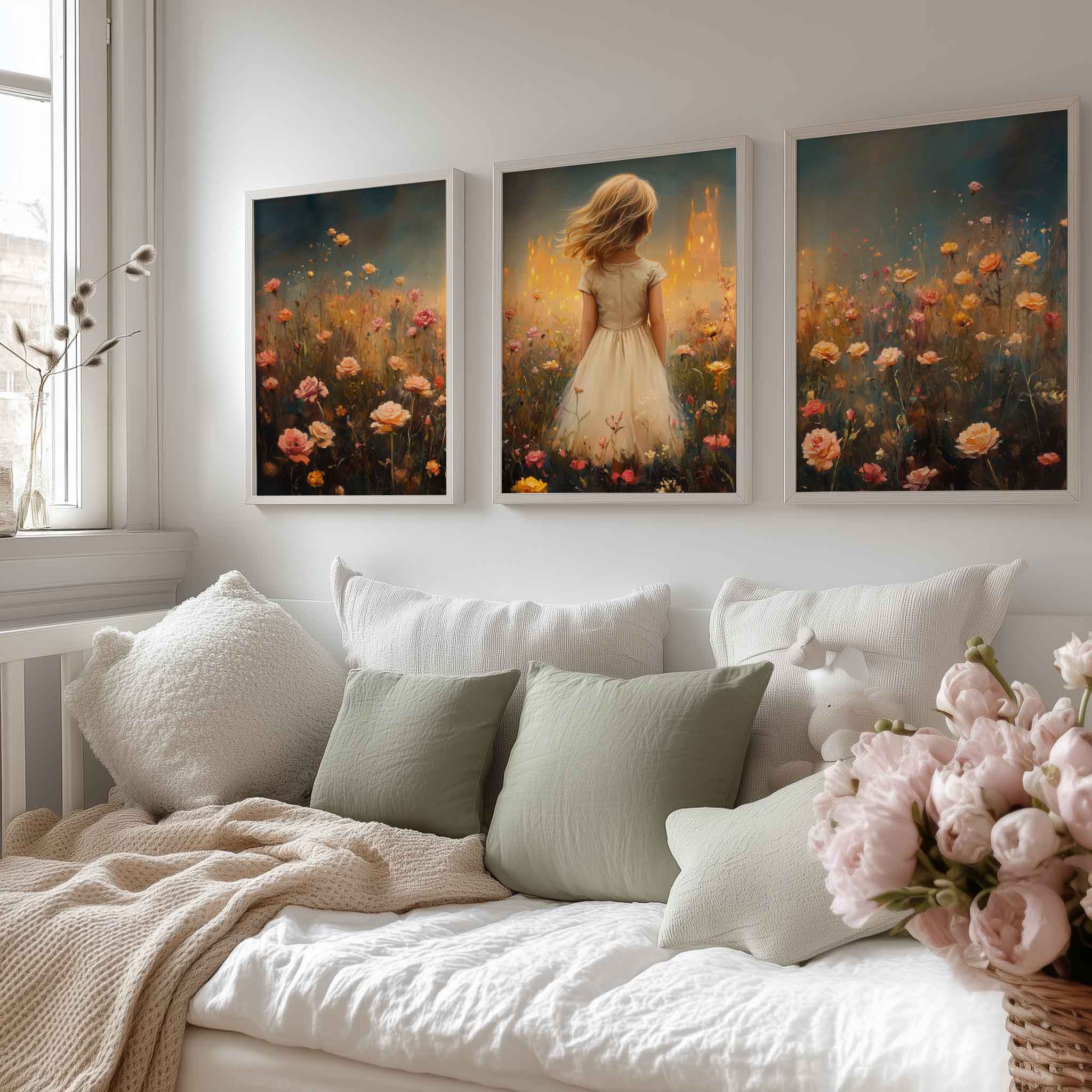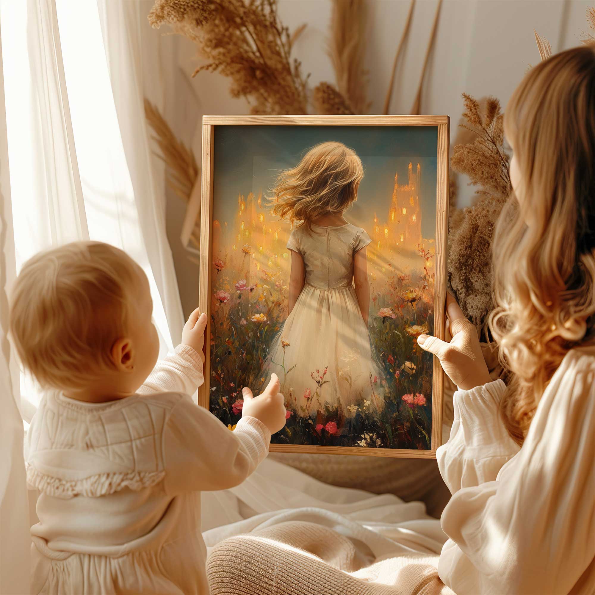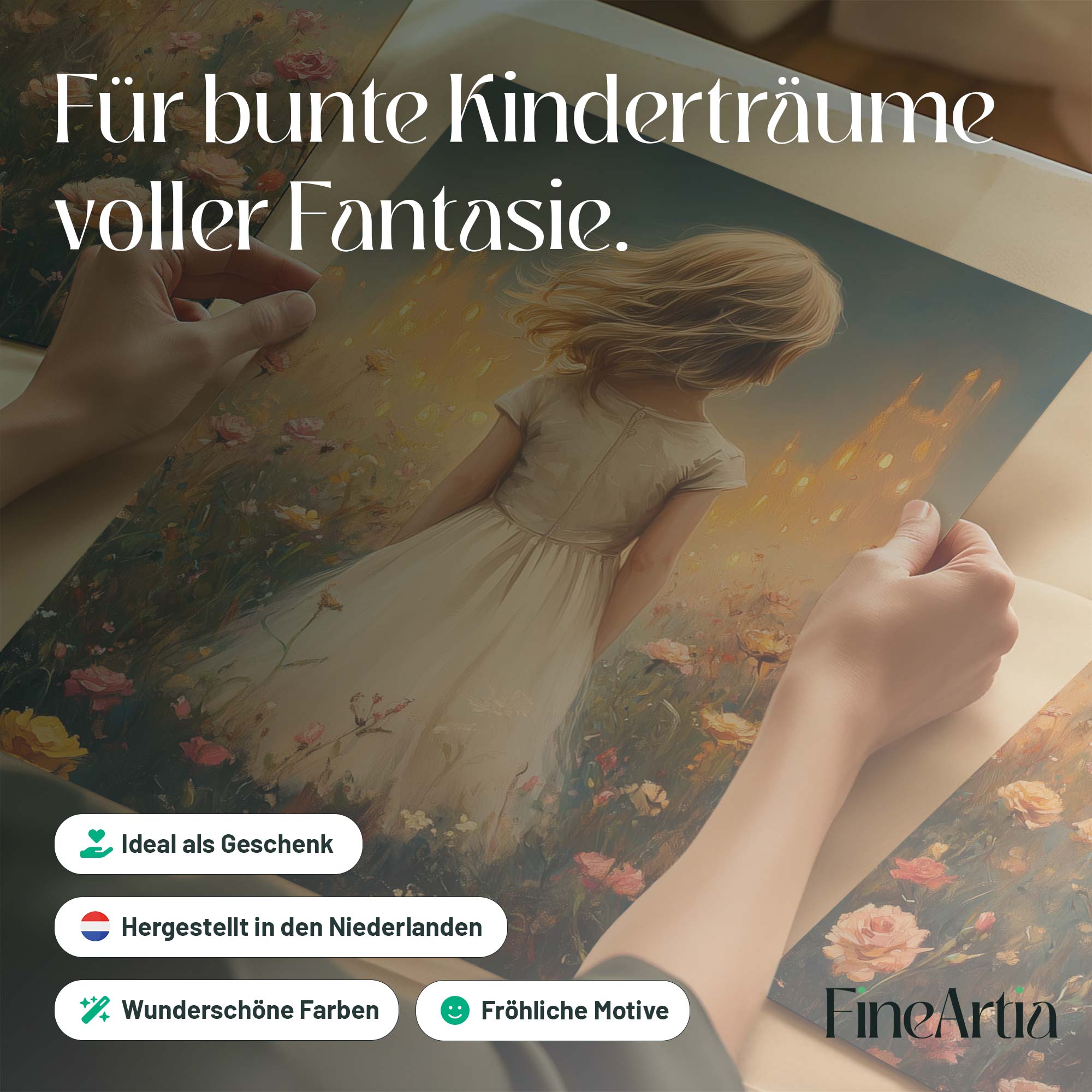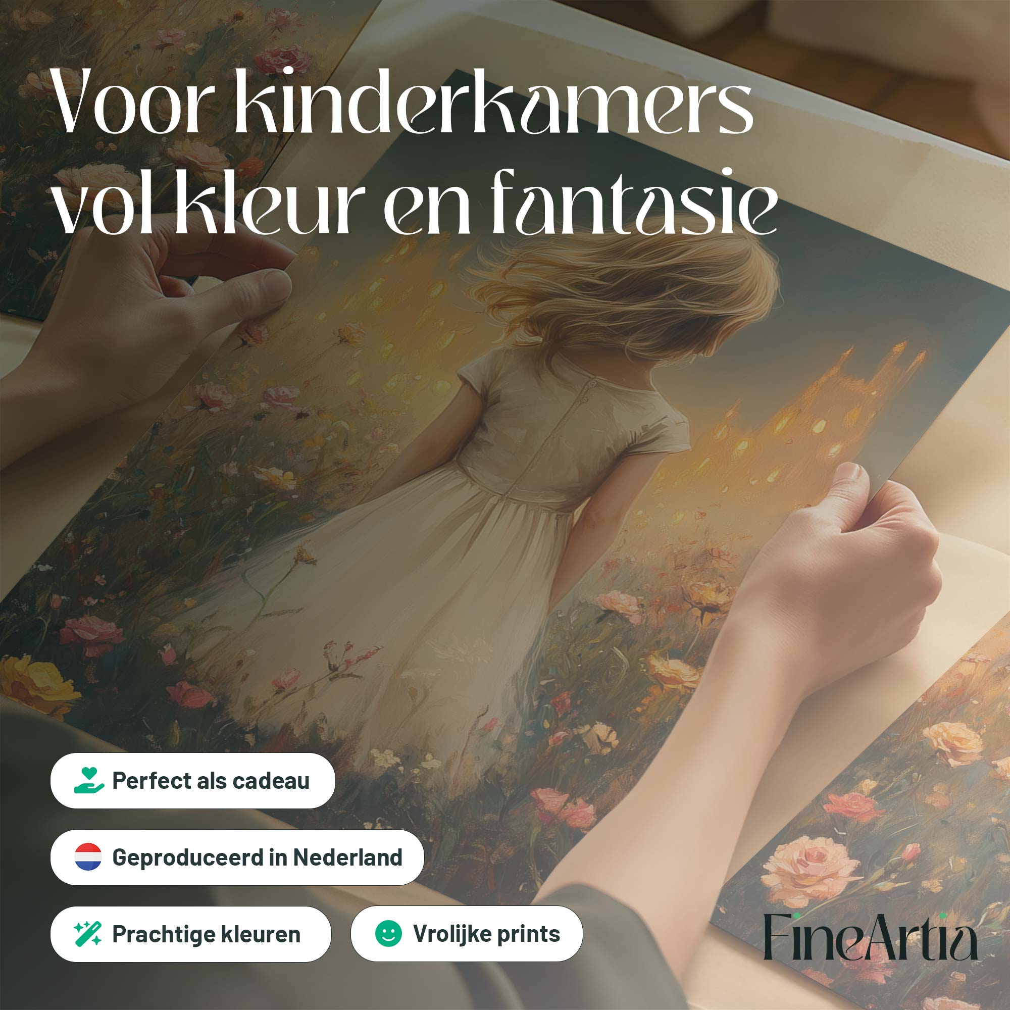 Terug naar collectie Posters Speels Meisje in Bloemenveld met Kasteel