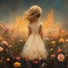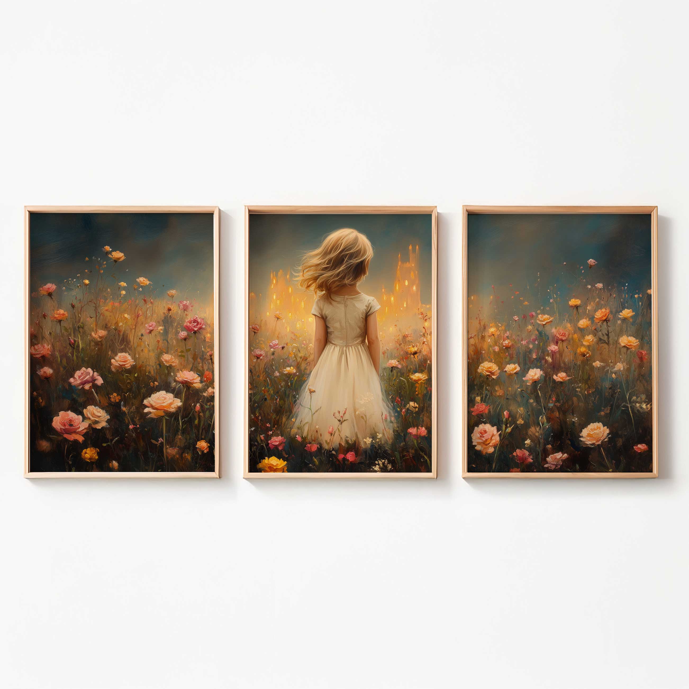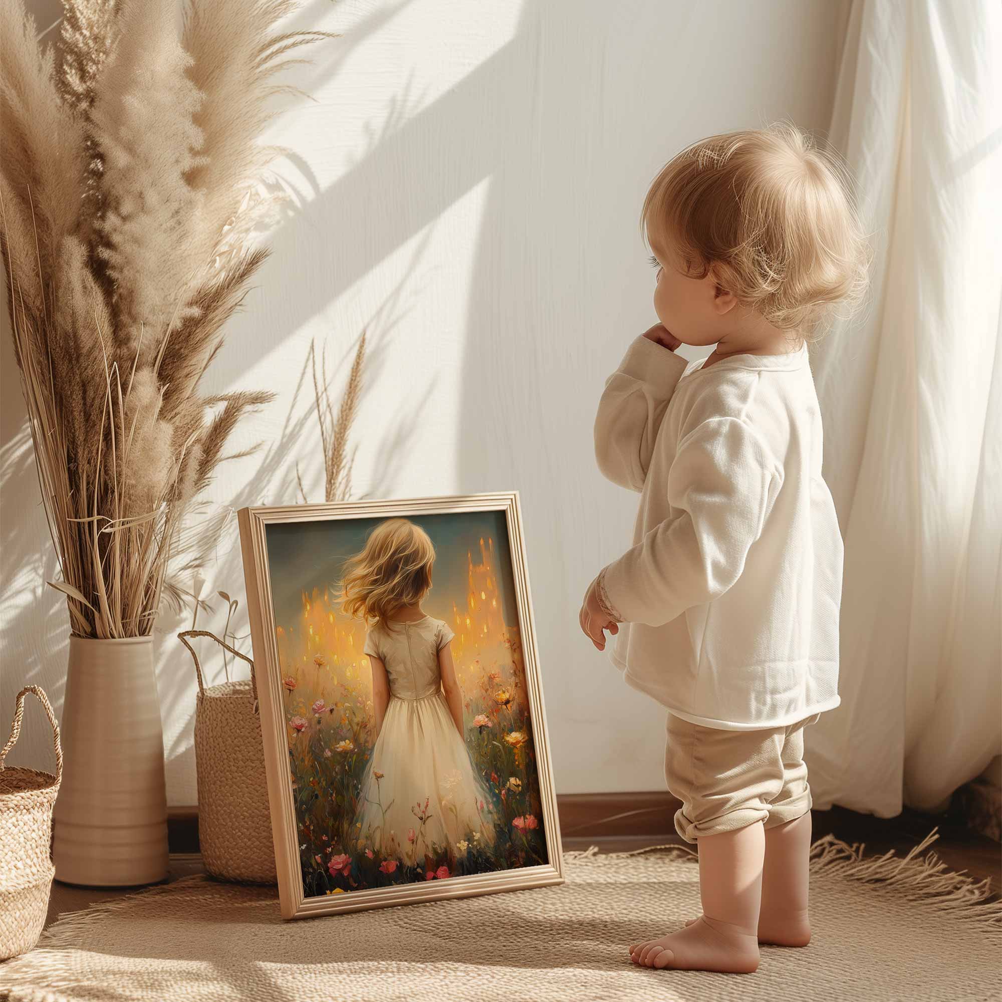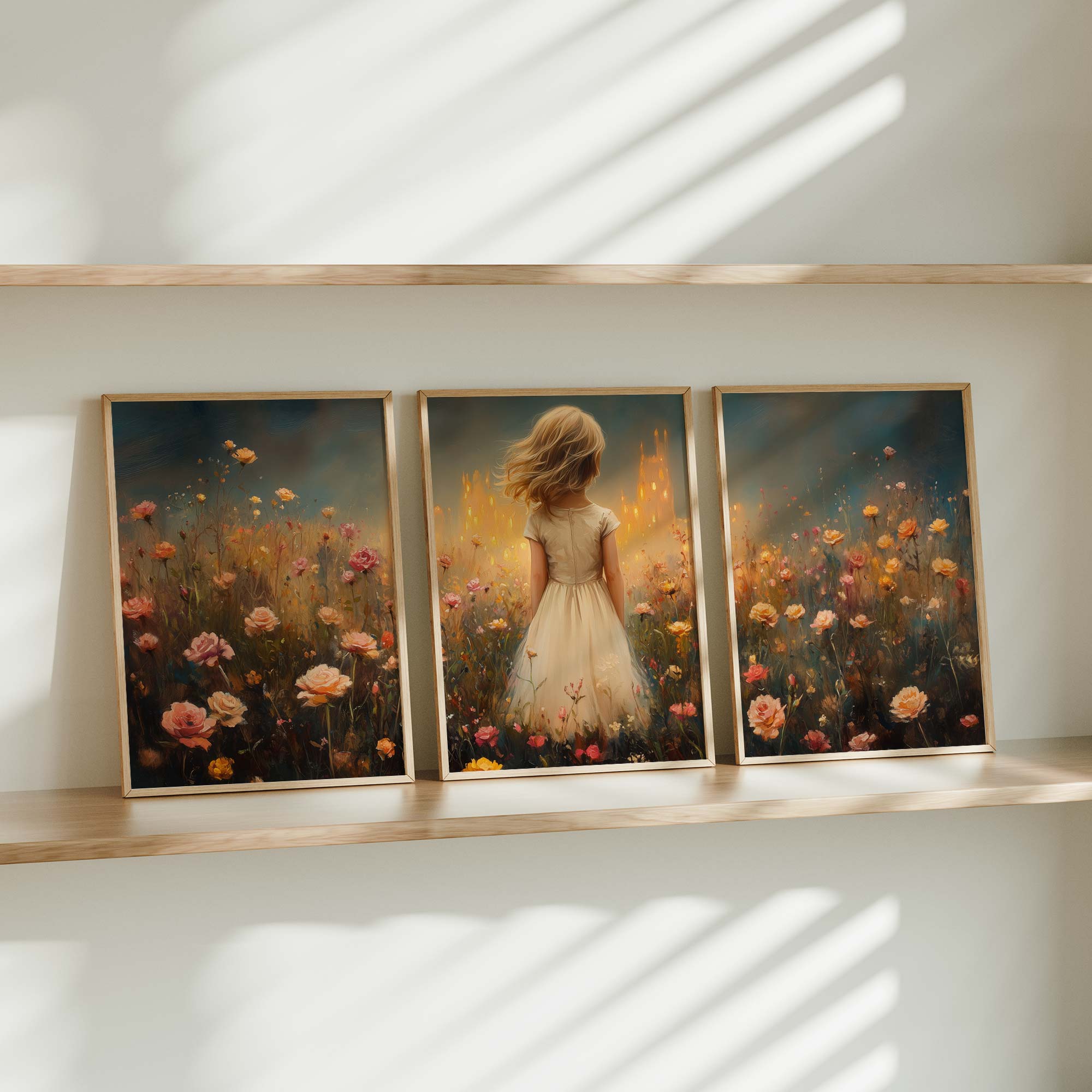 Terug naar collectie Posters Speels Meisje in Bloemenveld met Kasteel