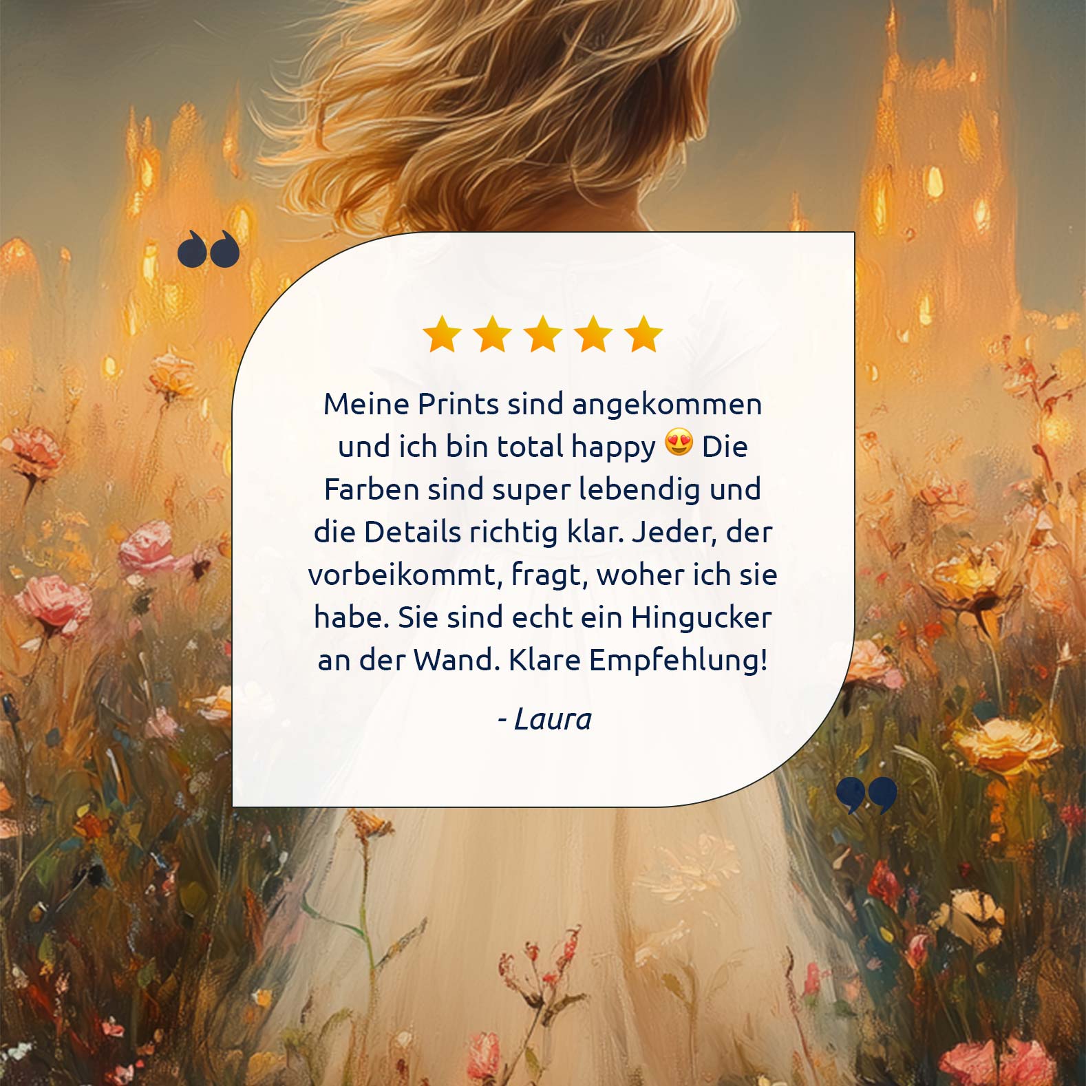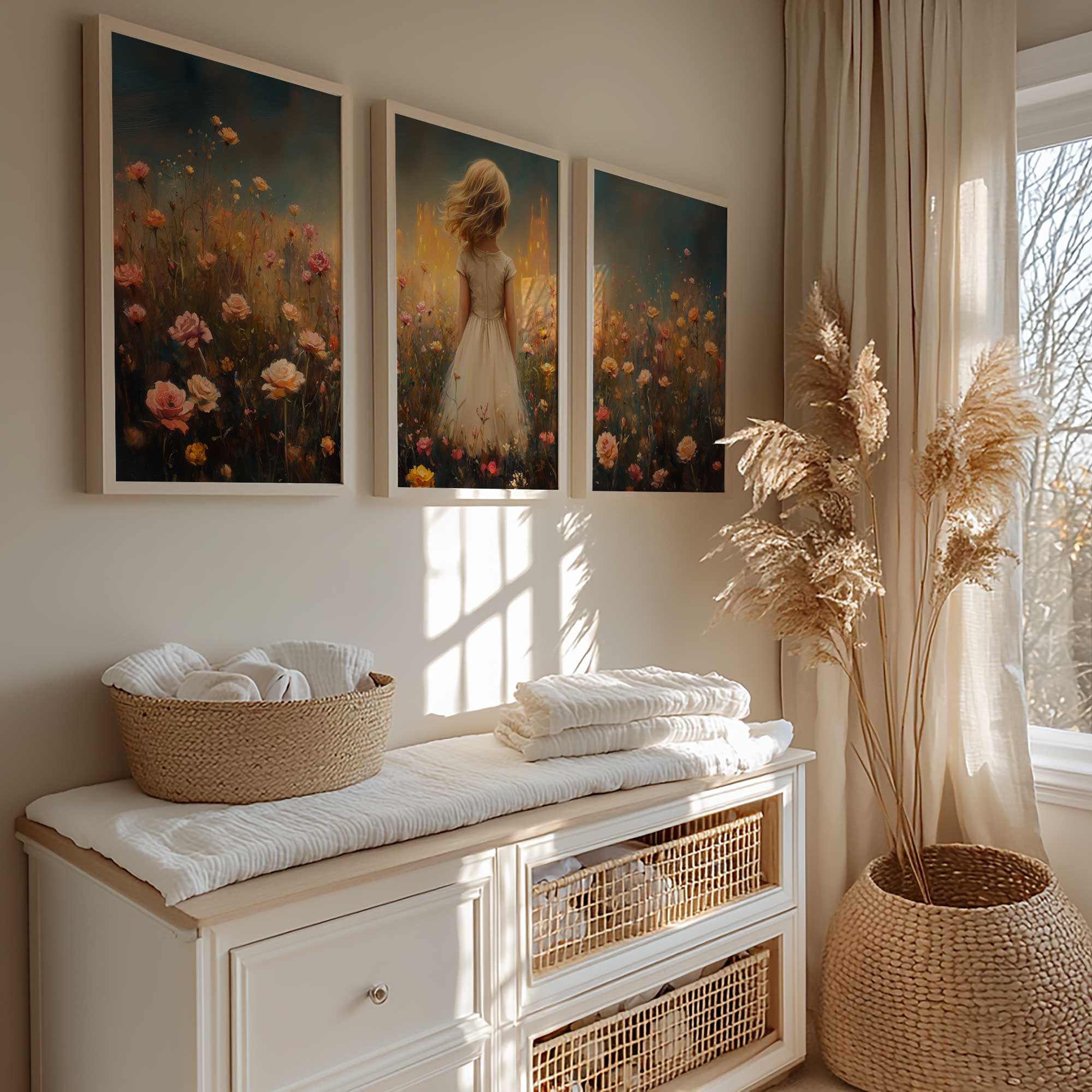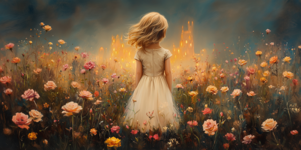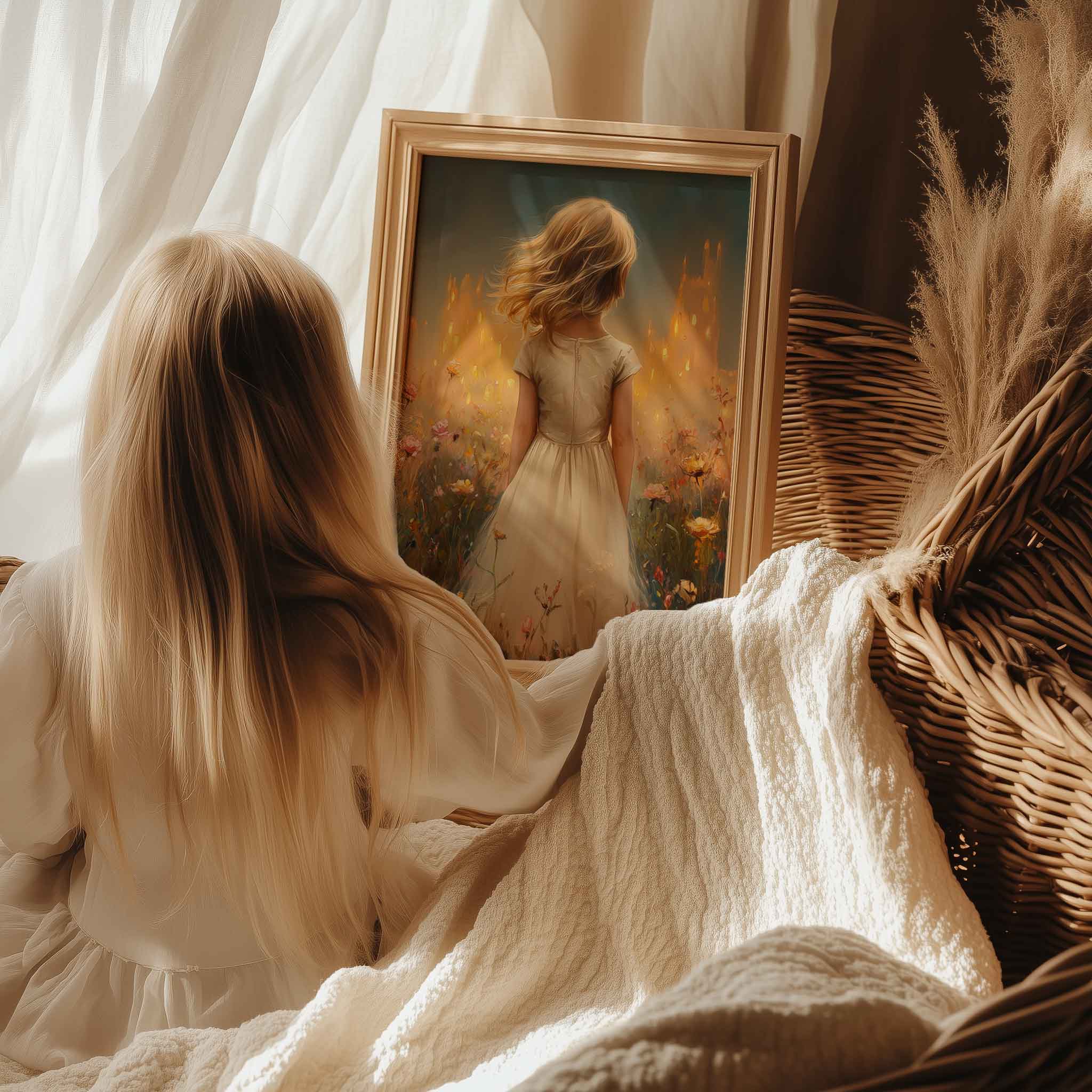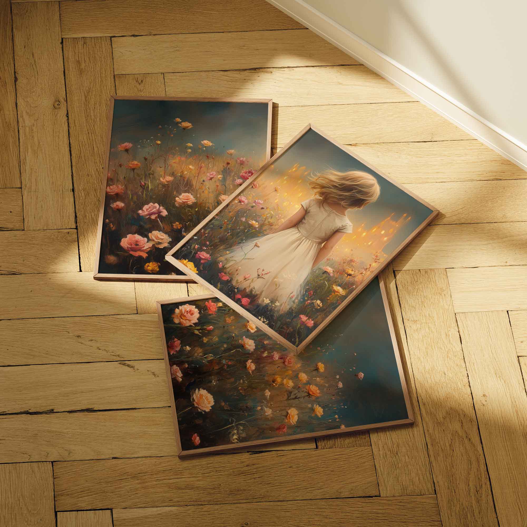 Terug naar collectie Posters Speels Meisje in Bloemenveld met Kasteel