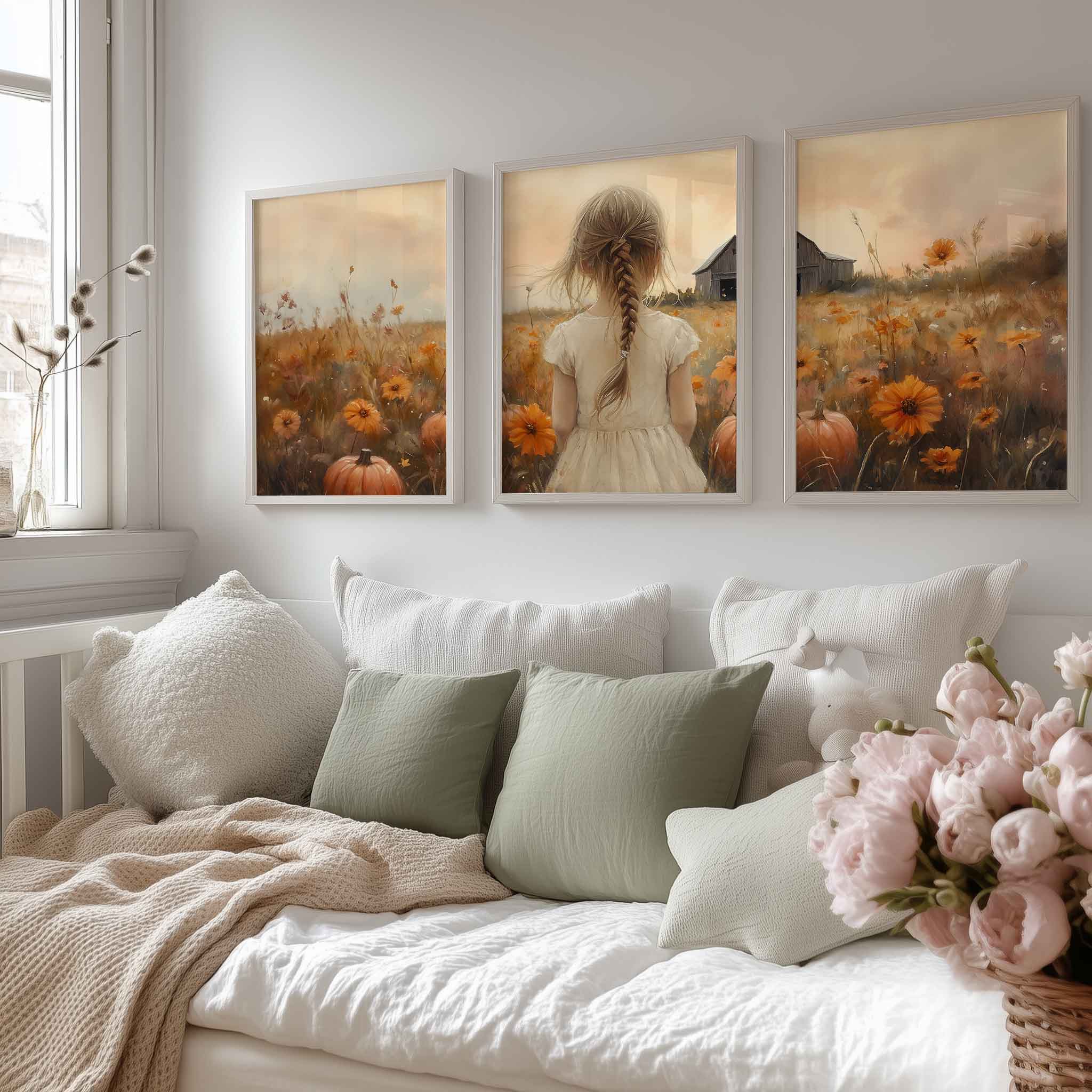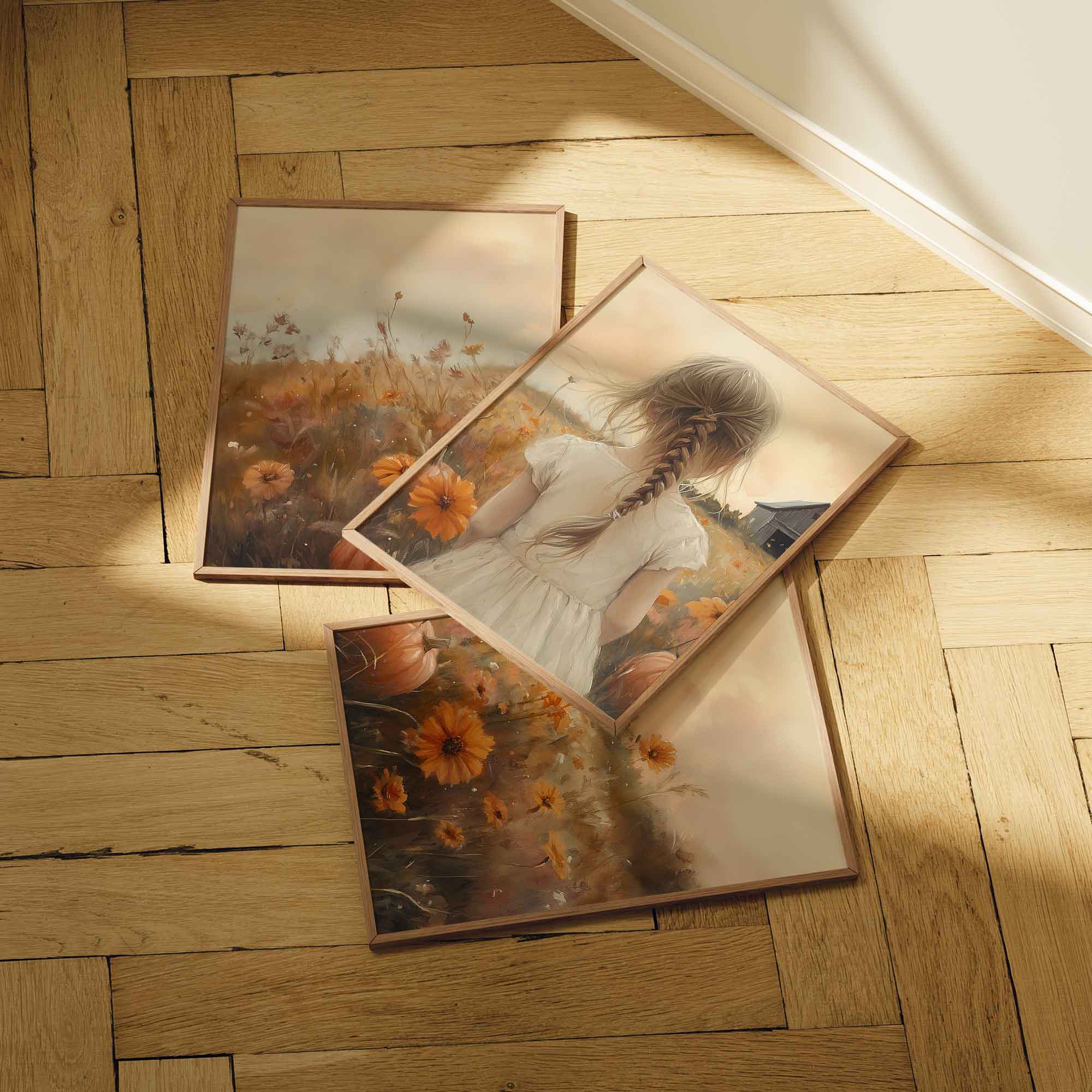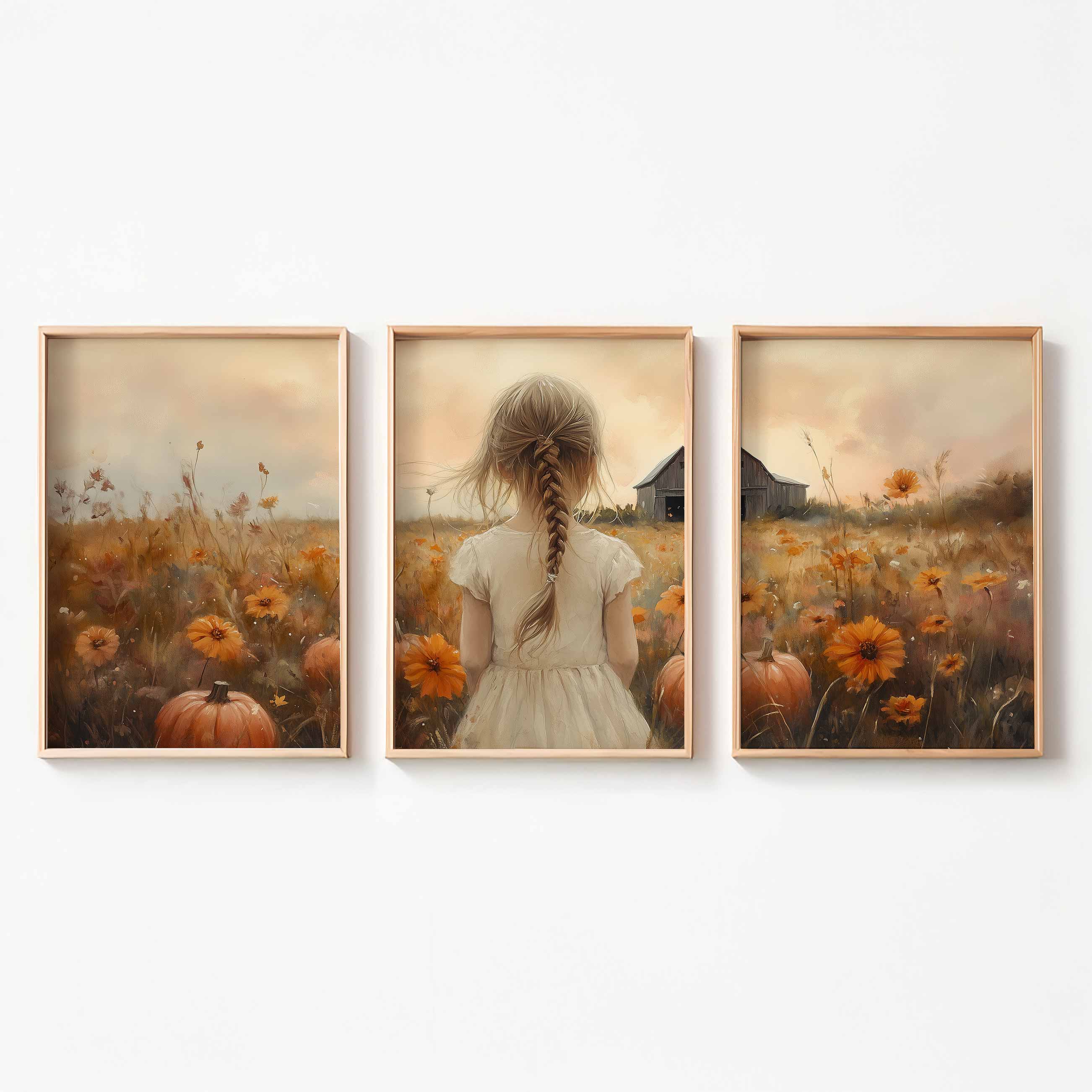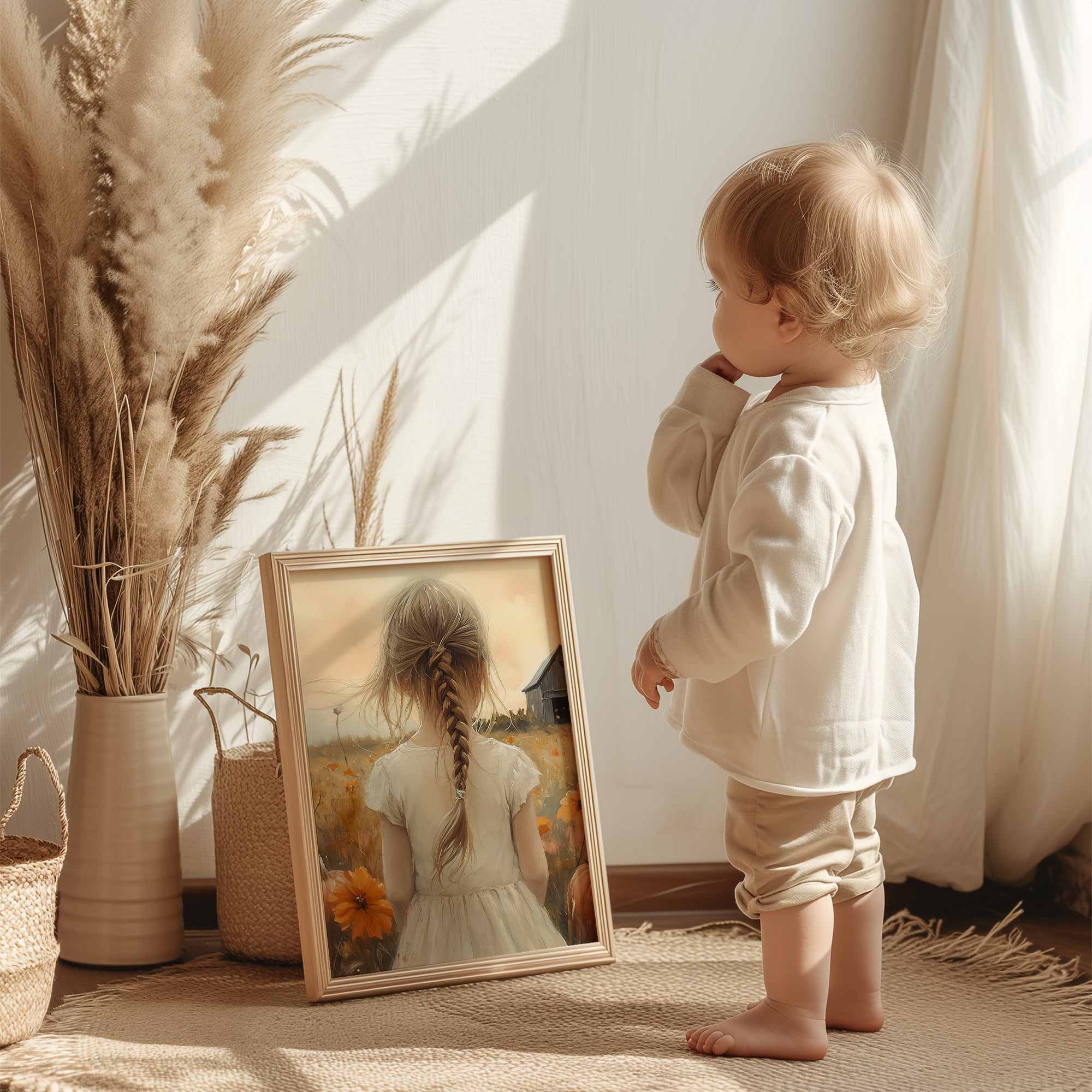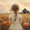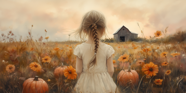Speels Meisje in Bloemenveld met Pompoenen en Schuur