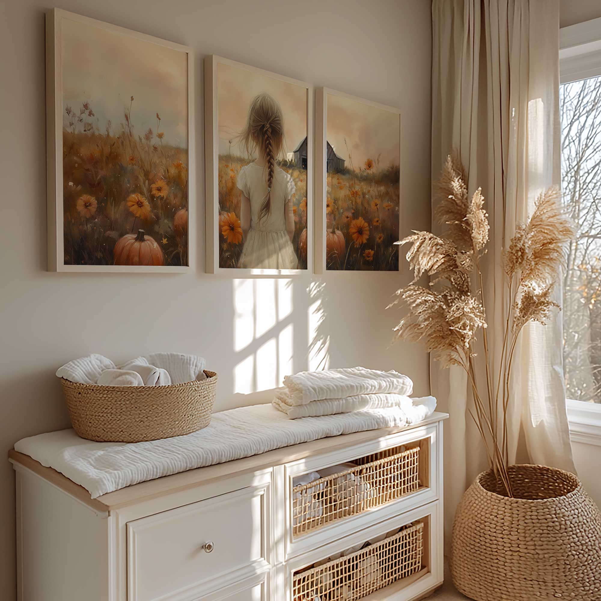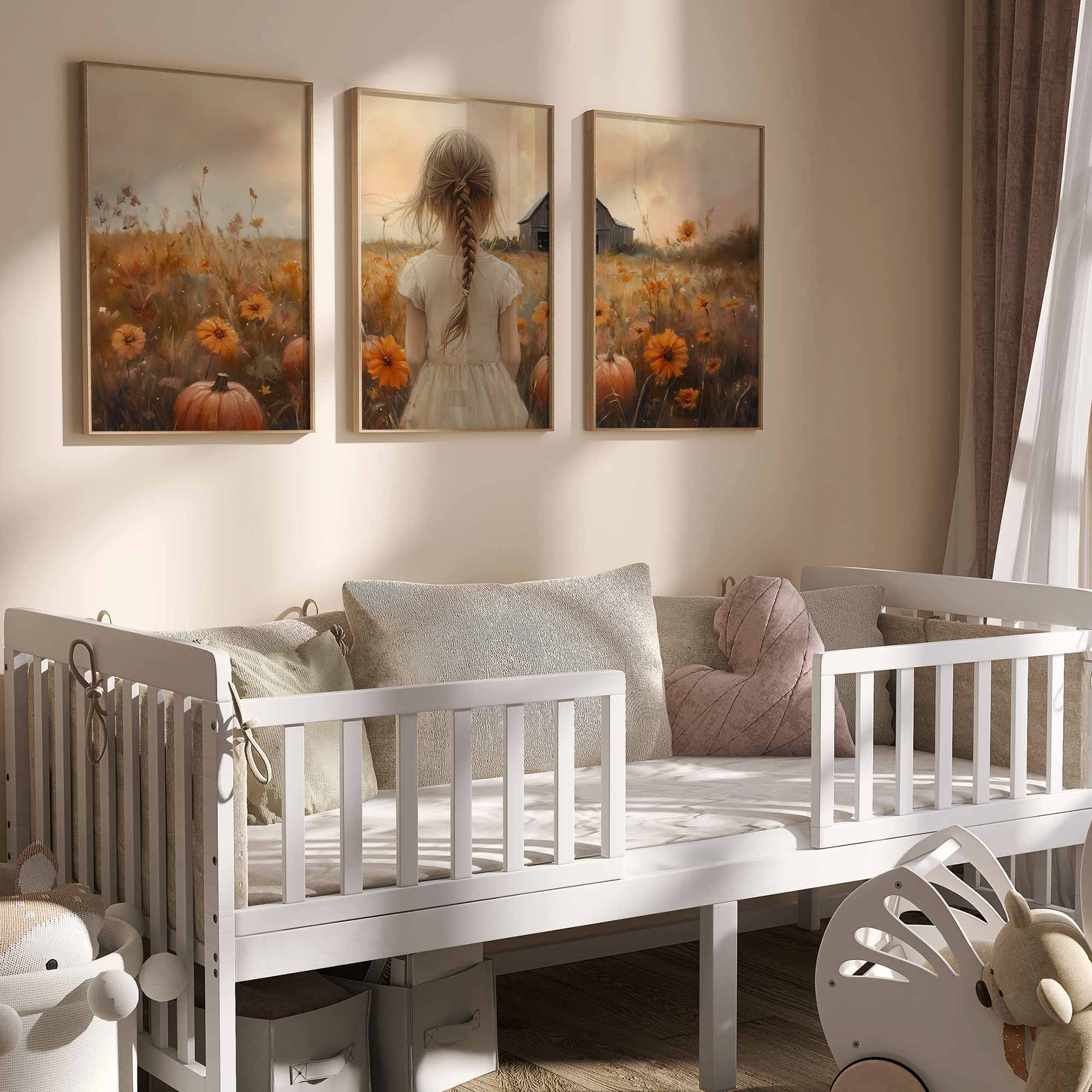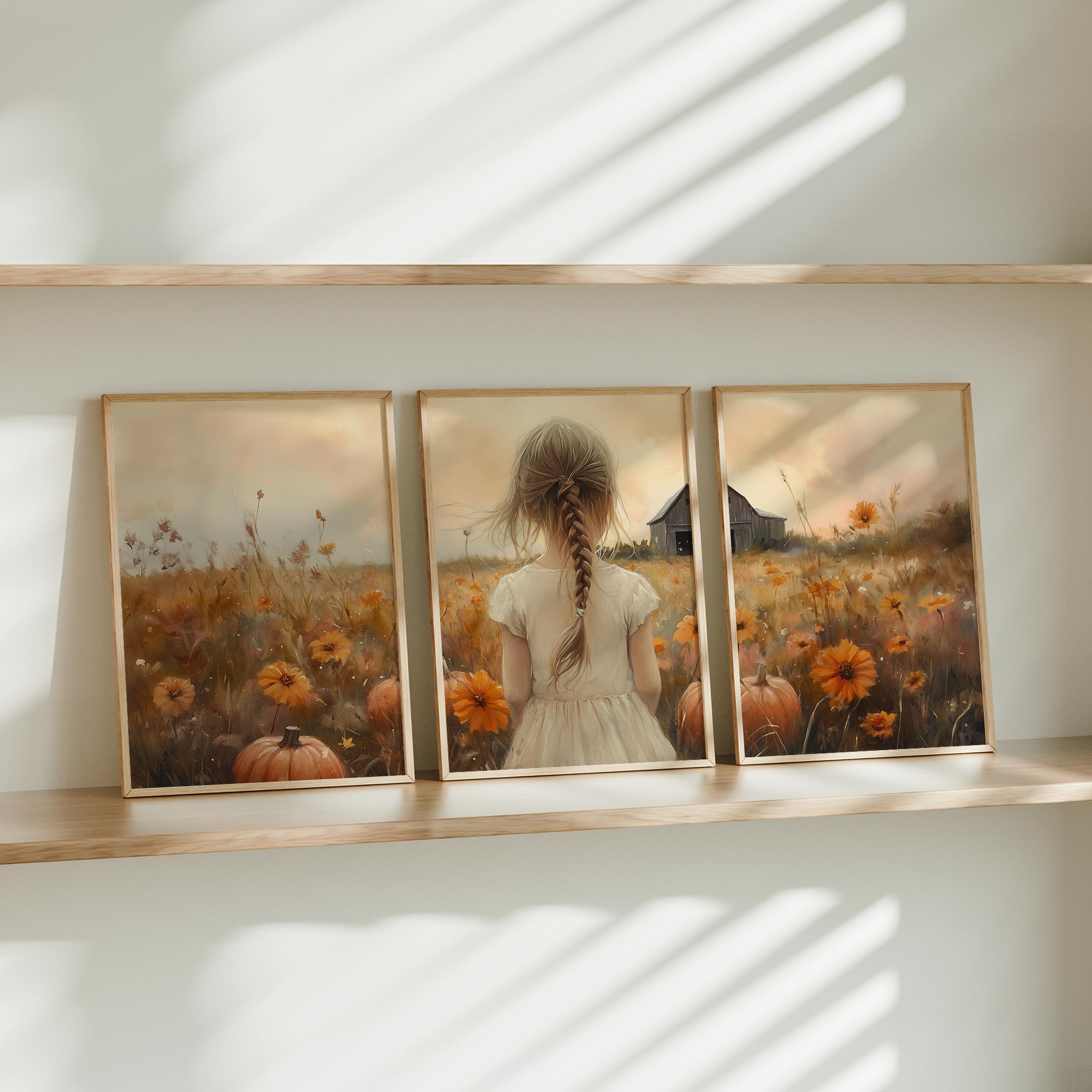 Speels Meisje in Bloemenveld met Pompoenen en Schuur