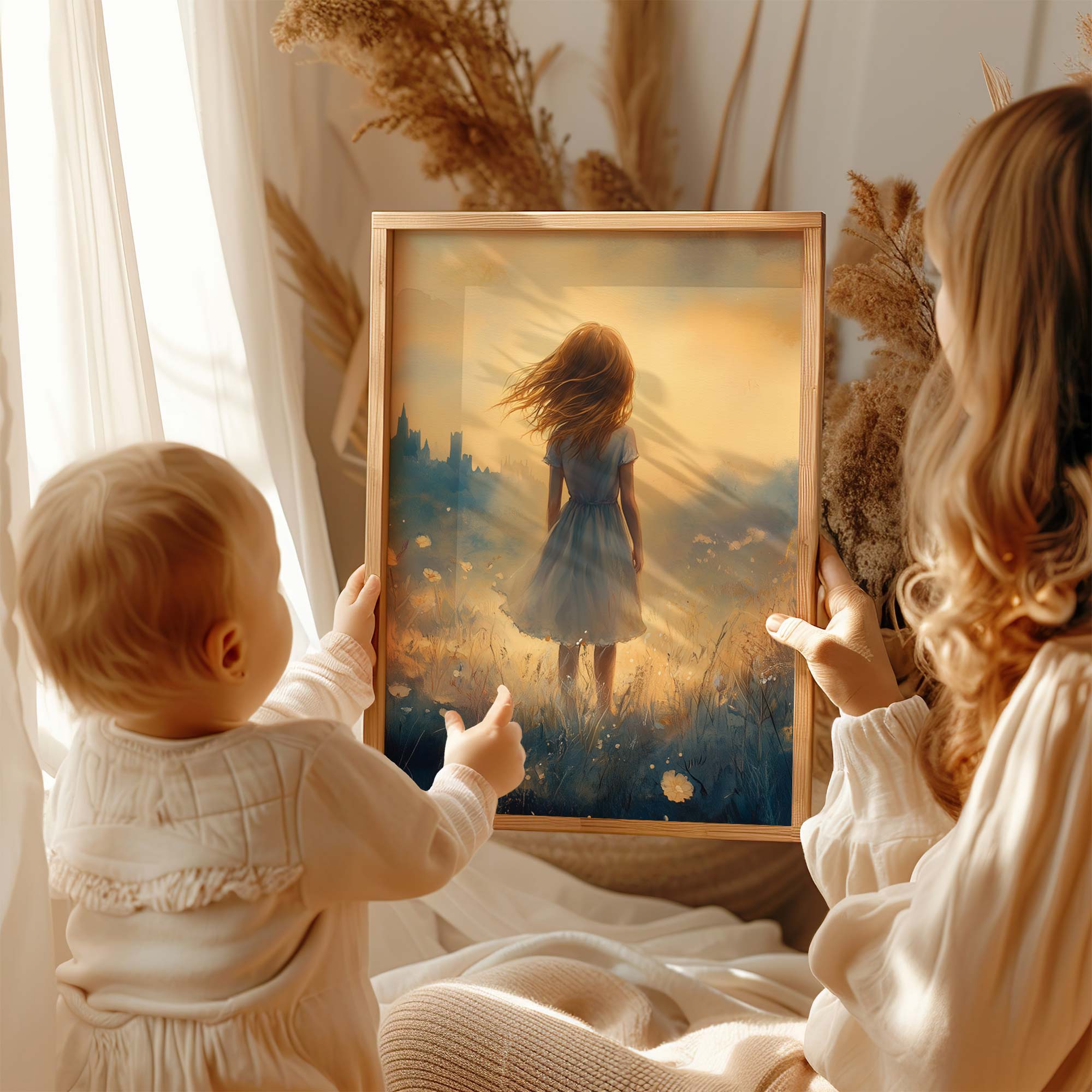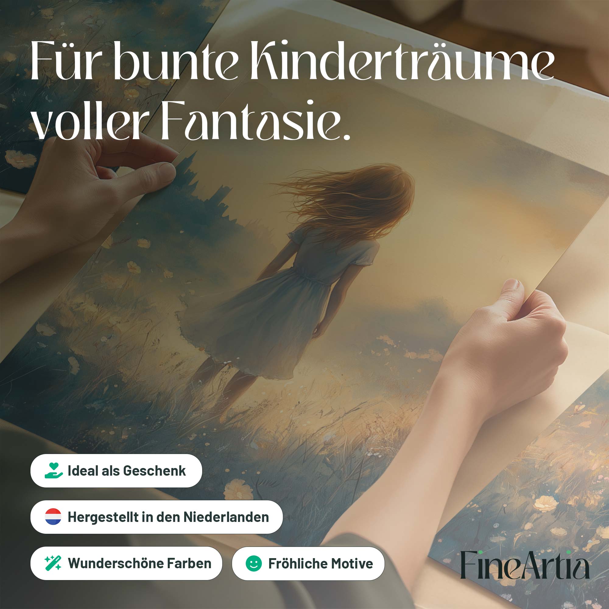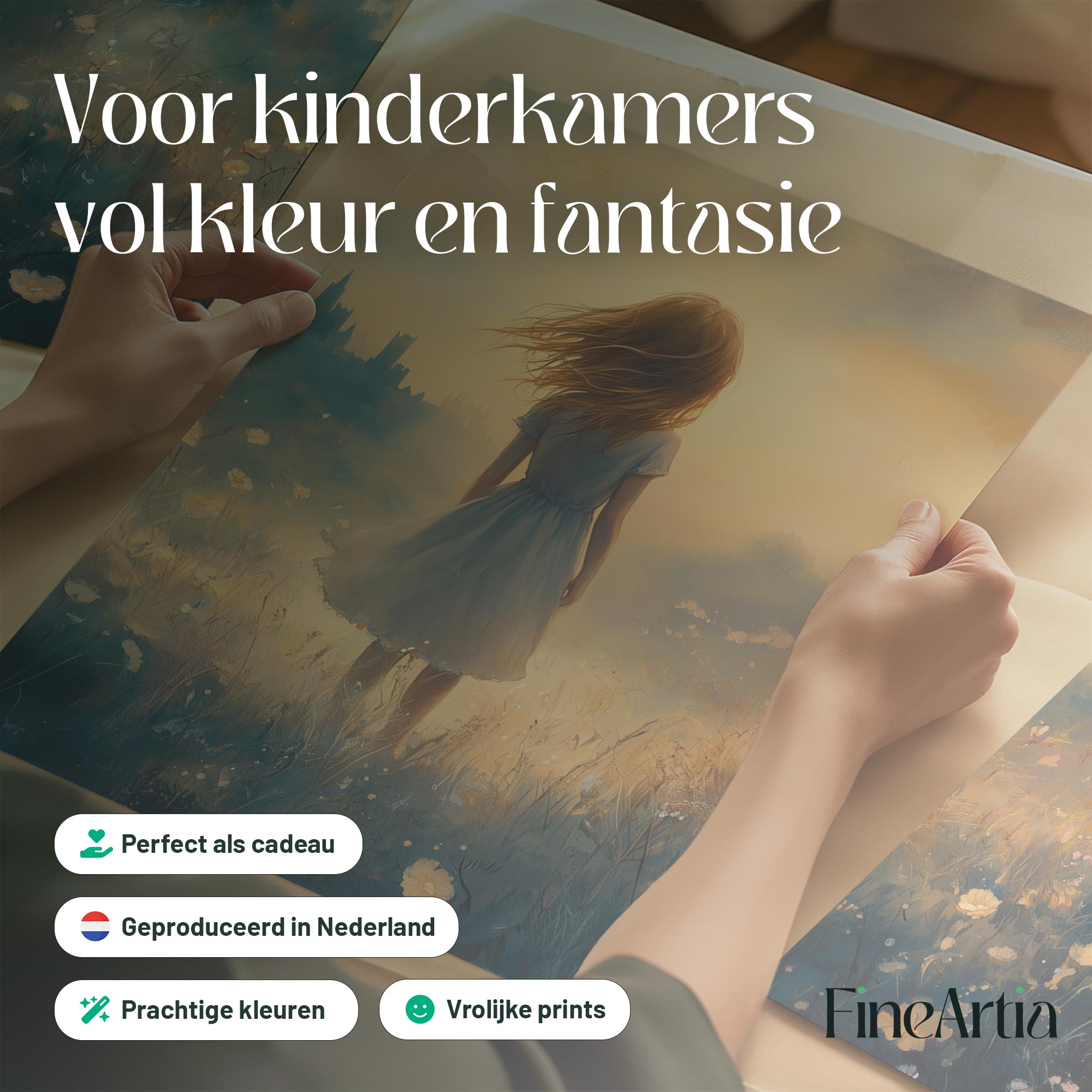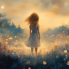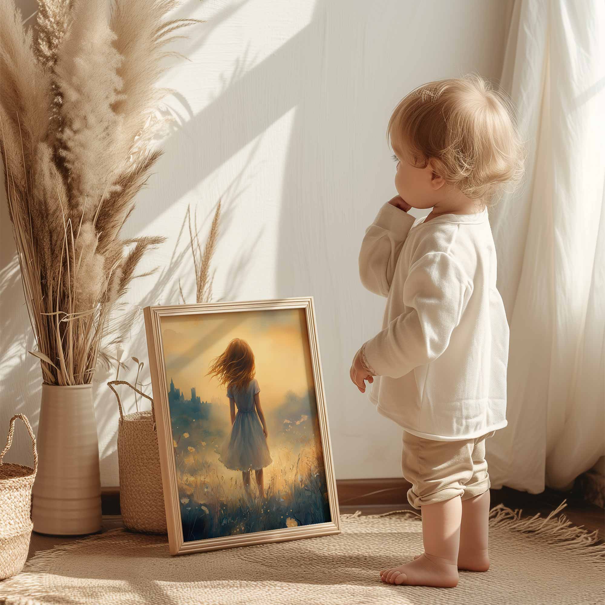 Speels Meisje in Bloemenveld met Stad op de Achtergrond