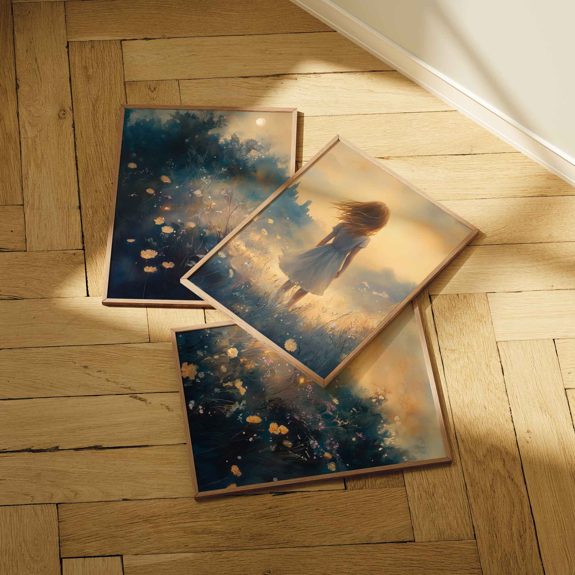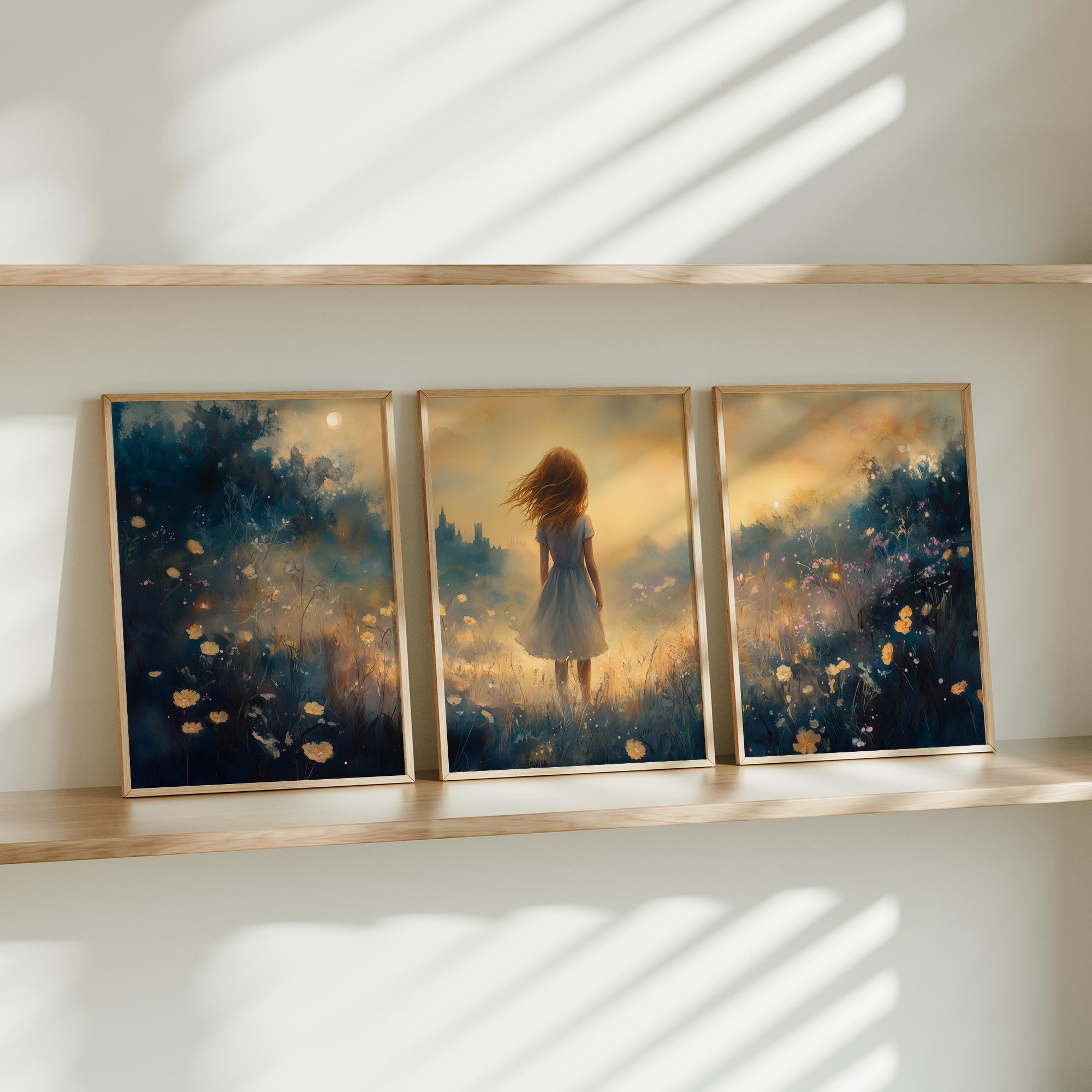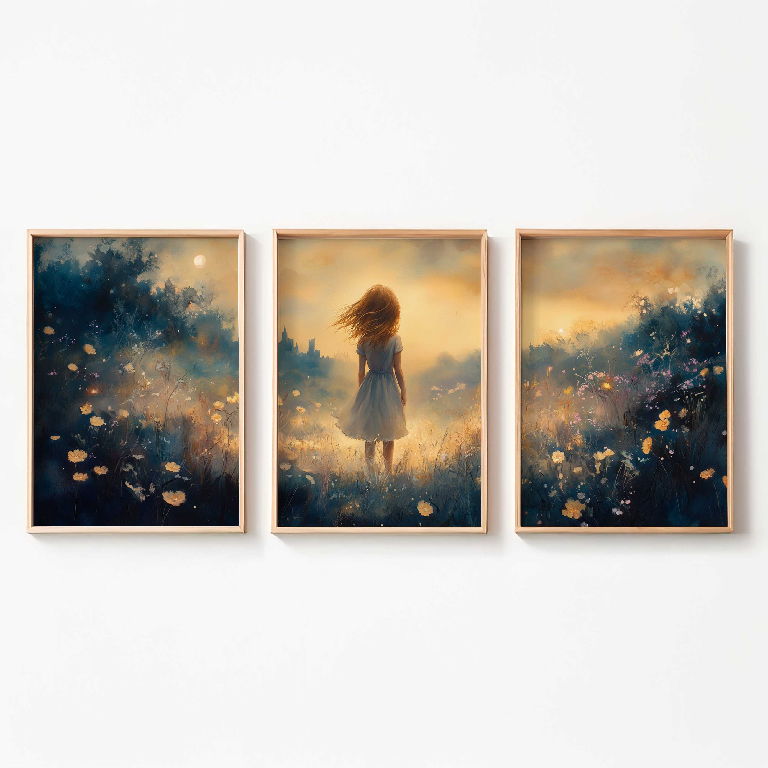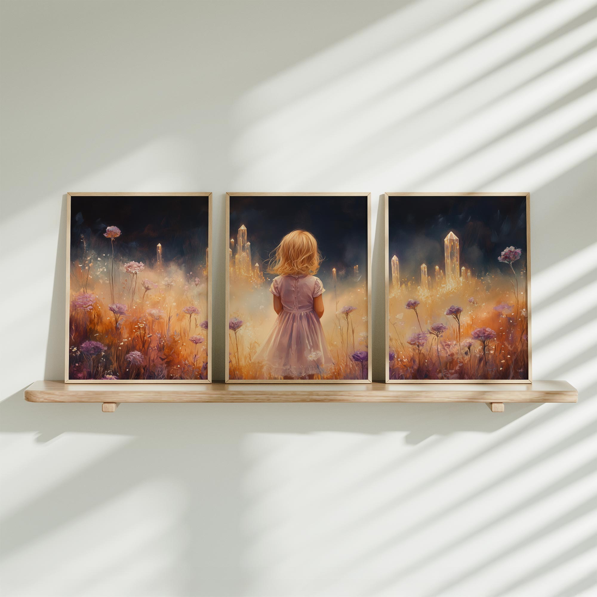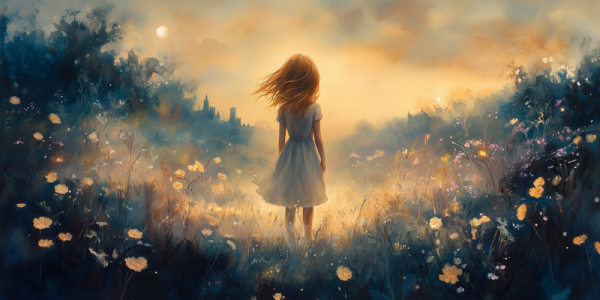 Speels Meisje in Bloemenveld met Stad op de Achtergrond