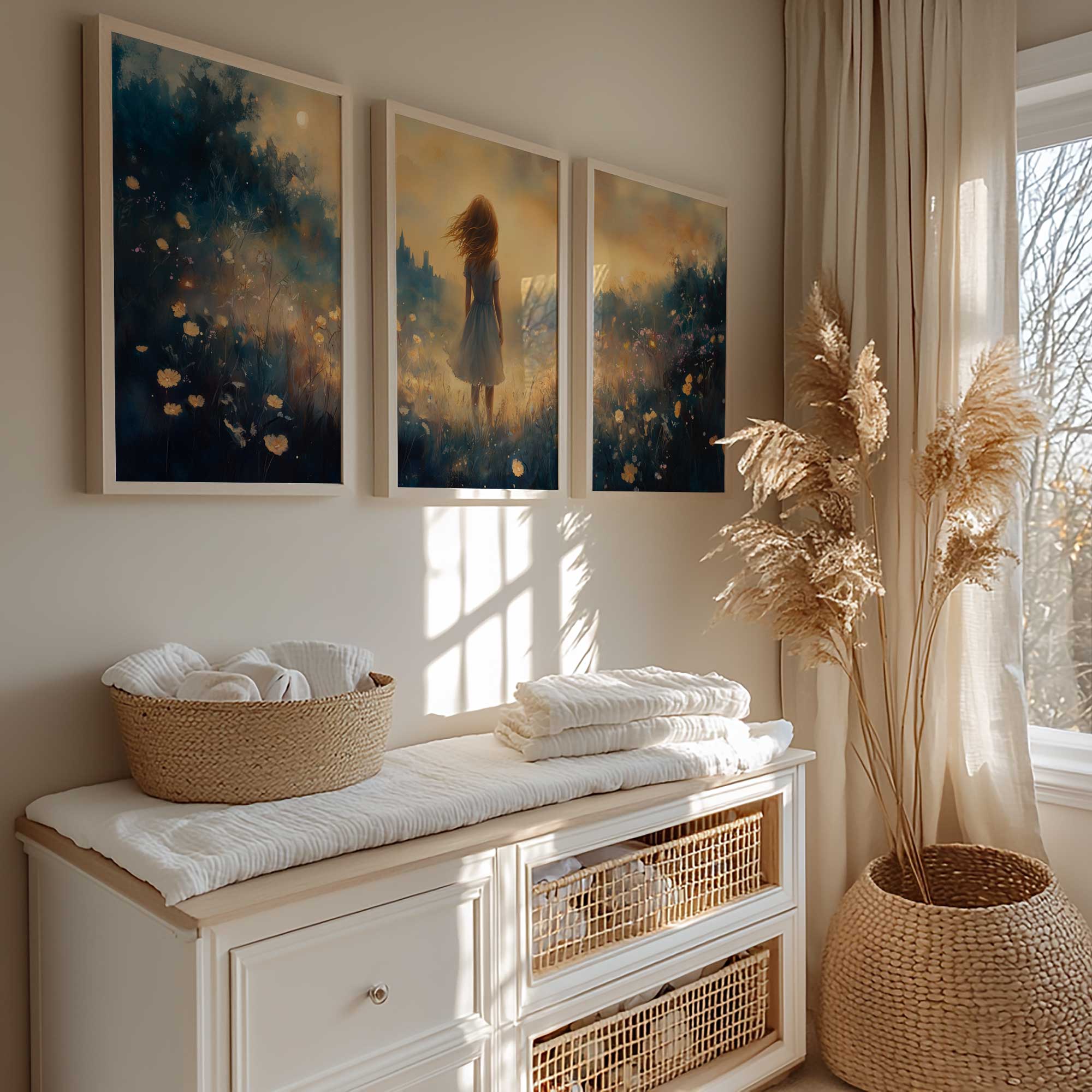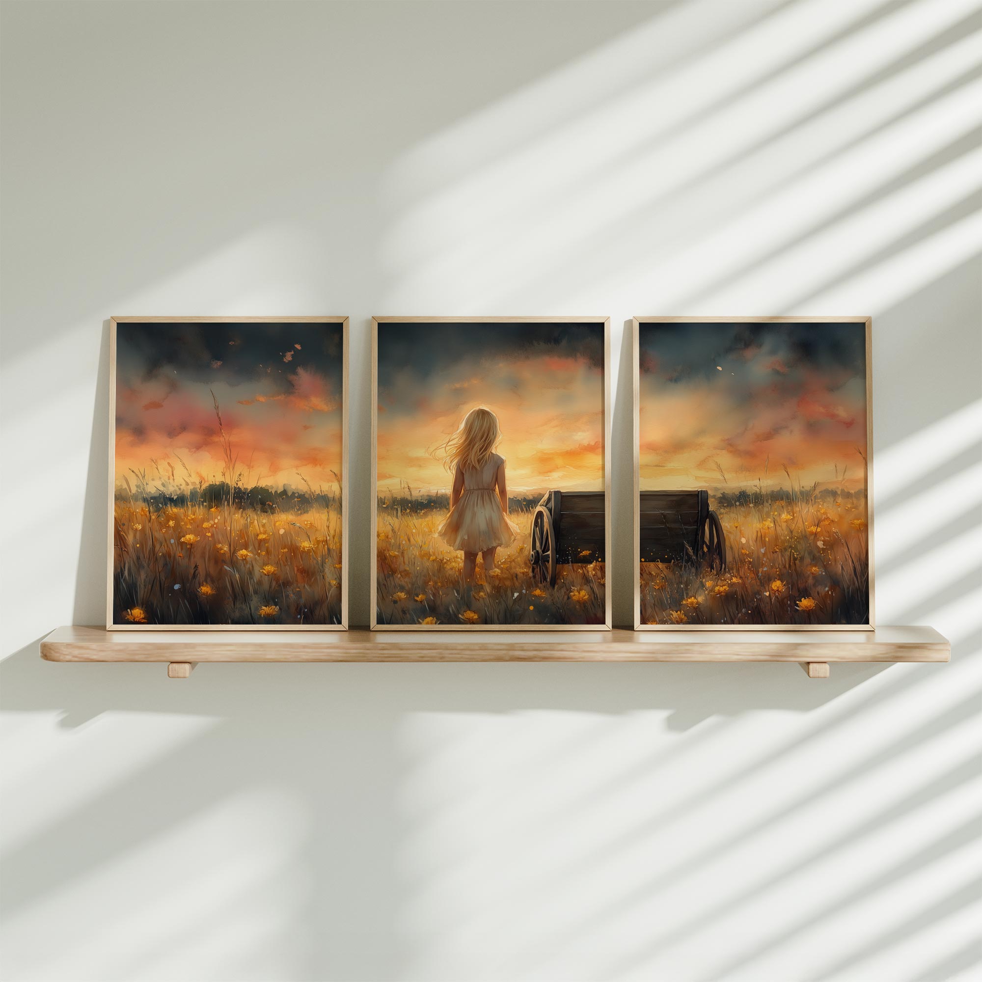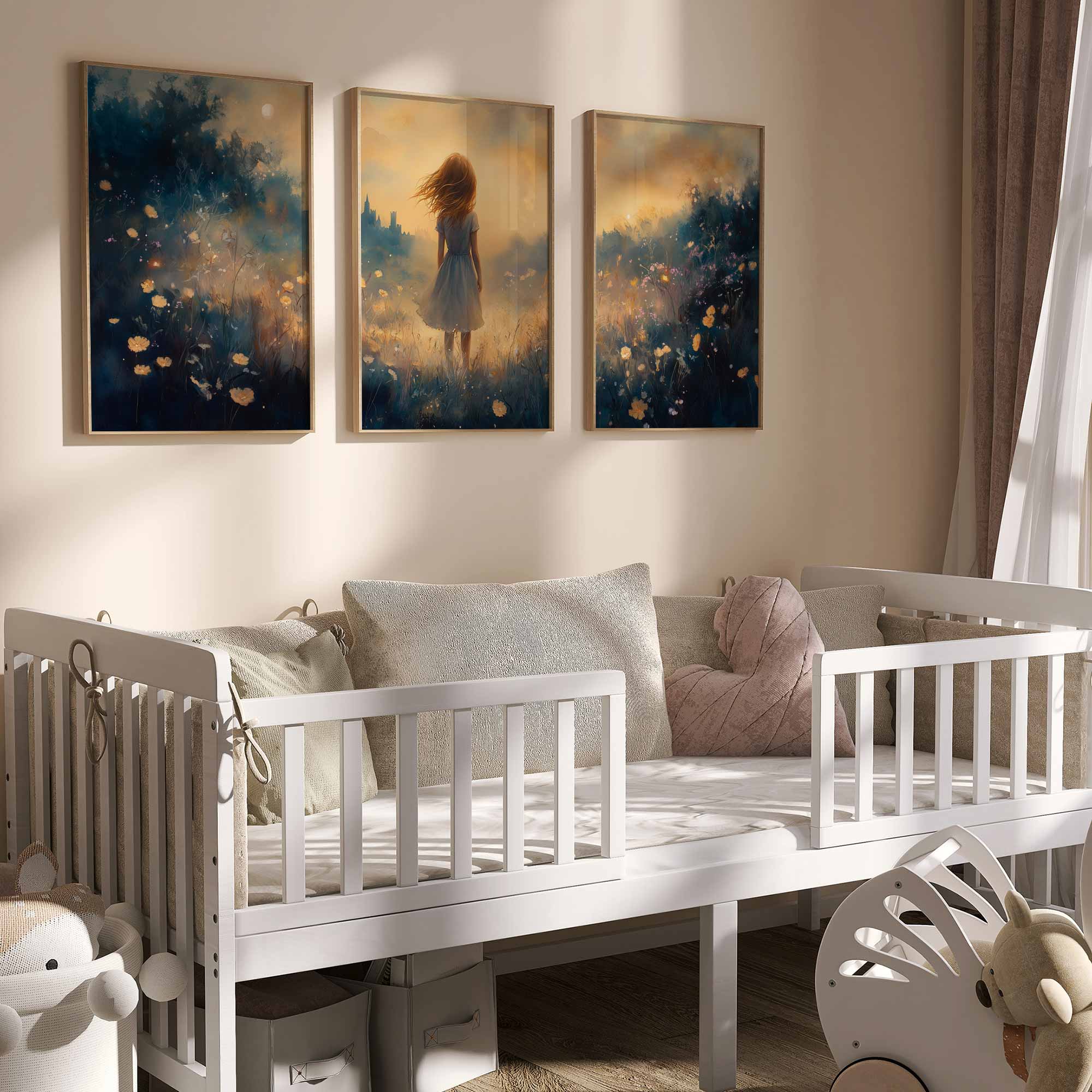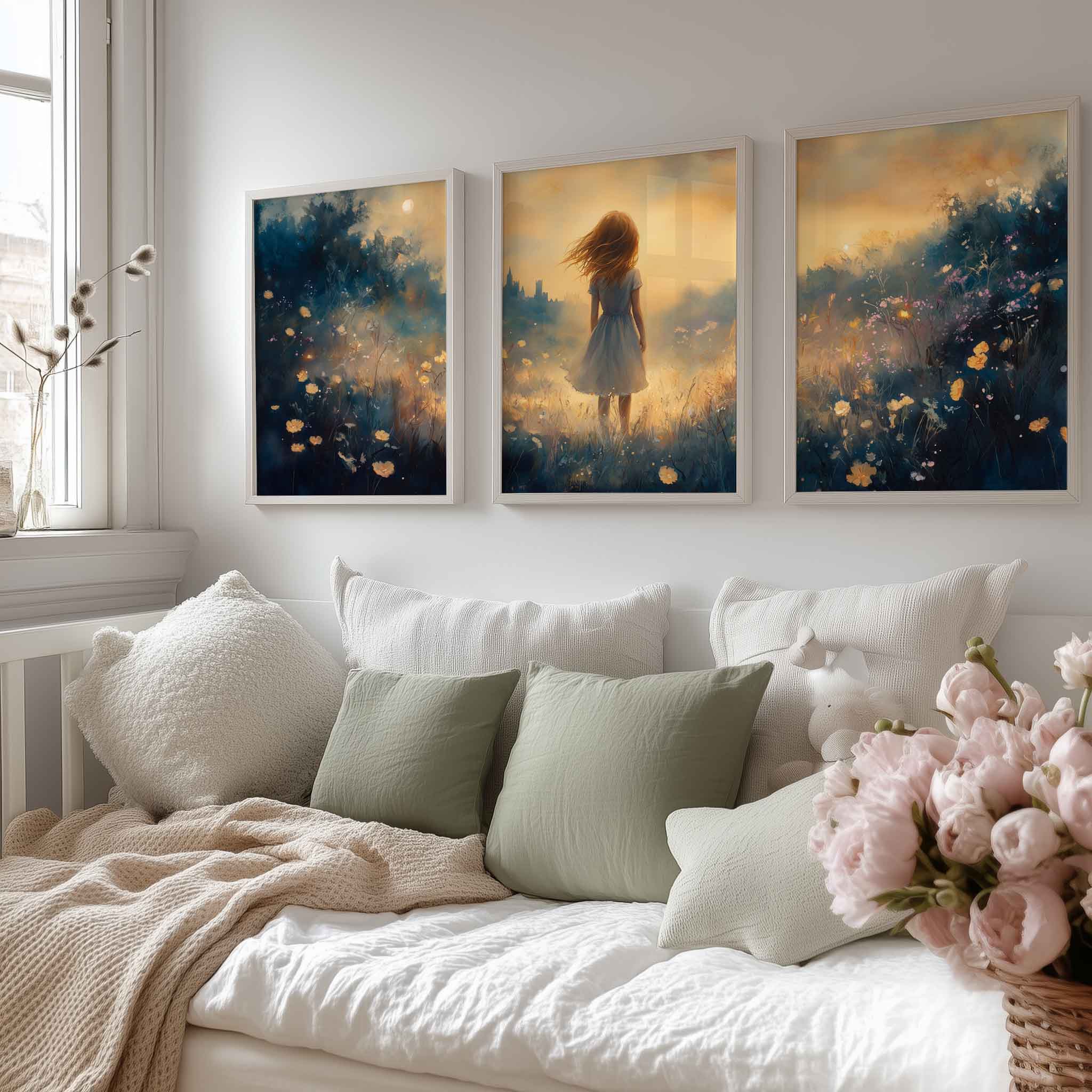 Speels Meisje in Bloemenveld met Stad op de Achtergrond