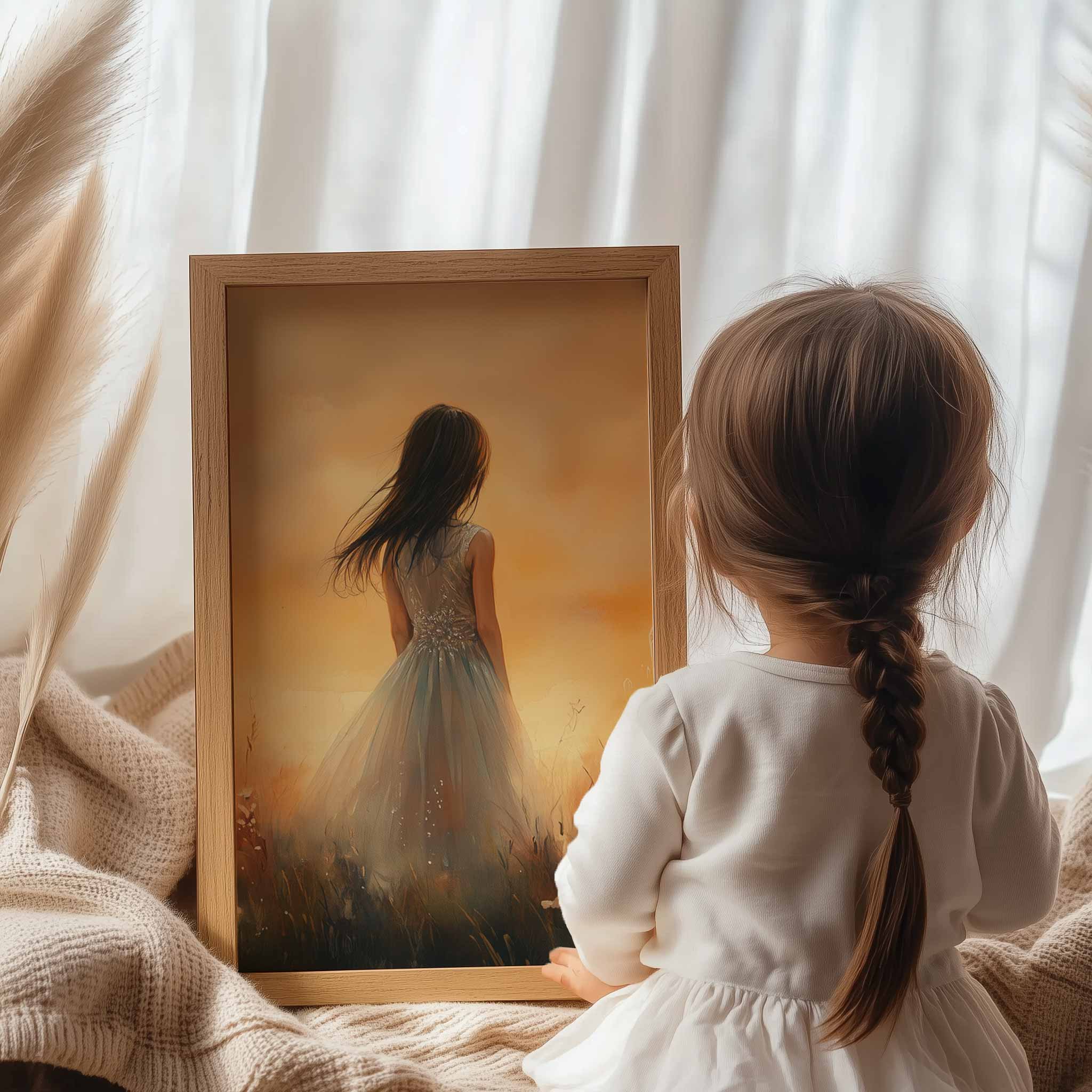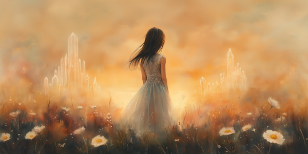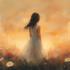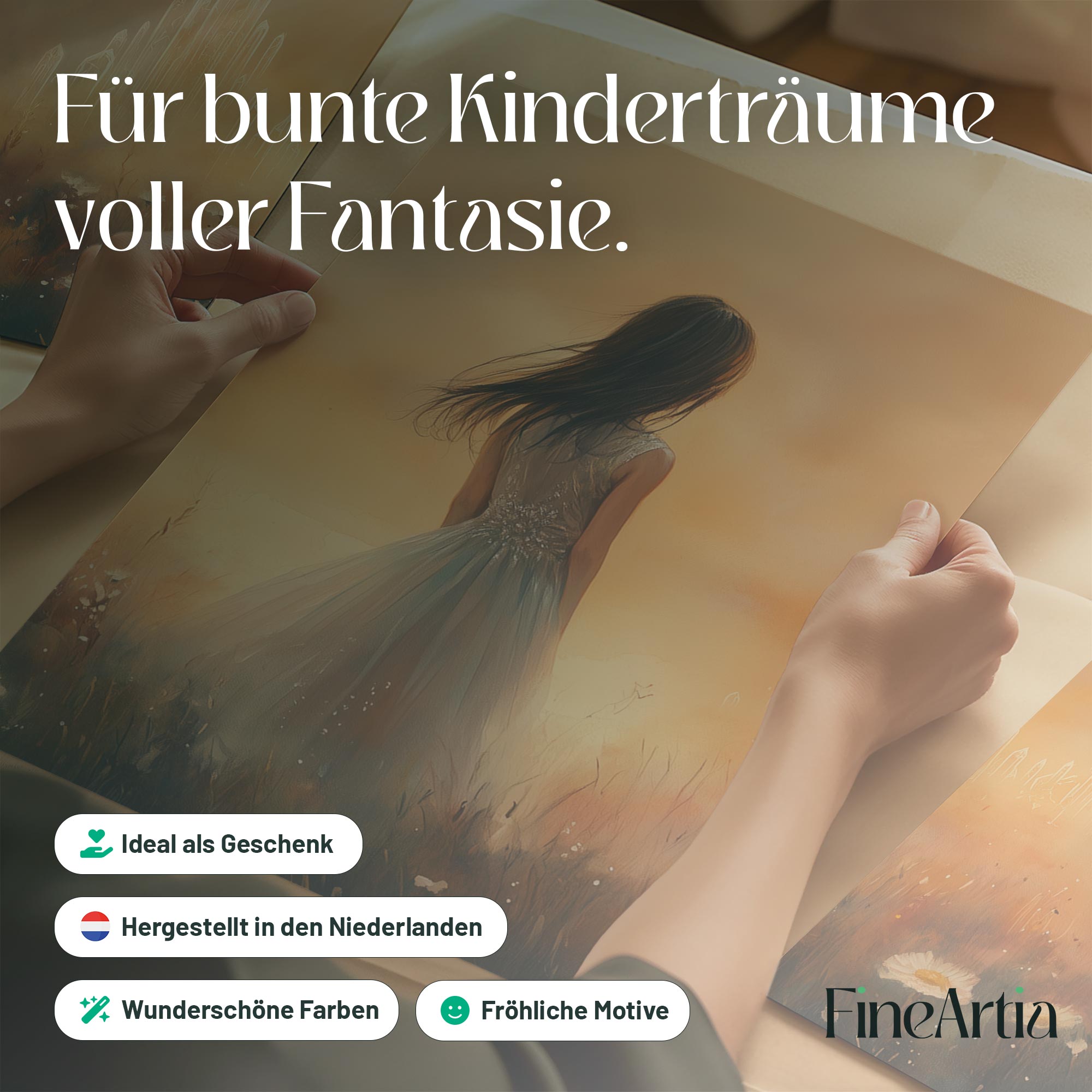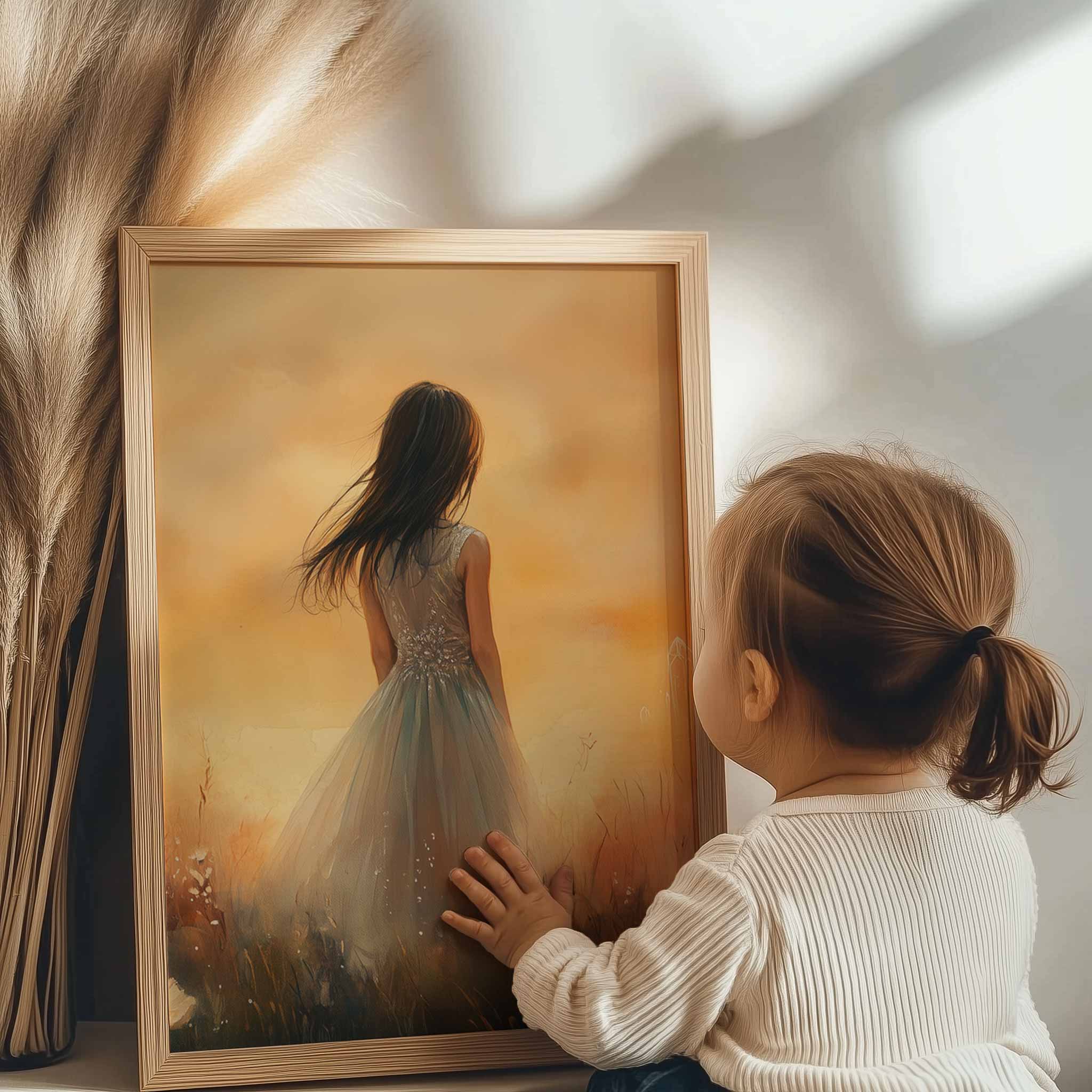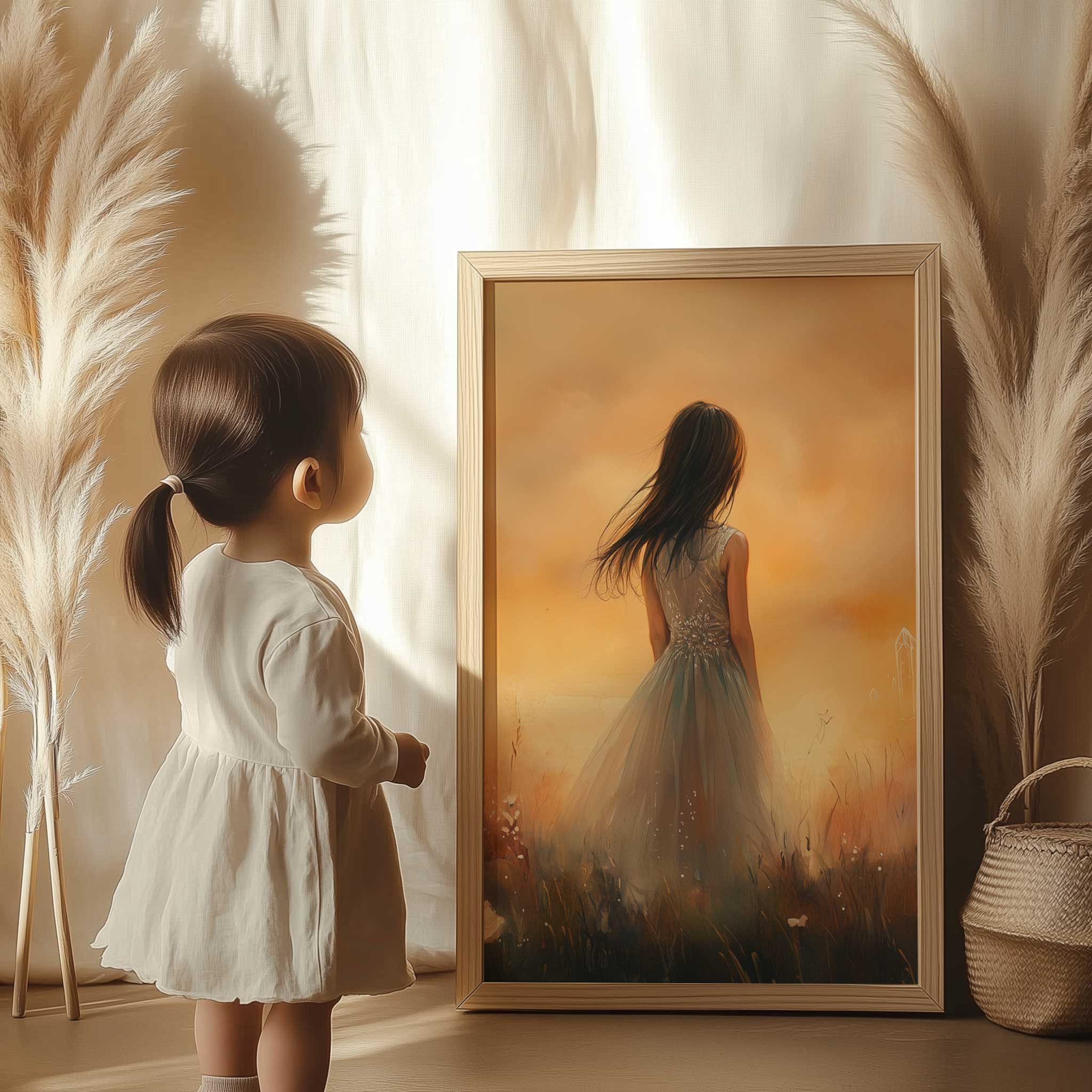Speels Meisje in Bloemenveld met Stad op de Achtergrond