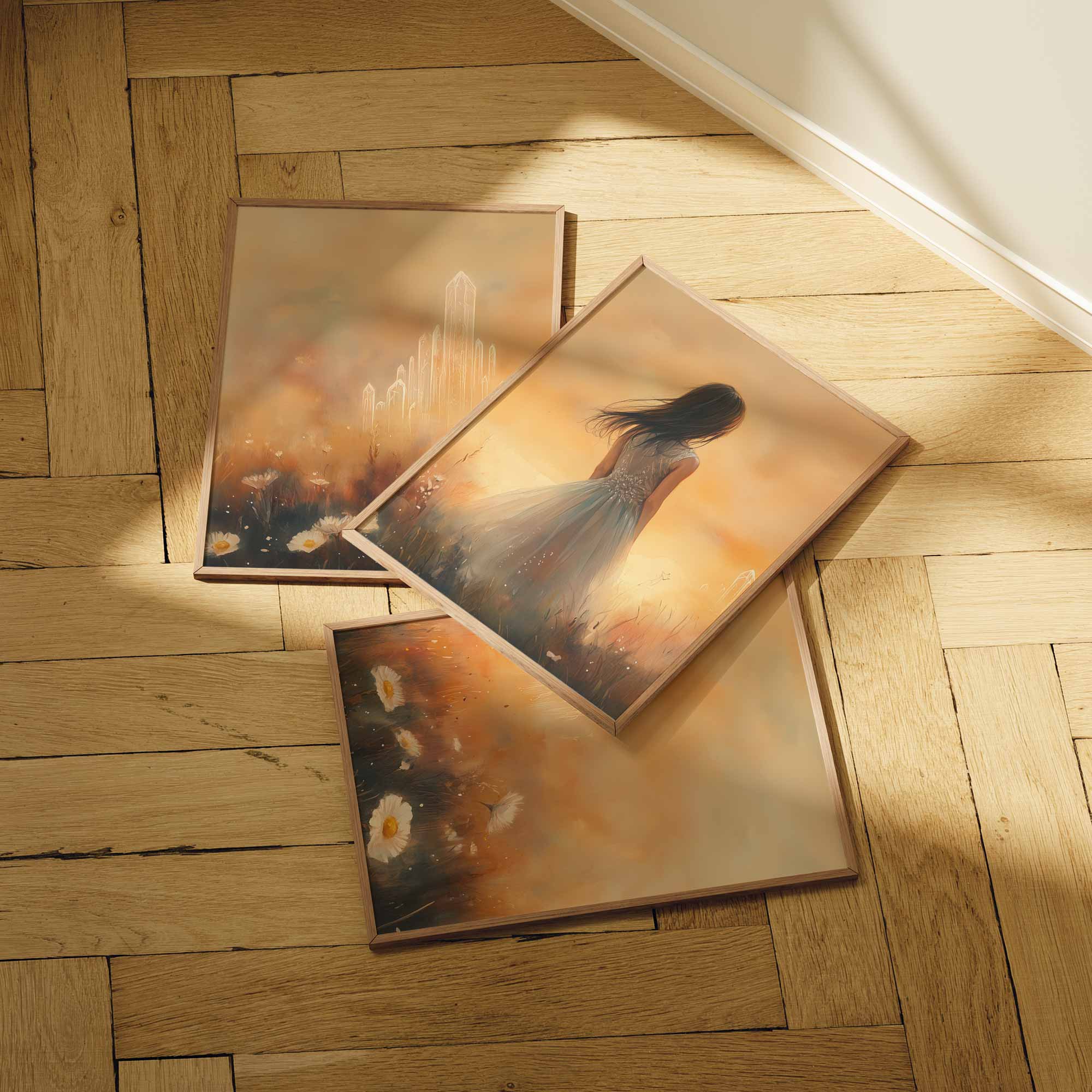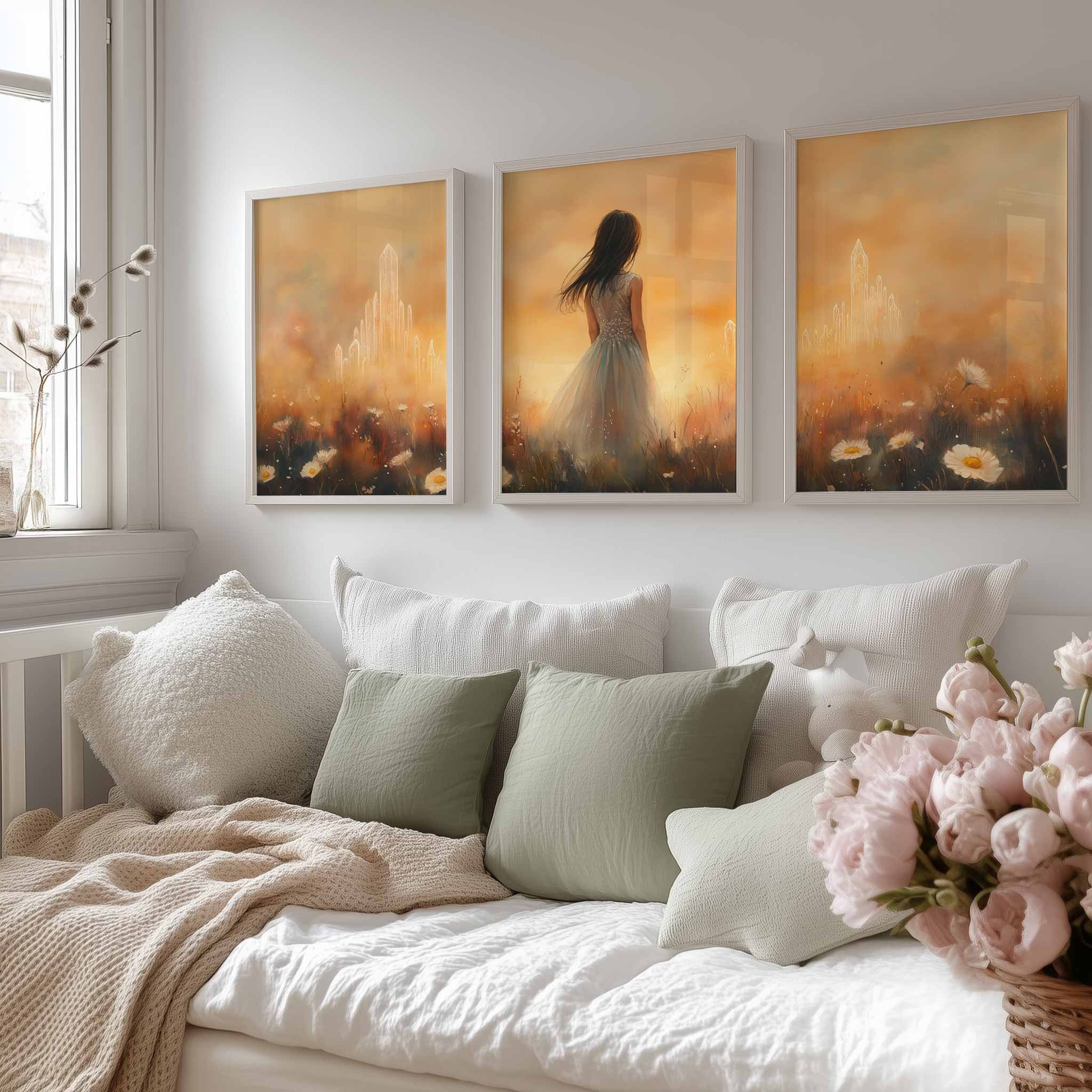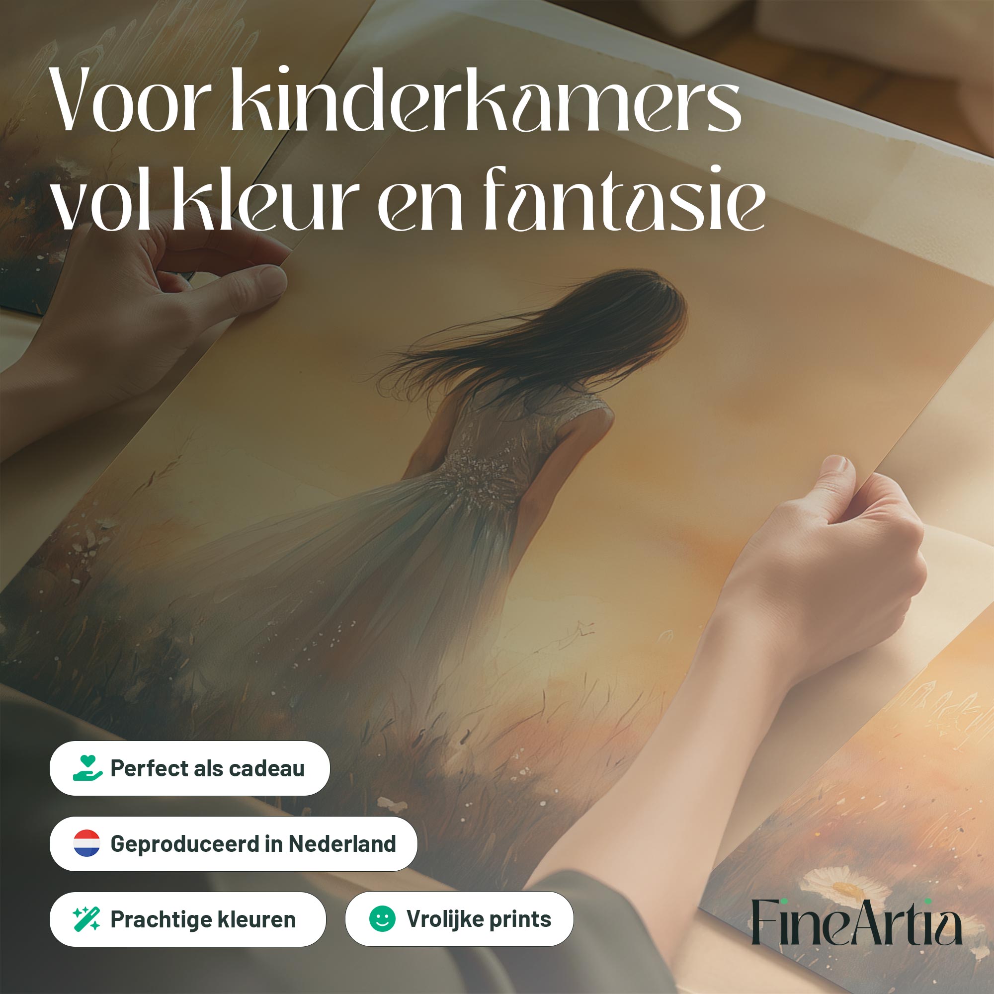 Speels Meisje in Bloemenveld met Stad op de Achtergrond