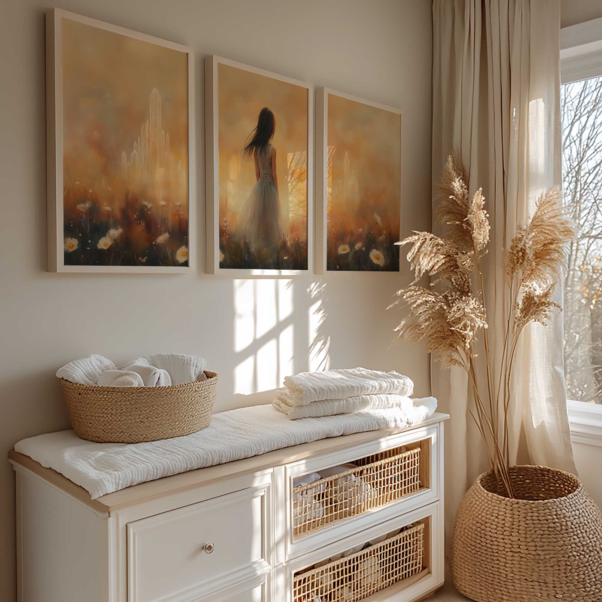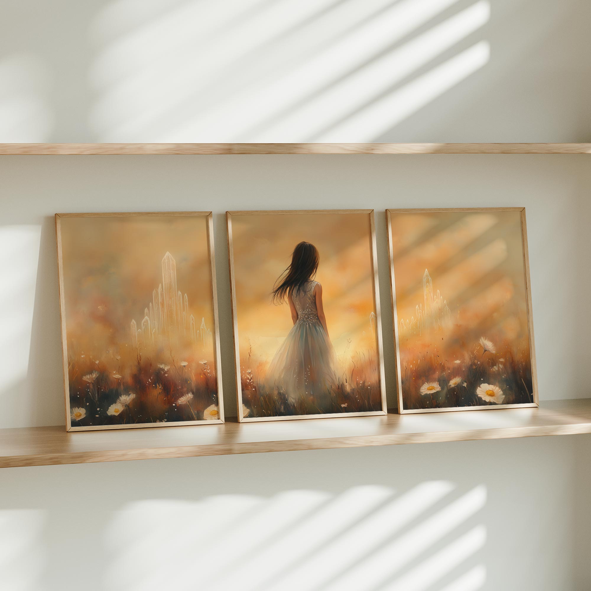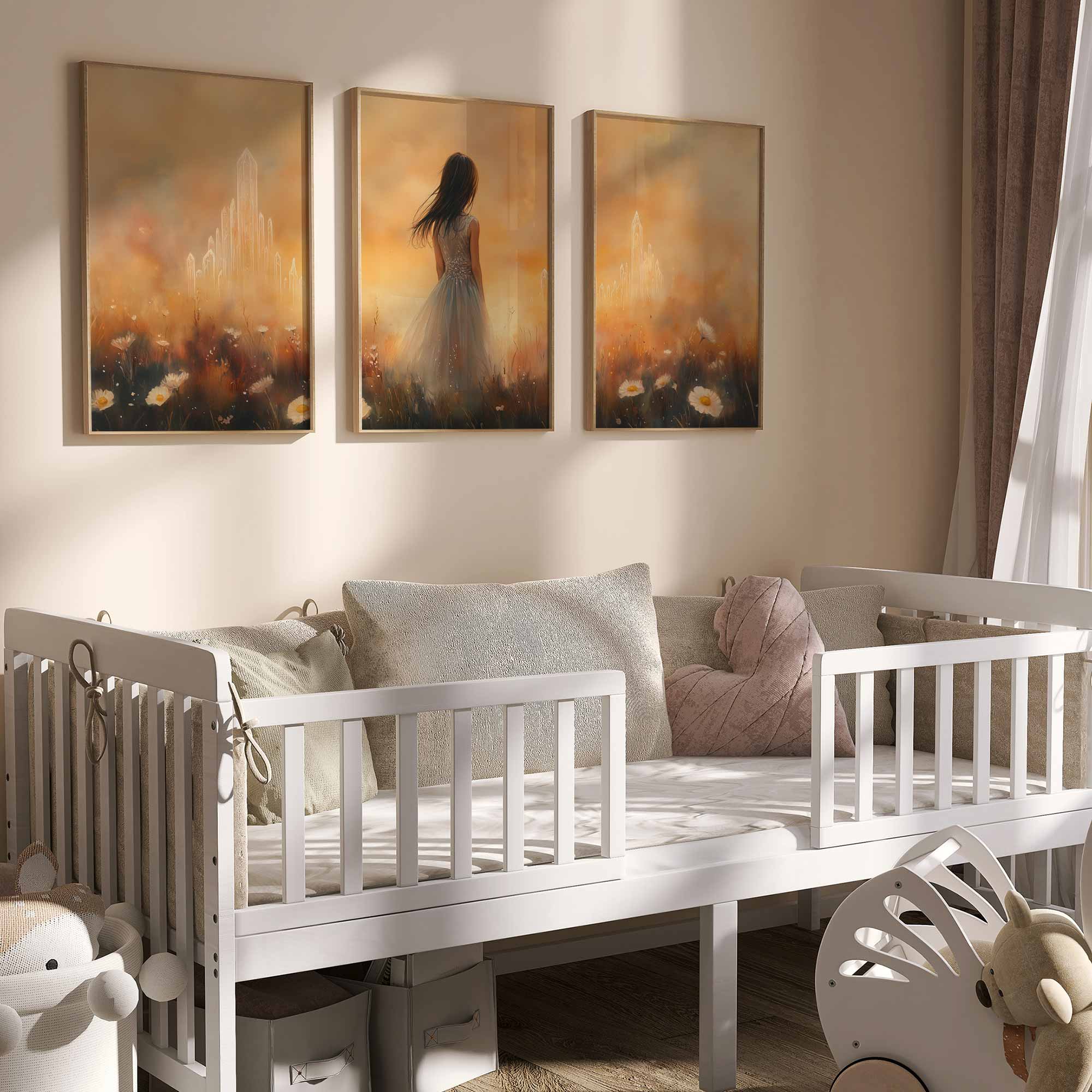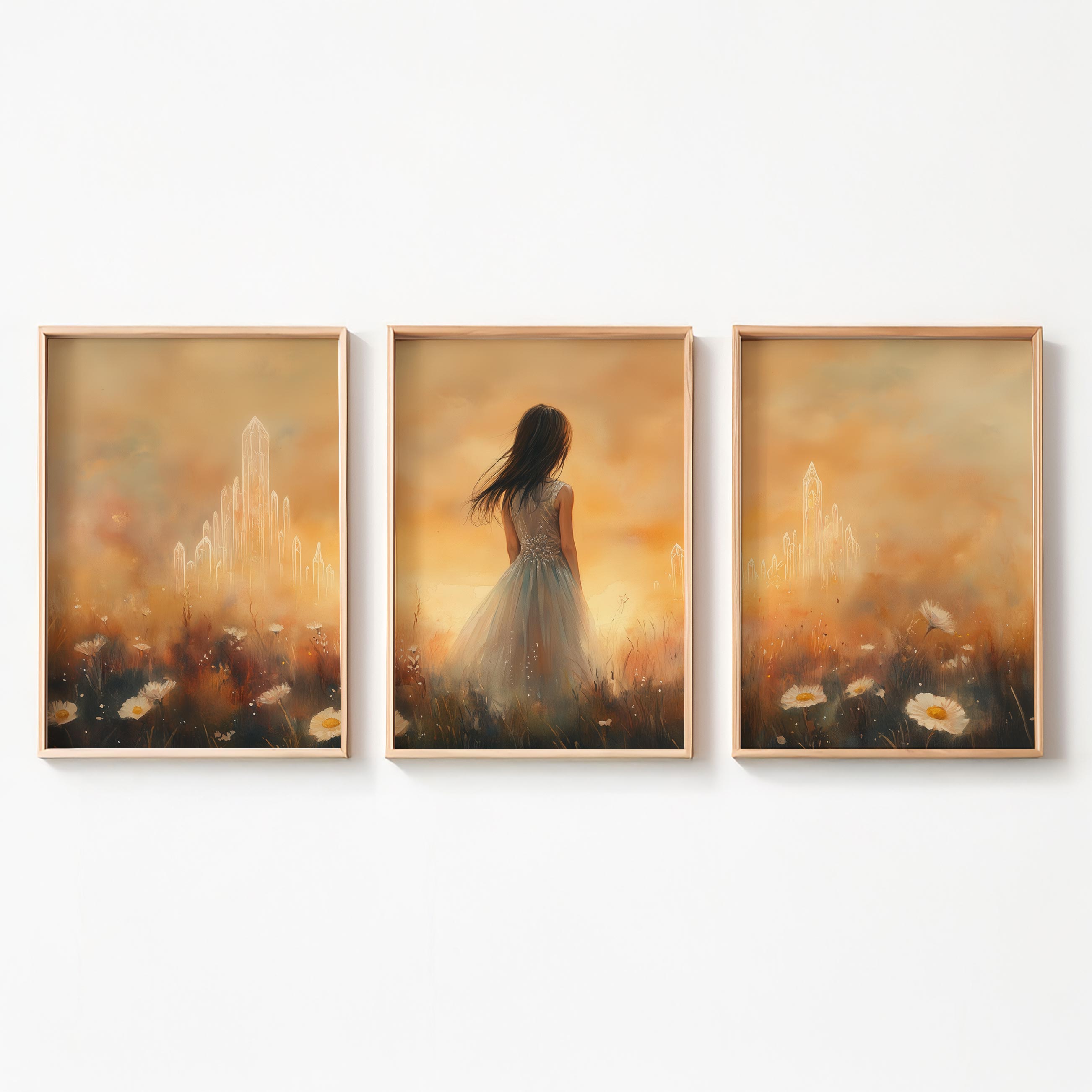 Speels Meisje in Bloemenveld met Stad op de Achtergrond