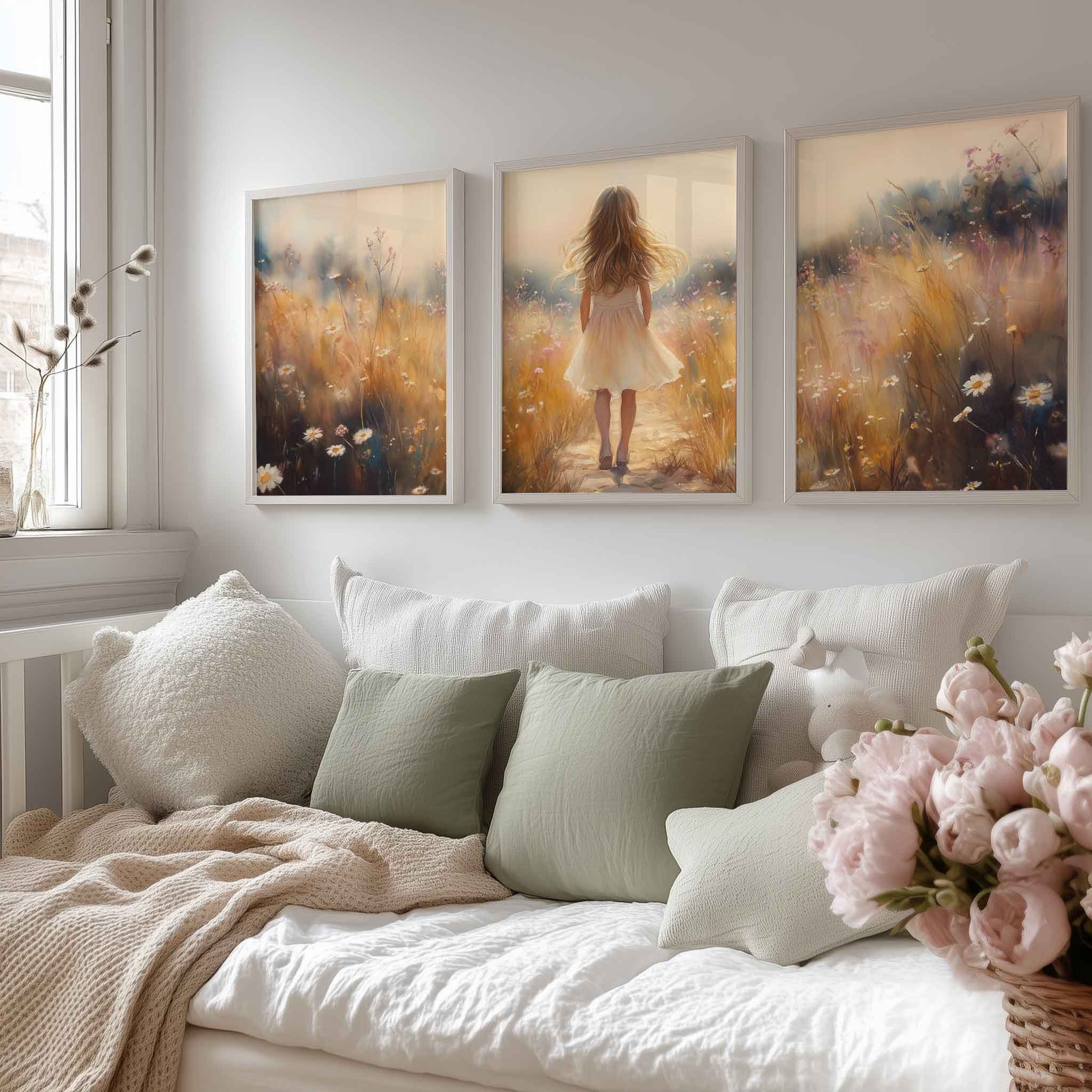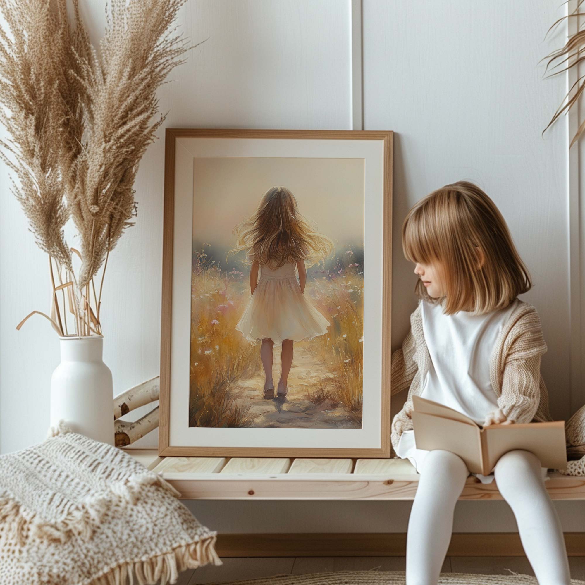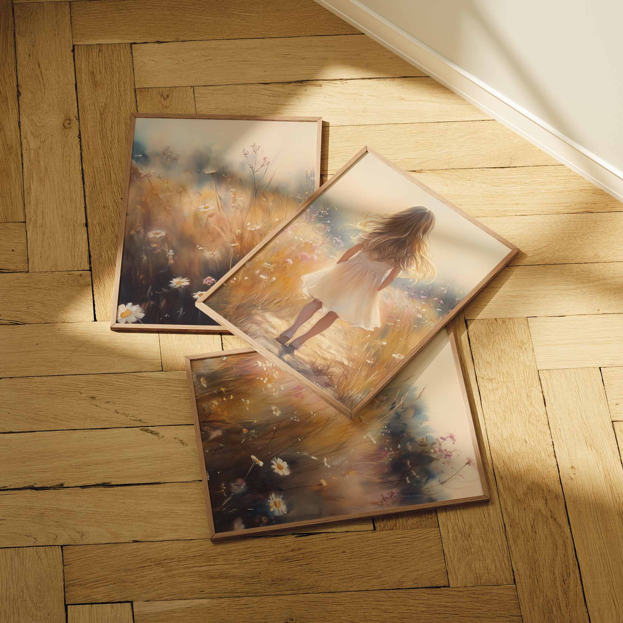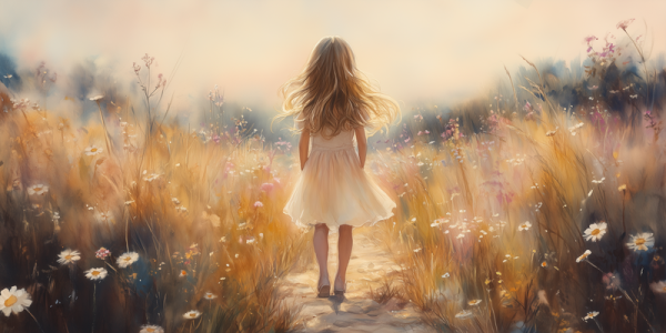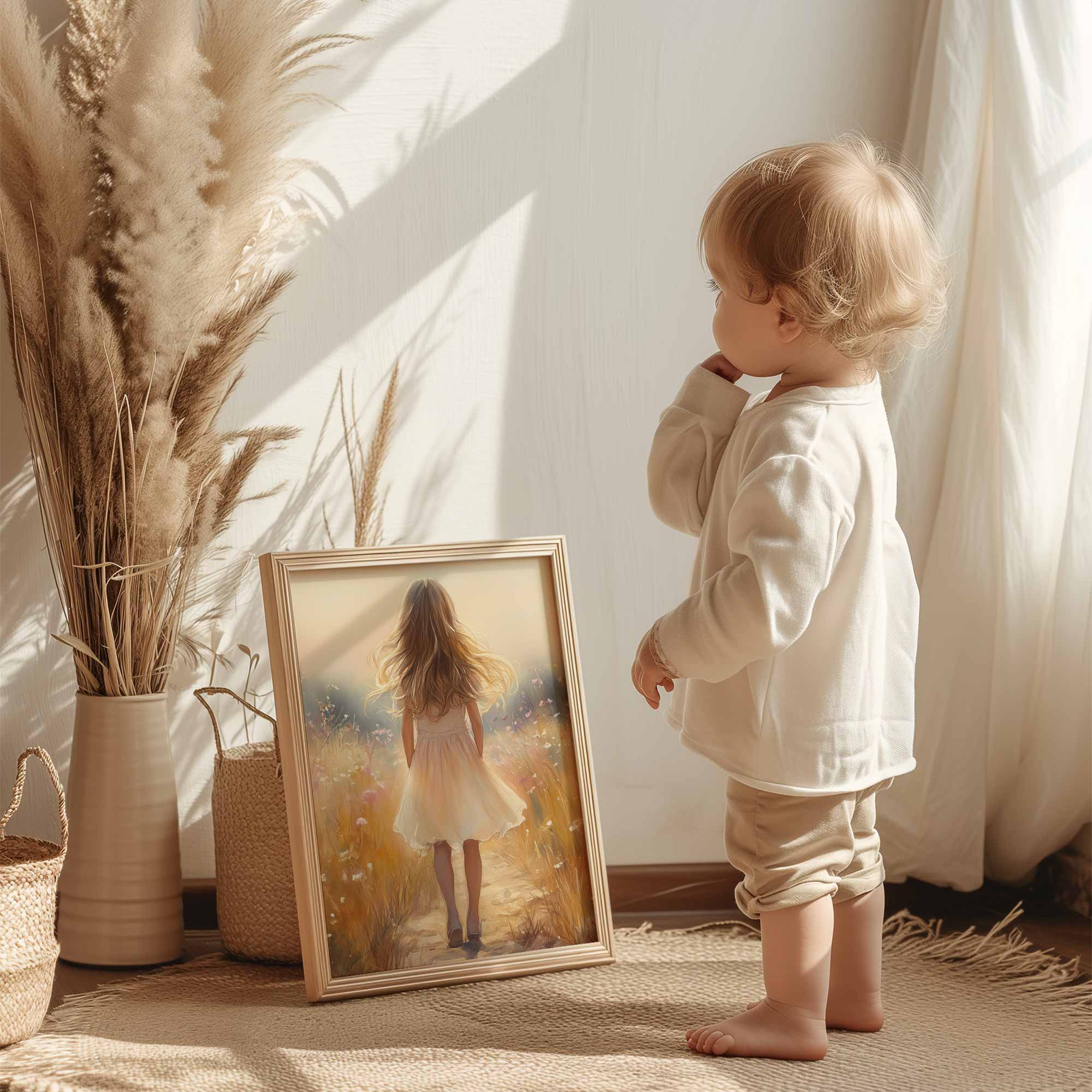 Terug naar collectie Posters Speels Meisje in Bloemenveld – Pastel Schilderij