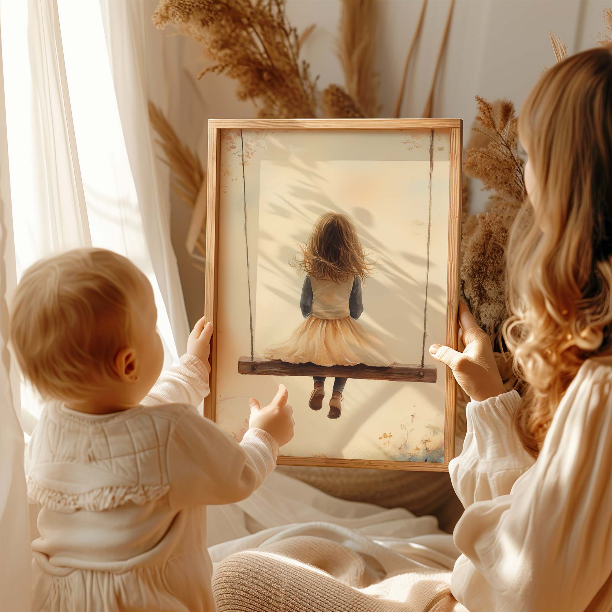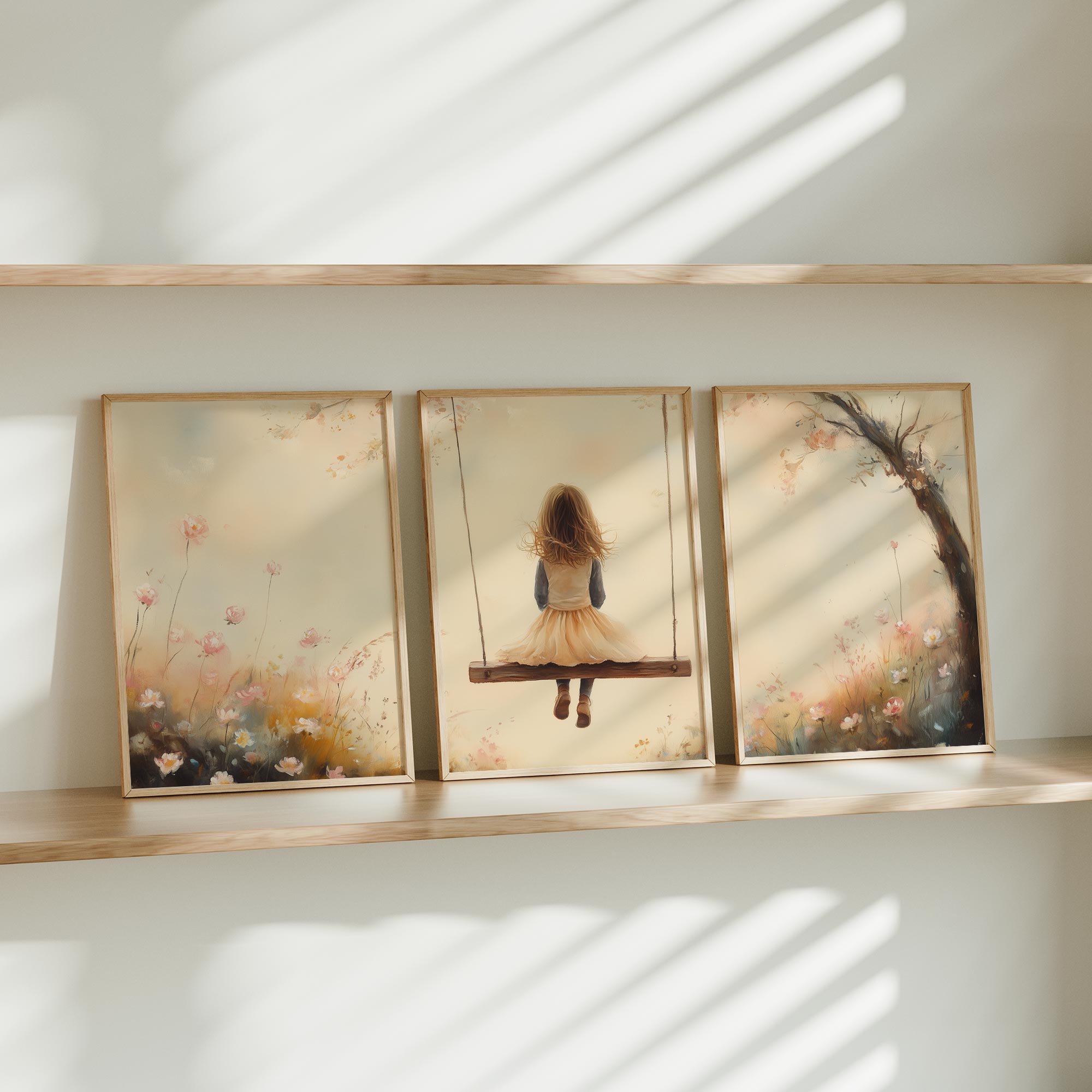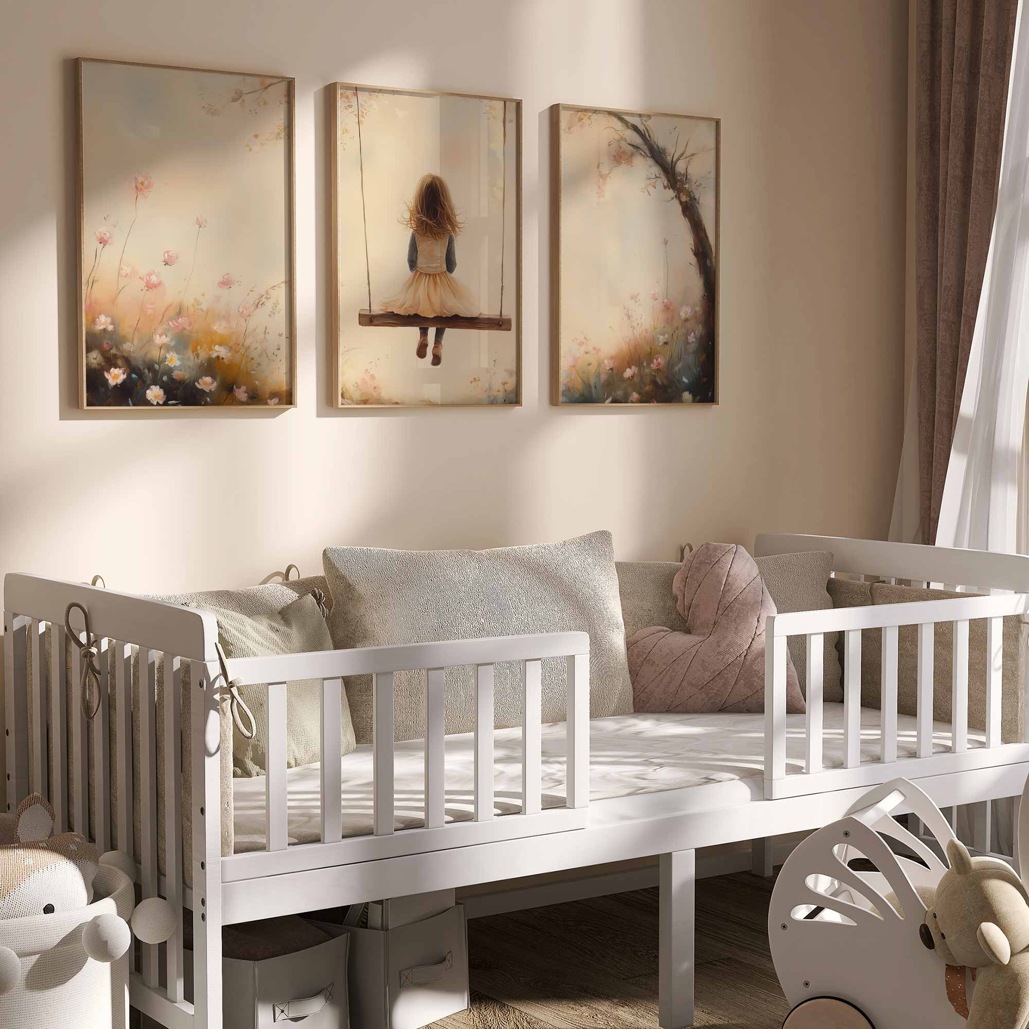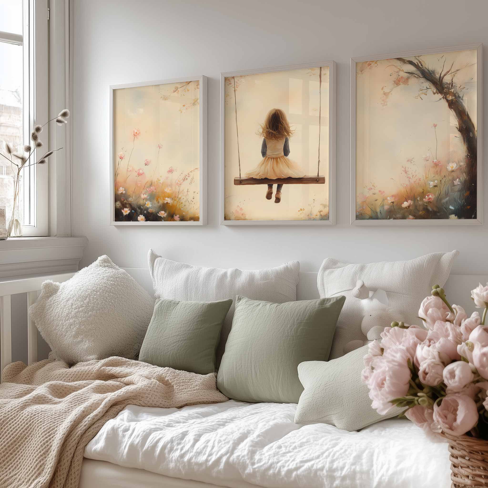 Speels Meisje op Schommel tussen Bloemen