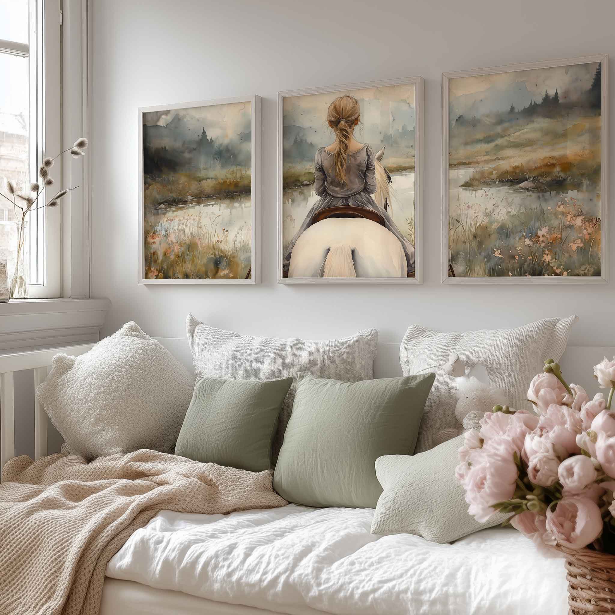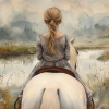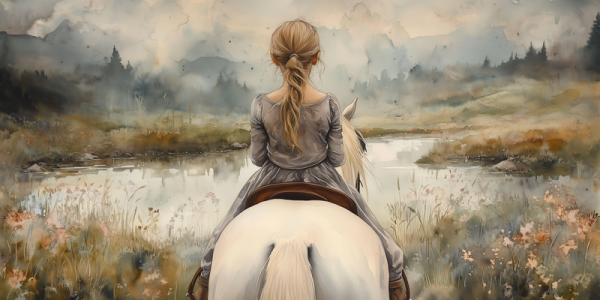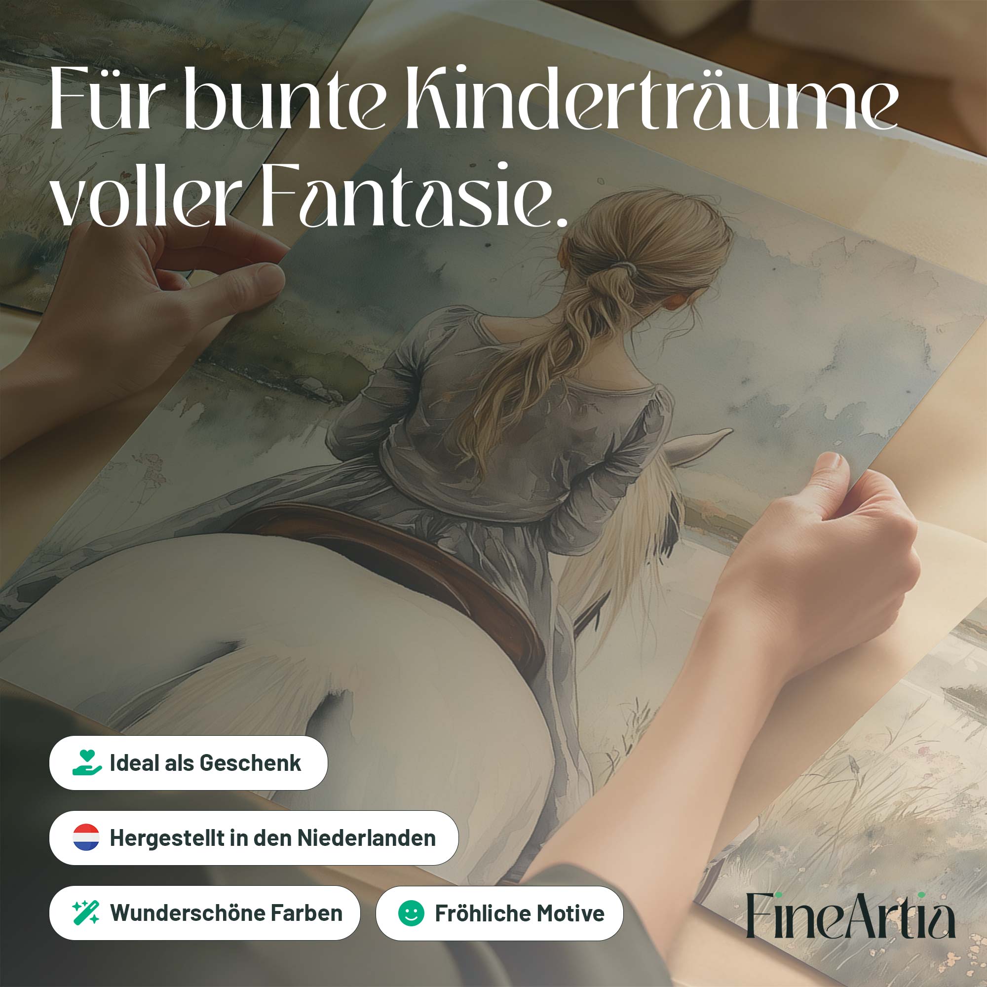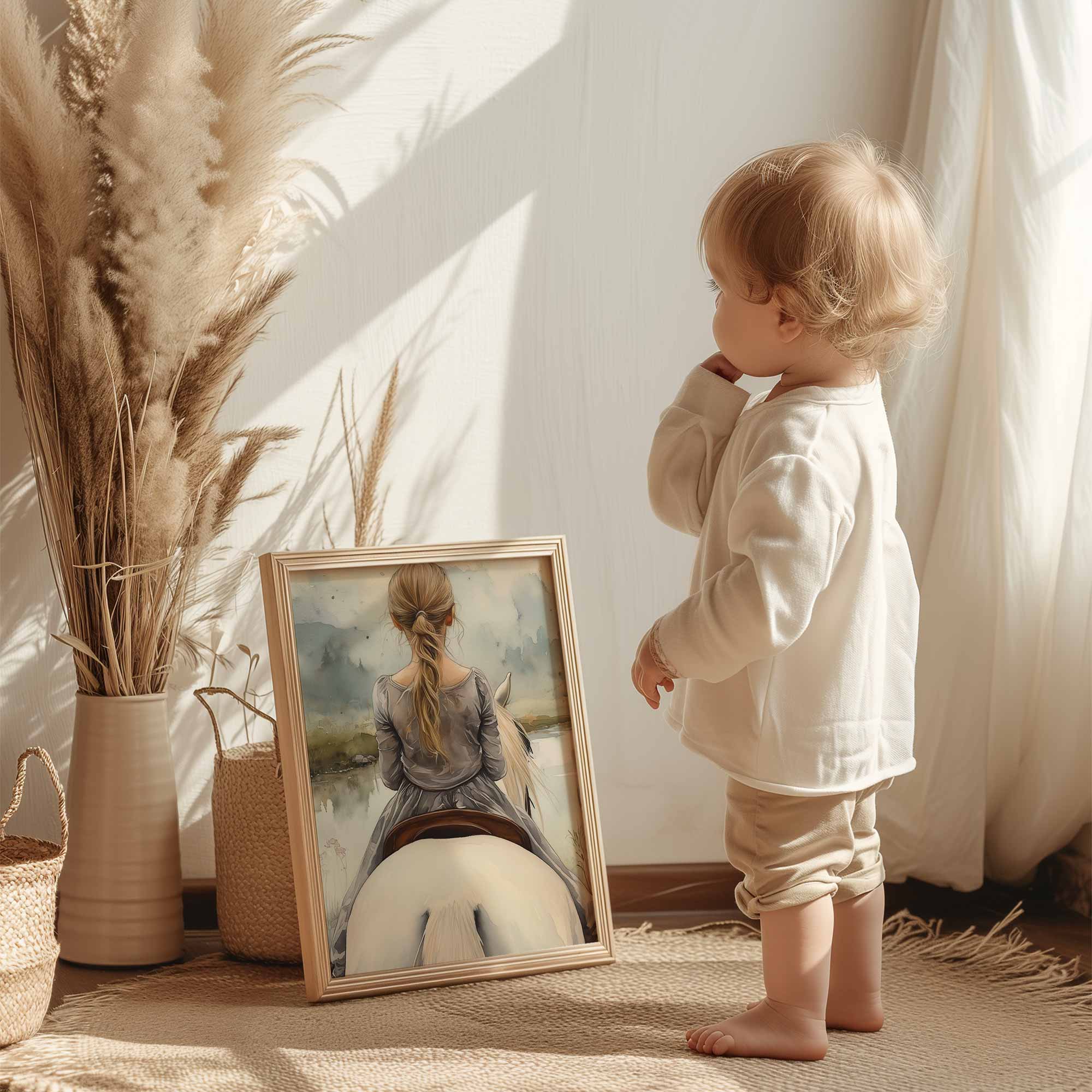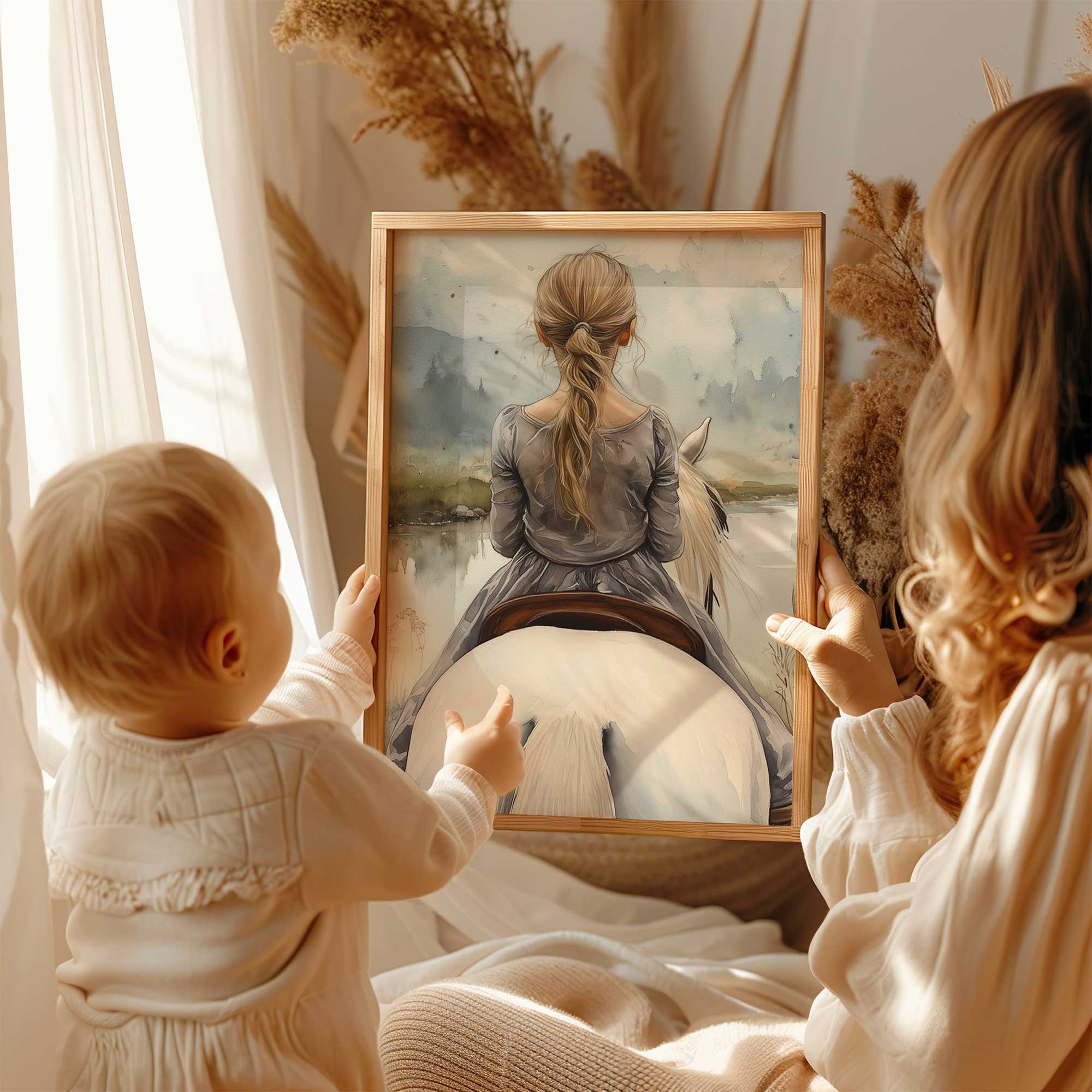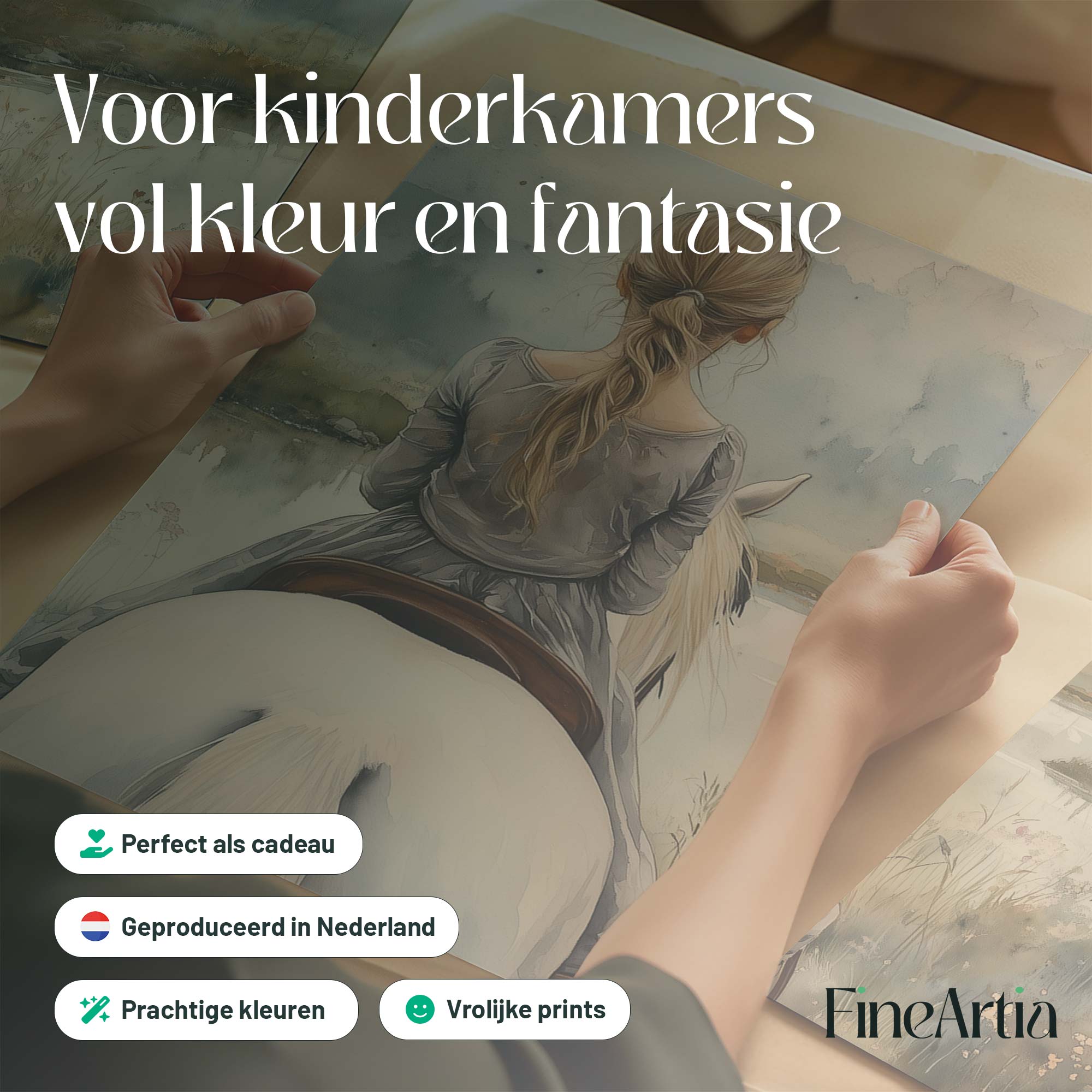 Terug naar collectie Posters Speels Meisje op Wit Paard bij Rivier