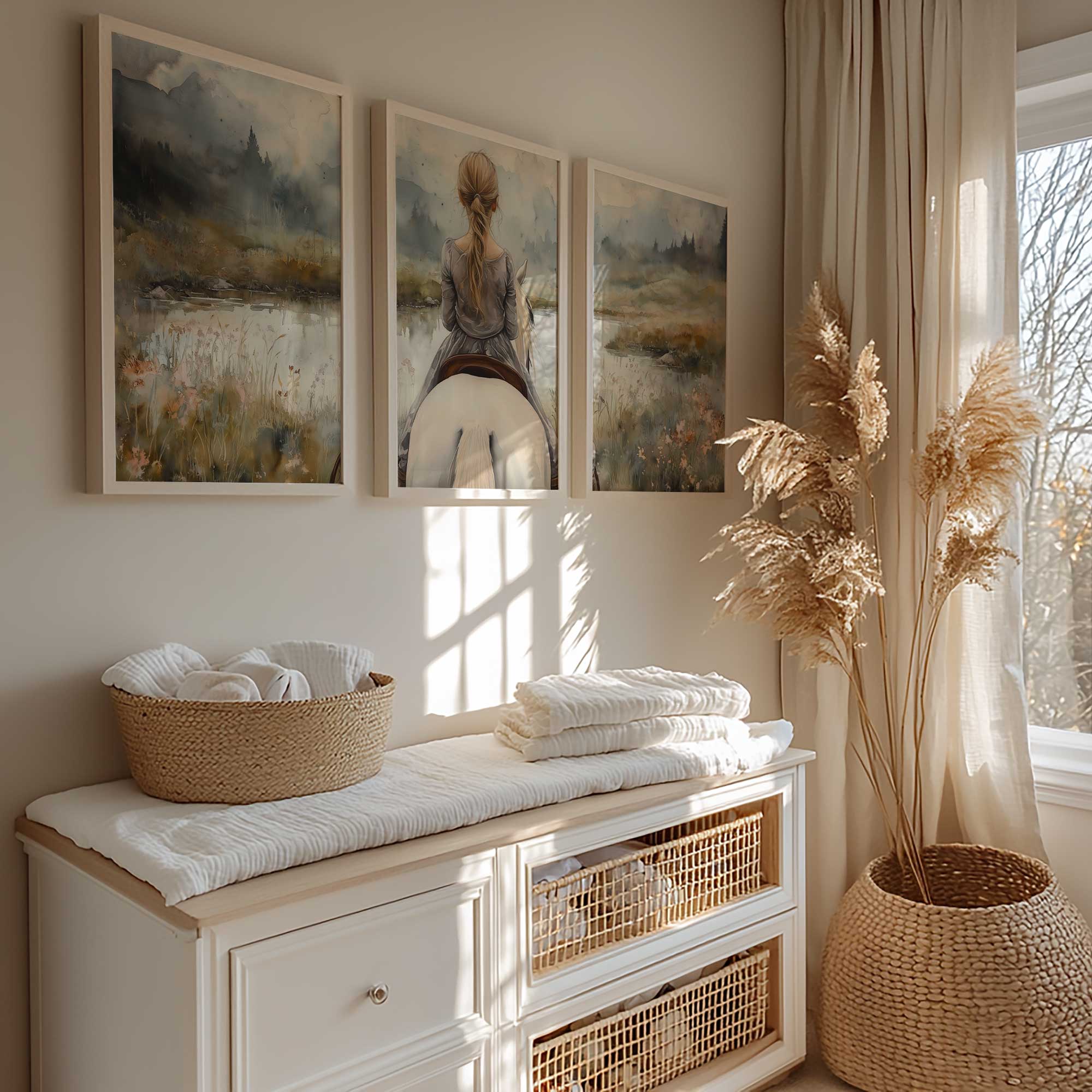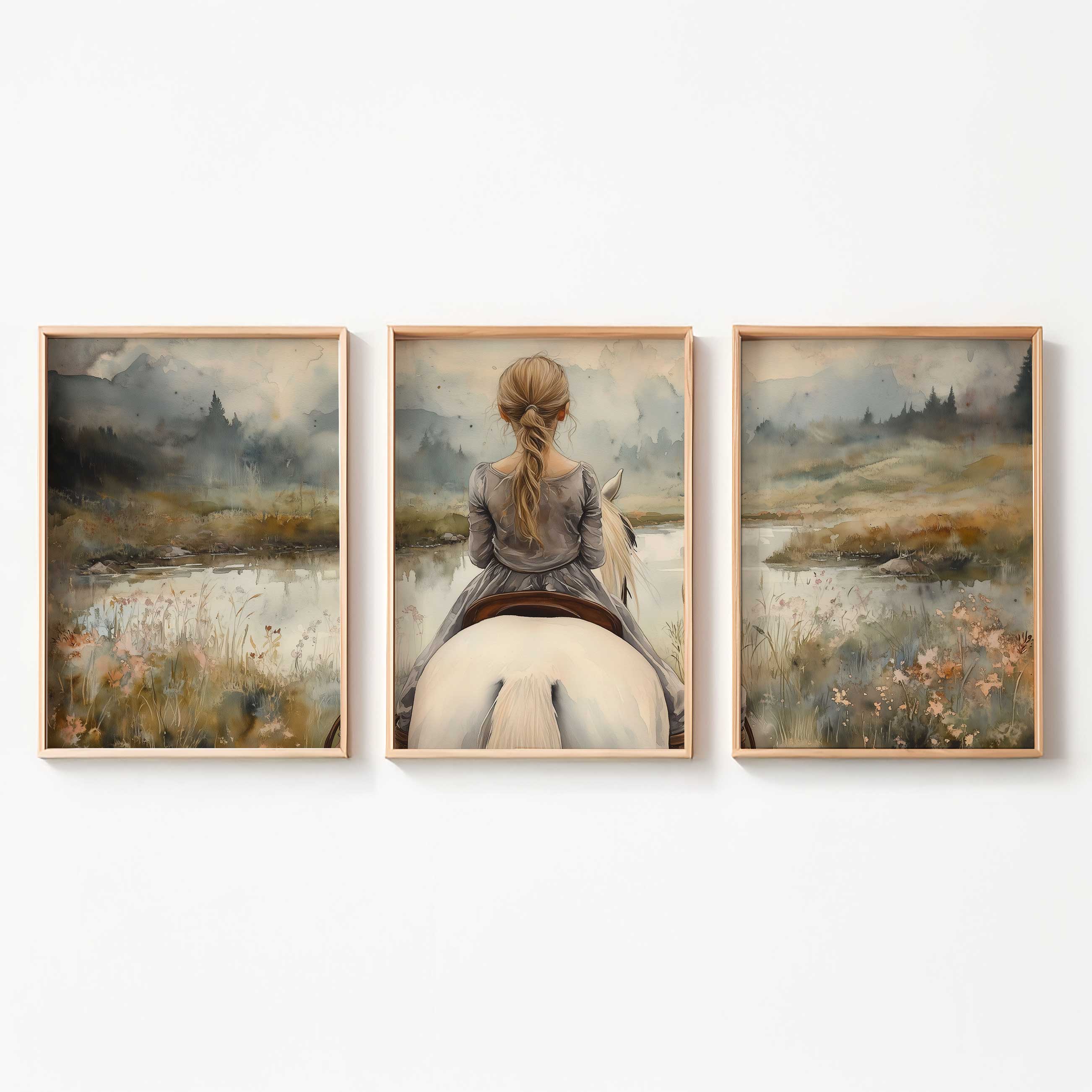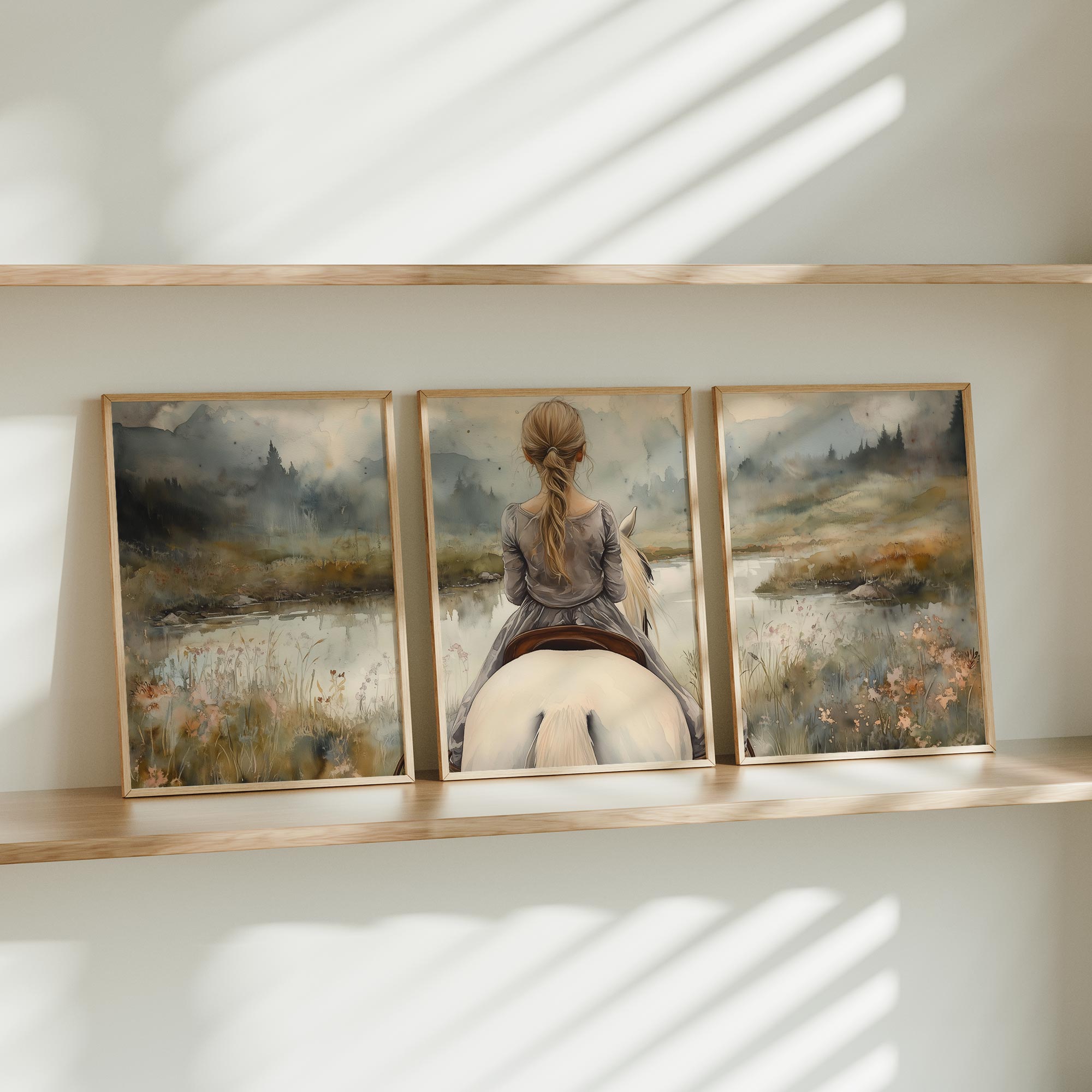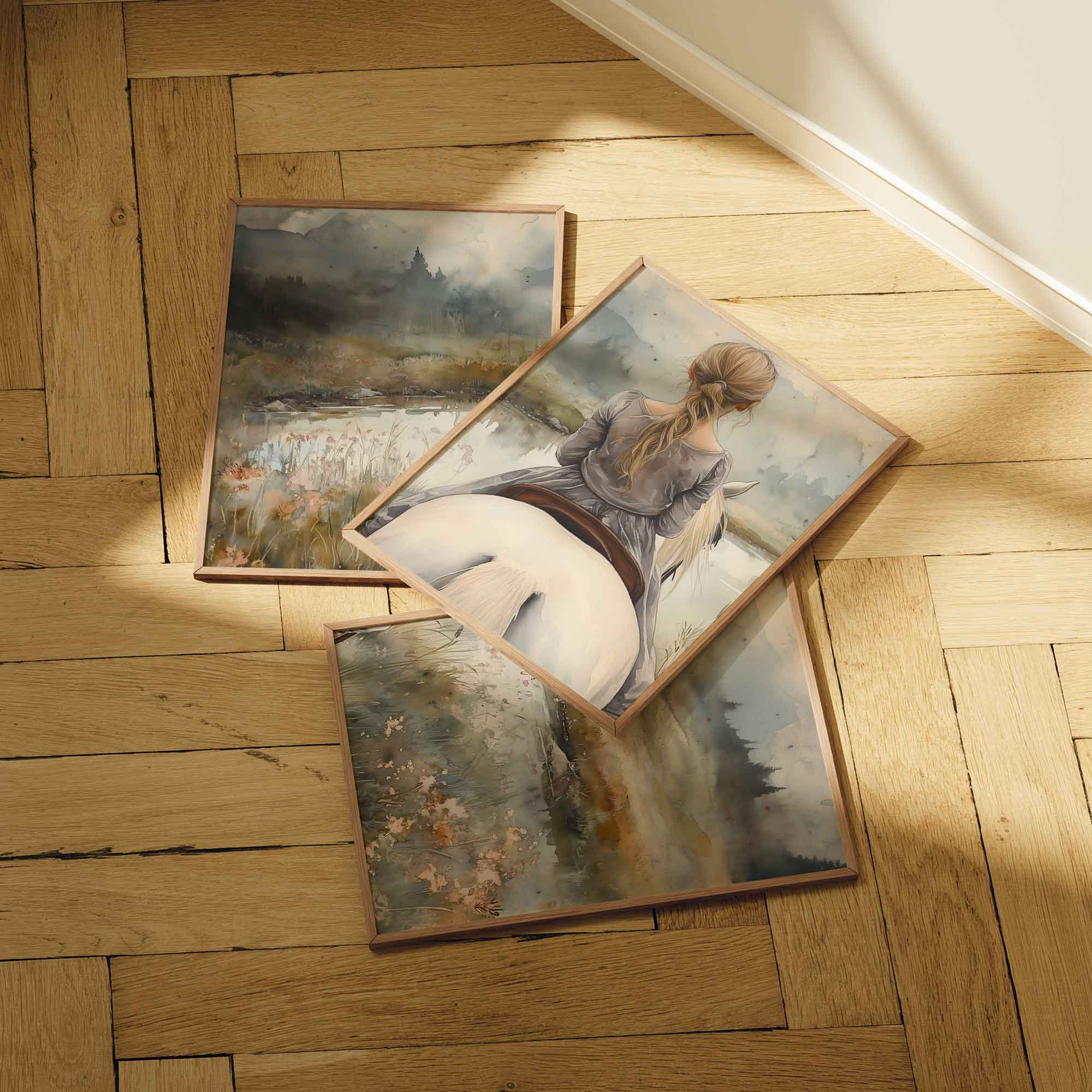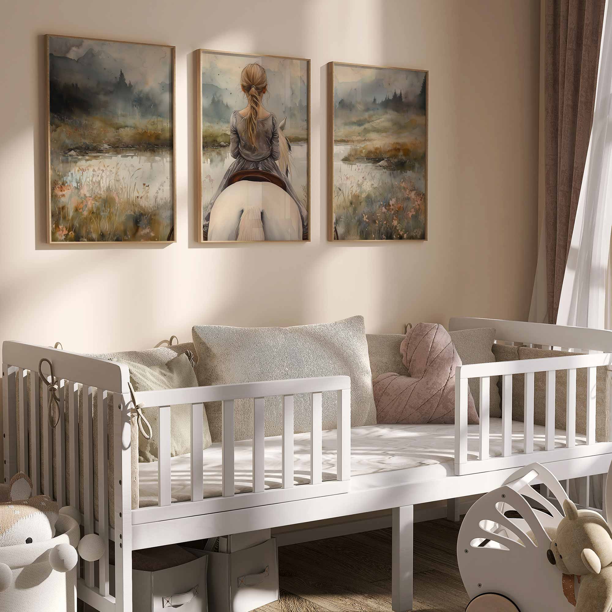 Terug naar collectie Posters Speels Meisje op Wit Paard bij Rivier