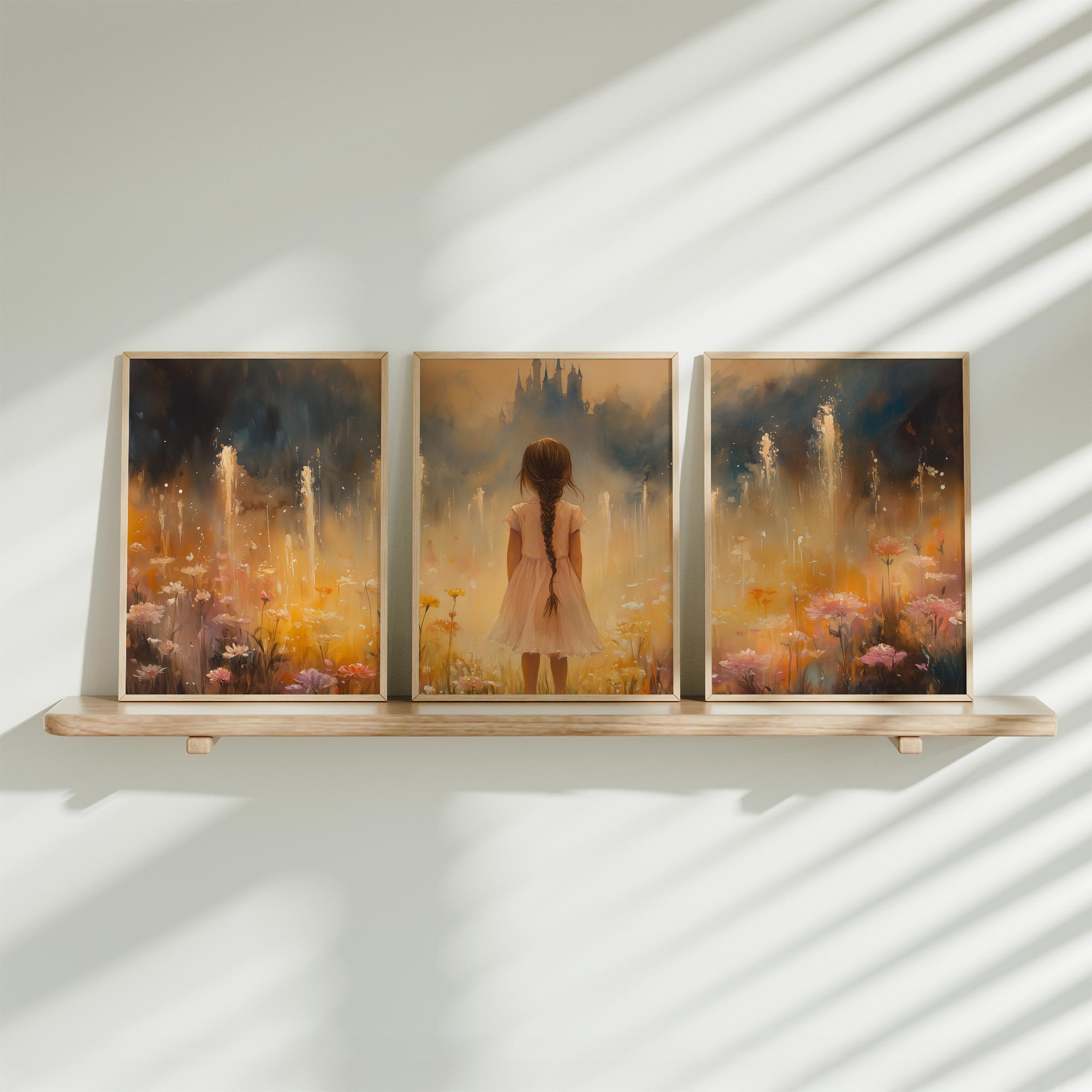 Terug naar collectie Posters Speels Meisje op Wit Paard in Bloemenveld