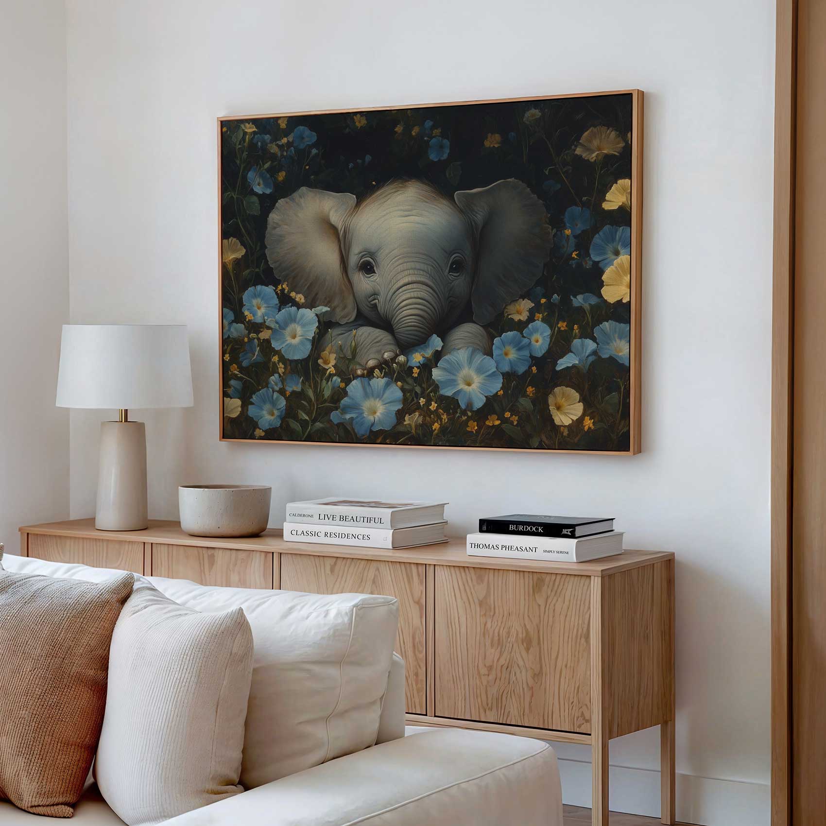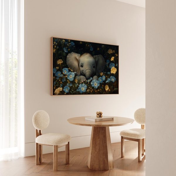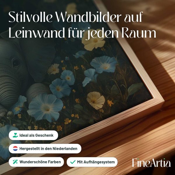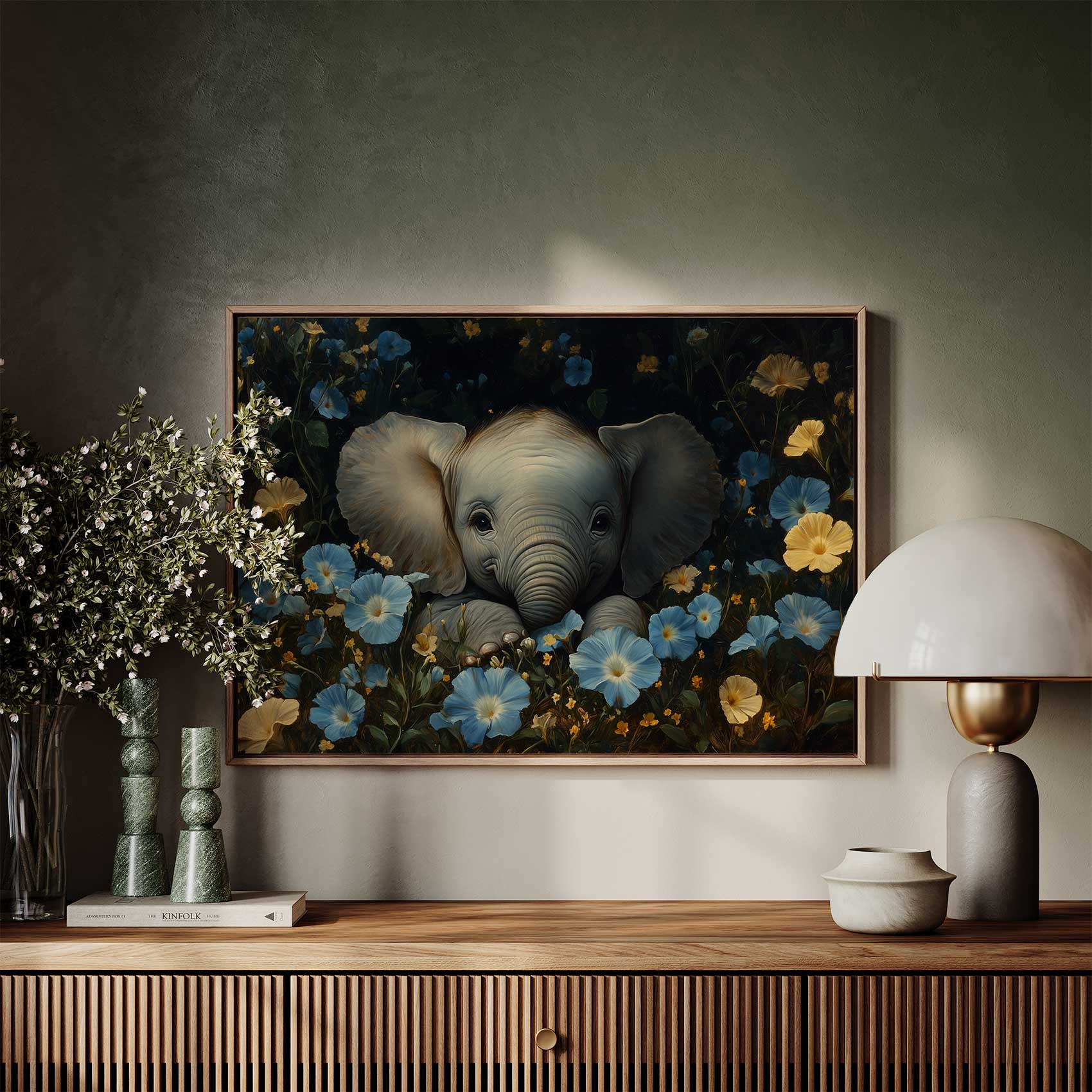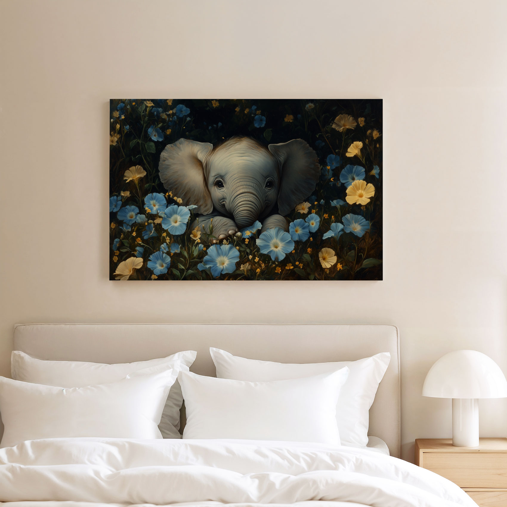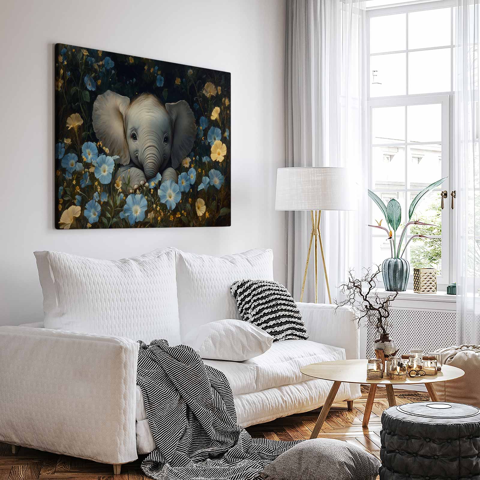 Terug naar collectie Canvas Speels olifantje in bloemenveld
