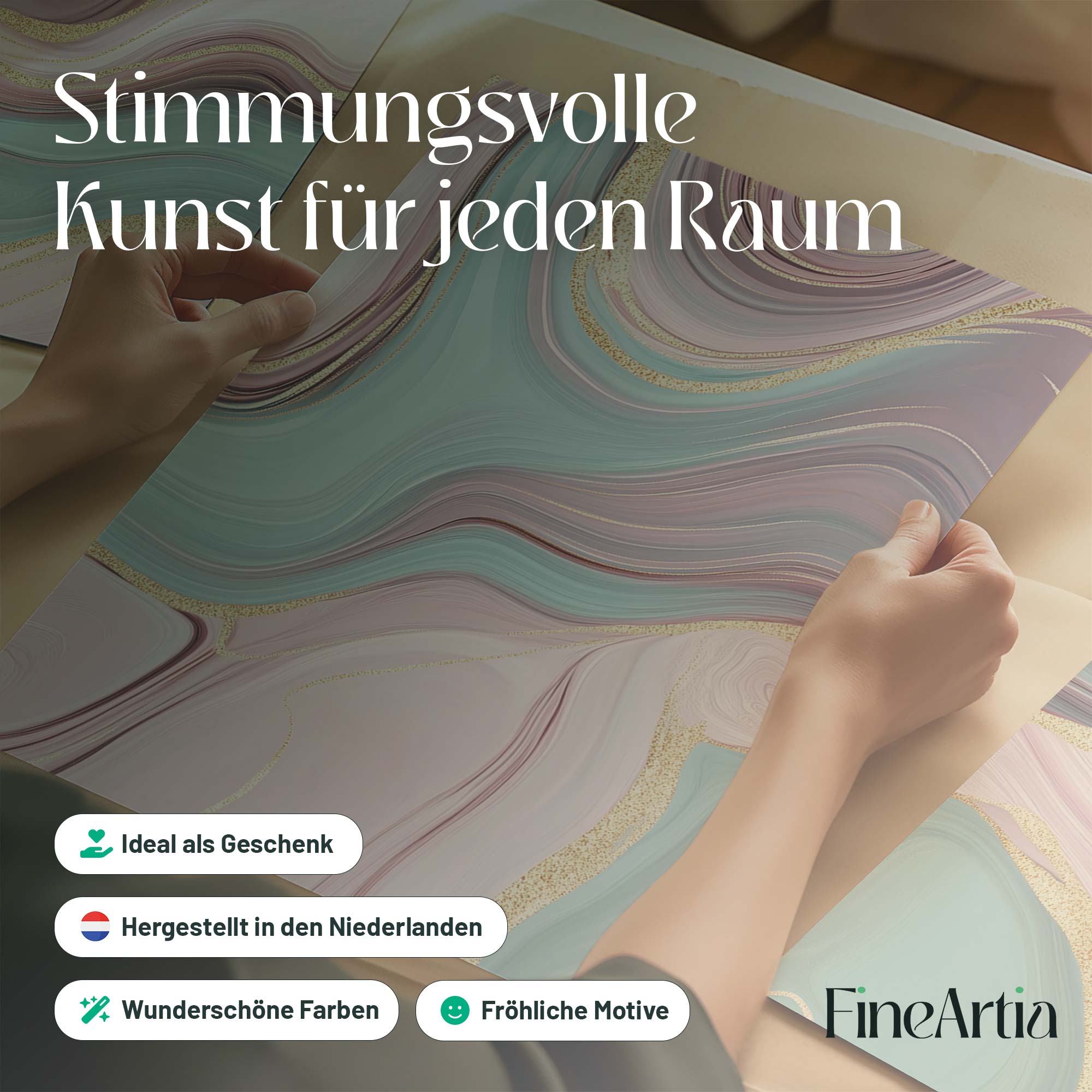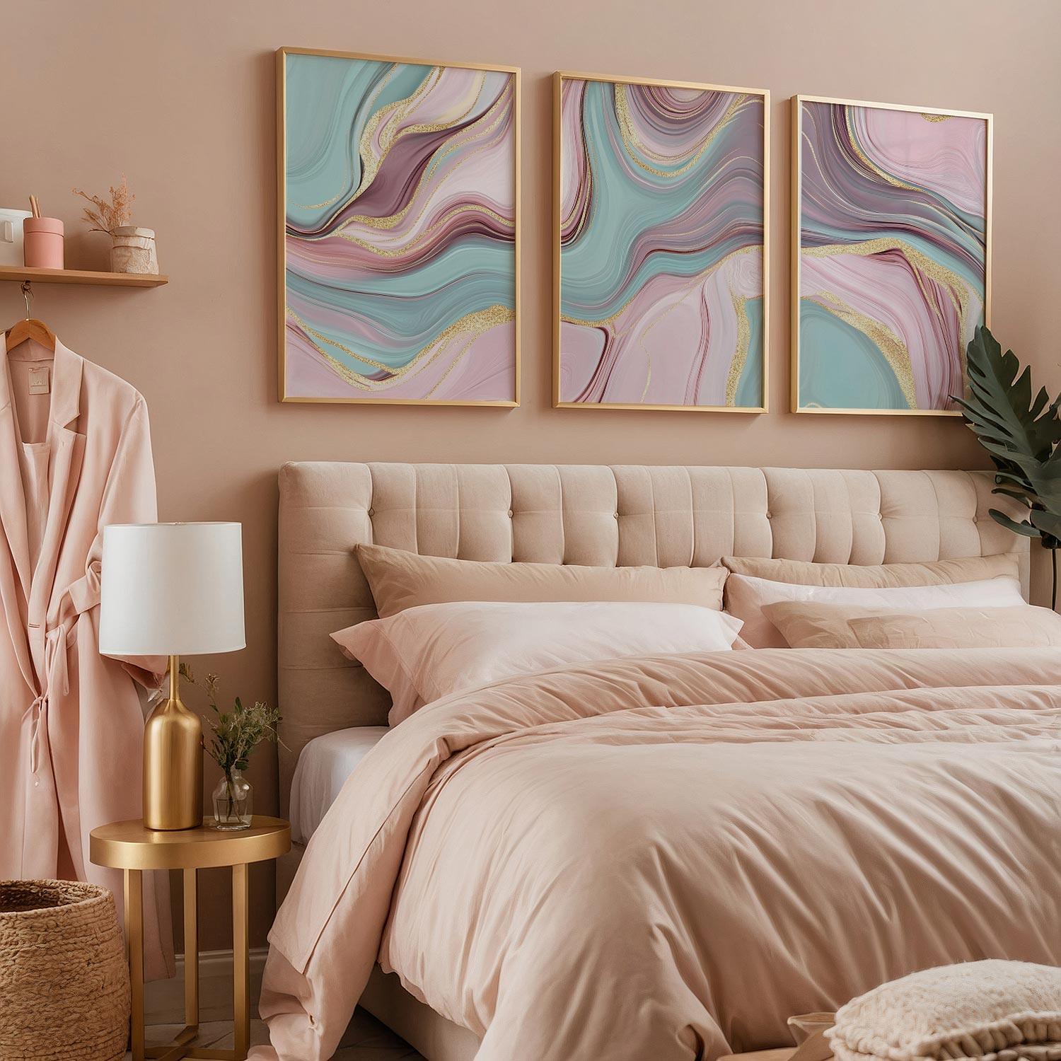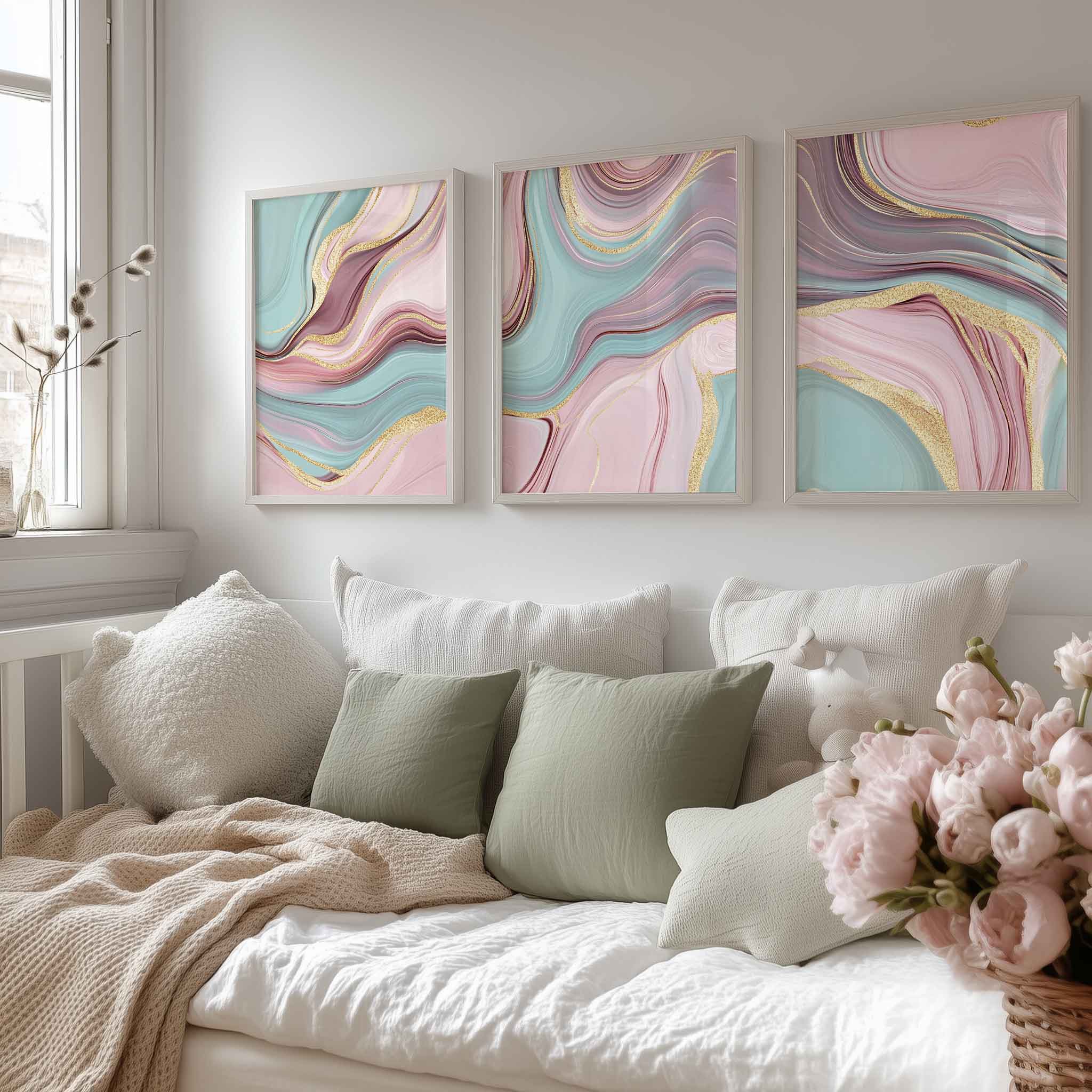 Speelse Swirls in Roze, Blauw en Goud – Moderne Wanddecoratie