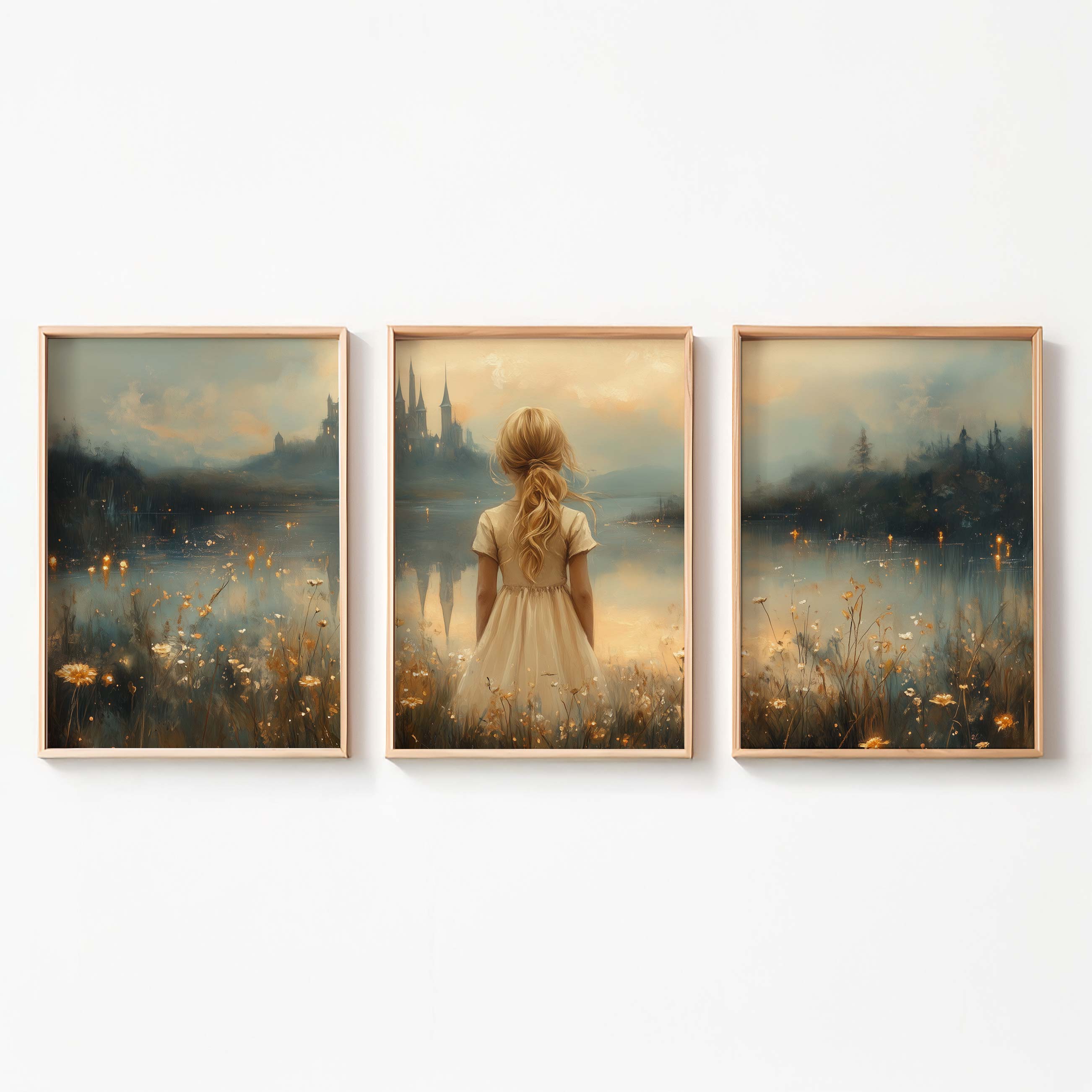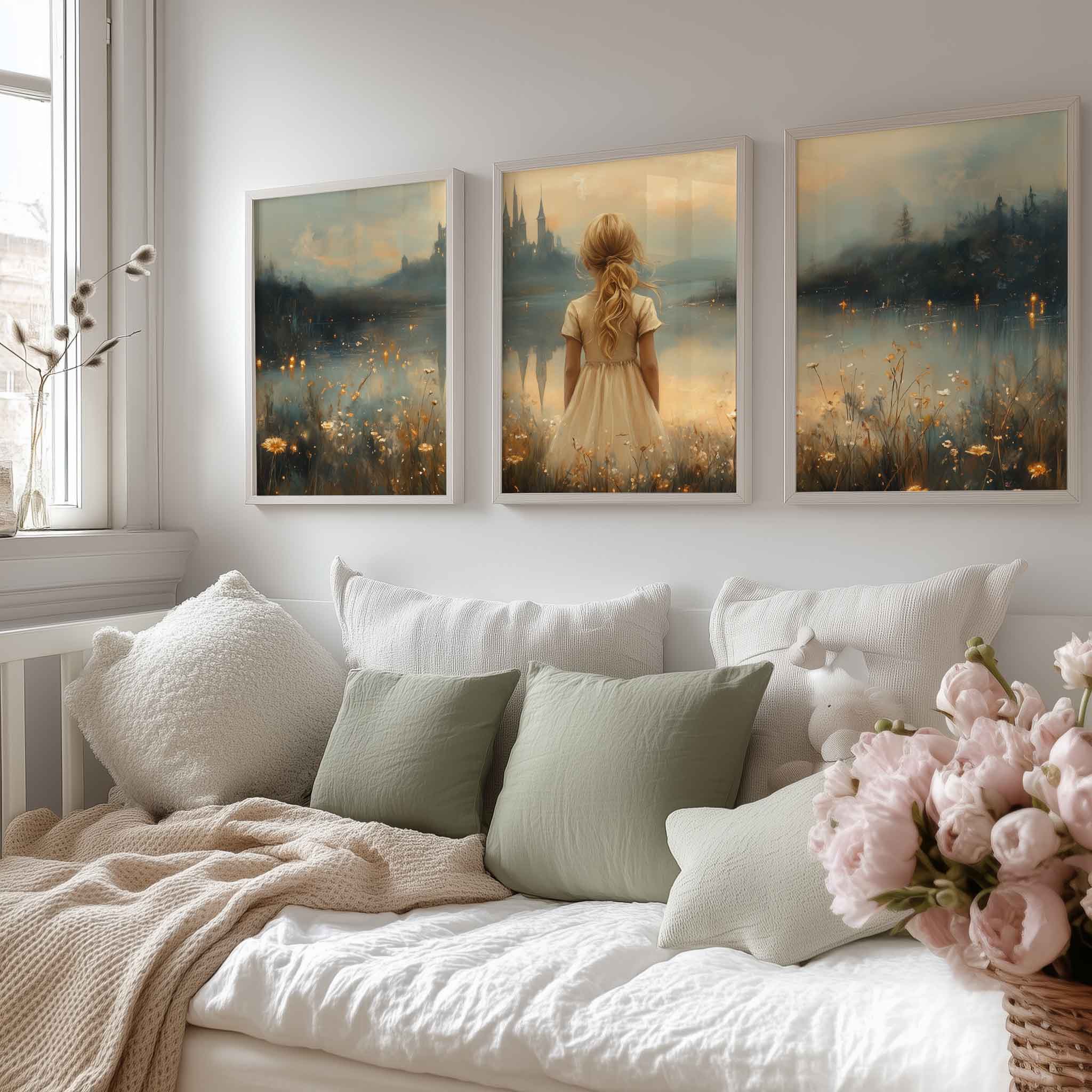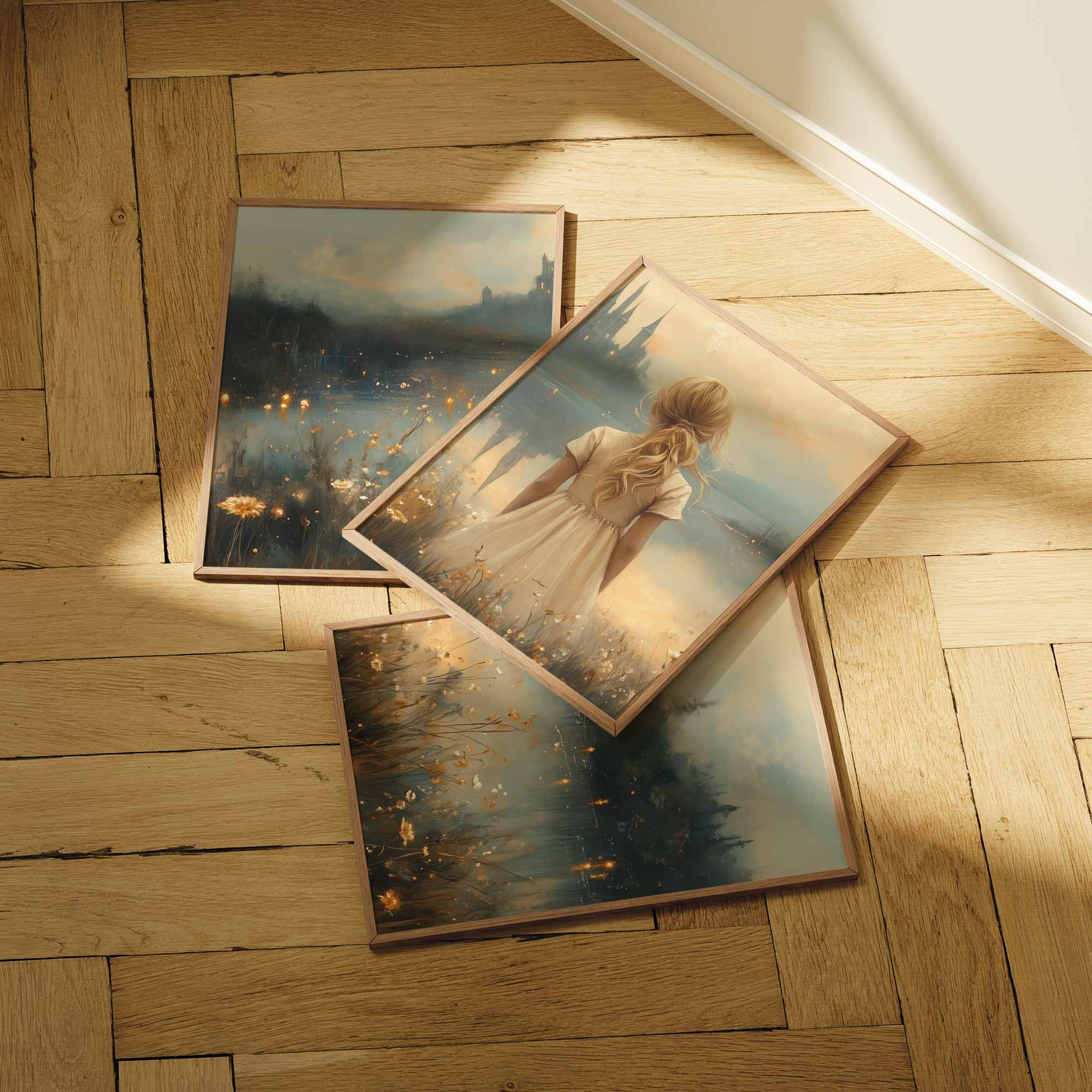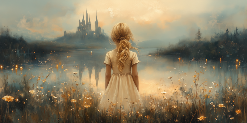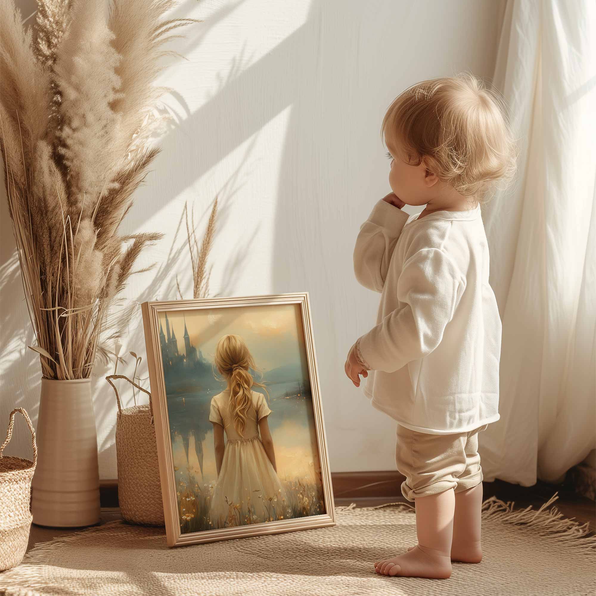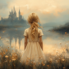 Terug naar collectie Posters Sprookjesachtig Meisje in Bloemenveld bij Kasteel